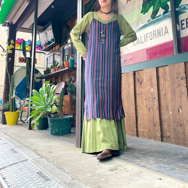 暖色系の中にターコイズカラーがちらっと入っているランダムなストライプがとても素敵なワンピースです。 後ろはスッキリシルエット、前は深めのスリットと胸下にタックの寄ったデザインがかわいいですね。 パサっとサラッとした薄手のコットンですので真夏にも着られそうですし、秋冬はスエードやボアベスト、中にラグランを重ねたり、ミリタリーのカーキのシャツを羽織ったり、ボヘミアンなスタイルもかわいいと思います! ヴィンテージのムード漂う雰囲気抜群な一着です。 【素材】 100% コットン 【サイズ表記】 S 【実寸】 肩幅 35cm 身幅 42cm 袖丈 58cm 着丈 137cm ※裾上げは無料で承ります。 【コンディション】 生地の目の粗い箇所やツレやネップ等ございます。 使用感のある商品ですので古着にご理解のある方のご購入をお願い致します。 【着用者身長】 162cm