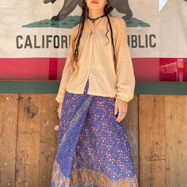 透ける感じのかなり薄手のコットン素材が柔らかくて気持ち良いブラウスです。 紅茶染めしたような優しい色味で、細かいたくさんのシェルボタン、同色の手刺繍など、ナチュラルで雰囲気のある一枚ですね。 肩のあたりのデザインもこだわりを感じます。 シンプルにデニムパンツと合わせてもかわいいですし、ベイカーパンツなどミリタリー系とも相性が良さそうです。 前開きで着ることもできるので日除けや冷房対策にもお使い頂けますし、とても薄手なので真夏にも涼しく着られそうです。 【素材】 100%コットン 【サイズ表記】 S 【実寸】 身幅 50cm 袖丈 襟ぐりから70cm 着丈 61cm 【コンディション】 袖口のリペア、全体的な使用感のある商品です。古着にご理解のある方のご購入をお願い致します。 【着用者身長】 162cm