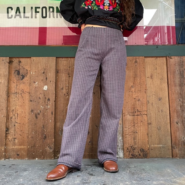 細かくて柔らかい色味のチェック柄がかわいいパンツです。スッキリしたストレートなシルエットでポケットやベルトループもないあっさりしたデザインなところと、若干伸縮性があるのも楽ちんで良い雰囲気です。 チェック柄を取り入れるだけで秋冬感が出るのでTシャツにニット帽やベレー帽に合わせてもかわいいと思います。スウェットにスニーカーでもニットにブーツでも柄のワンピースからチラ見せさせてもかわいいですね。 【素材】 不明 アクリルなどの混紡のような雰囲気 ※横にやや伸縮性があります。 【実寸】 ウエスト 72cm 股上 25cm 股下 77cm 総丈 102cm ワタリ 27cm 裾幅 24cm ※裾上げは無料で承ります。 【コンディション】 目立った傷や汚れは見受けられませんが、毛羽立ち等使用感のある商品です。古着にご理解のある方のご購入をお願い致します。 【着用者身長】 162cm