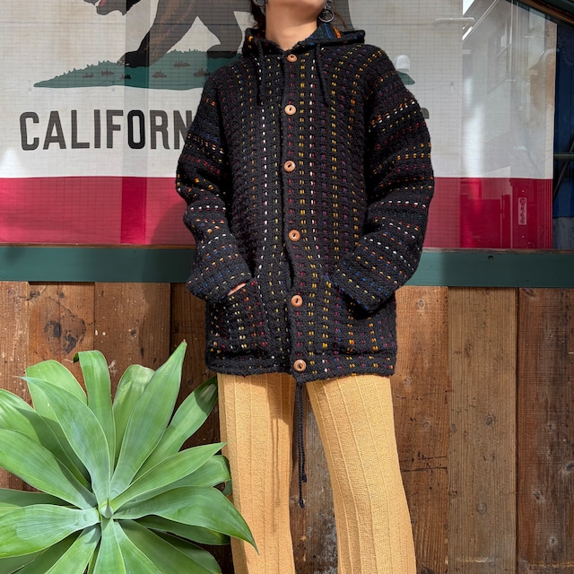 黒ベースにカラフルな毛糸のステッチがかわいいエクアドルのフード付きニットジャケットです。 ガバッと大きめなサイズ感でちょっとそこまでの時にも気軽に羽織れる着やすさですね。 フードが付いている後ろ姿のかわいさや、ウッドボタン、両方にパッチポケットが付いていてヤンチャな雰囲気も良い感じですね。 中にプリントスウェットを合わせて開けて着たり、ミリタリー系のパンツと合わせてボーイッシュにコーディネートしてもかわいいと思います! 【素材】 100% ウール 【実寸】 肩幅 64cm 身幅 55cm 袖丈 50cm 着丈 67cm 【コンディション】 目立ったキズや汚れは見受けられませんが、毛羽立ち等使用感のある商品ですので古着にご理解のある方のご購入をお願い致します。 【着用者身長】 162cm