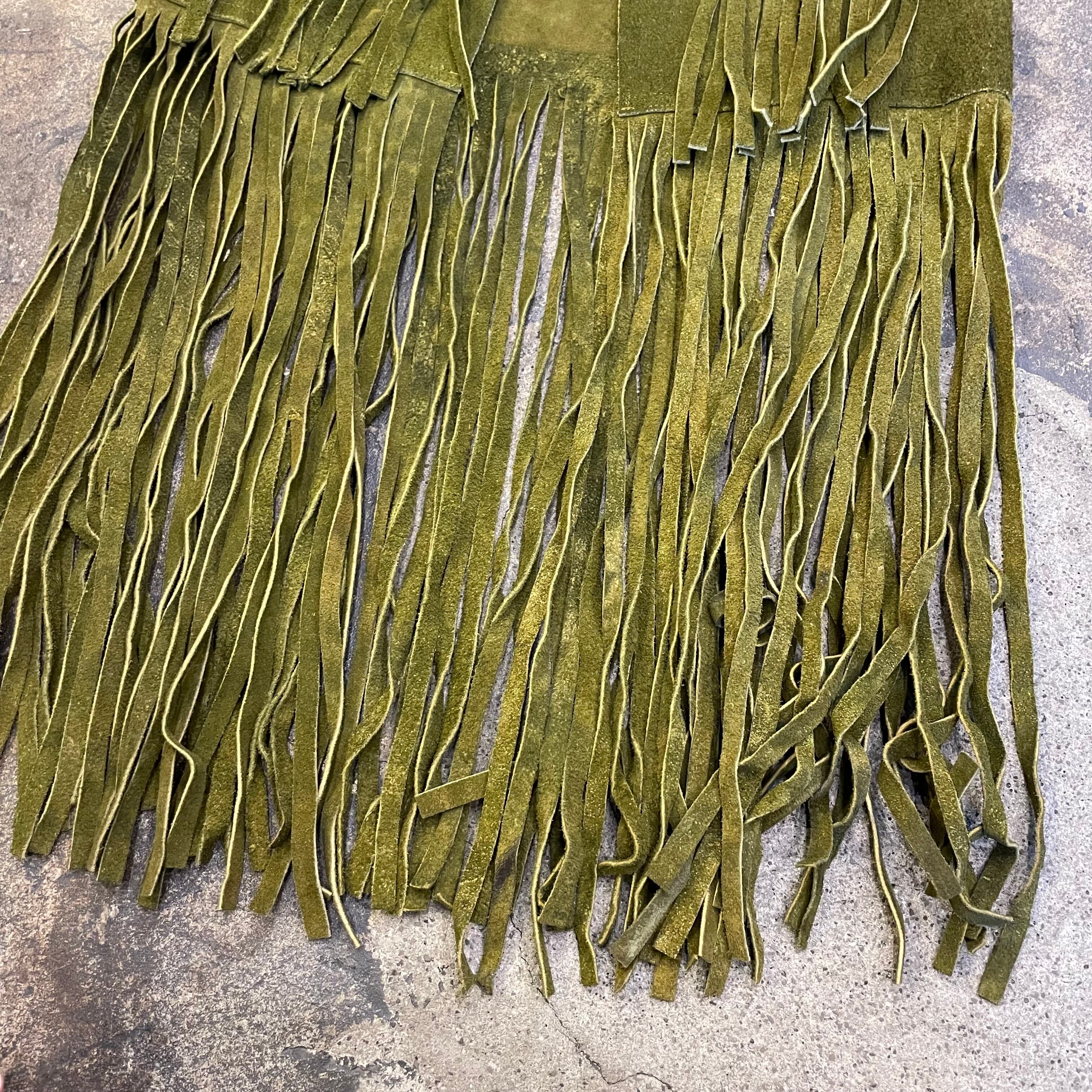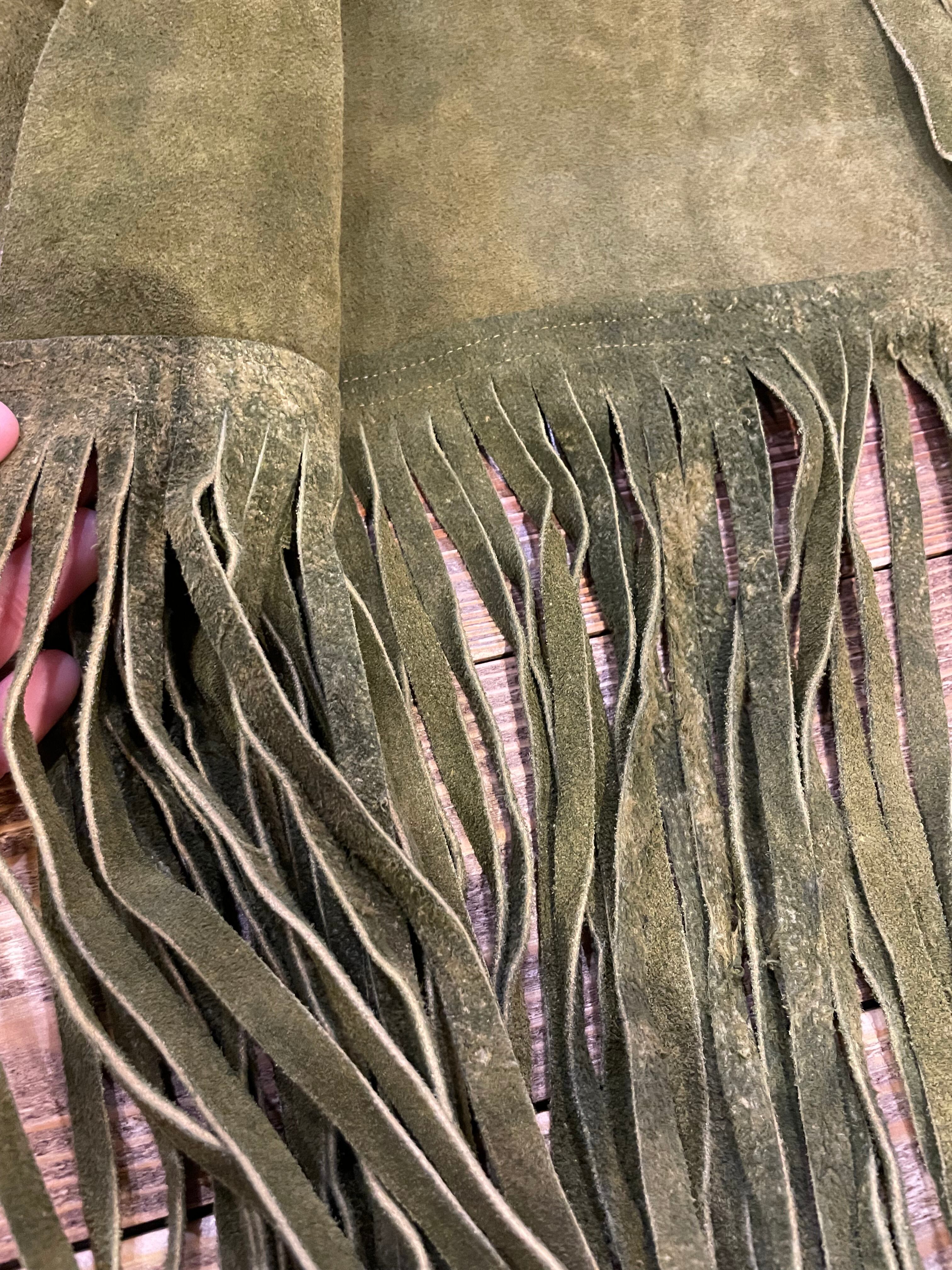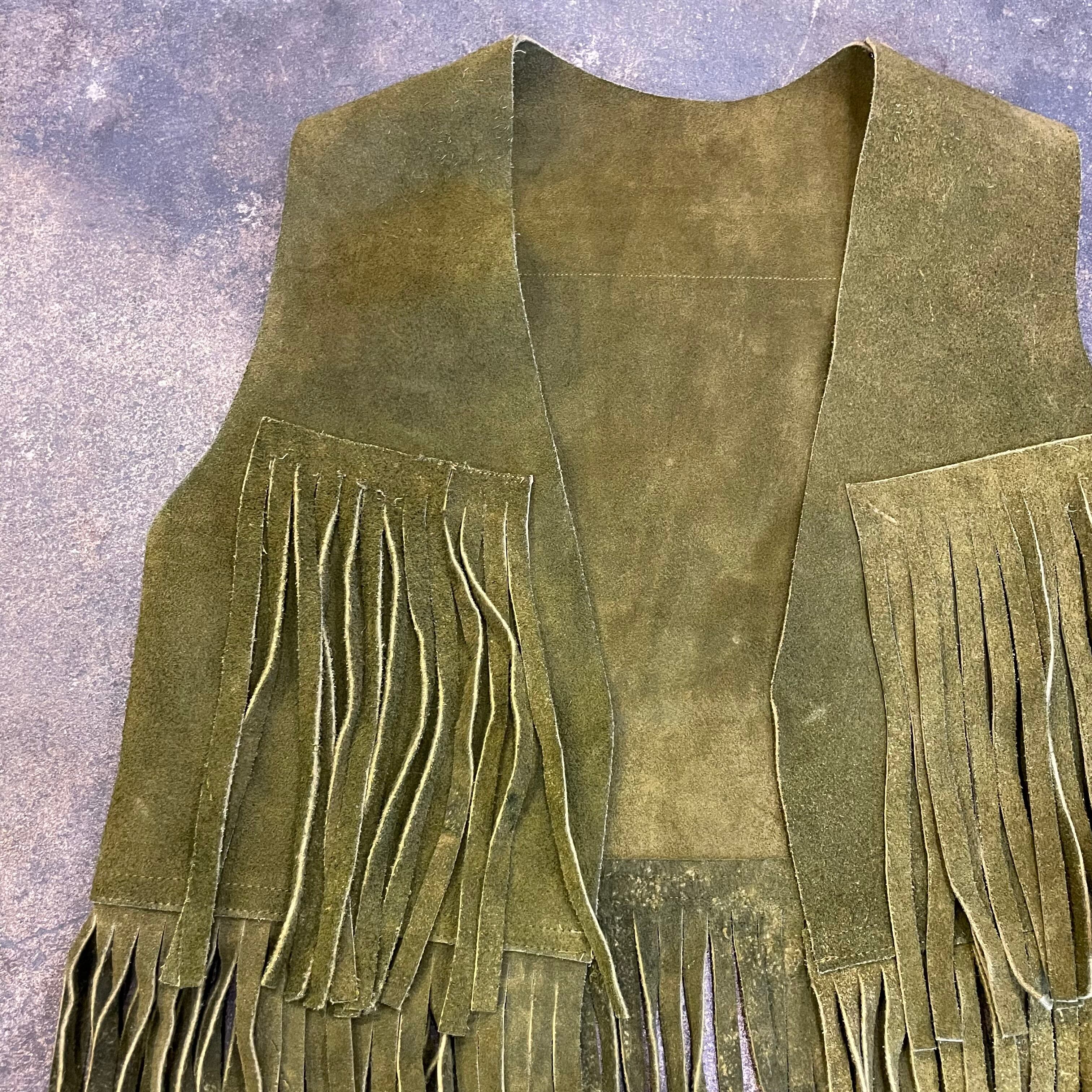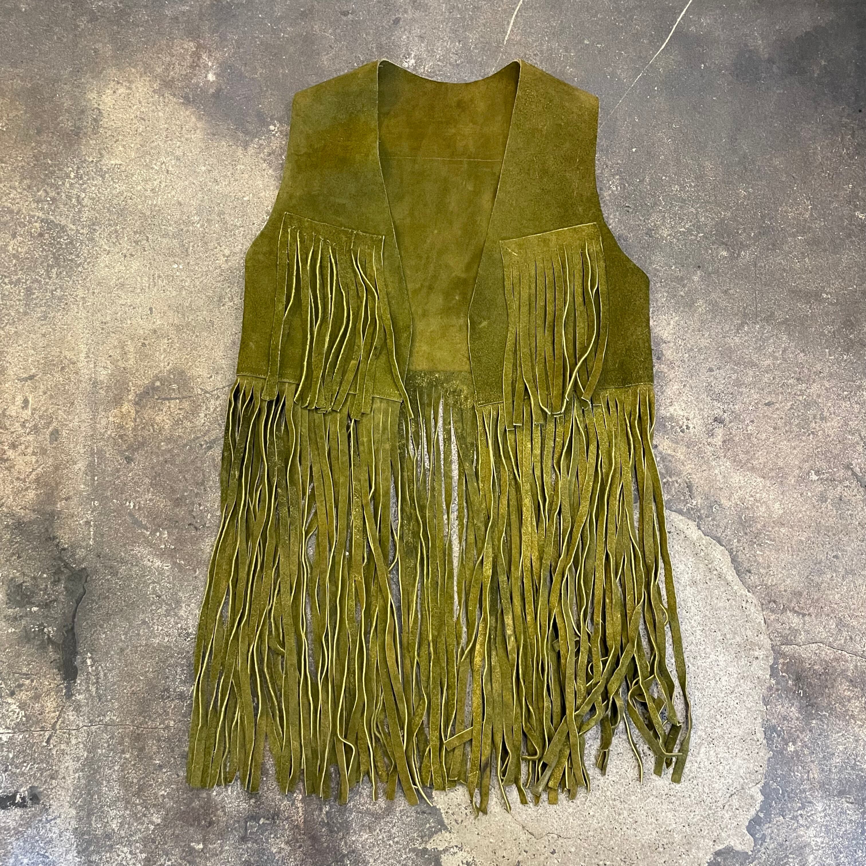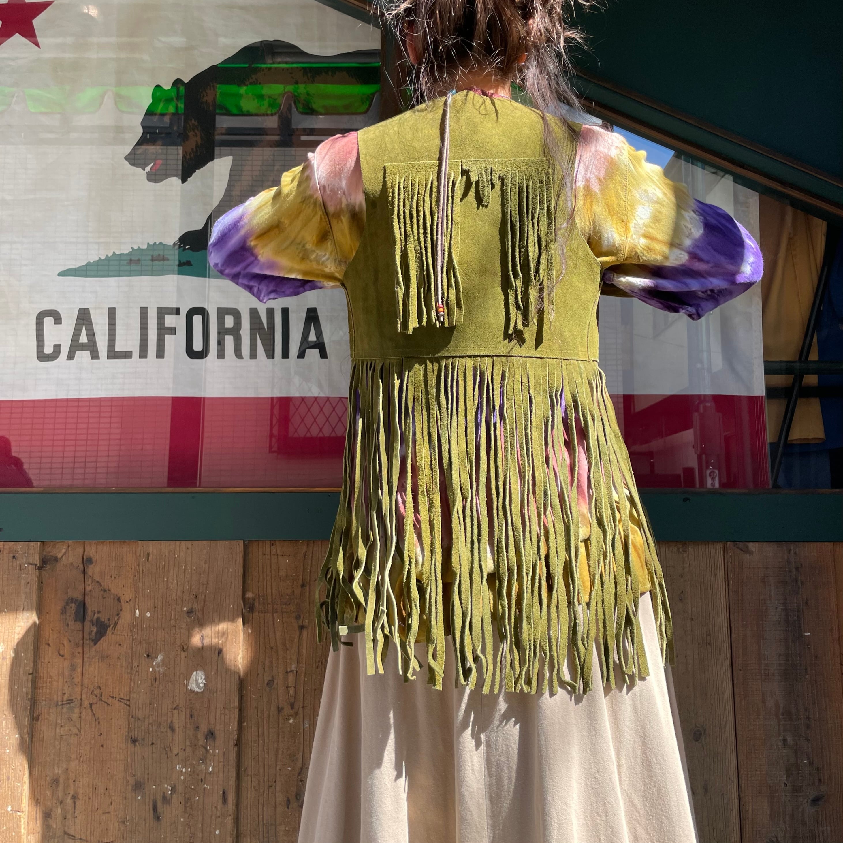 緑色のスエードと長めのフリンジがかわいいベストです。コンパクトなサイズ感も春夏のアイテムにはちょうど良いかと思います!