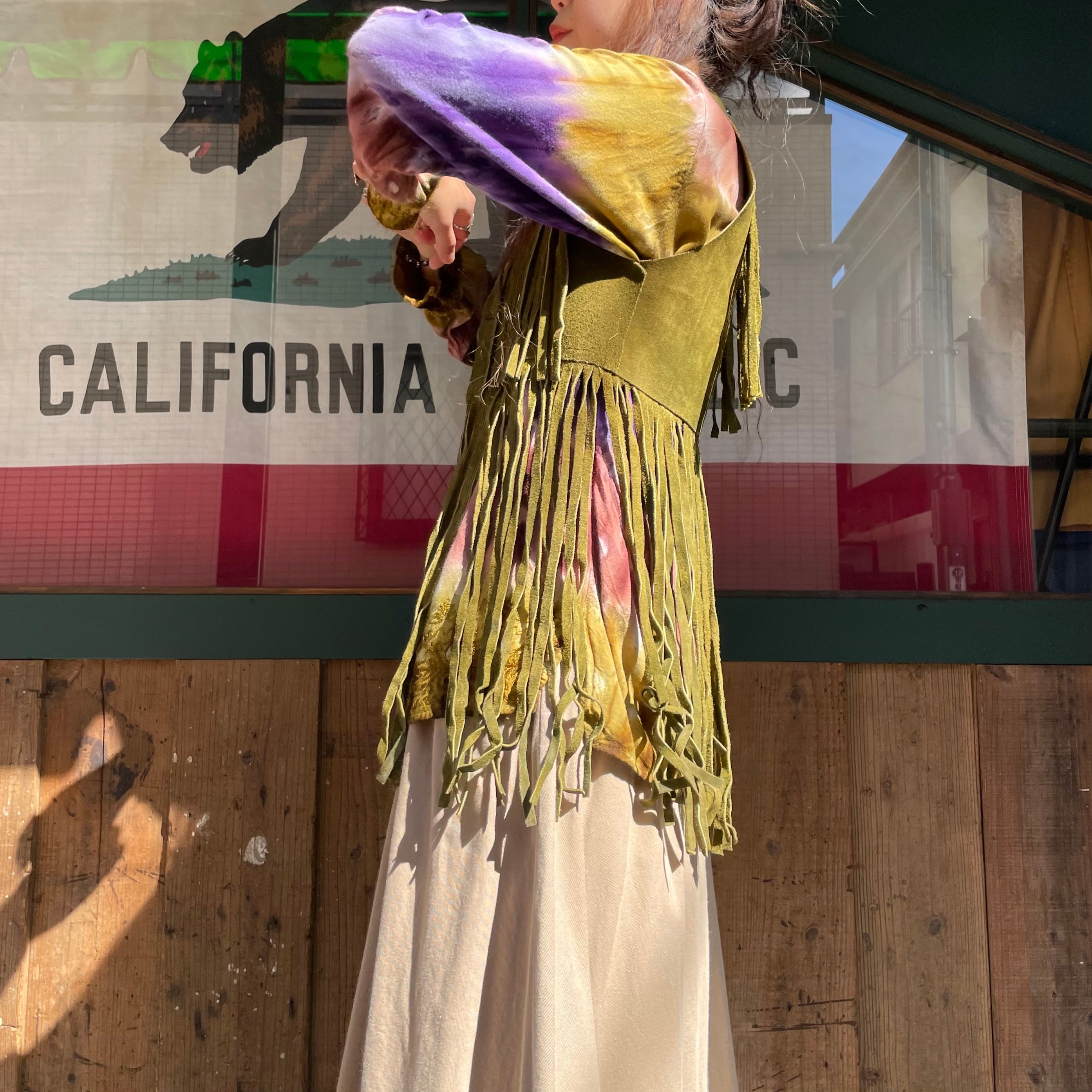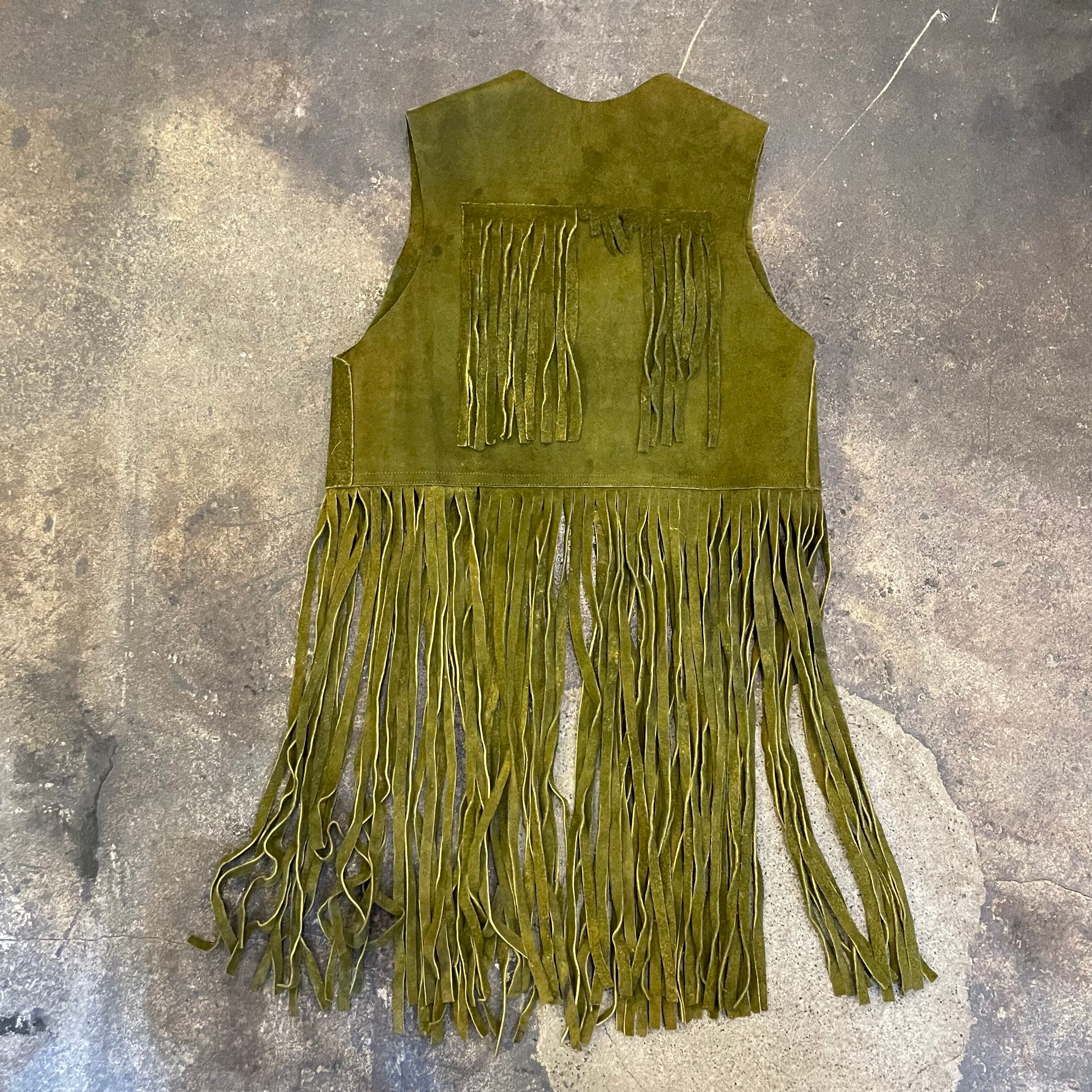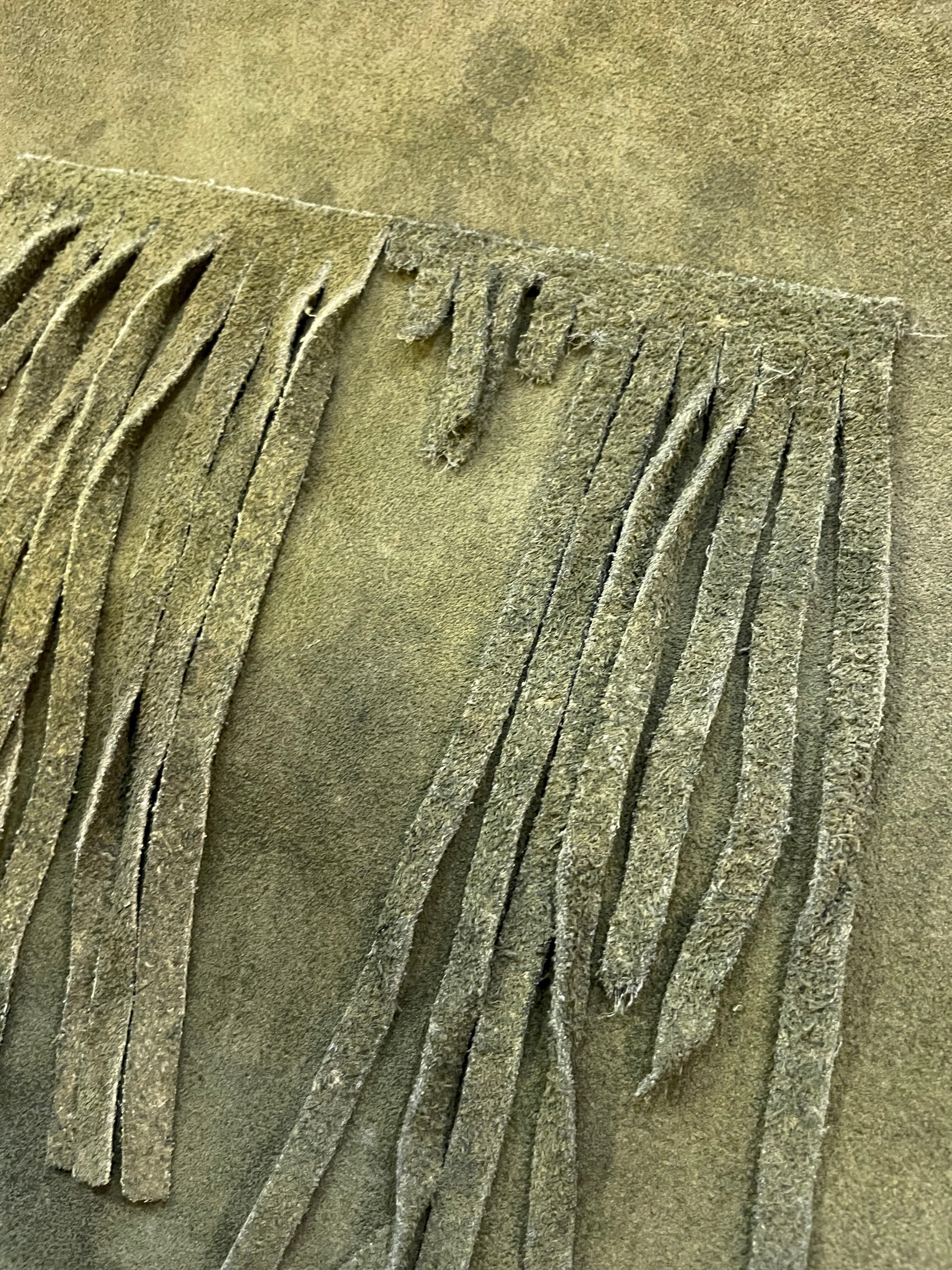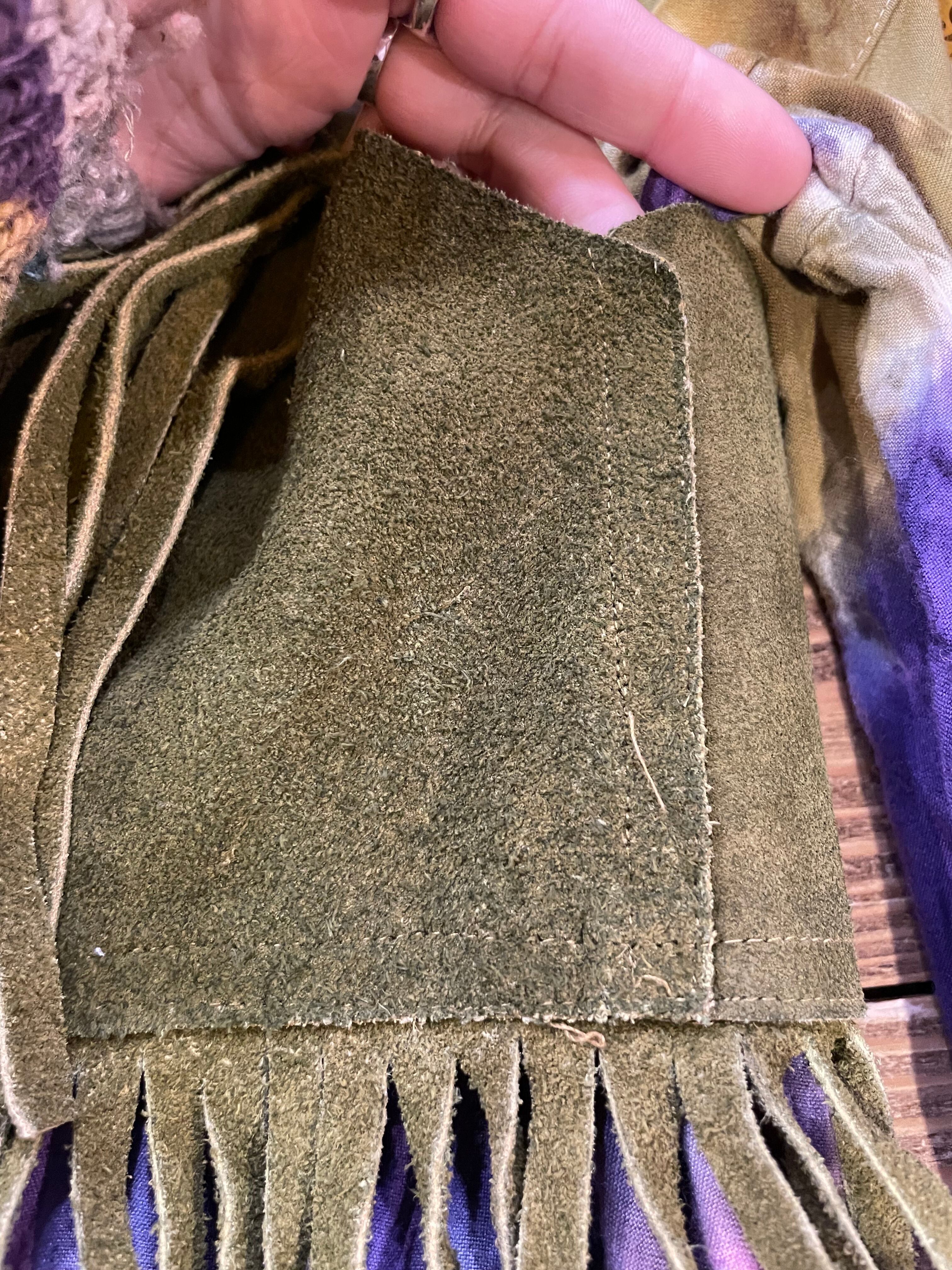 緑色のスエードと長めのフリンジがかわいいベストです。コンパクトなサイズ感も春夏のアイテムにはちょうど良いかと思います!