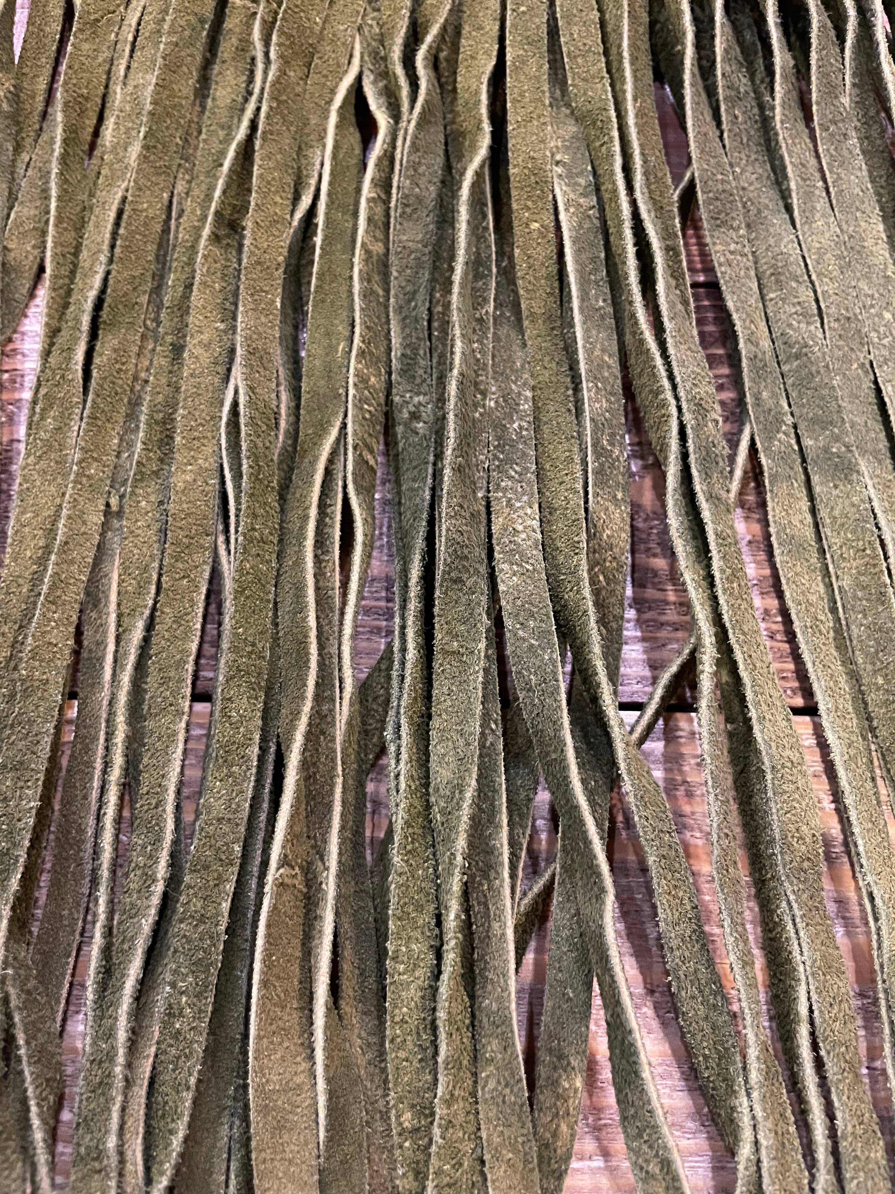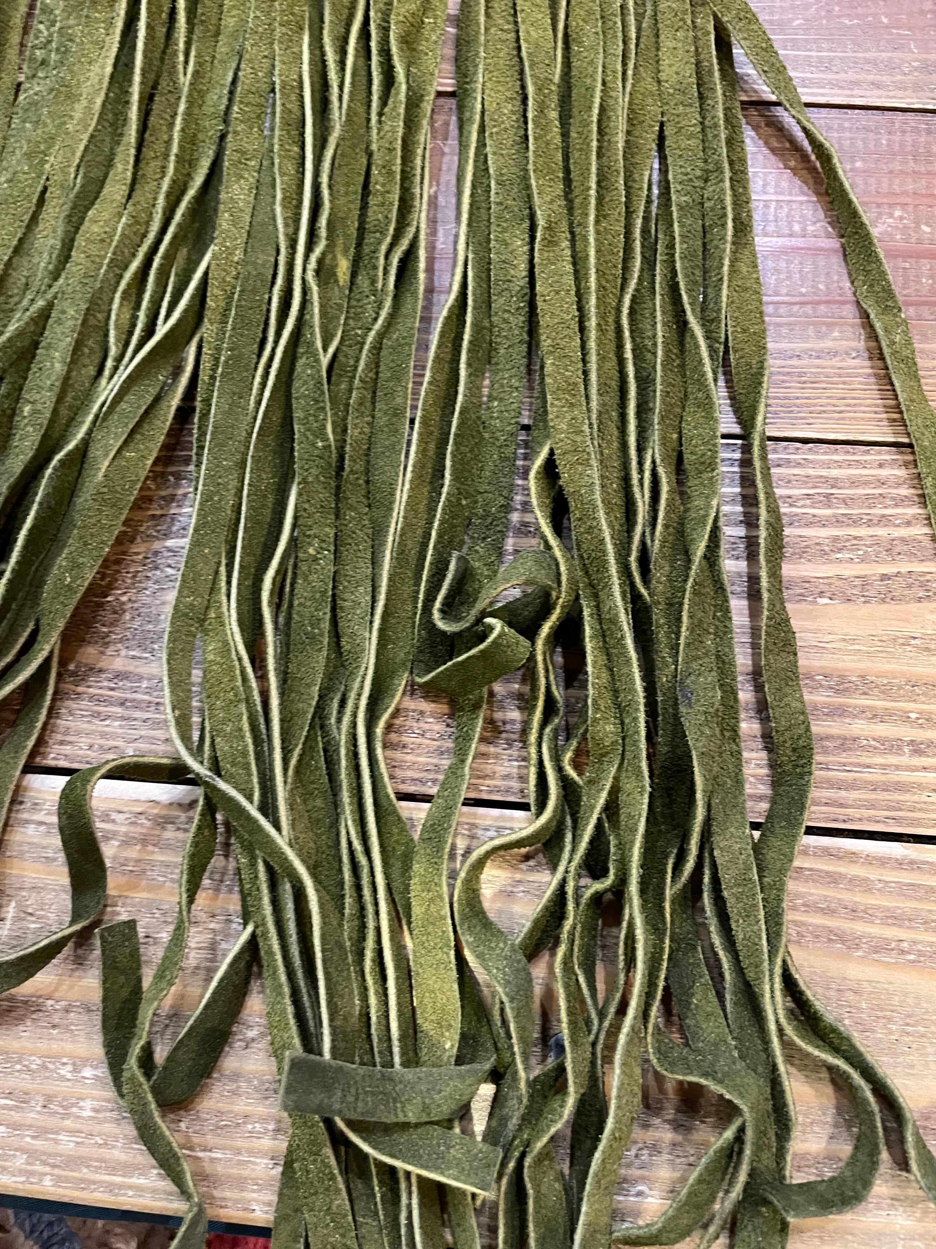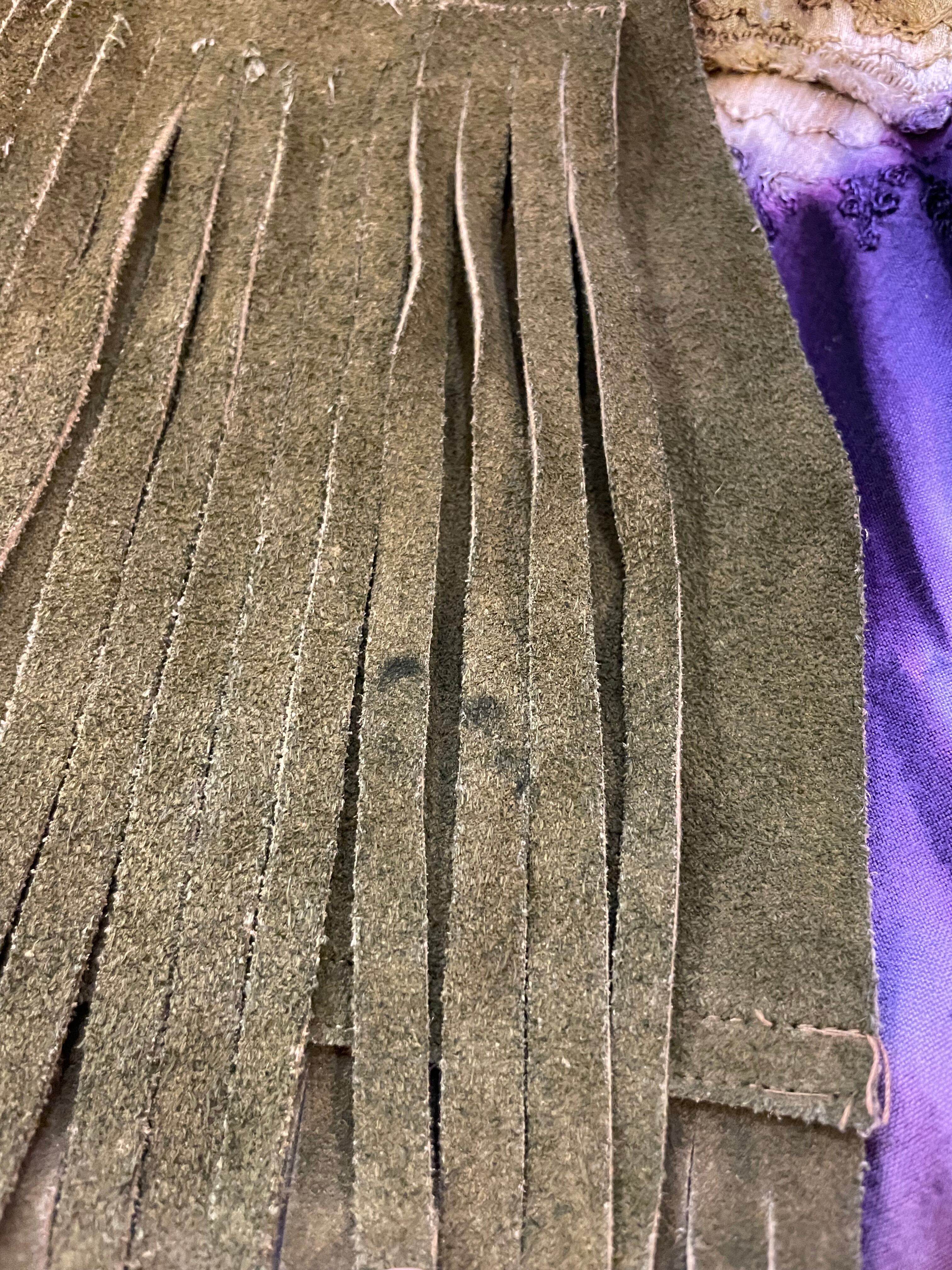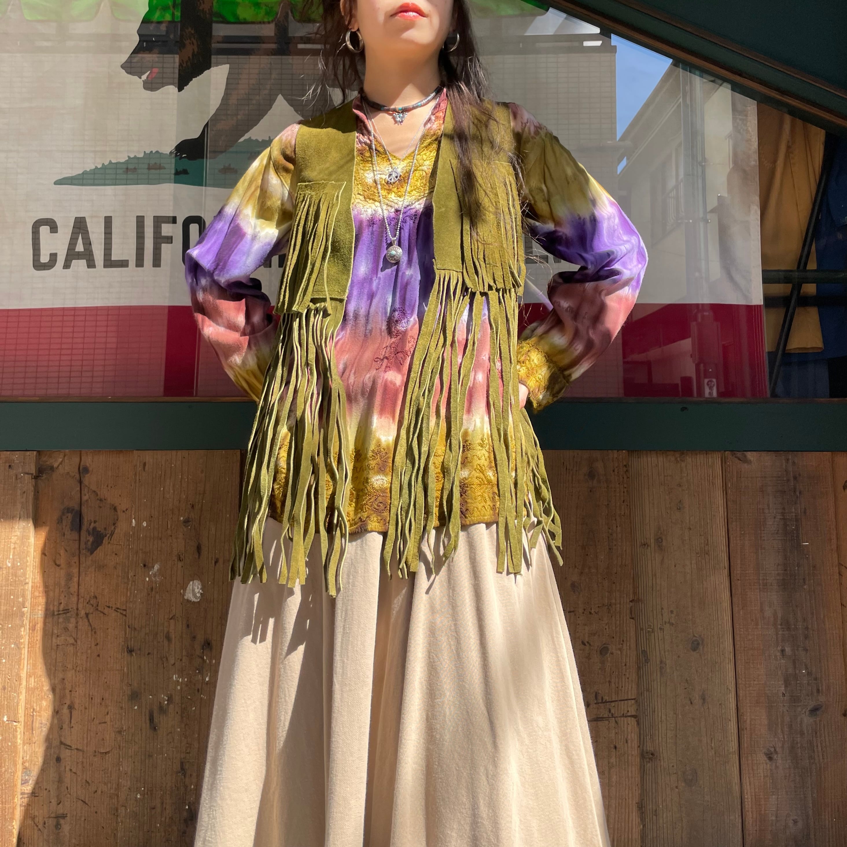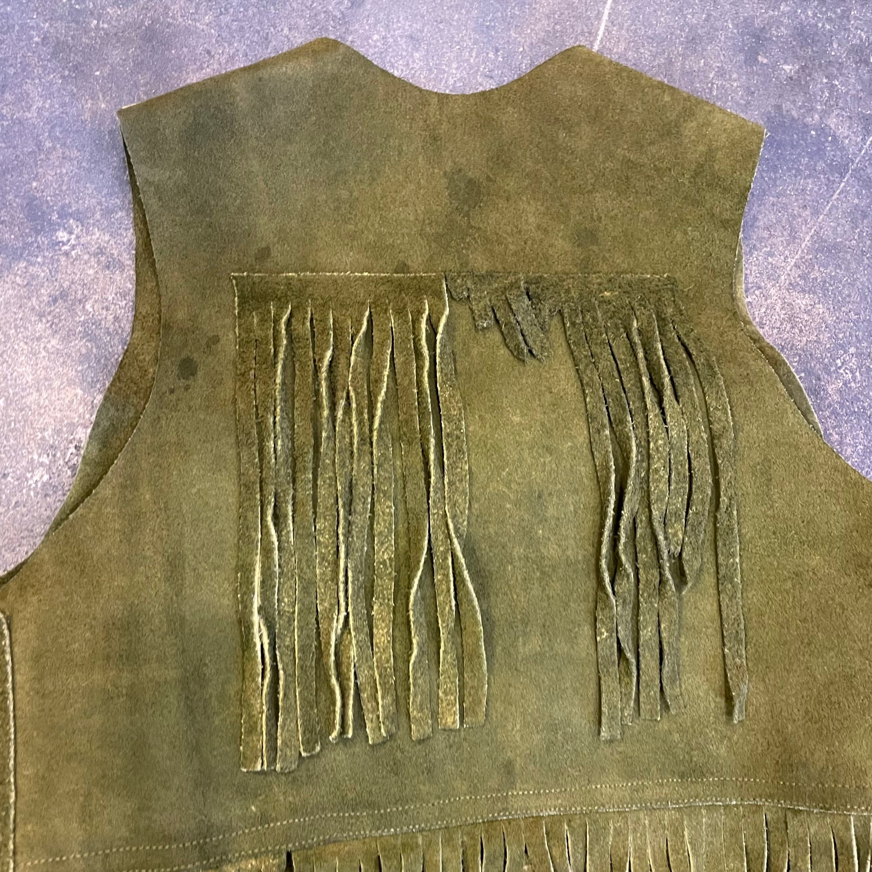 緑色のスエードと長めのフリンジがかわいいベストです。コンパクトなサイズ感も春夏のアイテムにはちょうど良いかと思います!