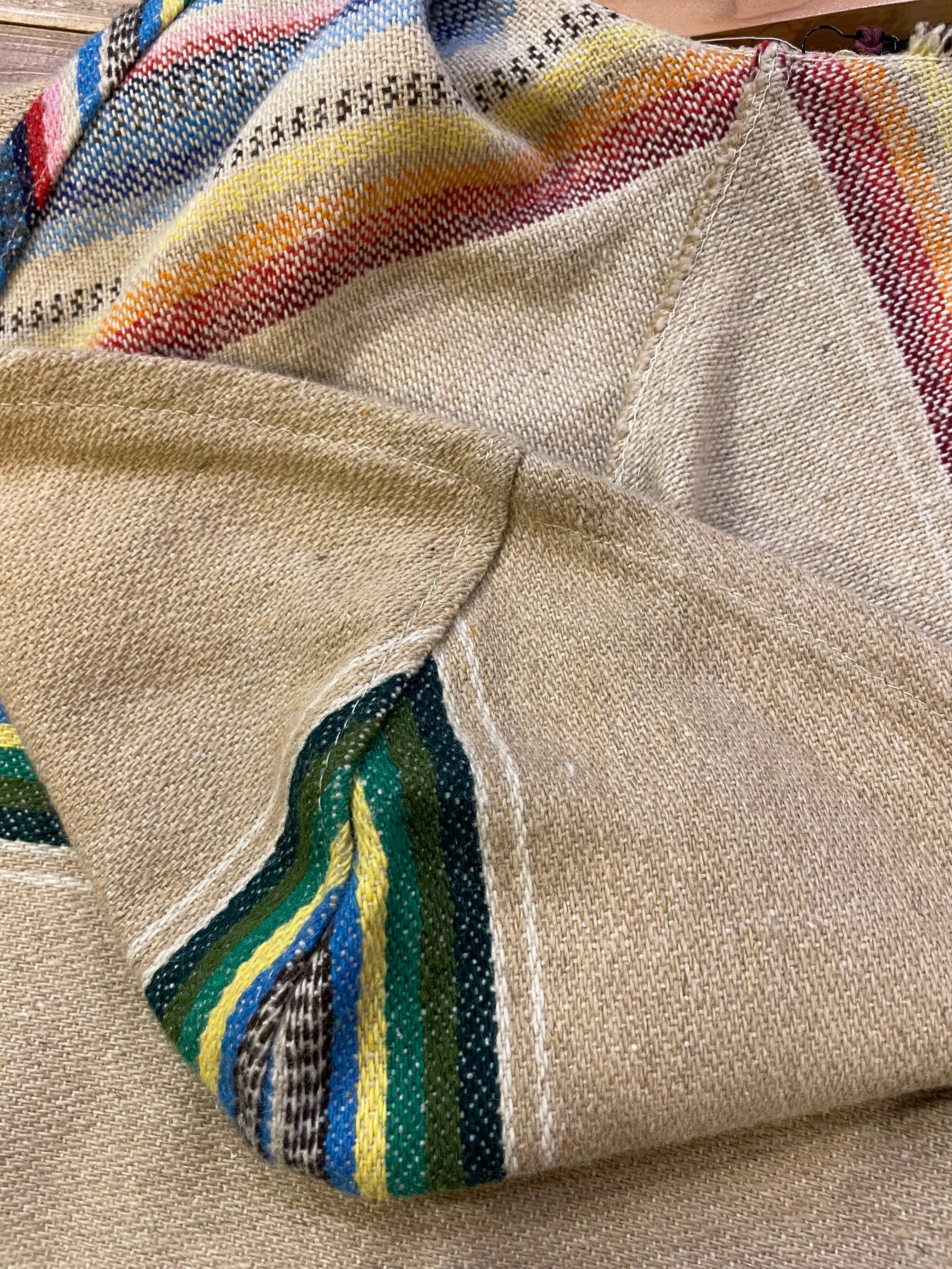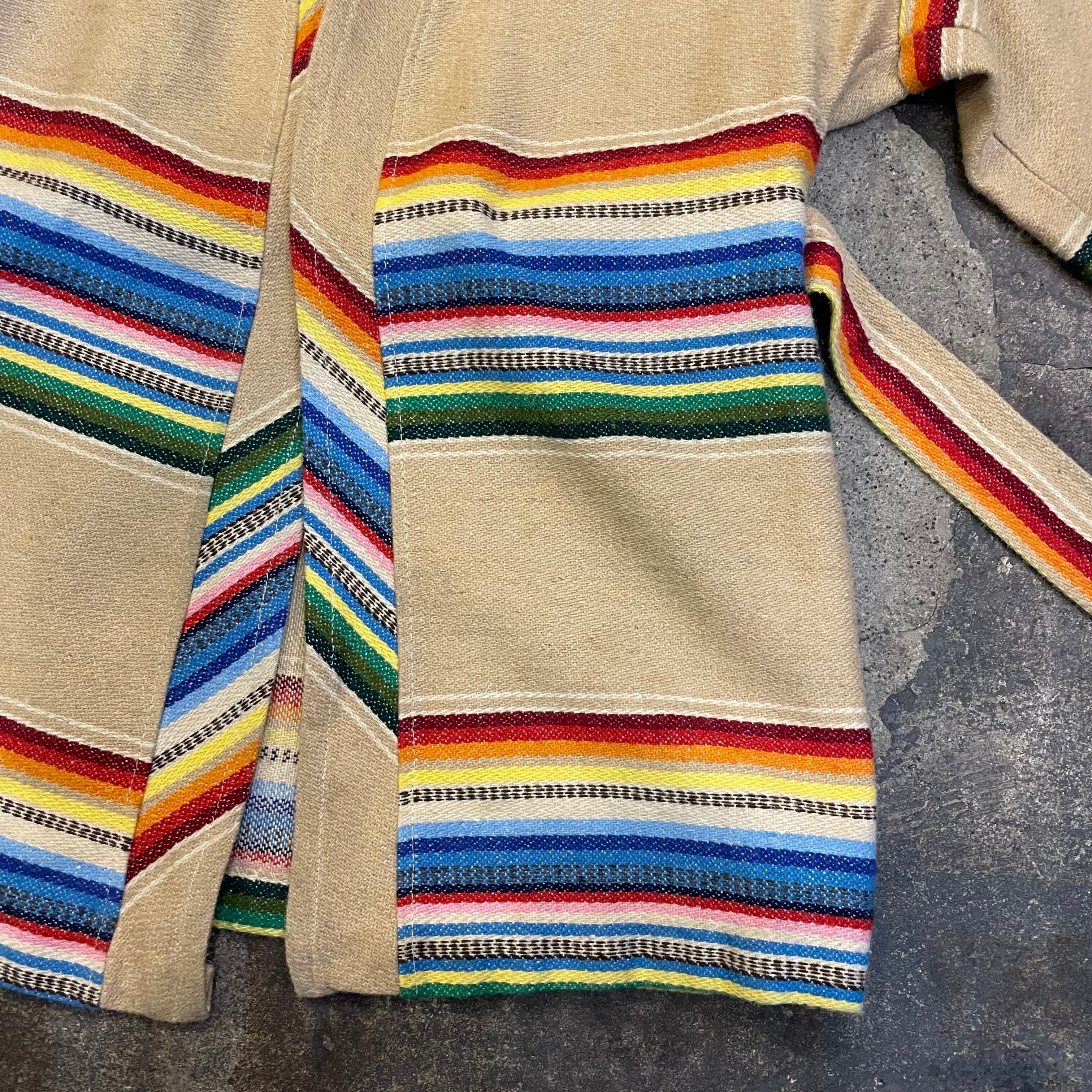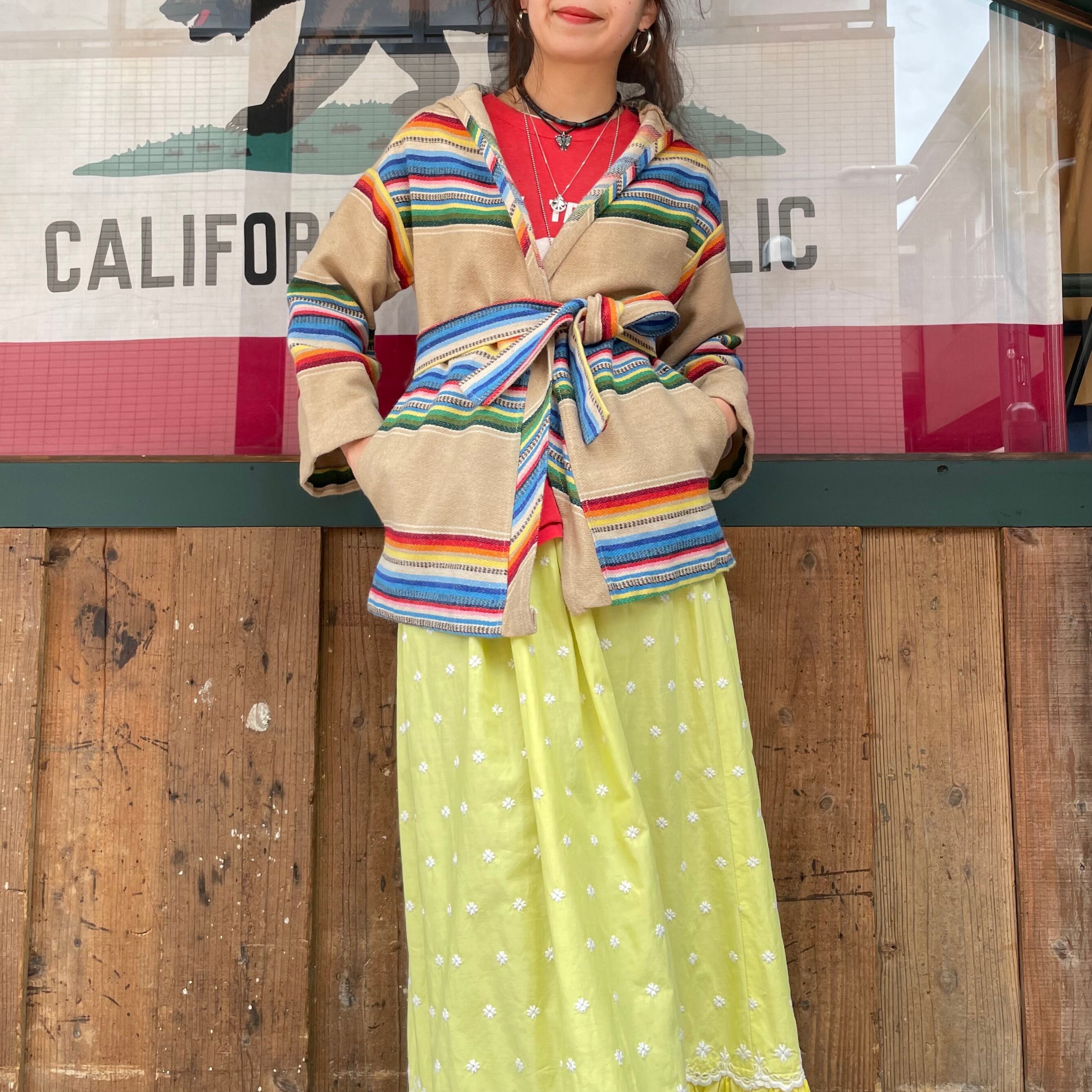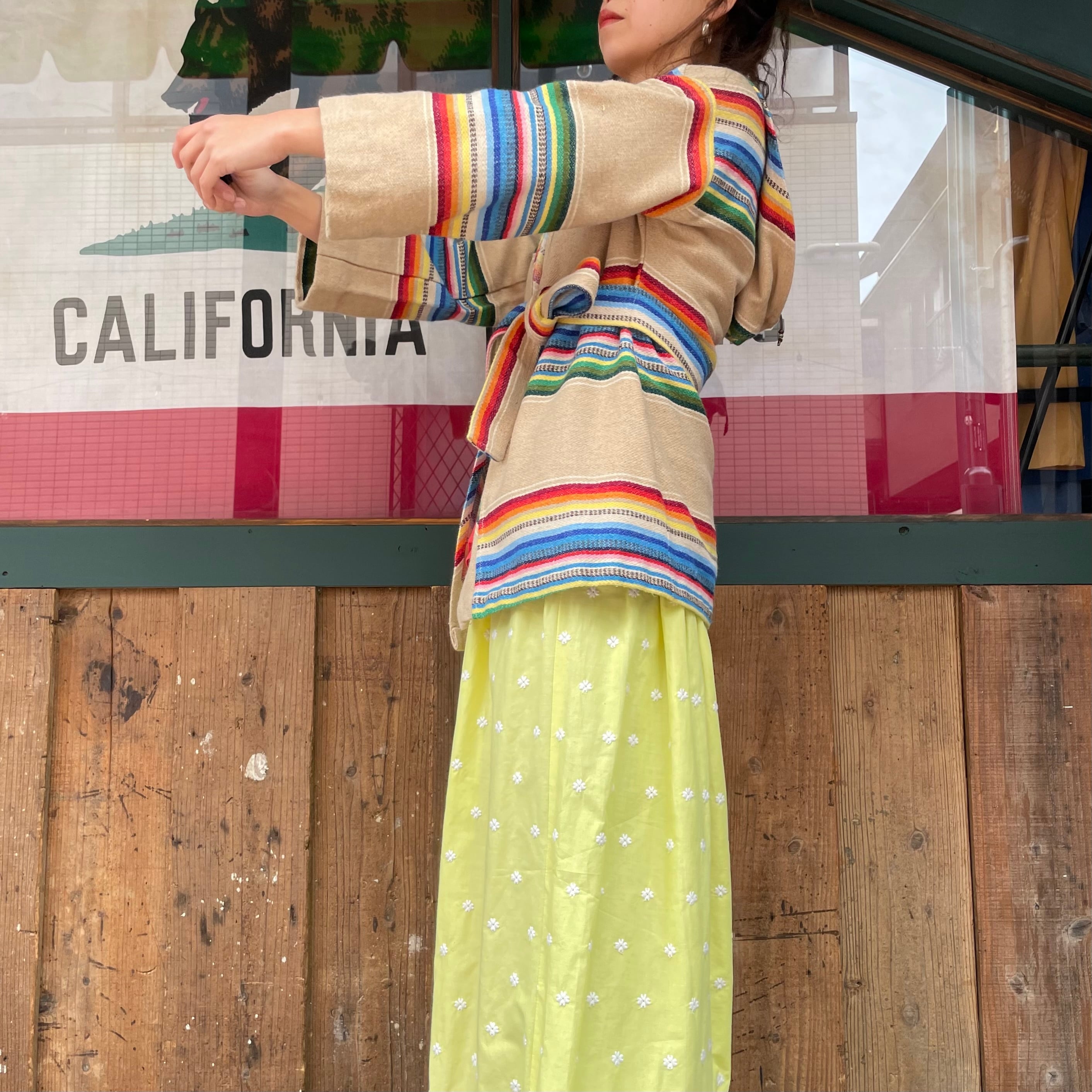 メキシカンラグのような模様がかわいいジャケットです。ベージュにカラフルなラインが映えていて派手すぎないですし春らしい一着です。