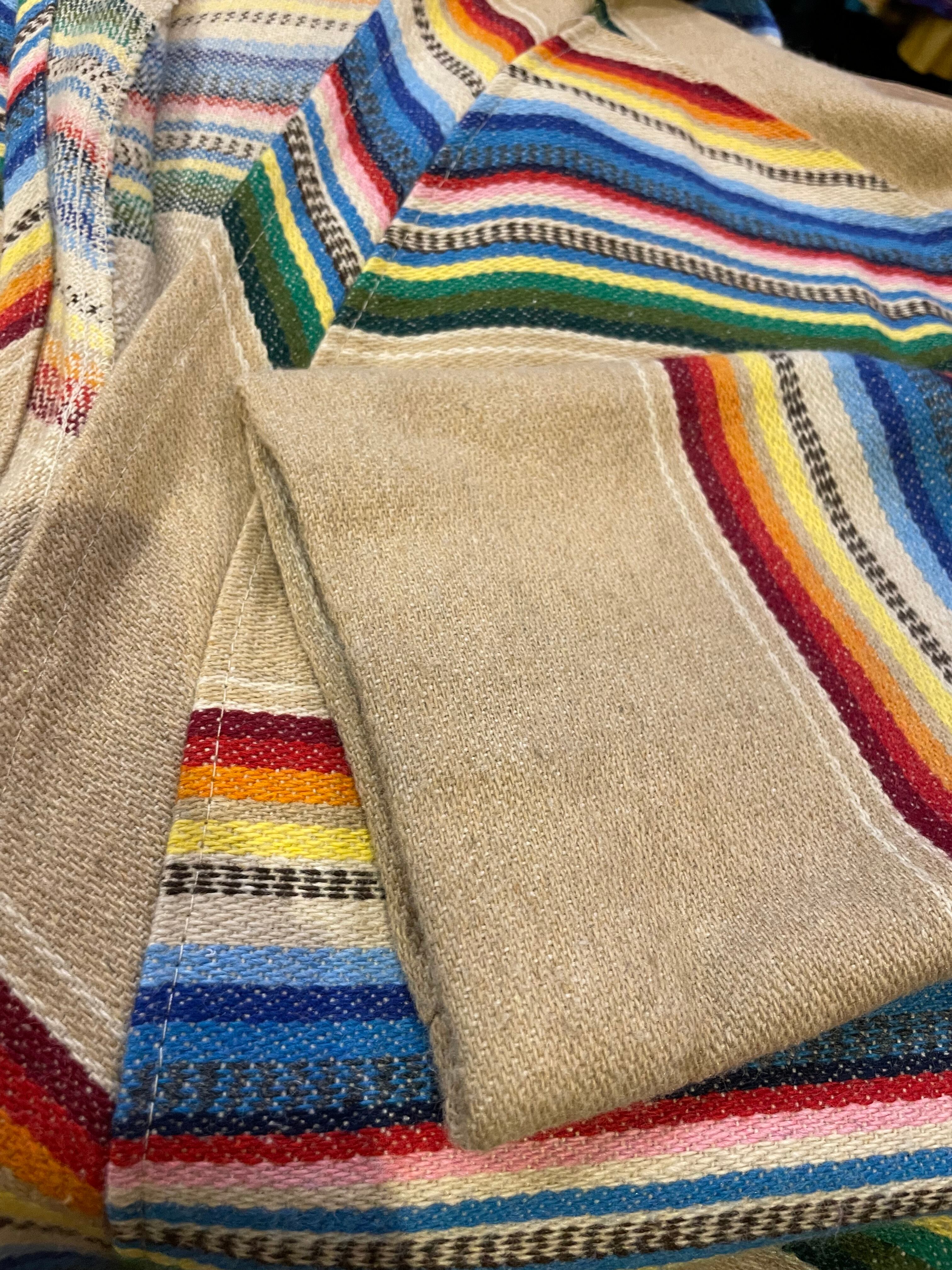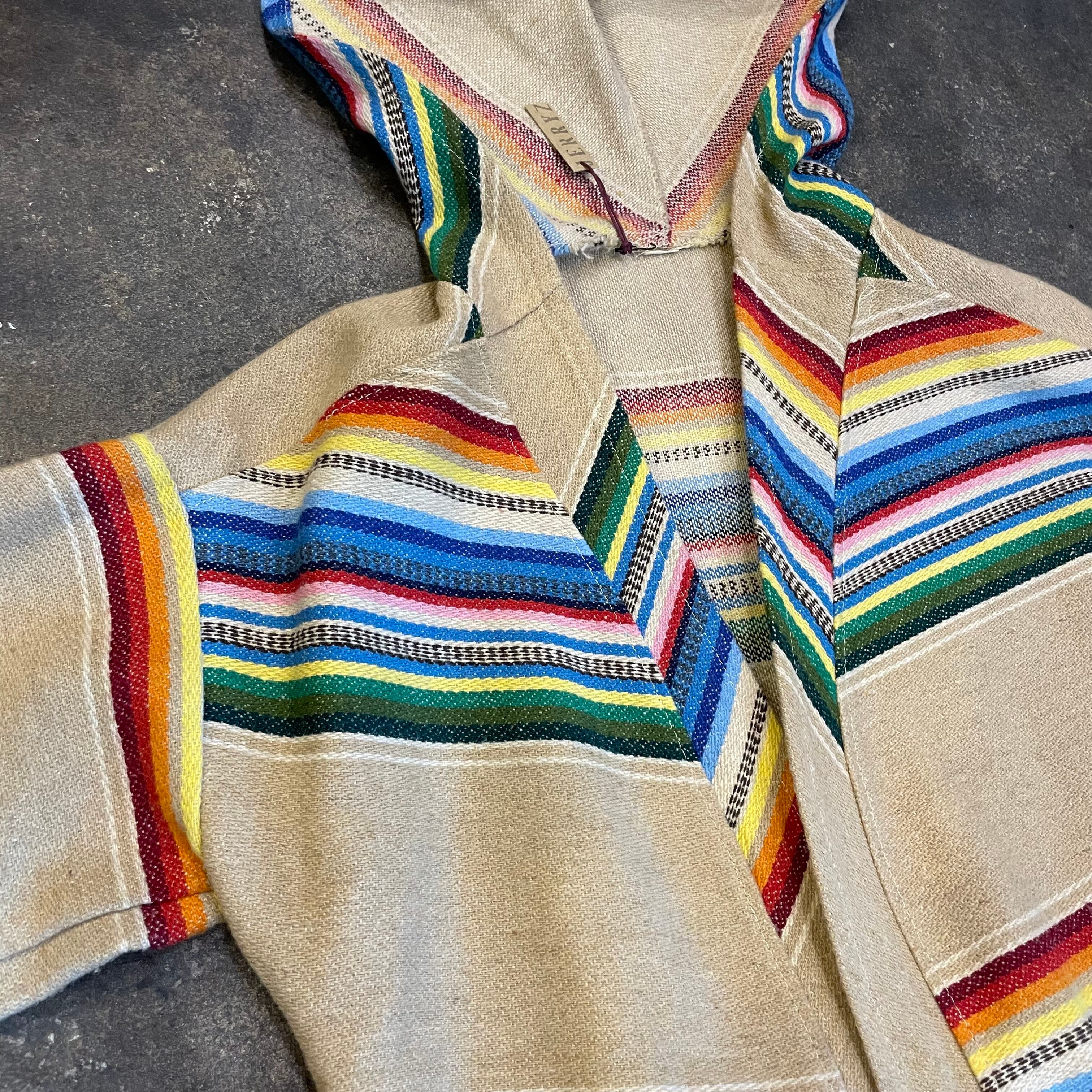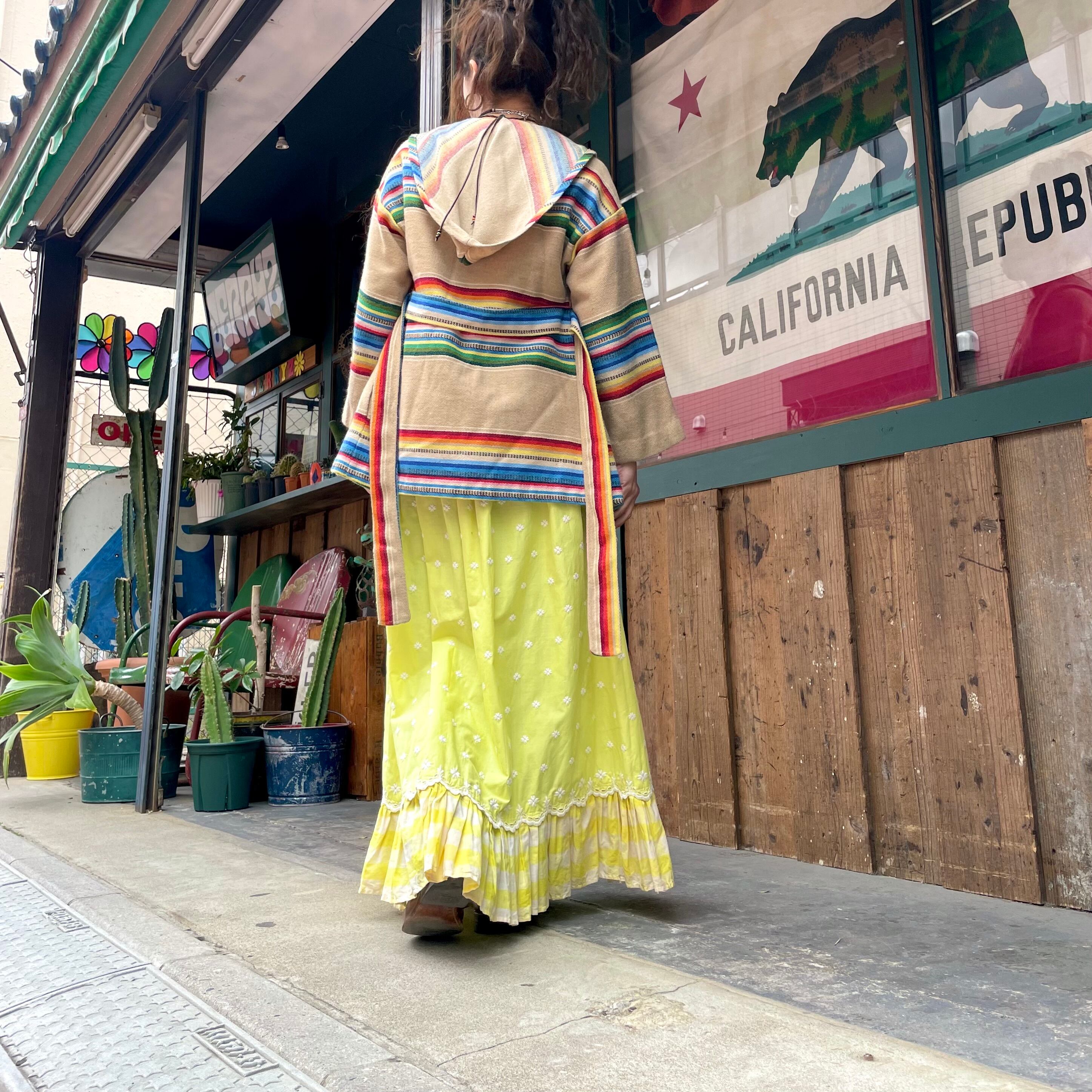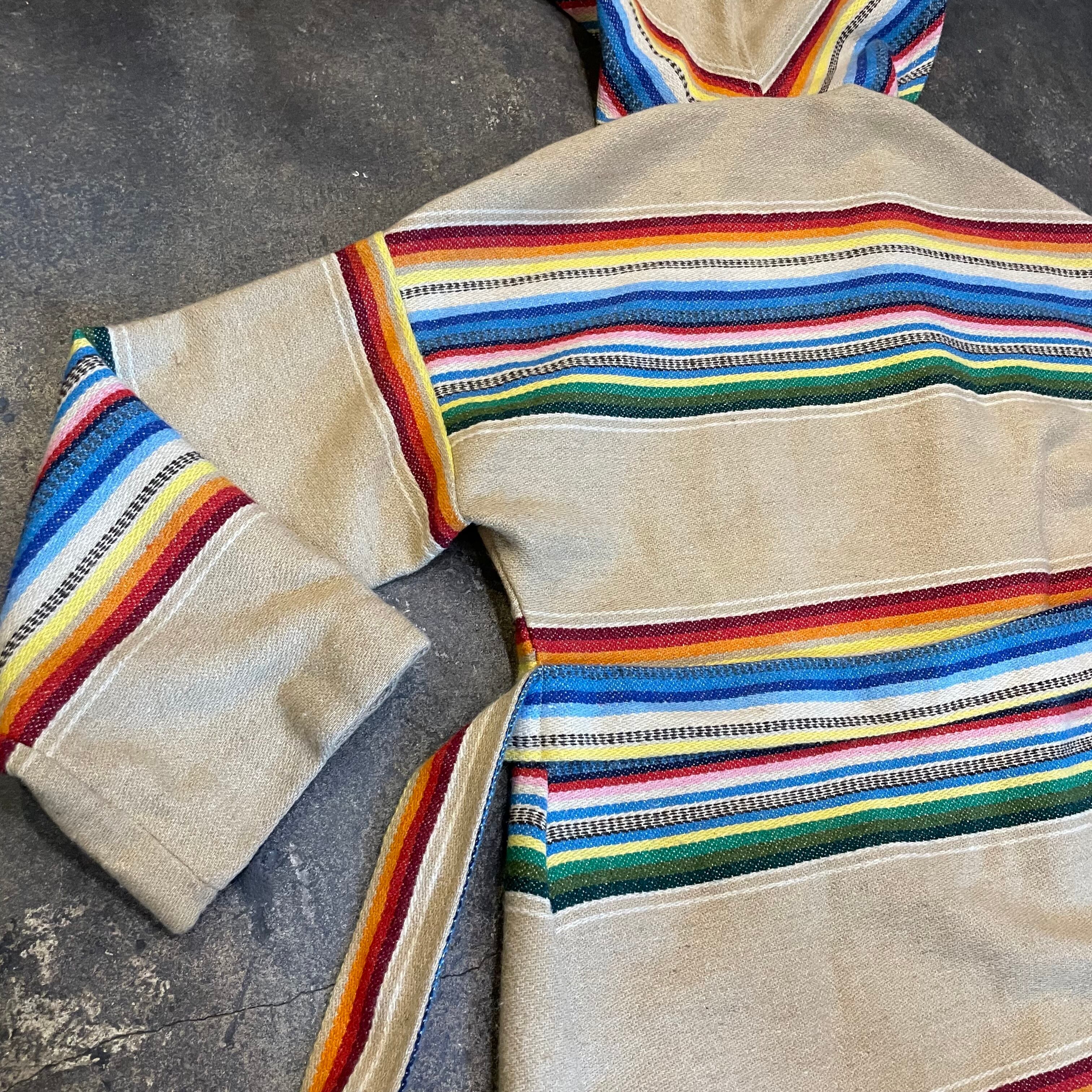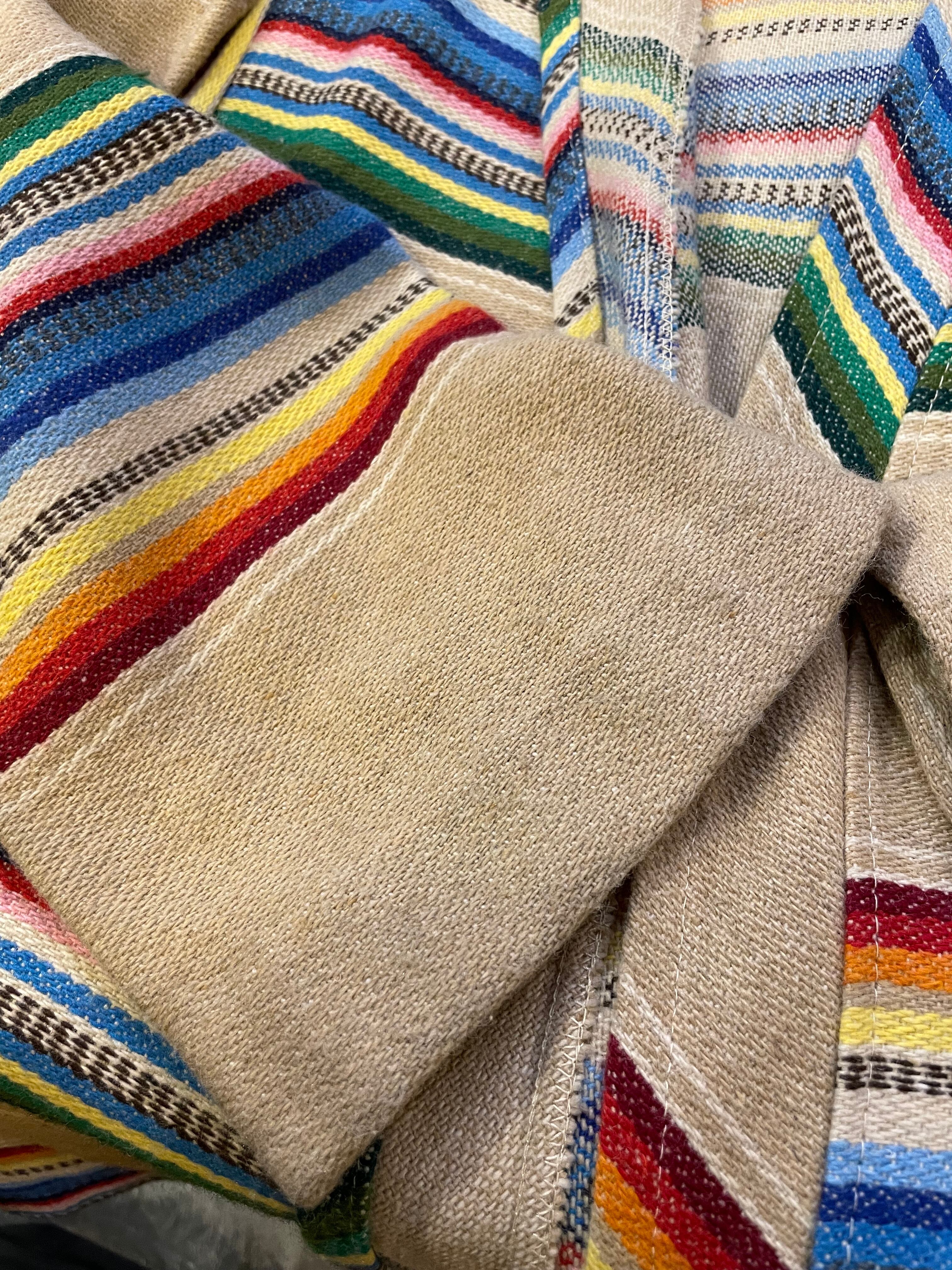 メキシカンラグのような模様がかわいいジャケットです。ベージュにカラフルなラインが映えていて派手すぎないですし春らしい一着です。