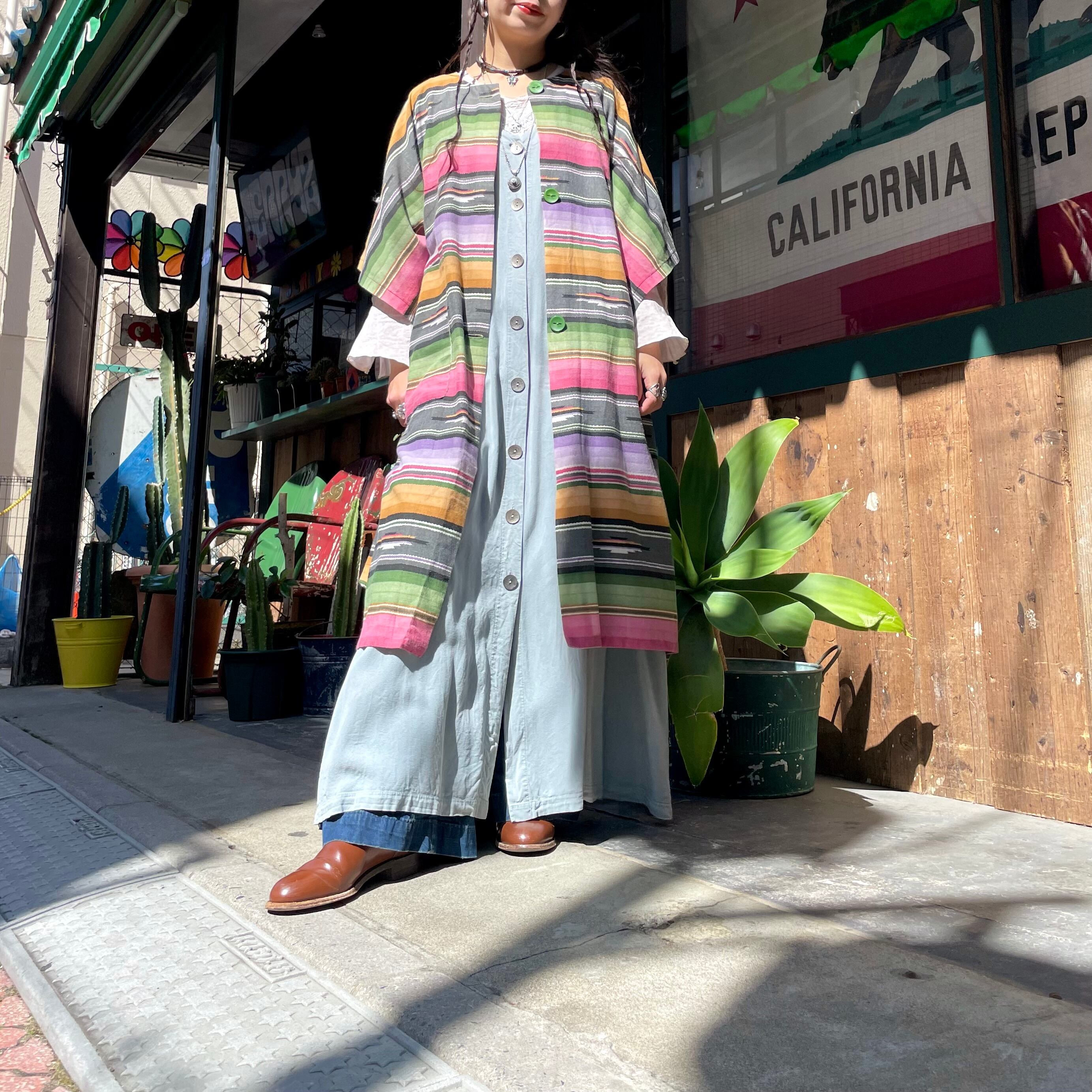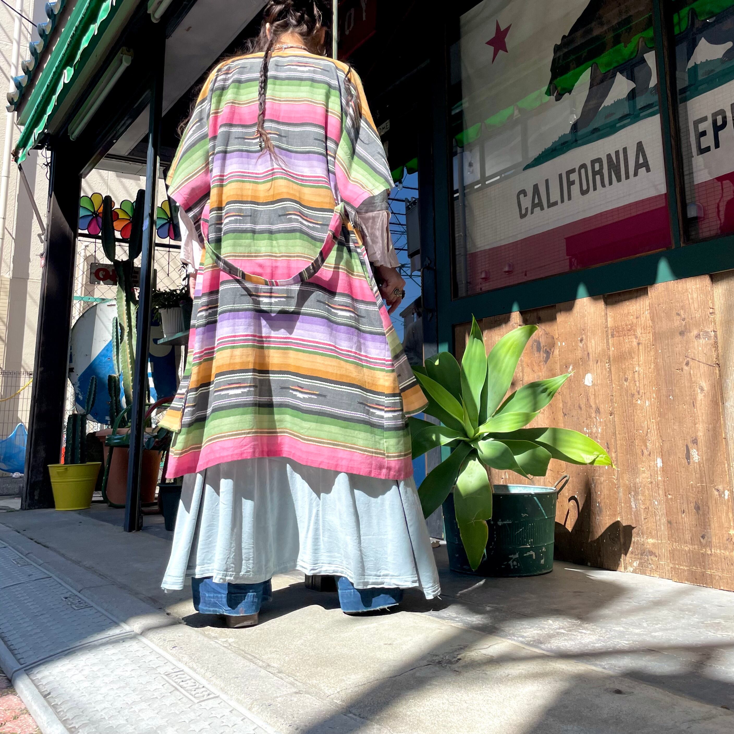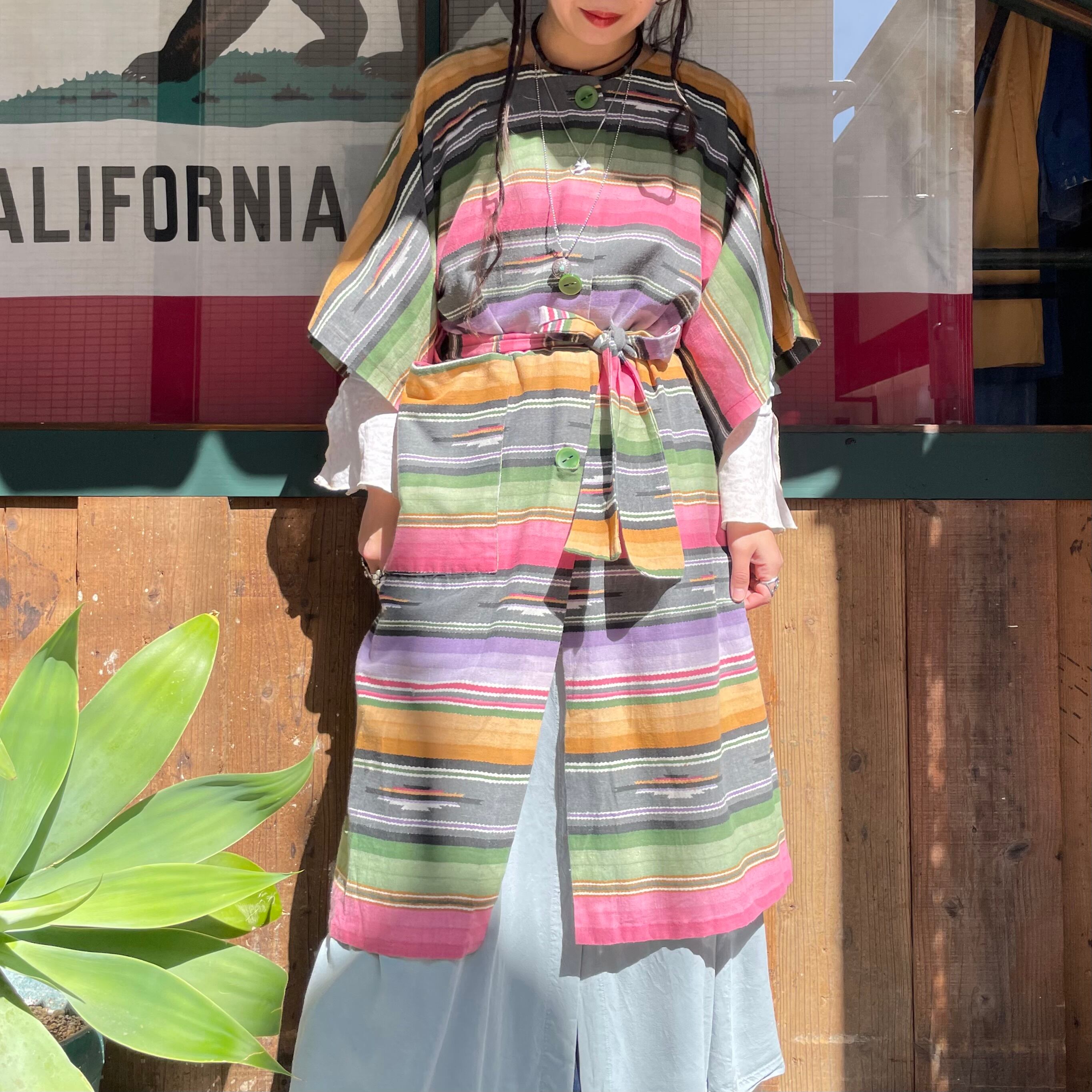 優しい色味の強すぎないネイティブ柄が良い感じのガウンです。前のボタンは3つだけで大きなパッチポケットがあり、ウエストは紐が付いていてワンピースっぽくも着られますし、羽織りとしてもお使い頂けます。