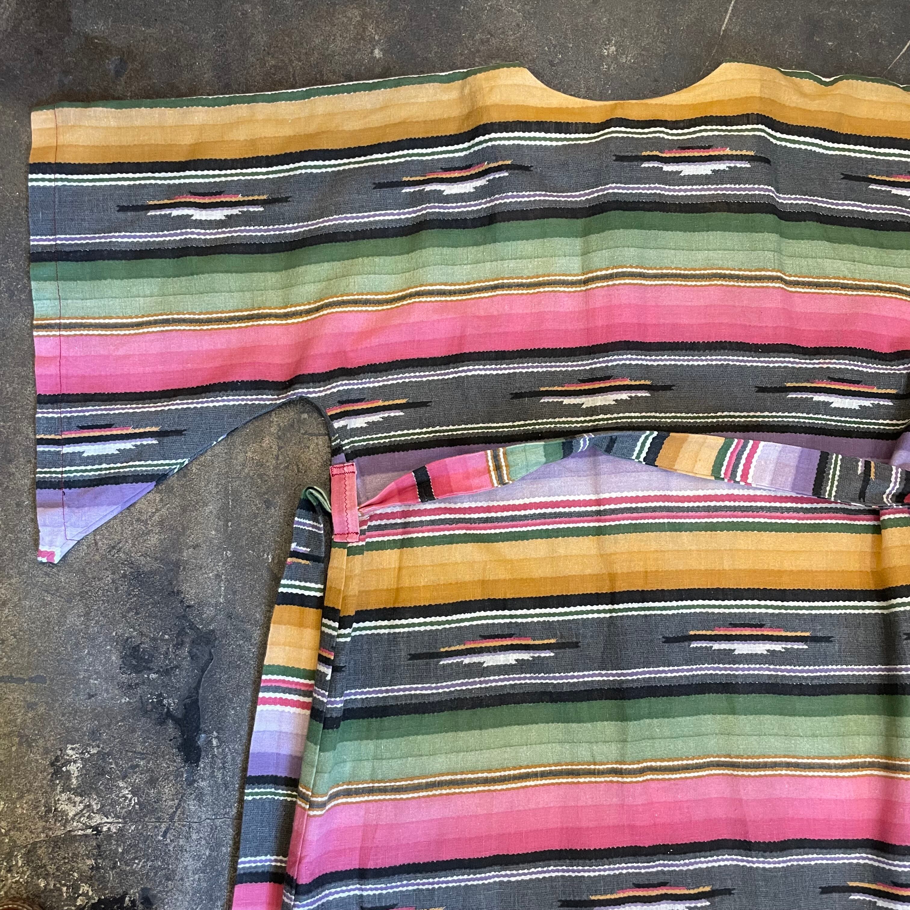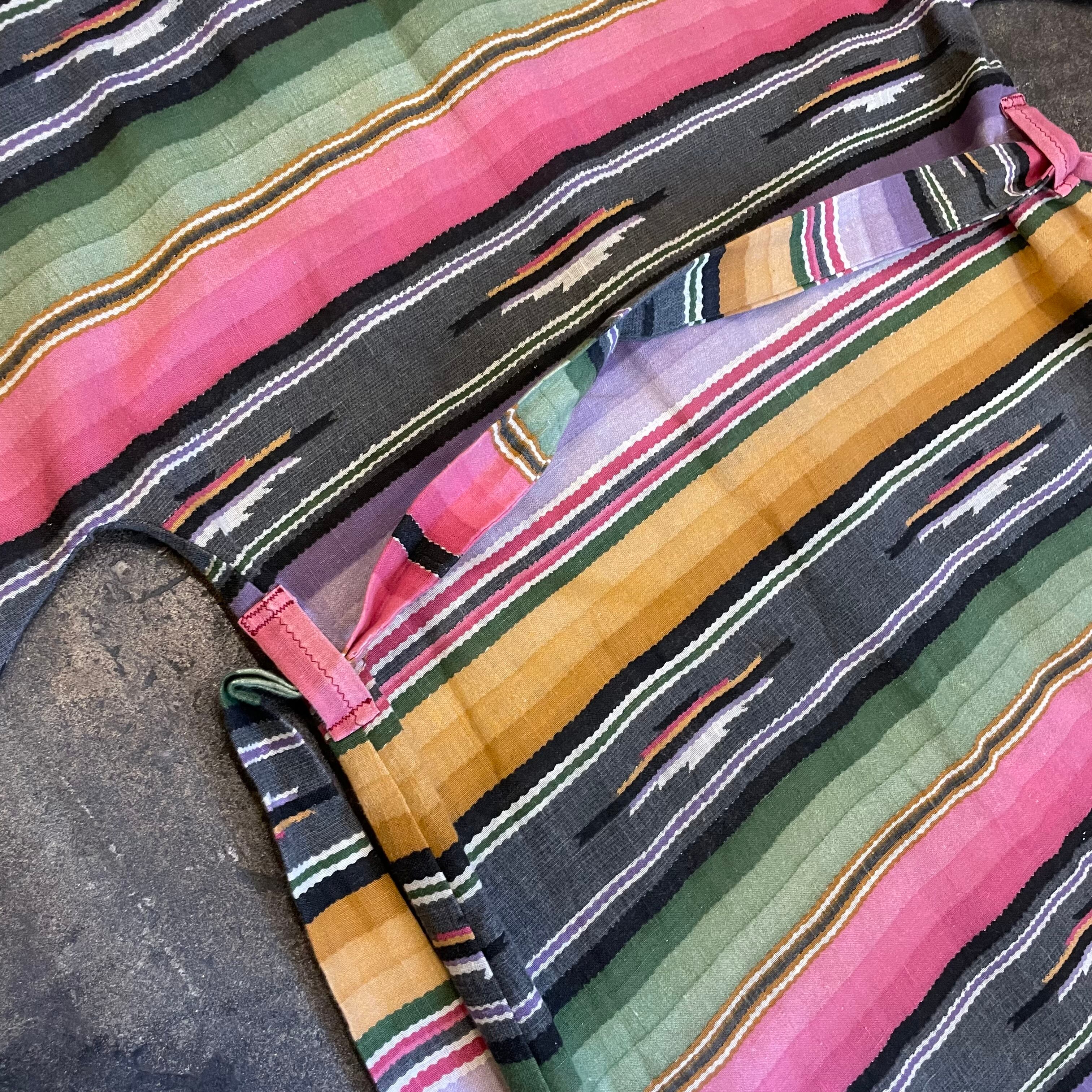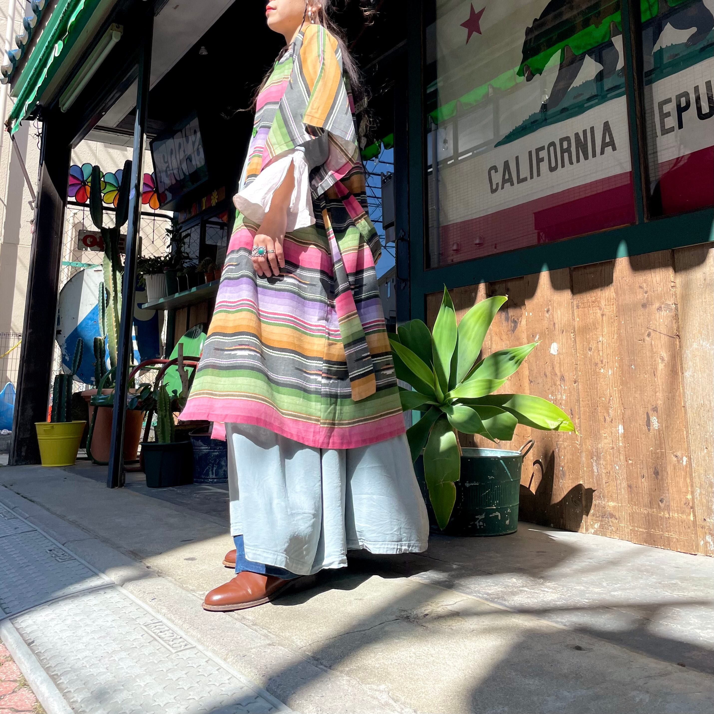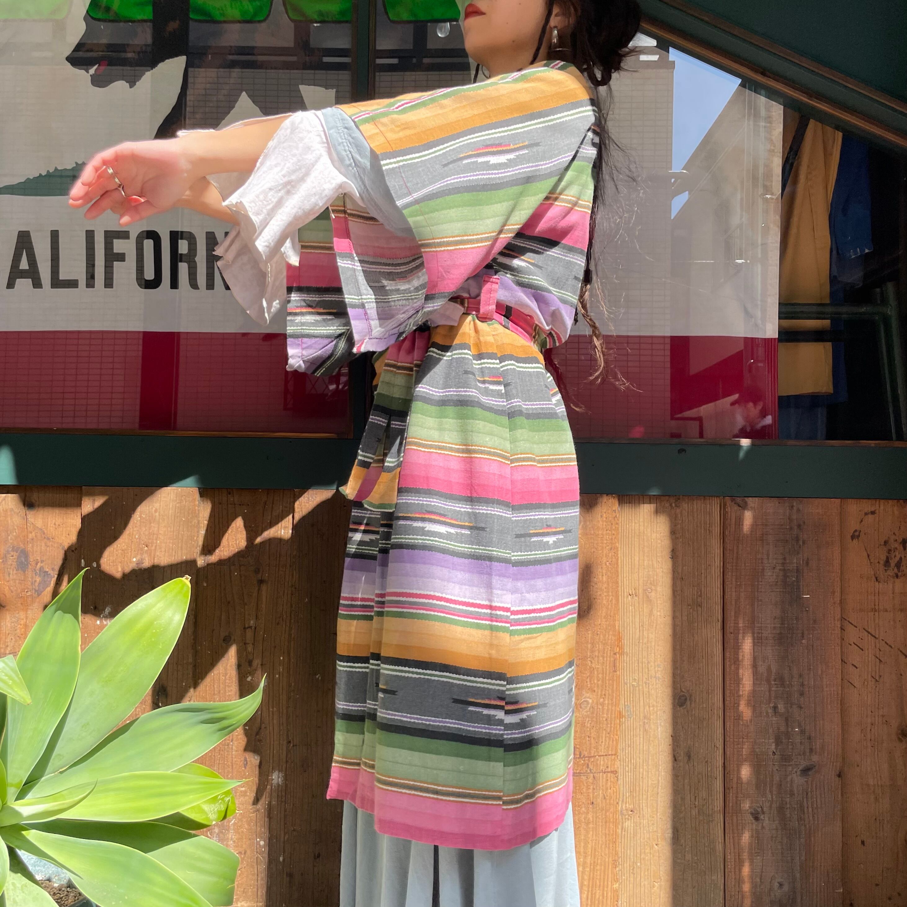 優しい色味の強すぎないネイティブ柄が良い感じのガウンです。前のボタンは3つだけで大きなパッチポケットがあり、ウエストは紐が付いていてワンピースっぽくも着られますし、羽織りとしてもお使い頂けます。