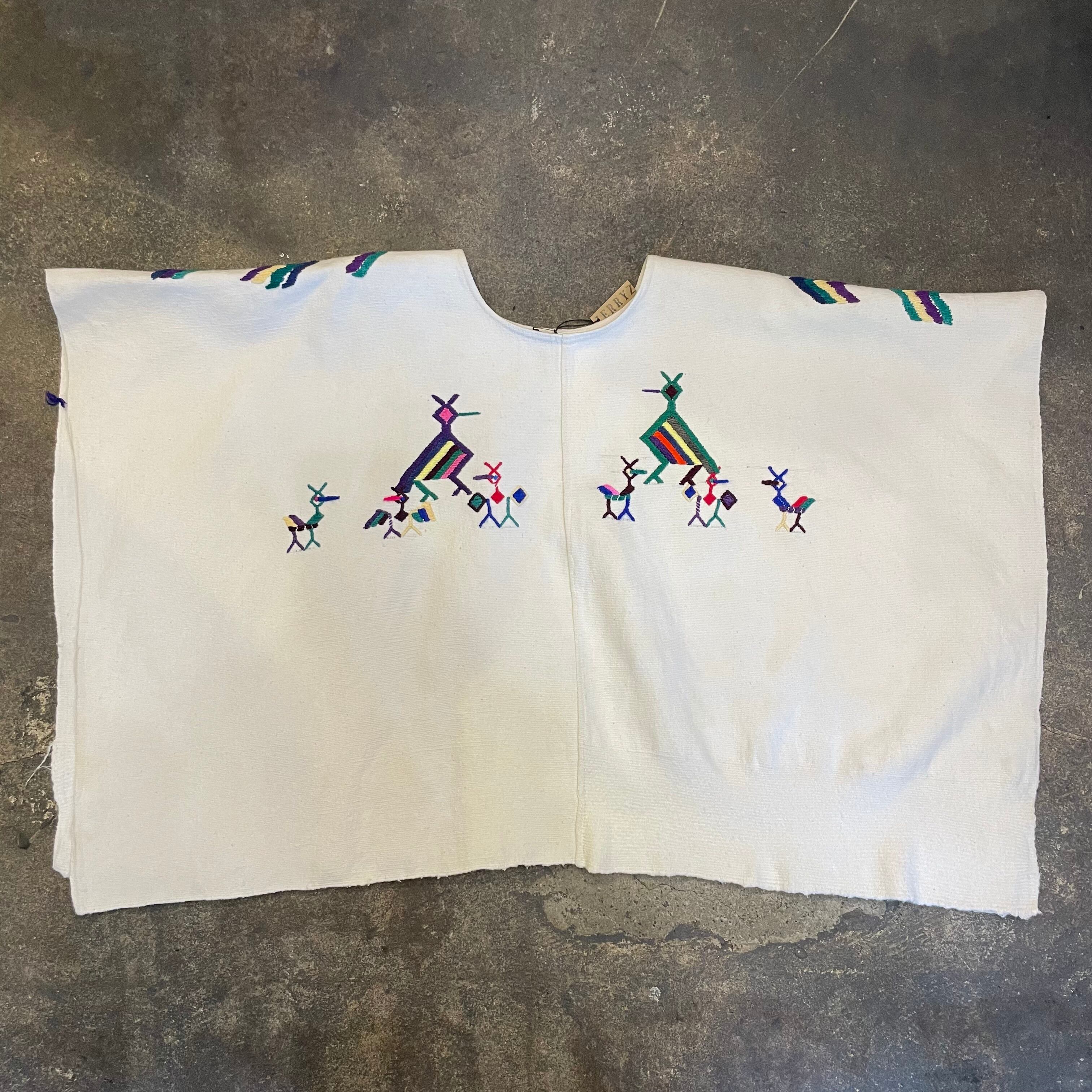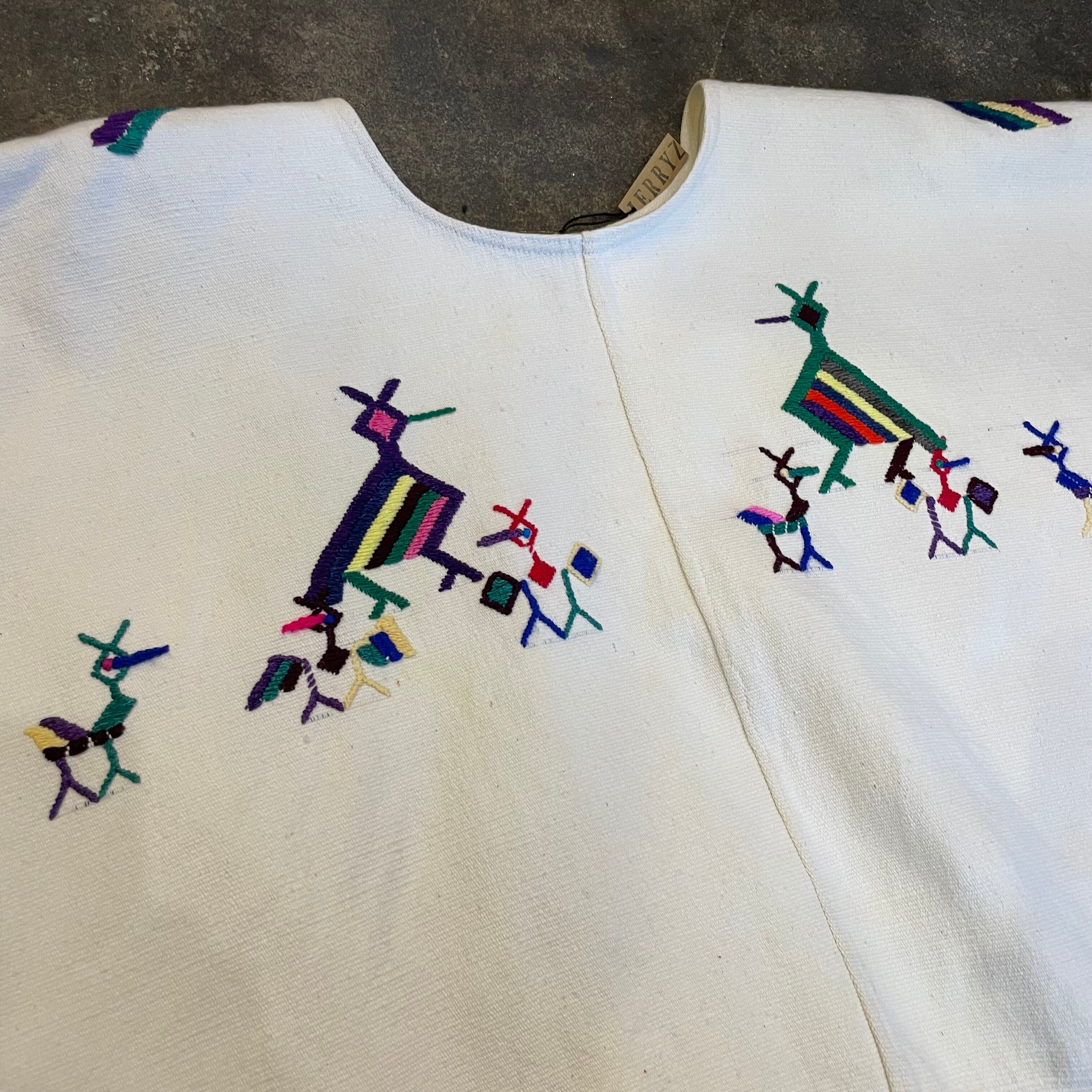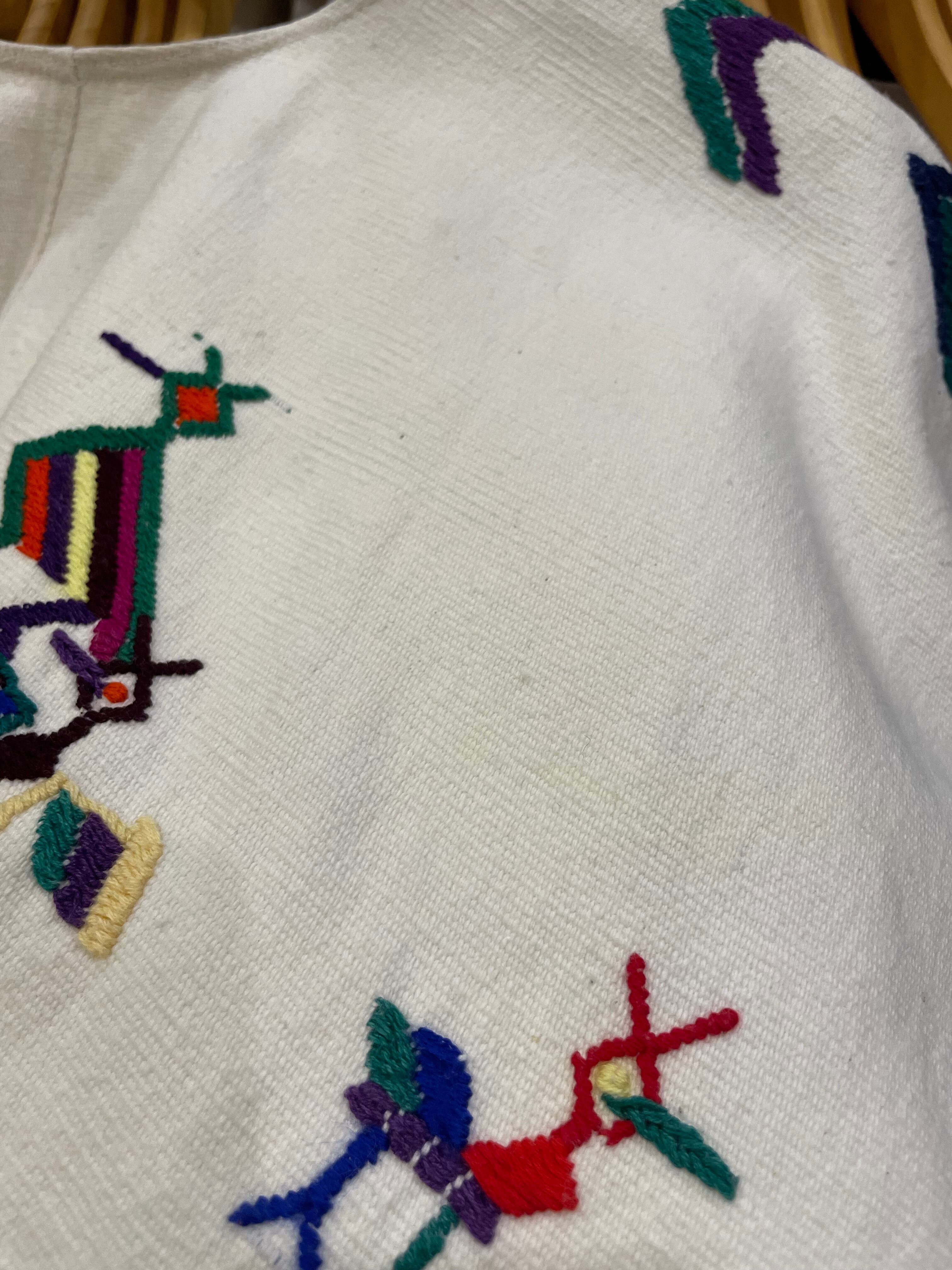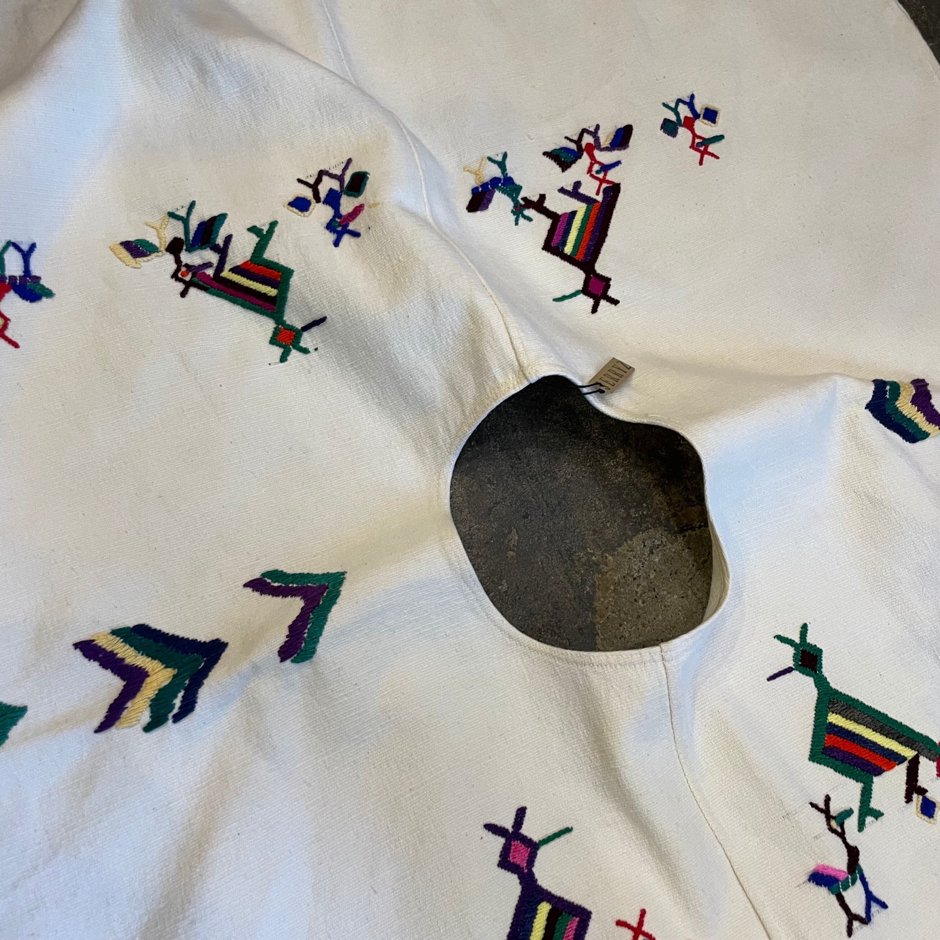 しっかり厚手のおそらく手織りの生地に鳥?のような動物の刺繍がかわいいグアテマラのポンチョです。