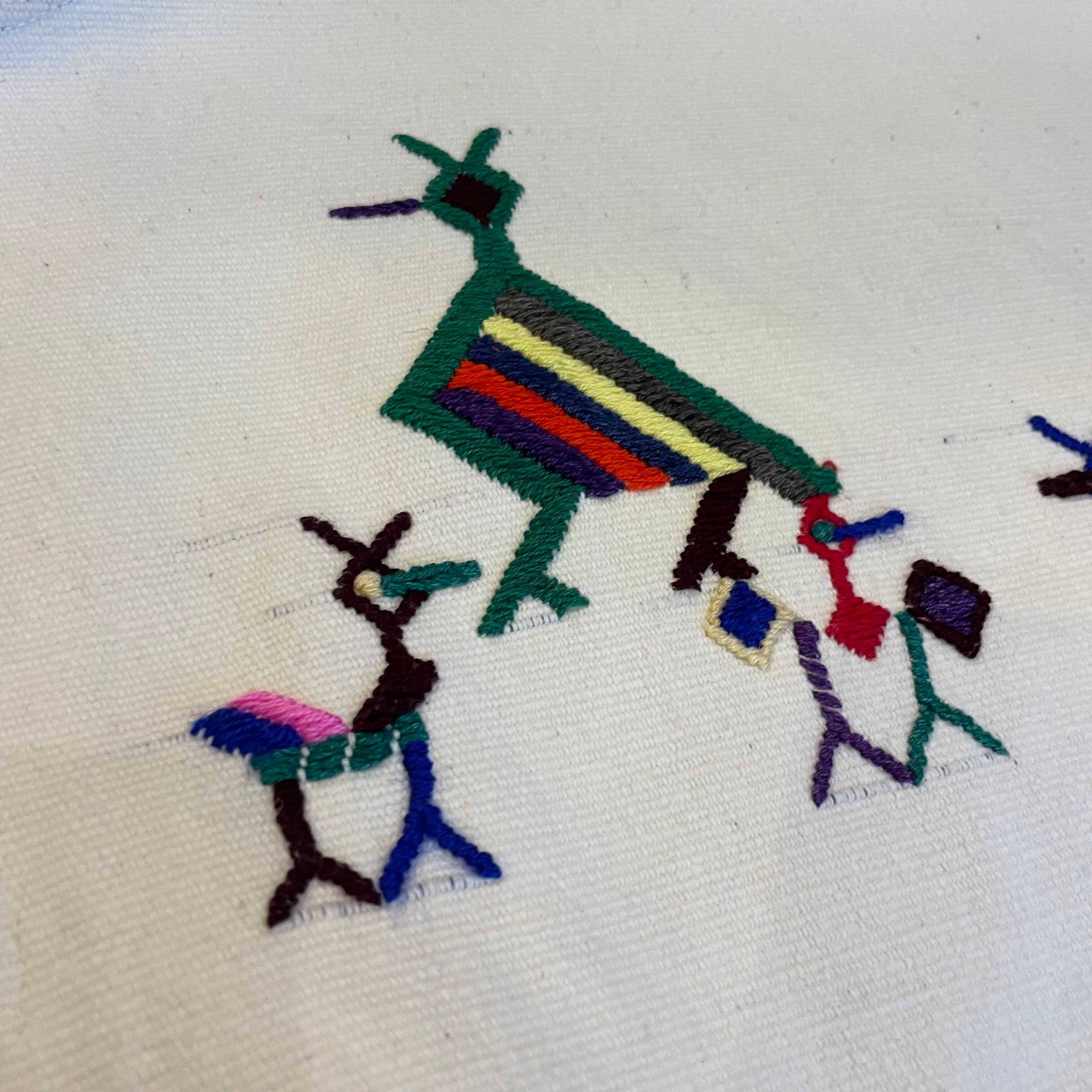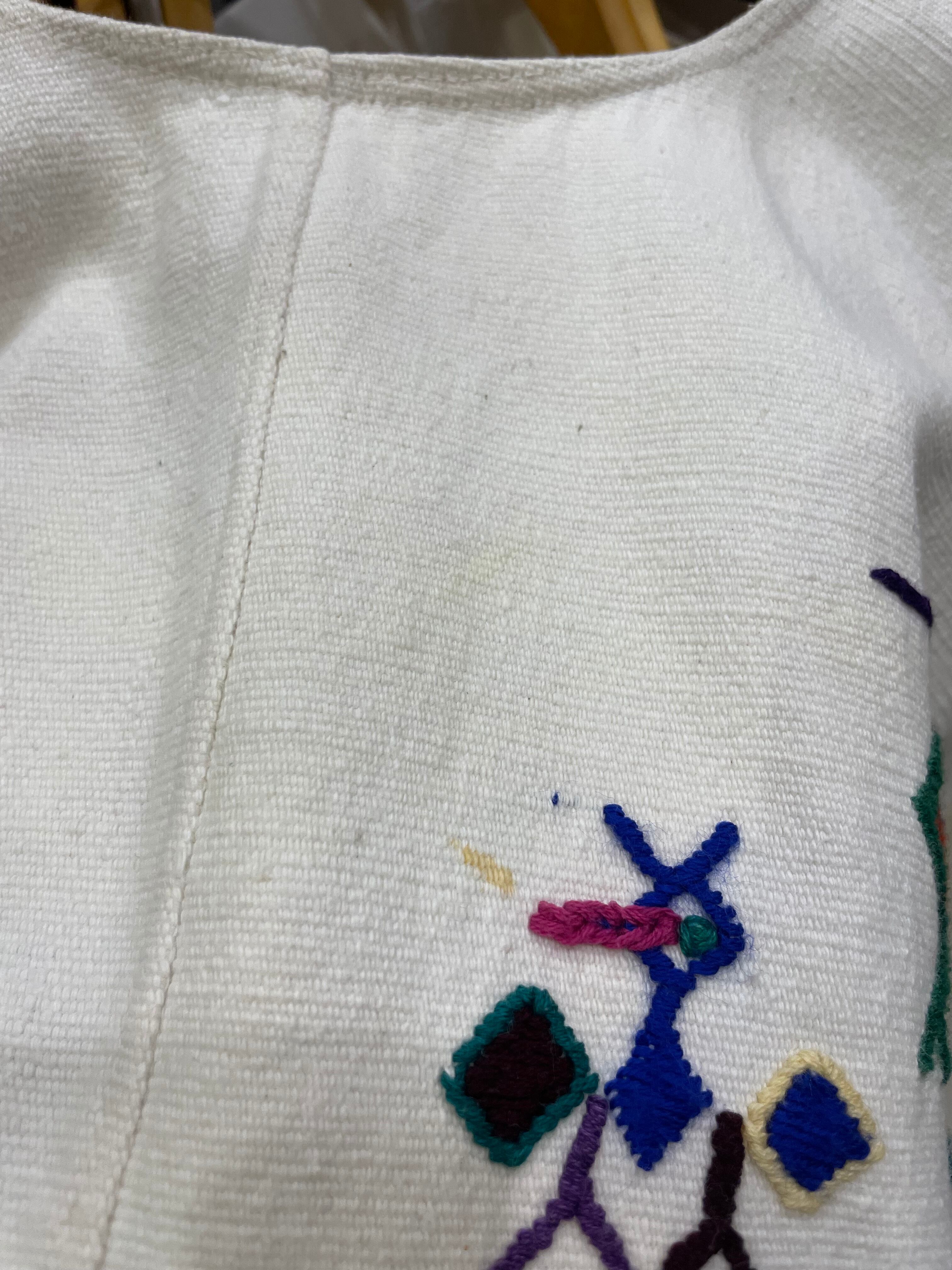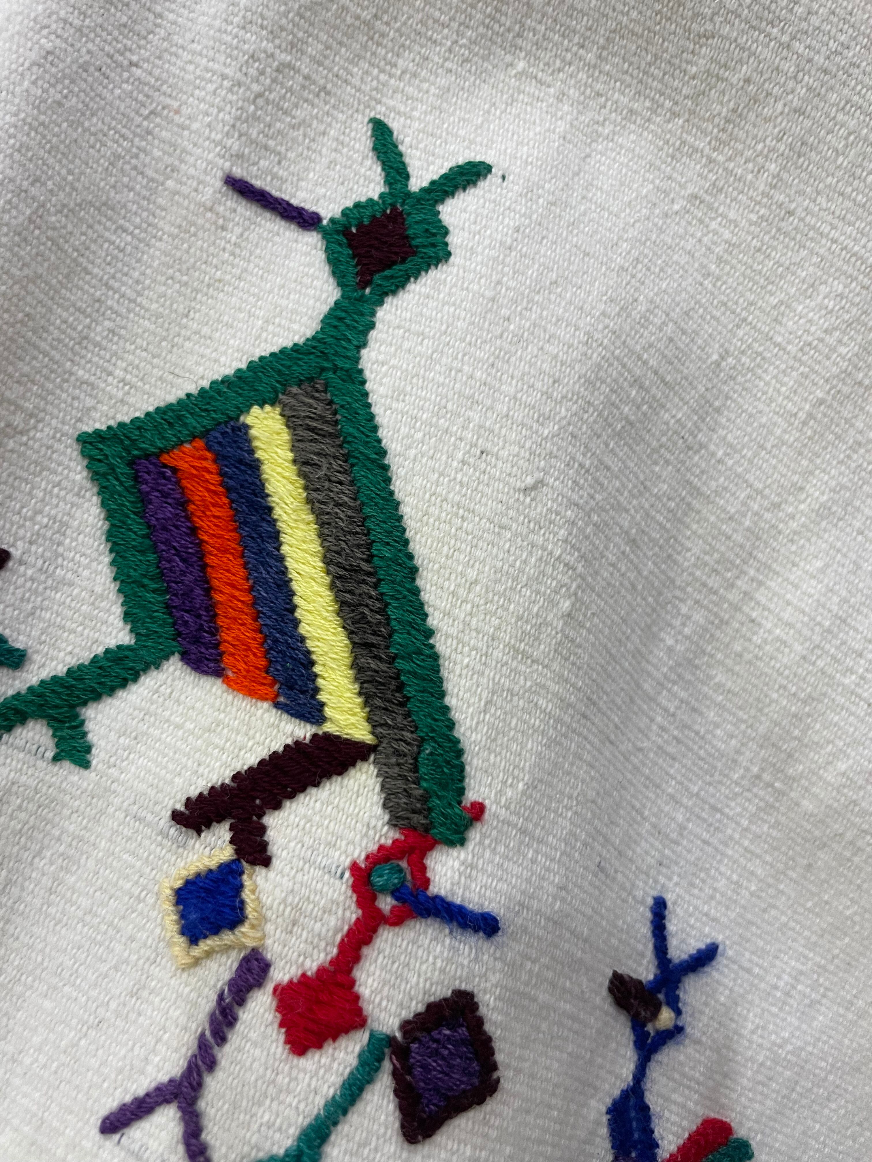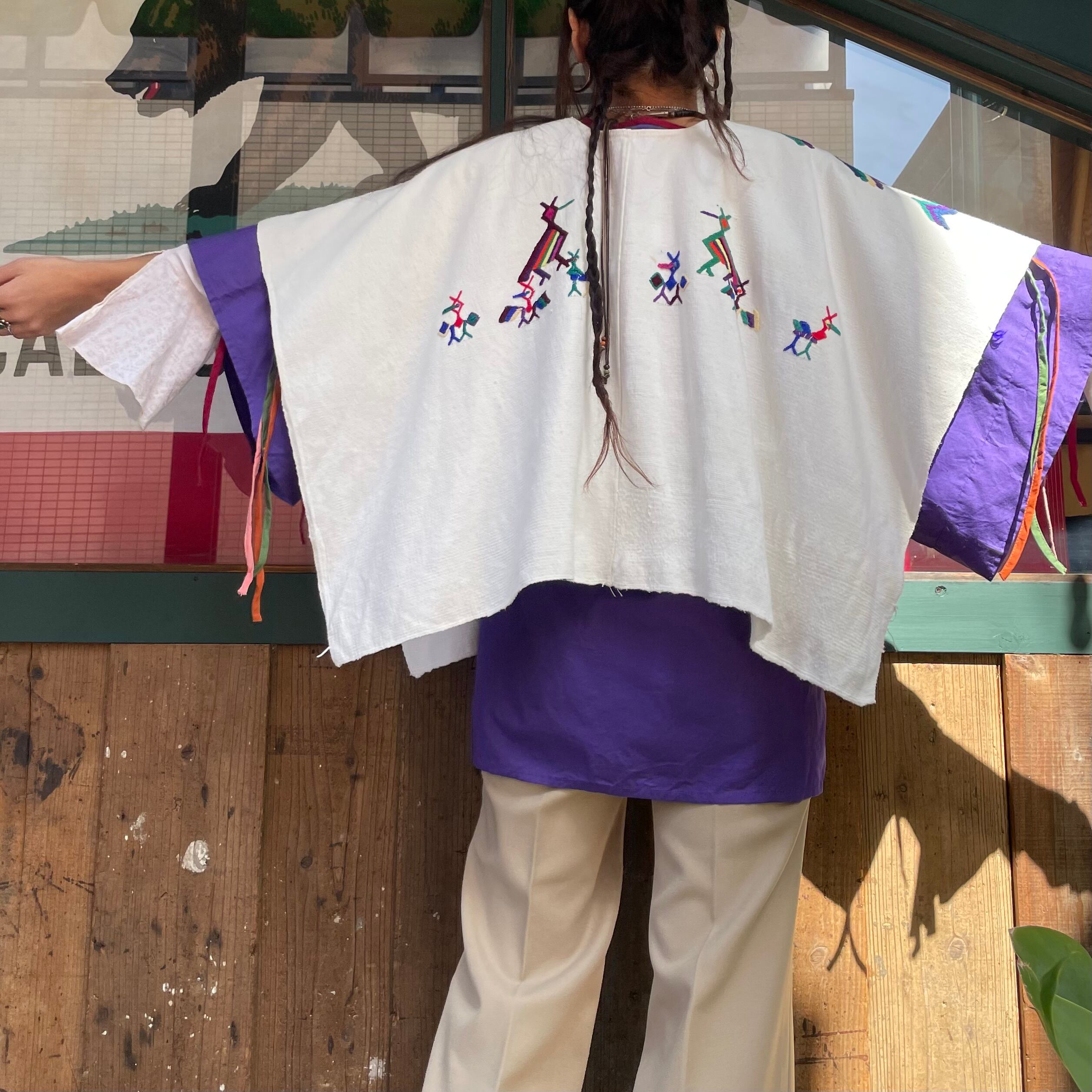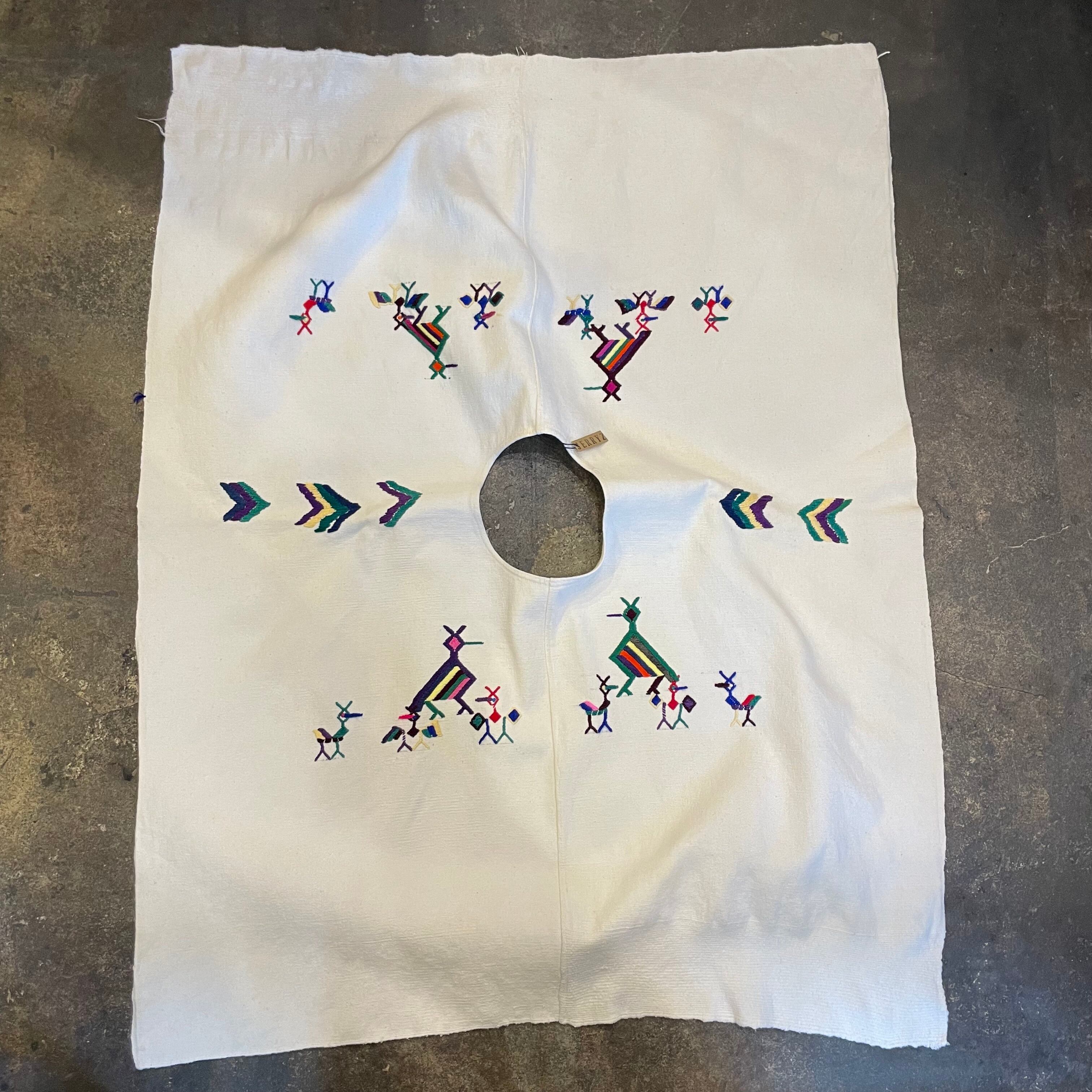 しっかり厚手のおそらく手織りの生地に鳥?のような動物の刺繍がかわいいグアテマラのポンチョです。