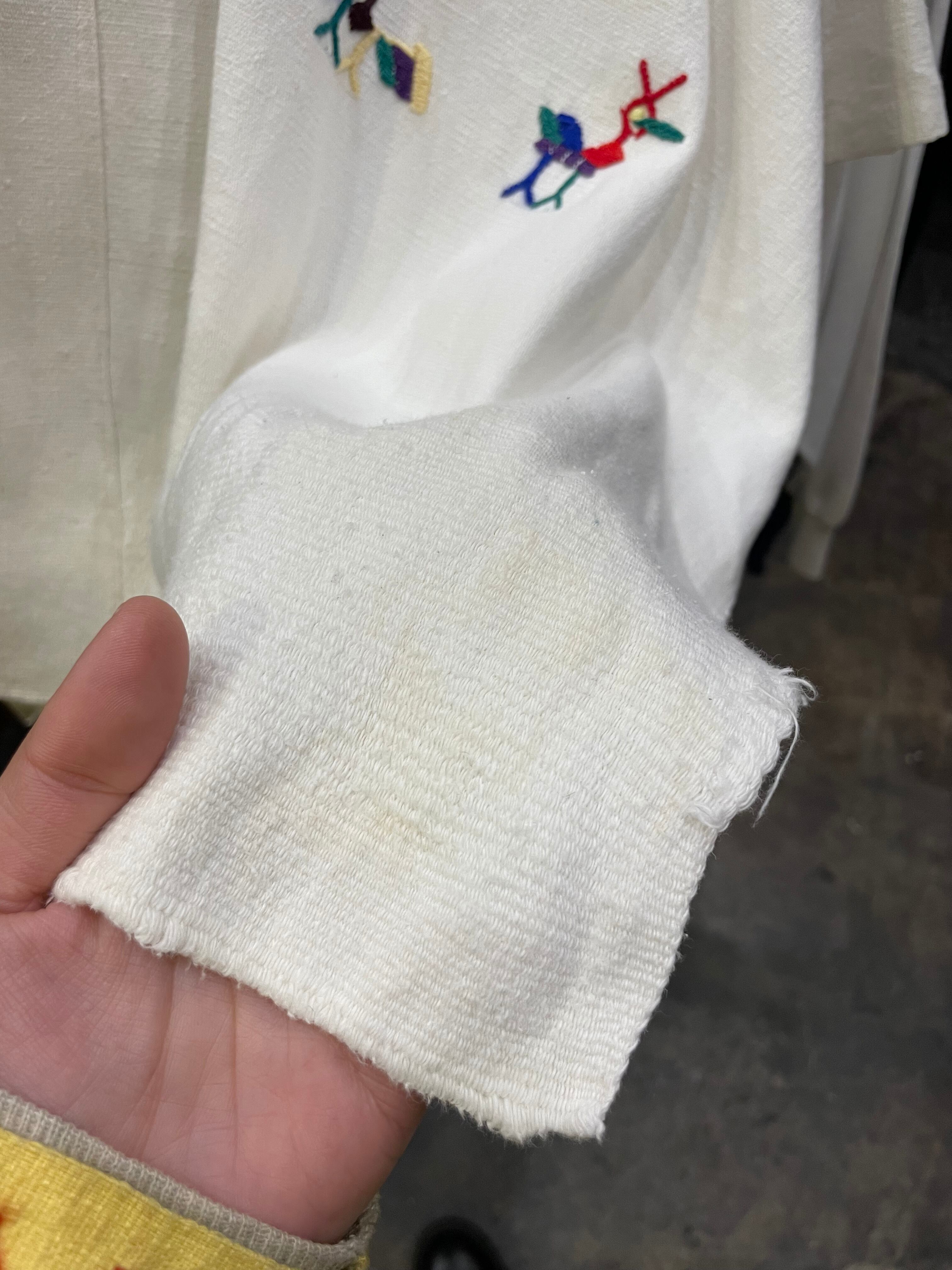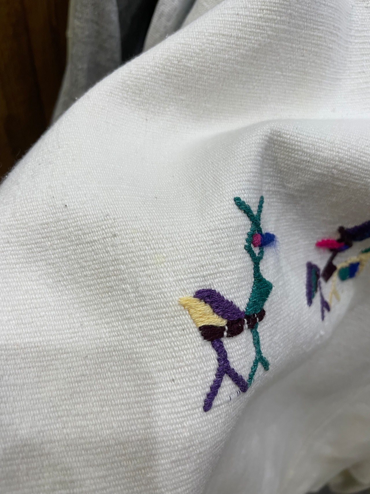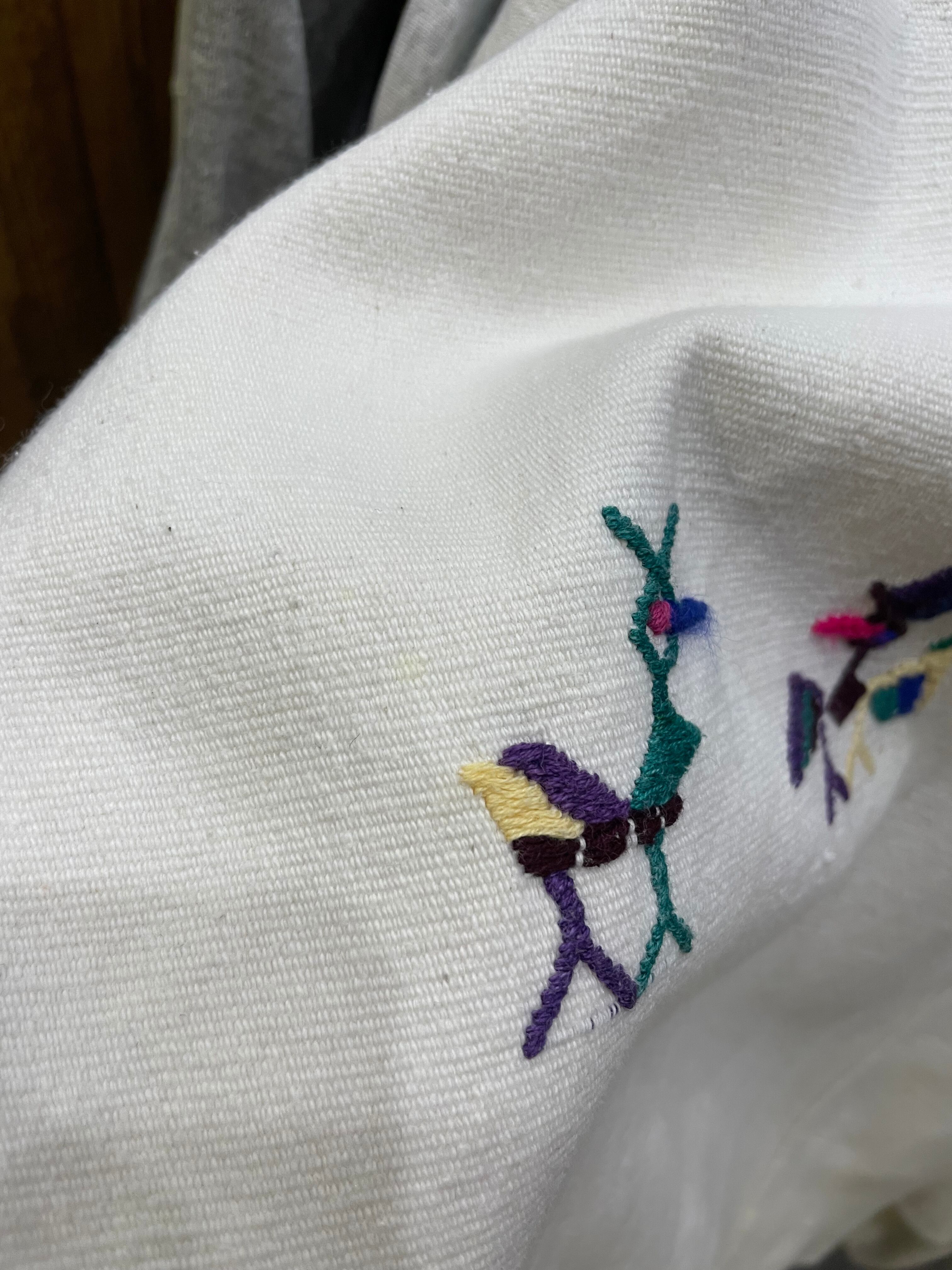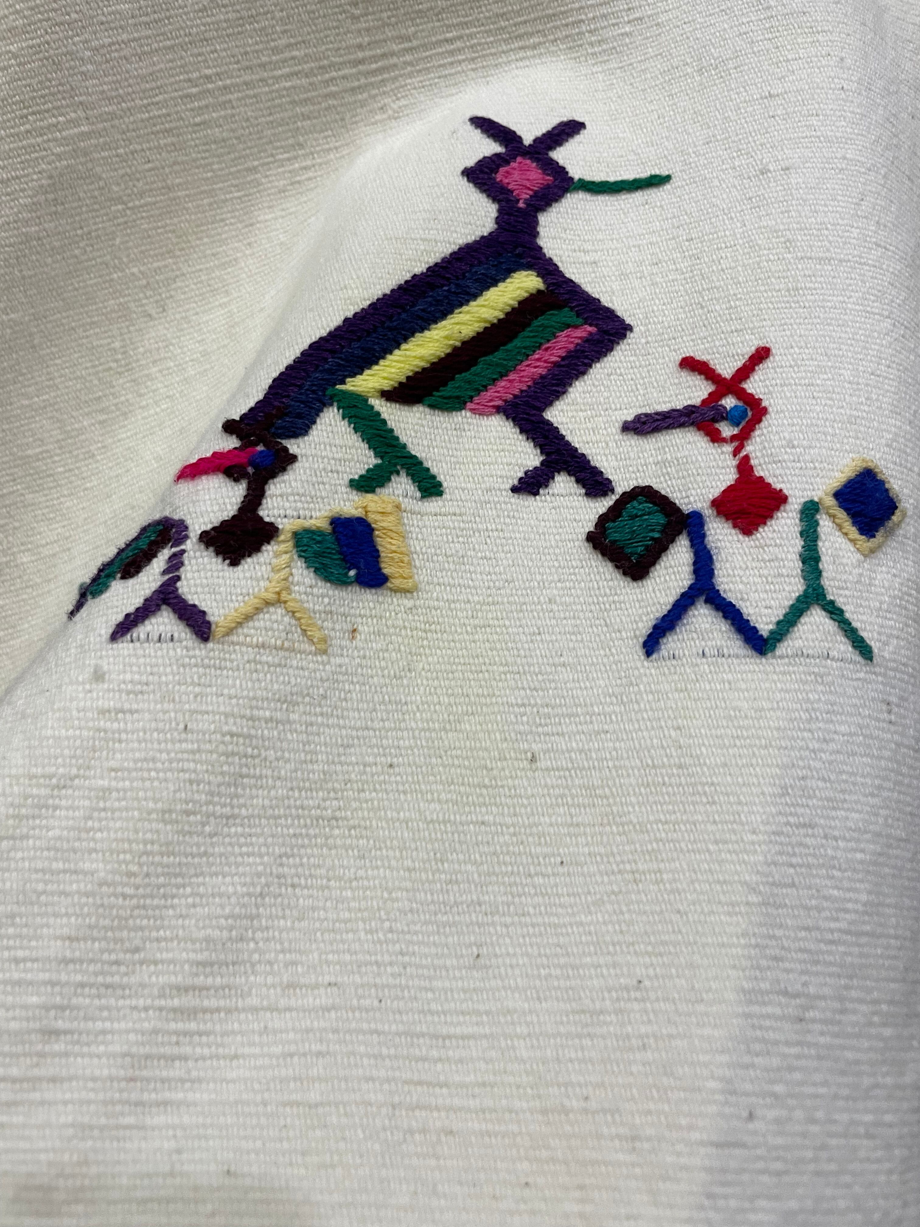 しっかり厚手のおそらく手織りの生地に鳥?のような動物の刺繍がかわいいグアテマラのポンチョです。