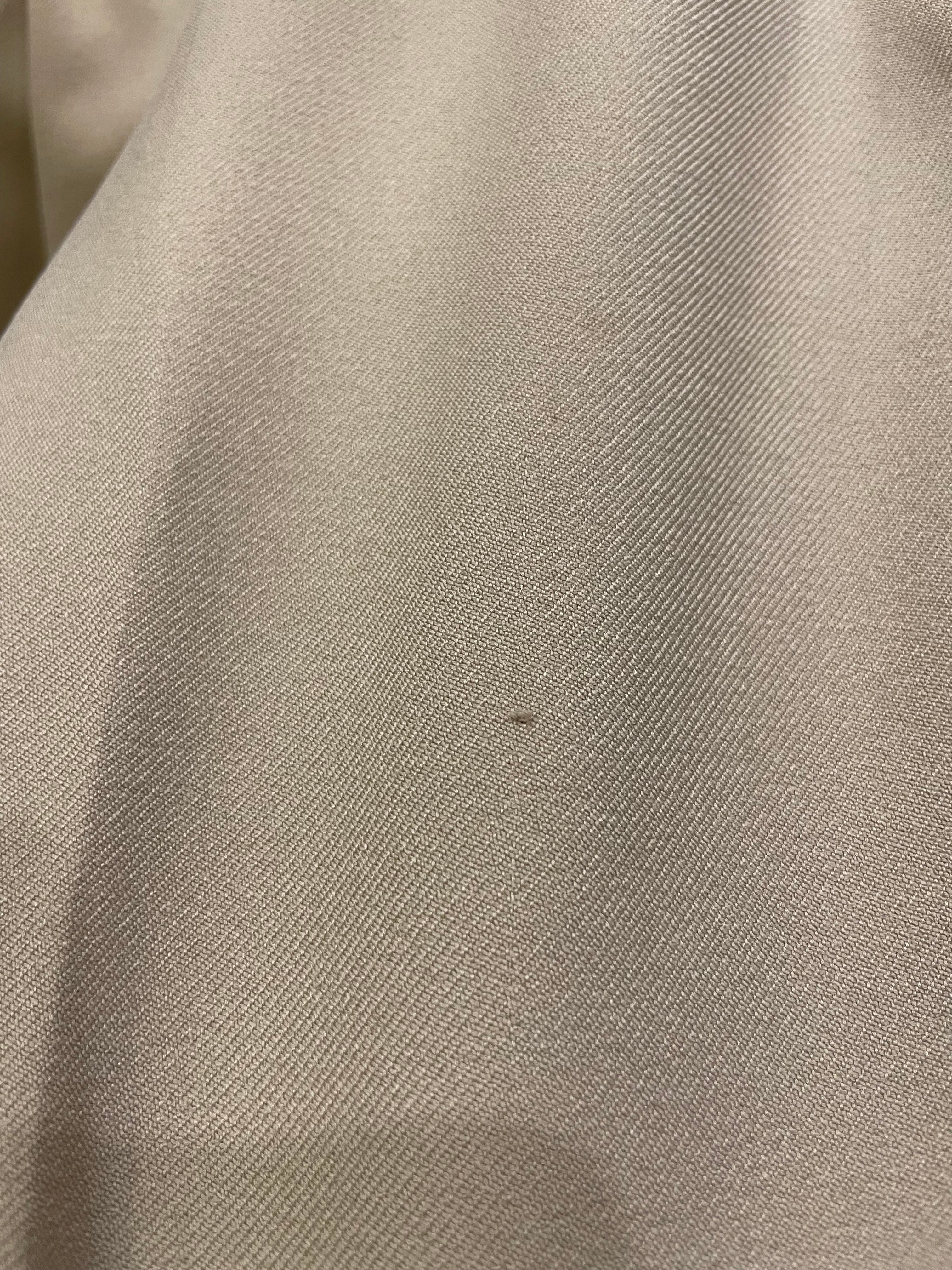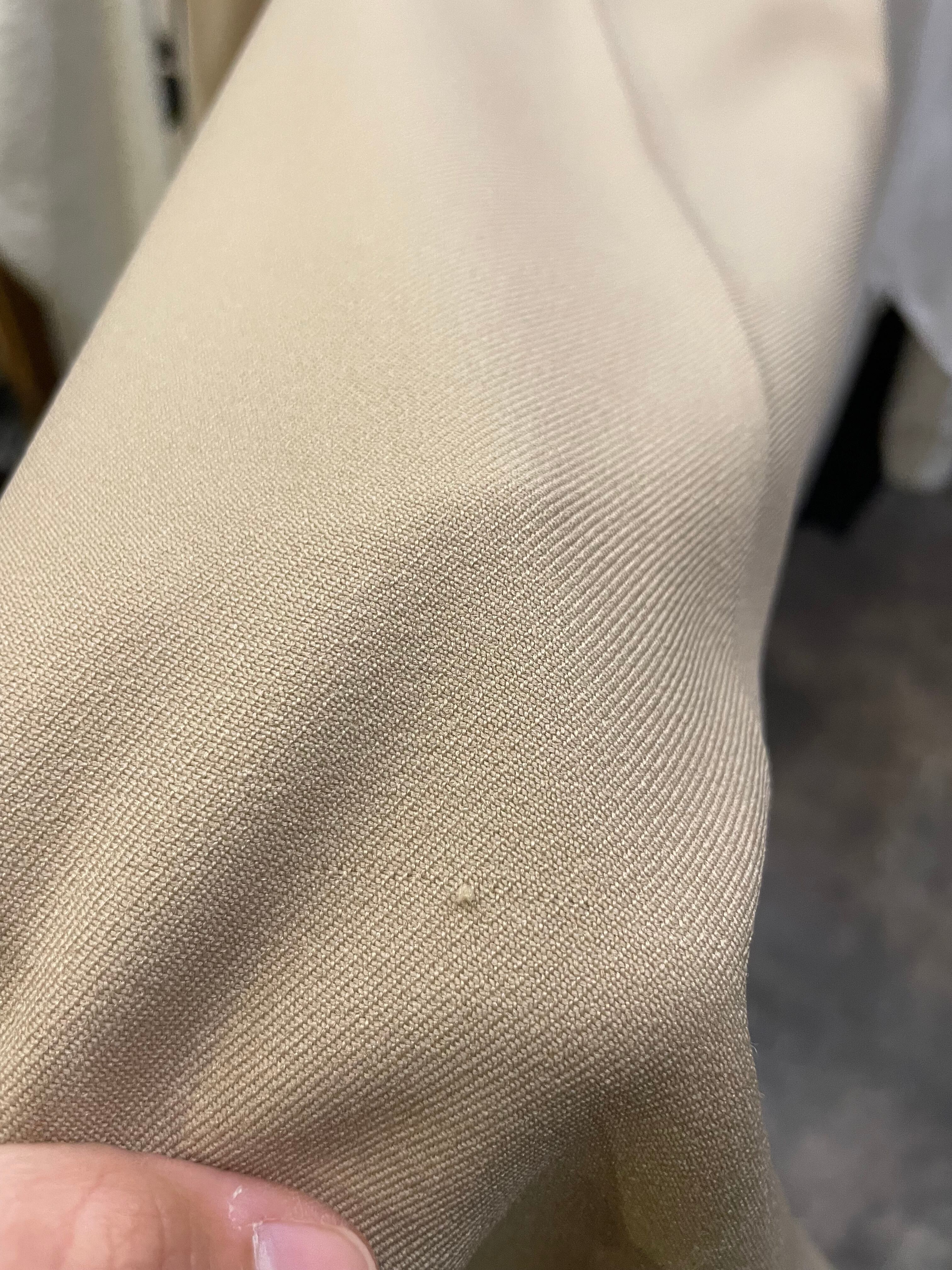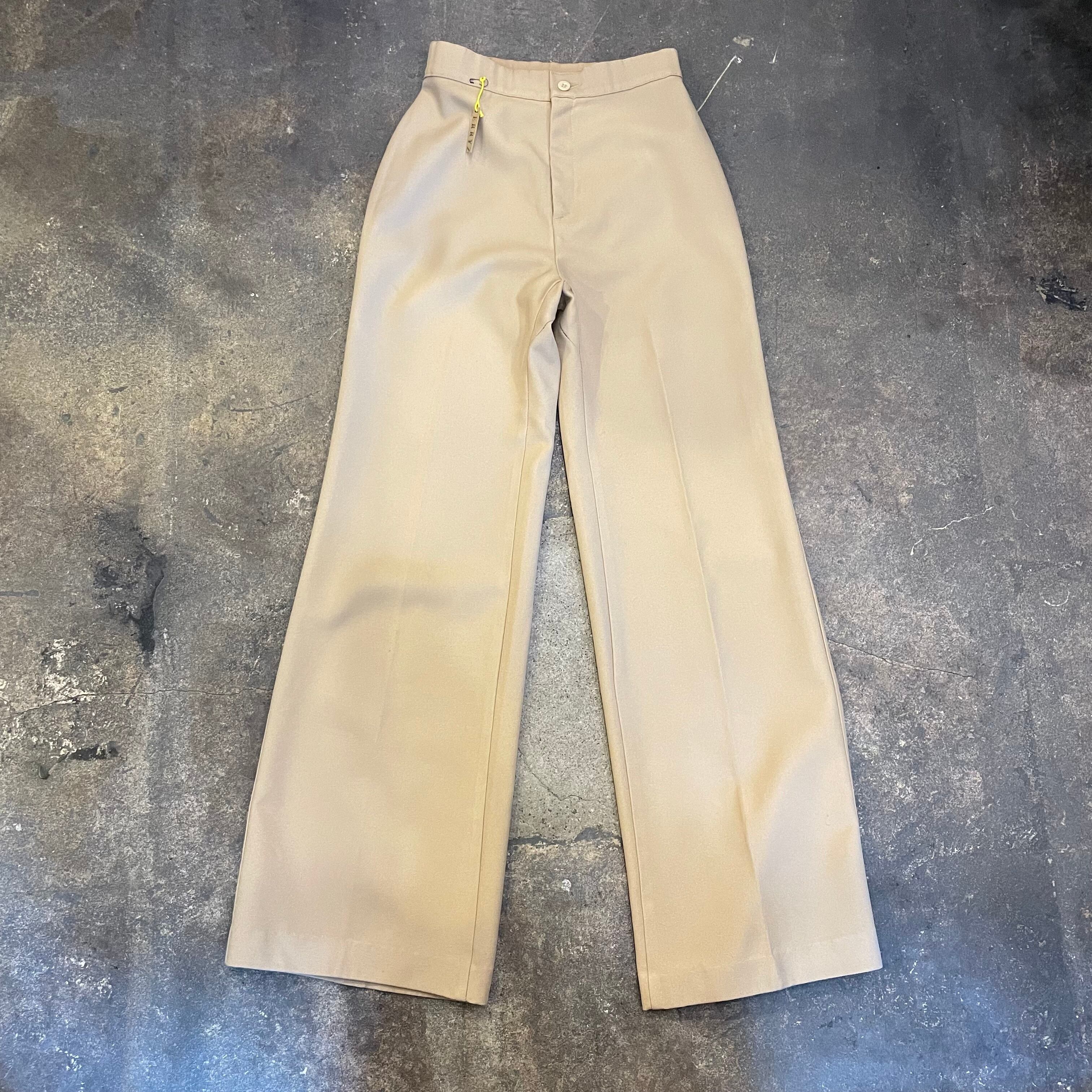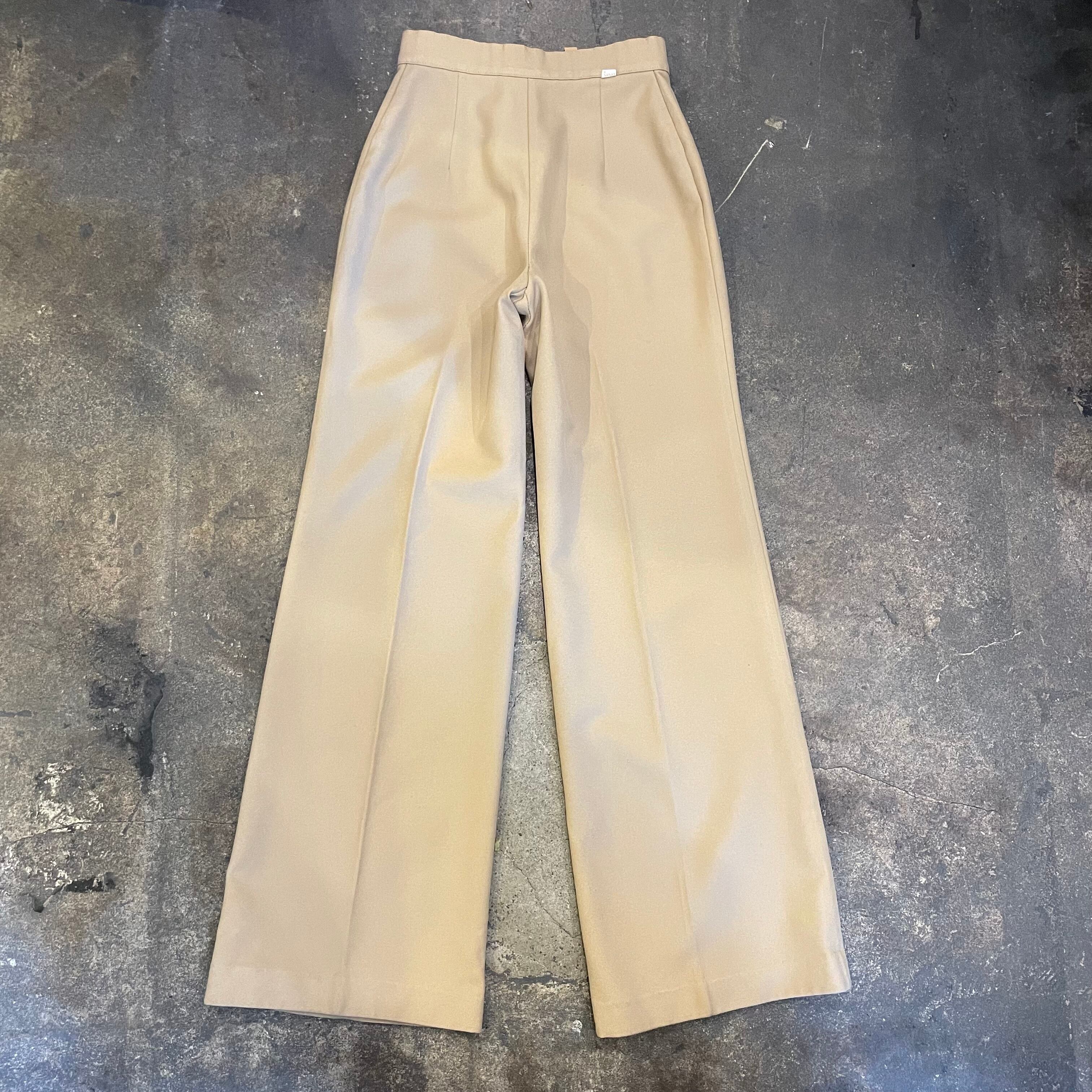 おそらくポリエステルのつるっとさらっとした素材と綺麗なシルエット、ウエストもゴムではないので幅広いシーンで着て頂けるかと思います。