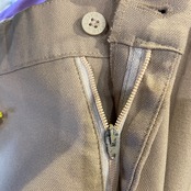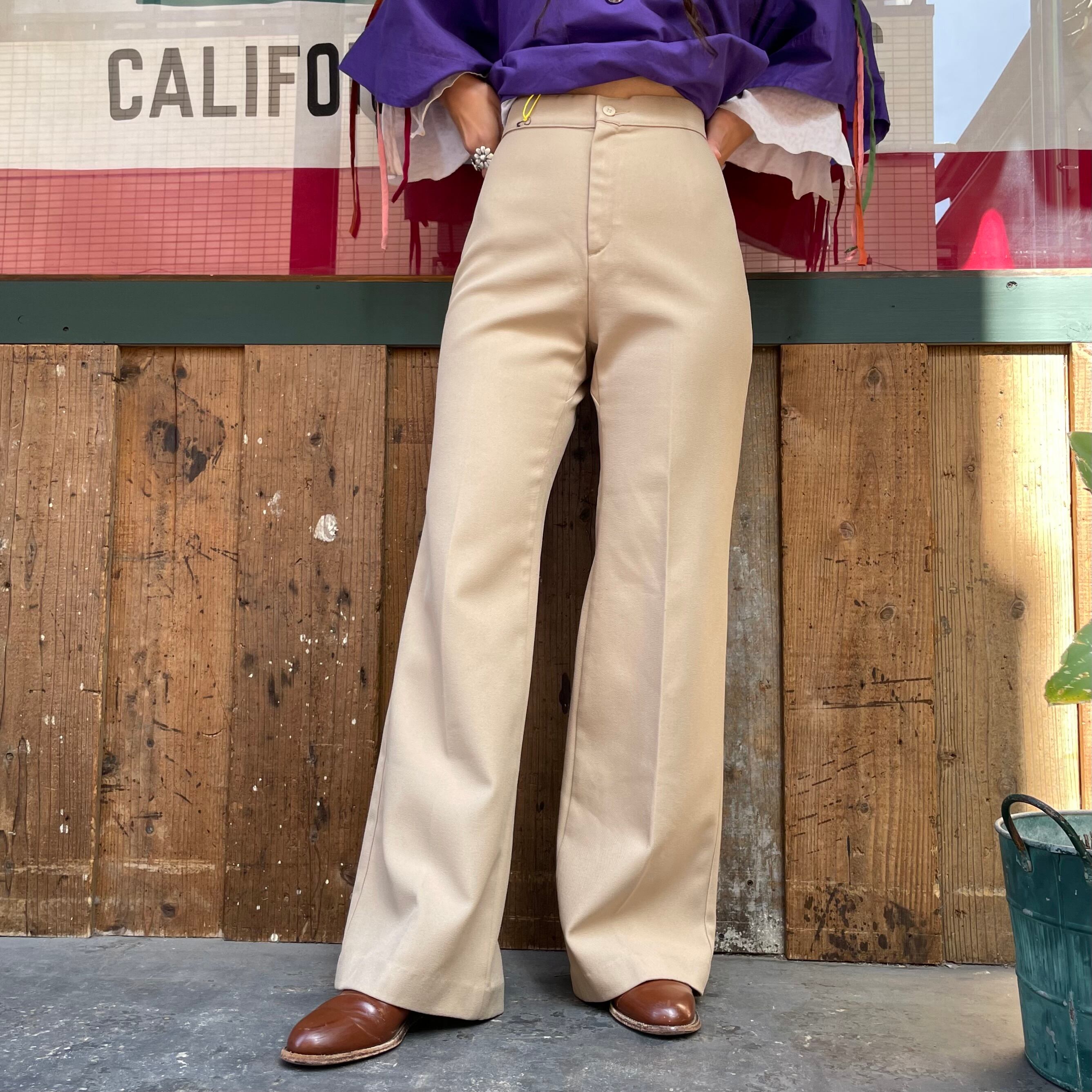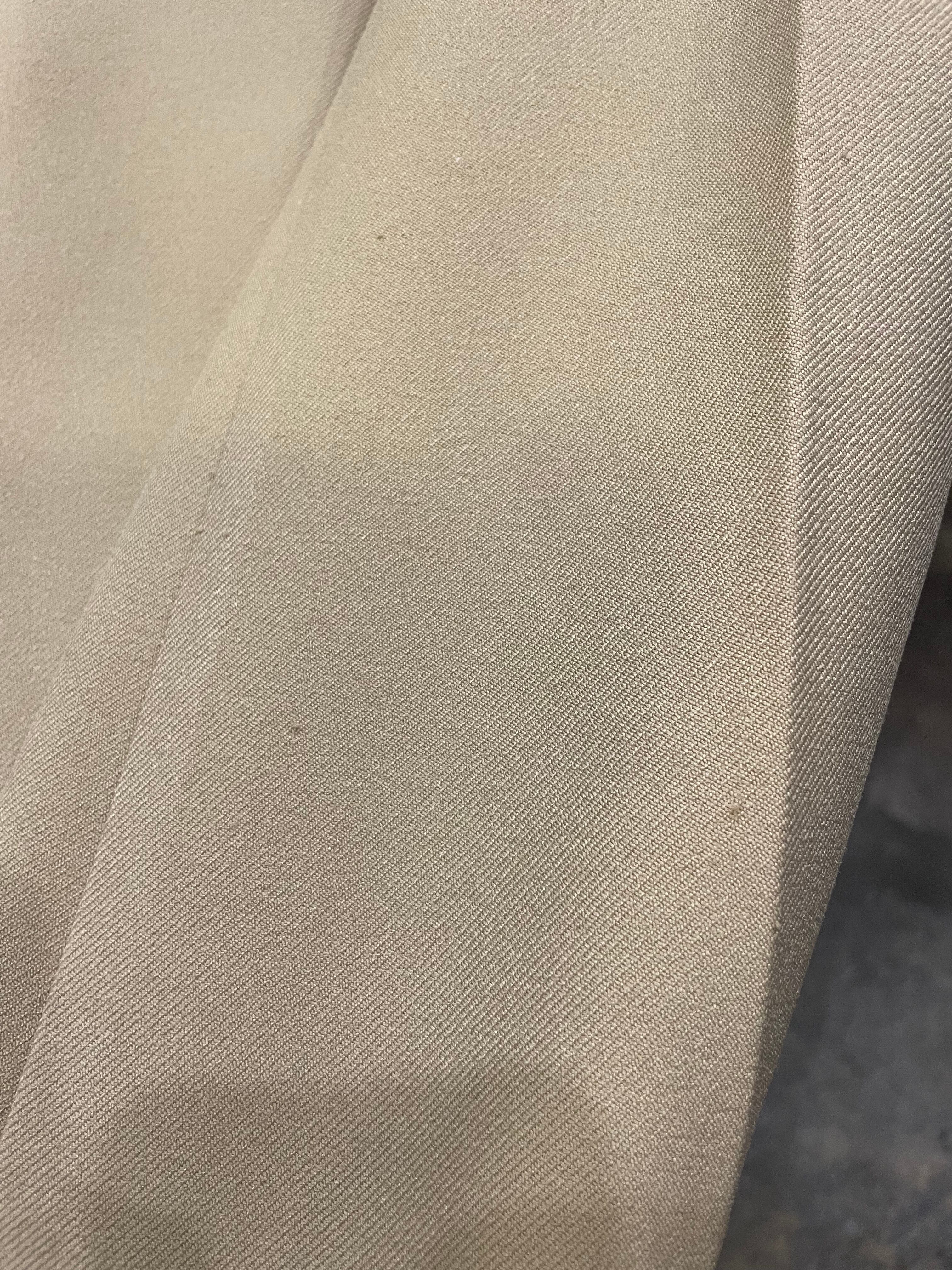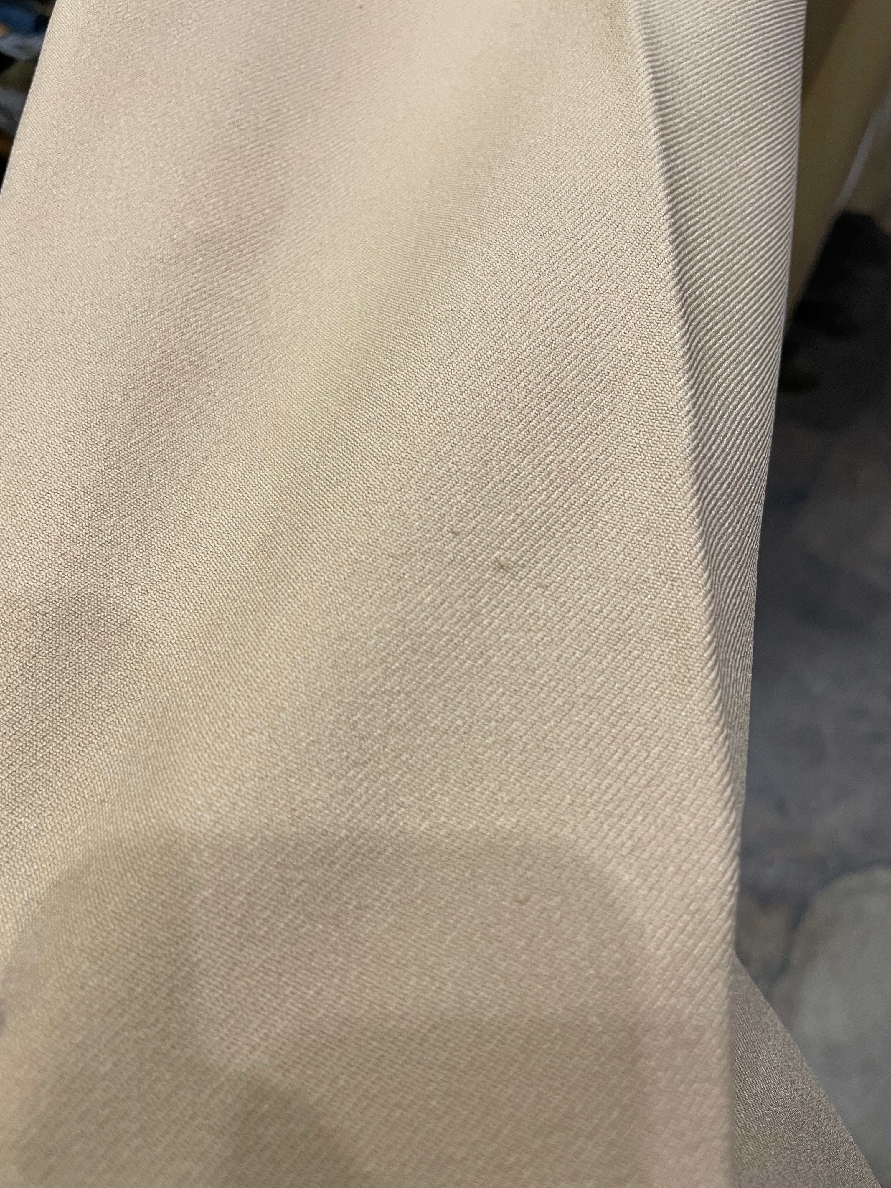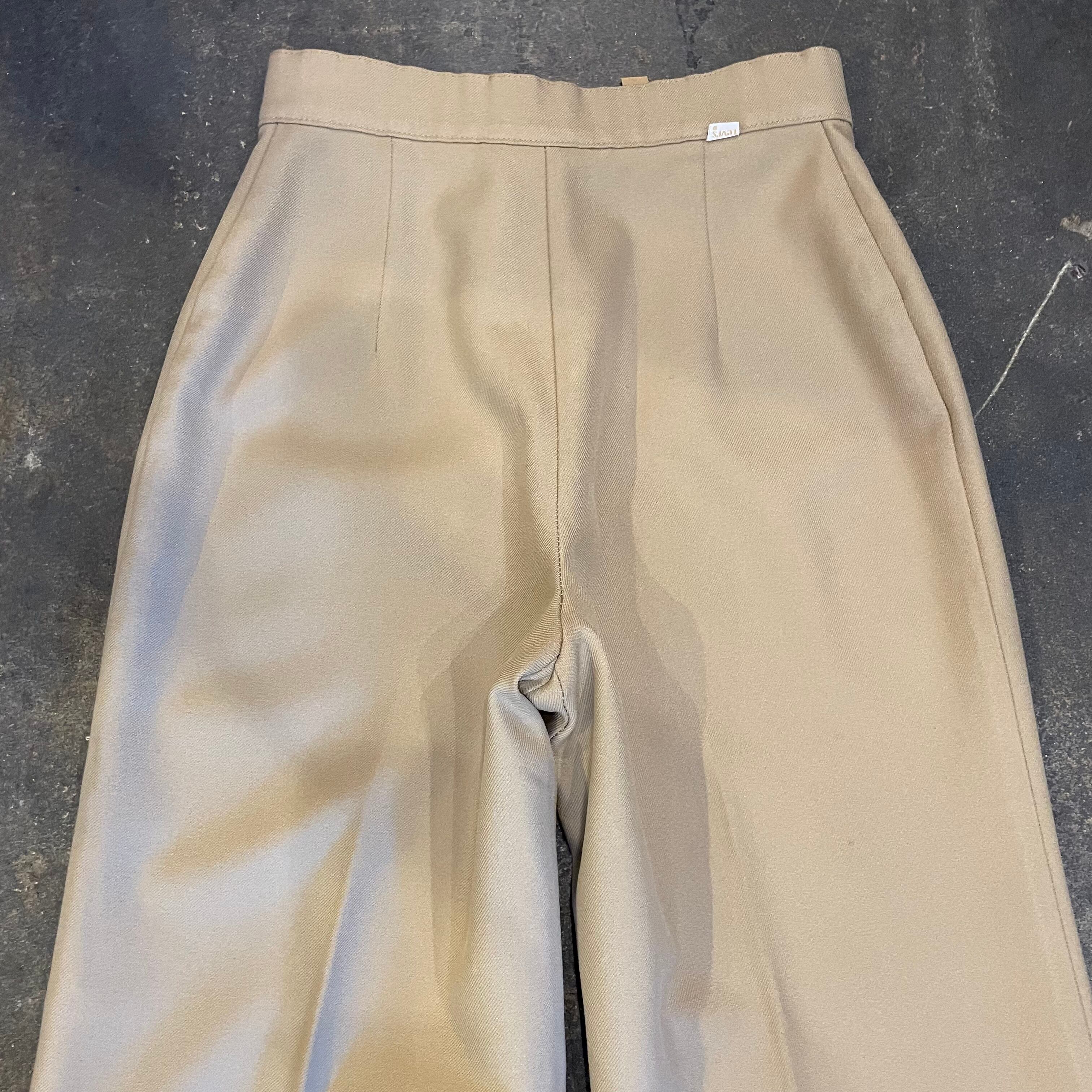 おそらくポリエステルのつるっとさらっとした素材と綺麗なシルエット、ウエストもゴムではないので幅広いシーンで着て頂けるかと思います。