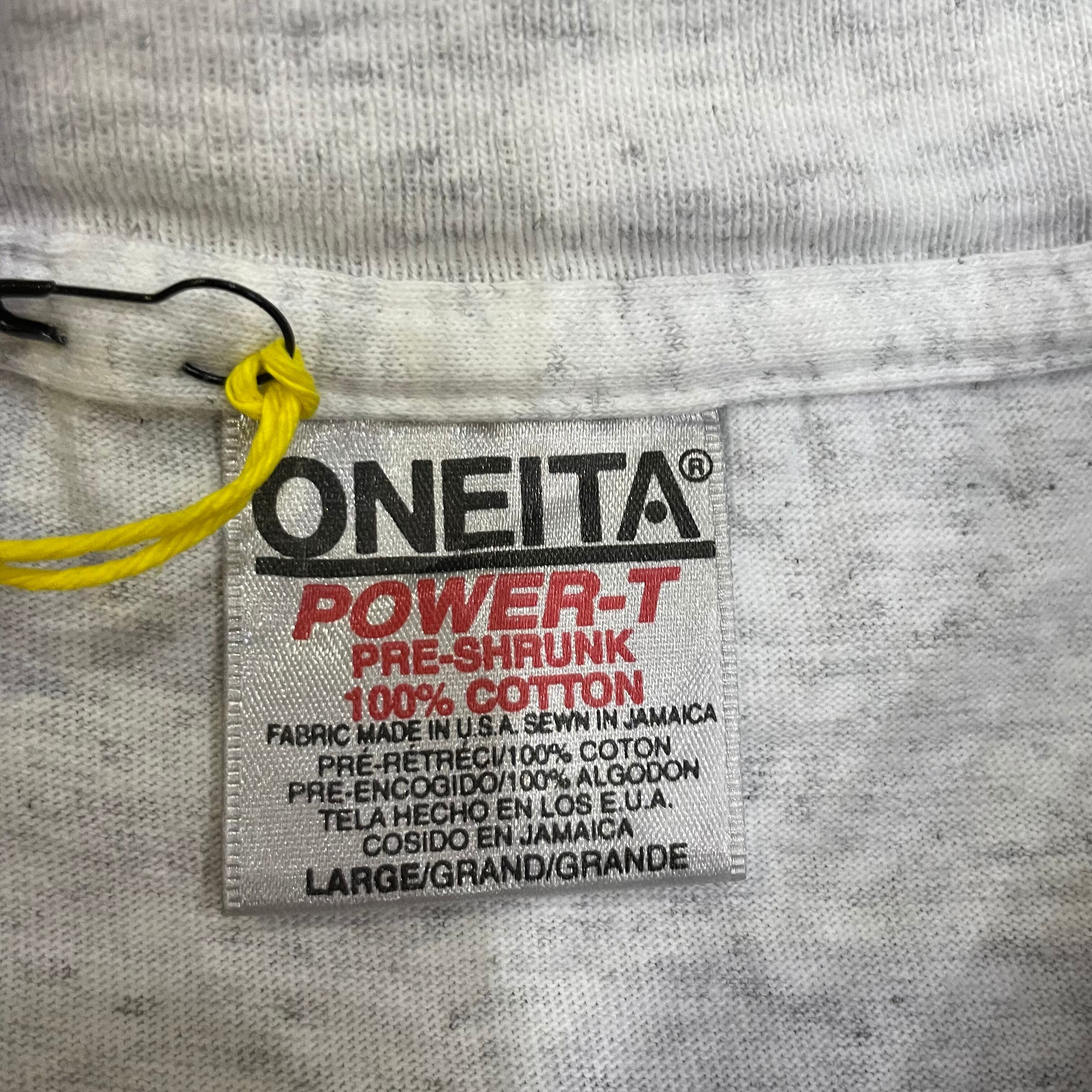 力強いロゴとかわいい書体で雰囲気のあるら一枚ですね。ONEITAボディのLサイズですのでゆったり着やすいサイズ感ですし100%コットンで着心地も良いかと思います。