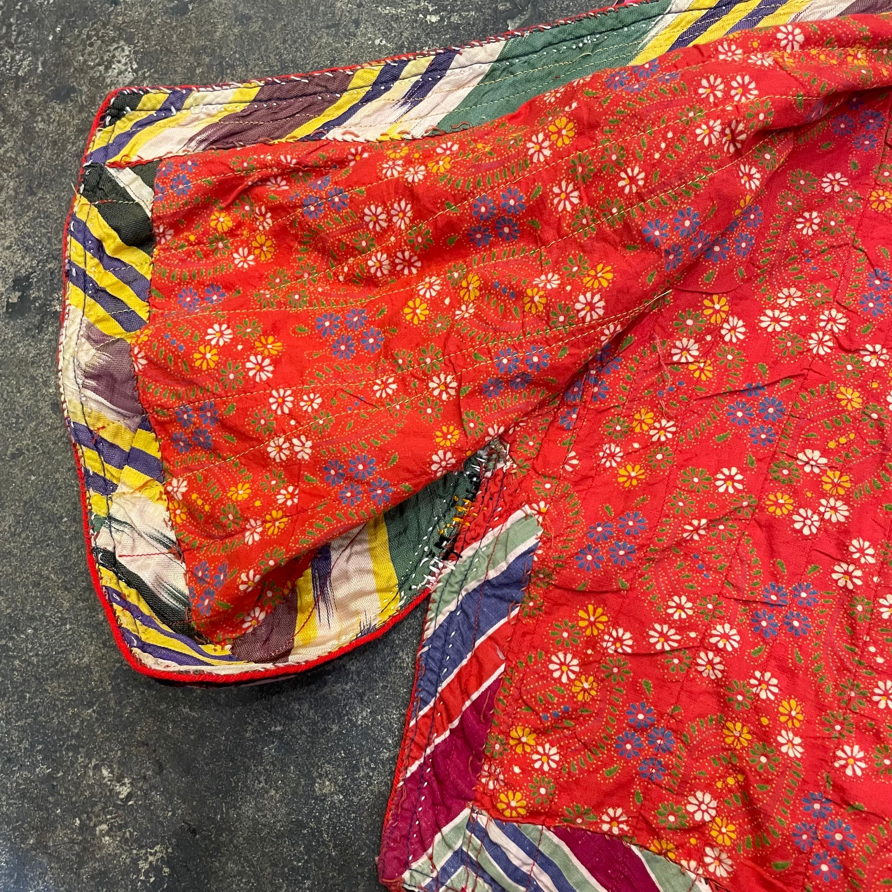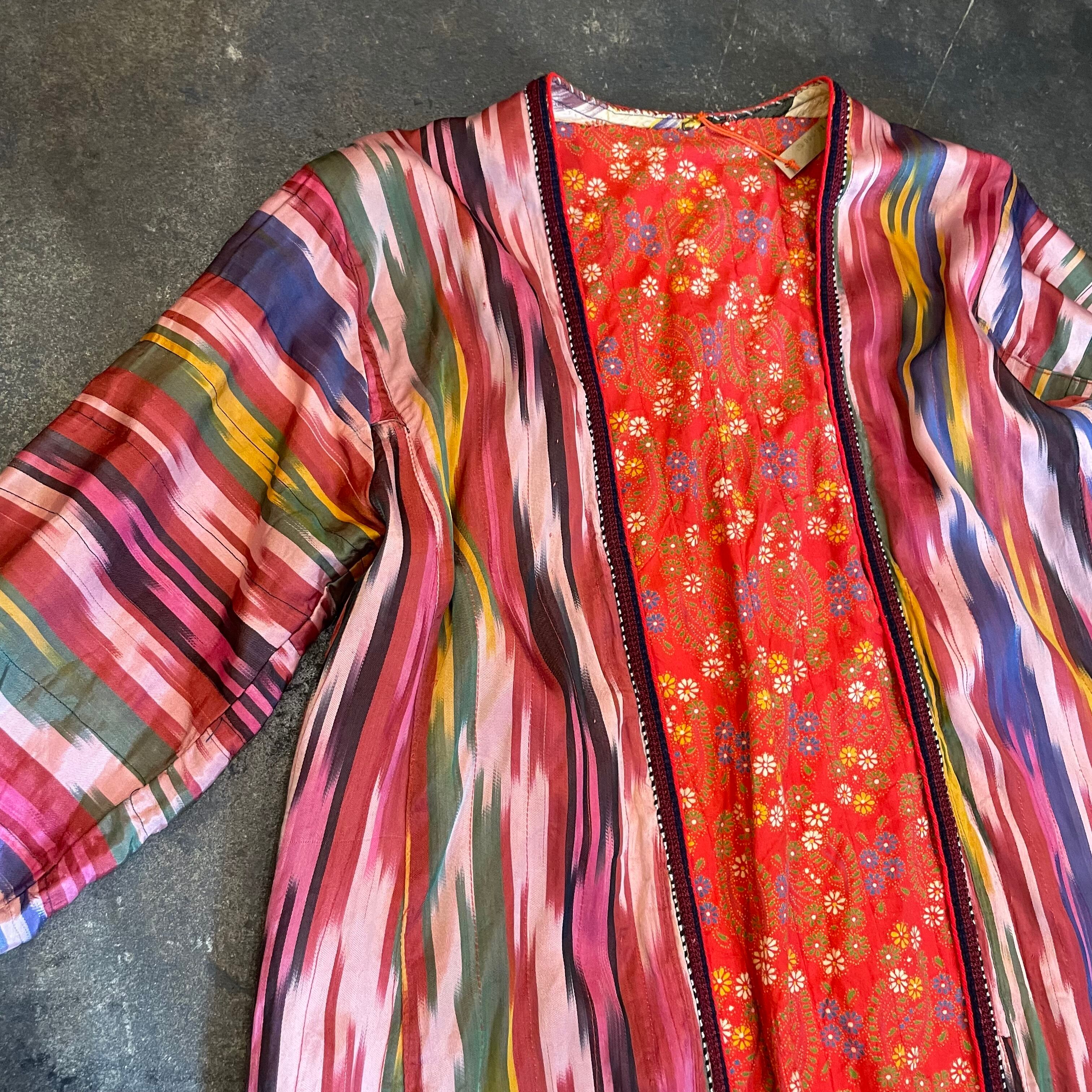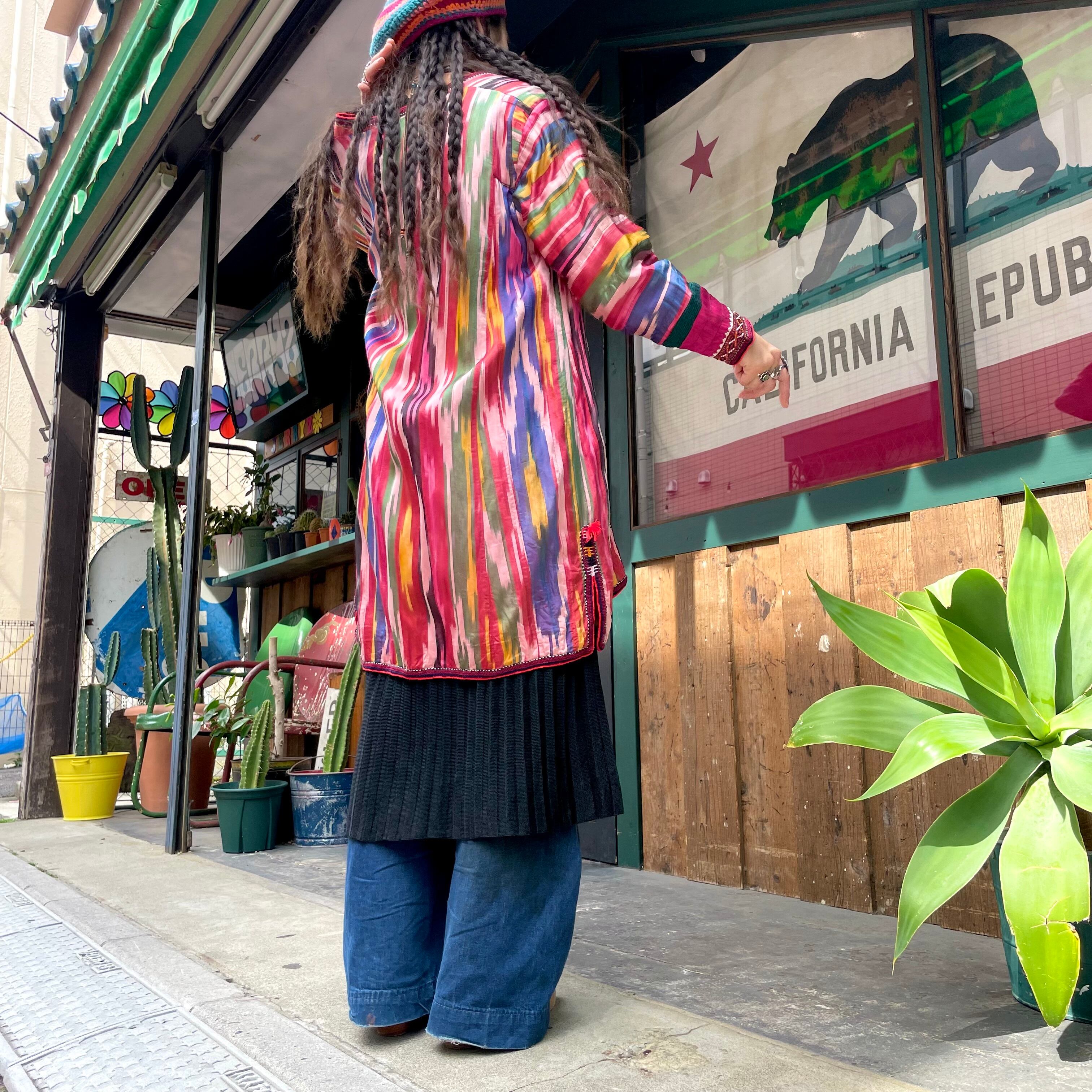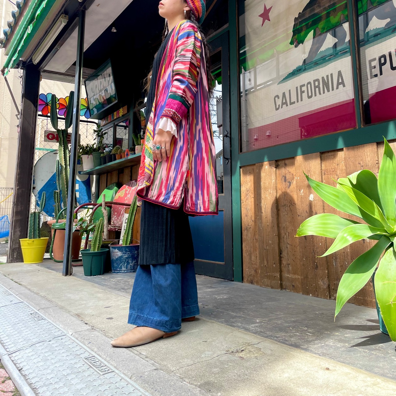 グアテマラっぽい色味や模様で裏地はレトロな花柄で、手縫いを織り交ぜたハンドメイドの感じが雰囲気があって素敵ですね。シンプルなワンピースに羽織ったり、プリントTシャツとデニムでラフに羽織ったりしてもかわいいですし、大きな花柄など柄物と合わせてサイケデリックなコーディネートにも良さそうですし、ボーダーやストライプやビビットカラーのアイテムと合わせたり、いろいろお楽しみ頂けると思います!