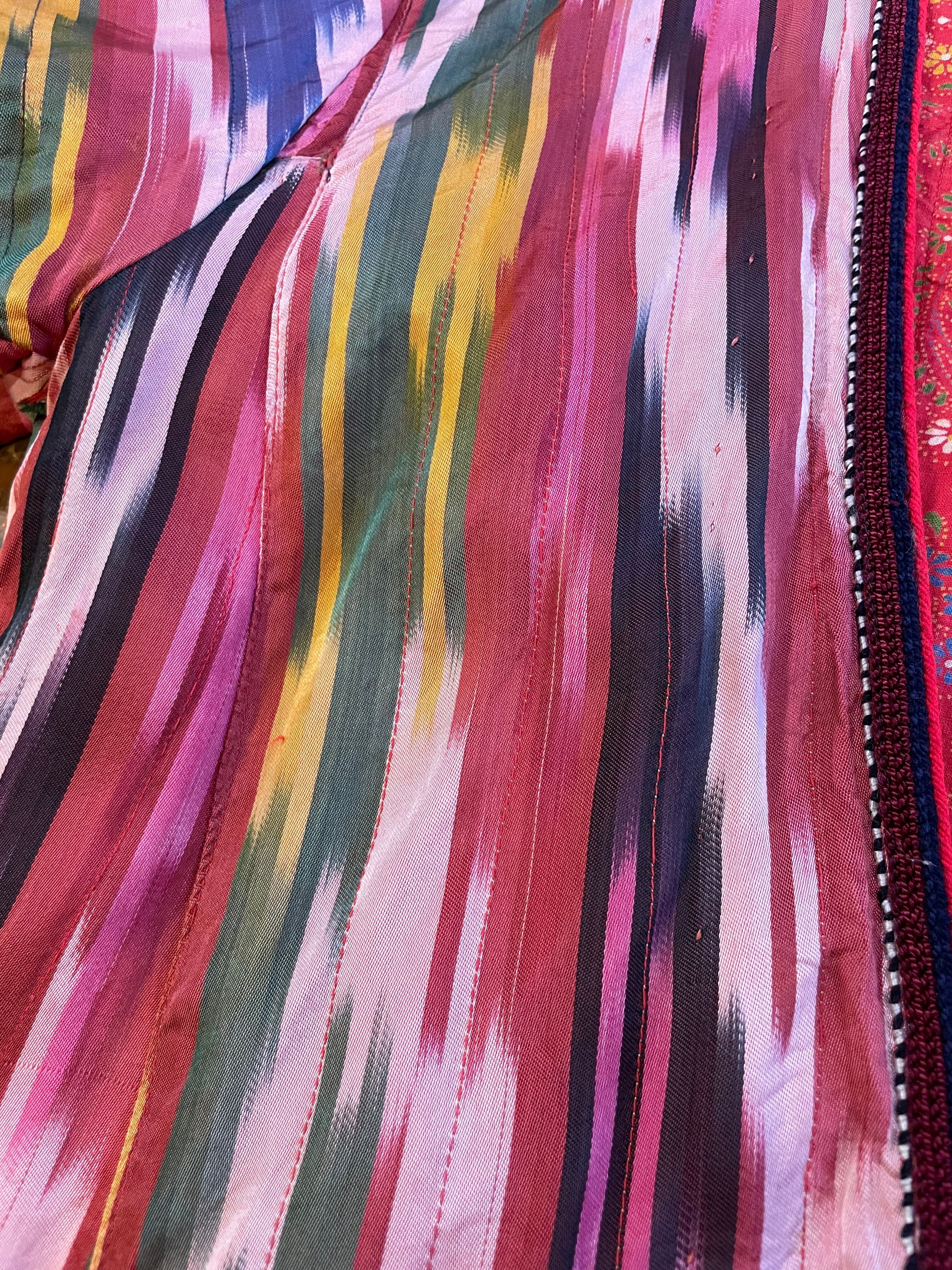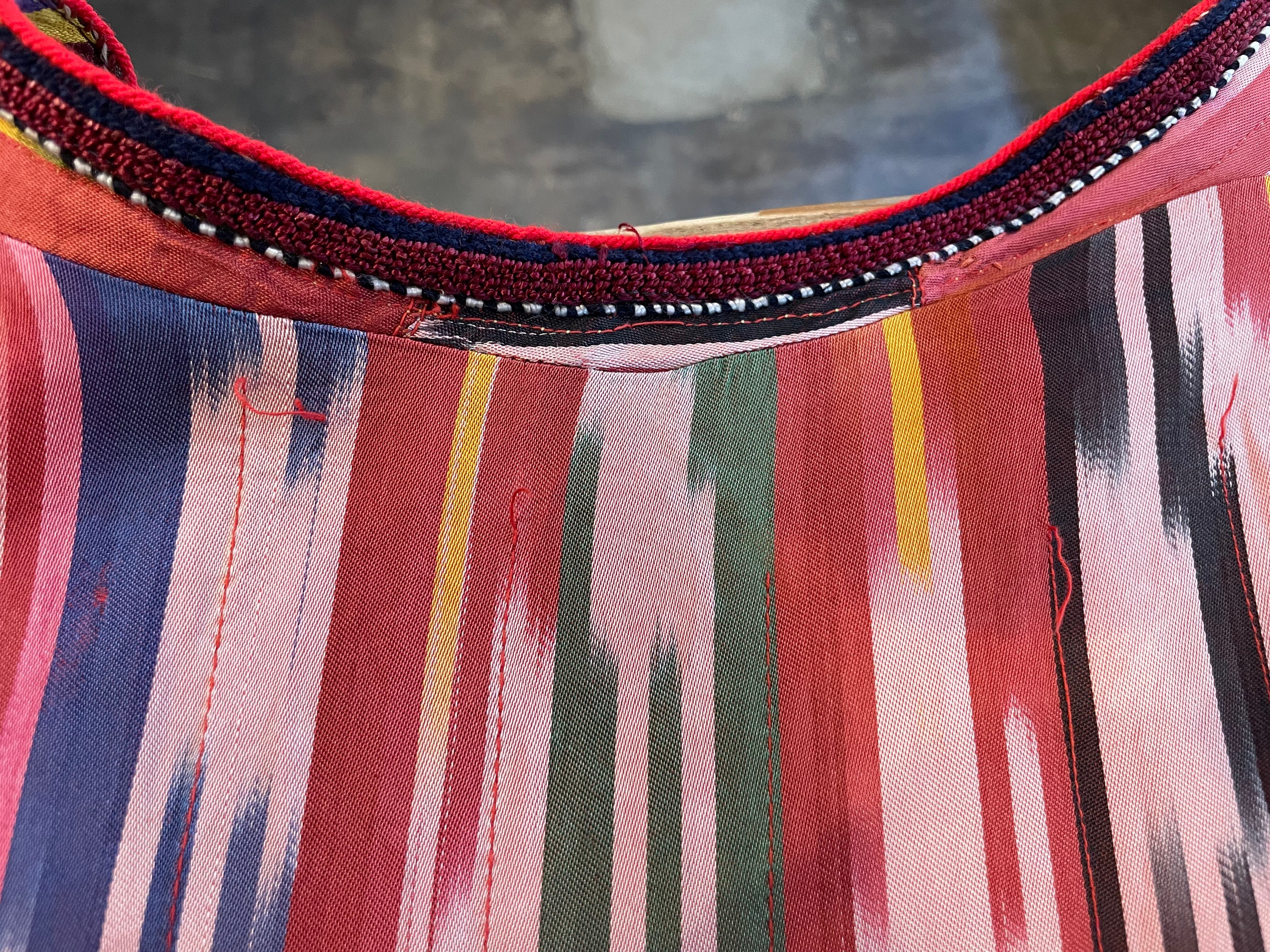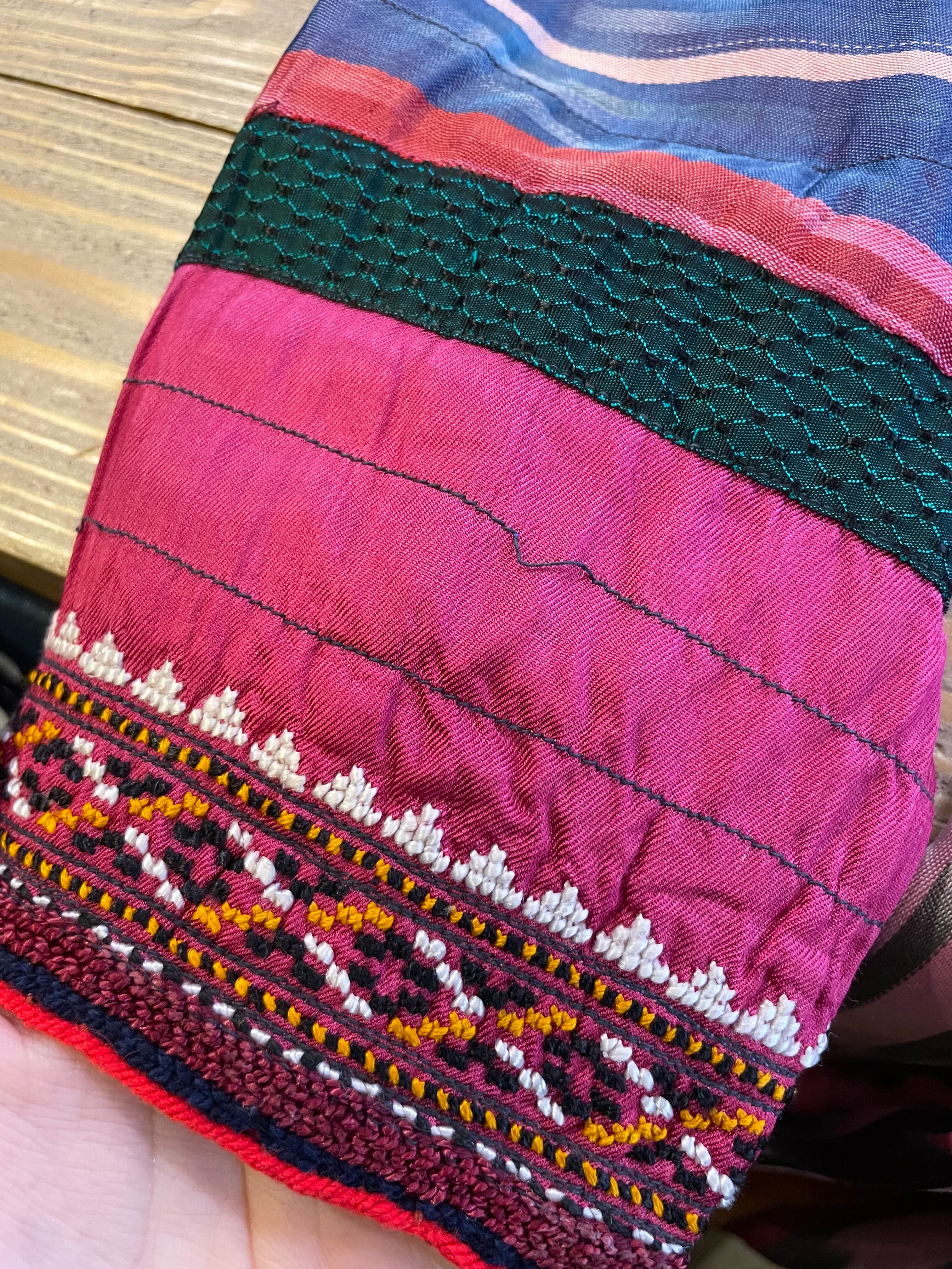 グアテマラっぽい色味や模様で裏地はレトロな花柄で、手縫いを織り交ぜたハンドメイドの感じが雰囲気があって素敵ですね。シンプルなワンピースに羽織ったり、プリントTシャツとデニムでラフに羽織ったりしてもかわいいですし、大きな花柄など柄物と合わせてサイケデリックなコーディネートにも良さそうですし、ボーダーやストライプやビビットカラーのアイテムと合わせたり、いろいろお楽しみ頂けると思います!