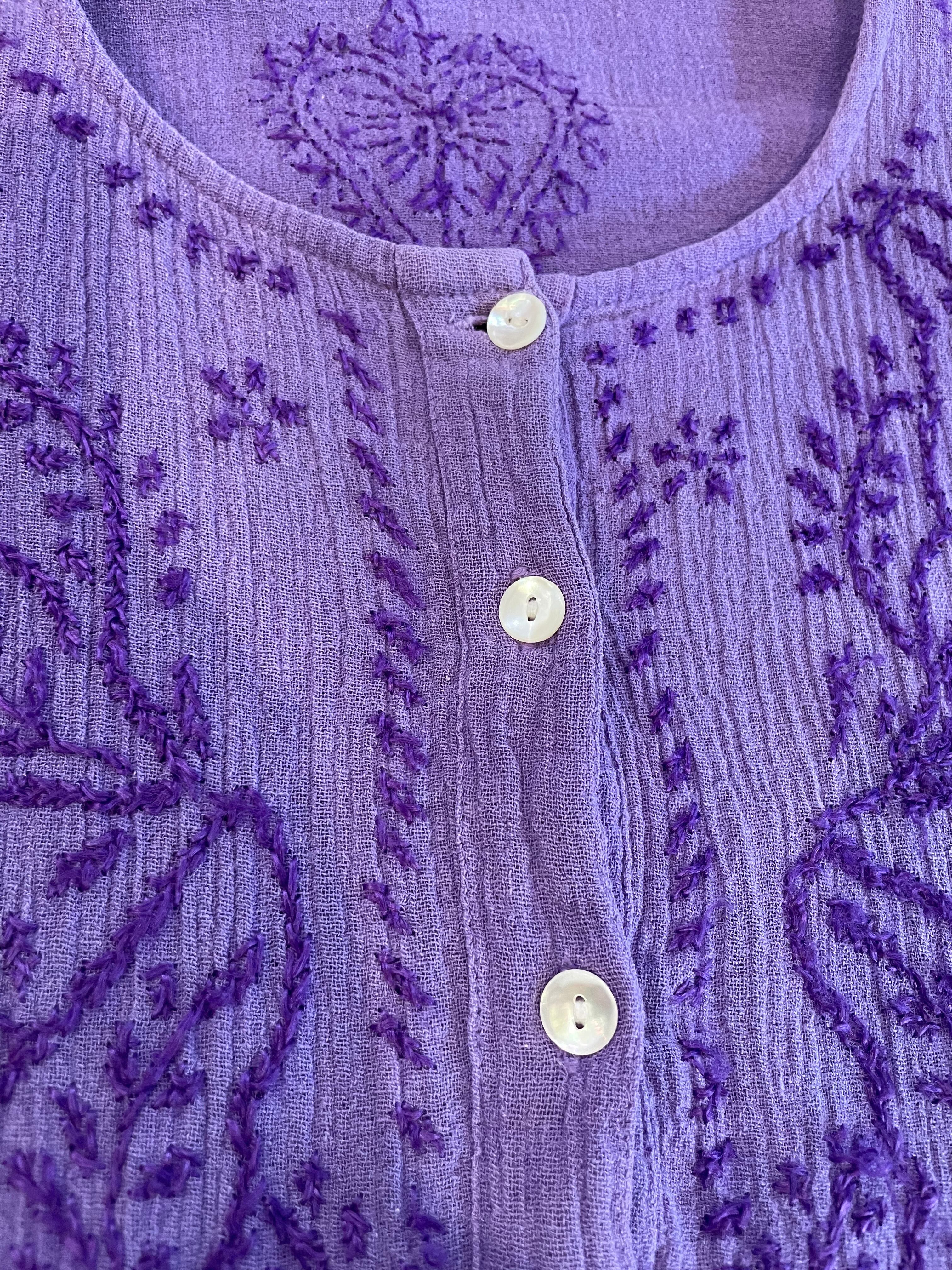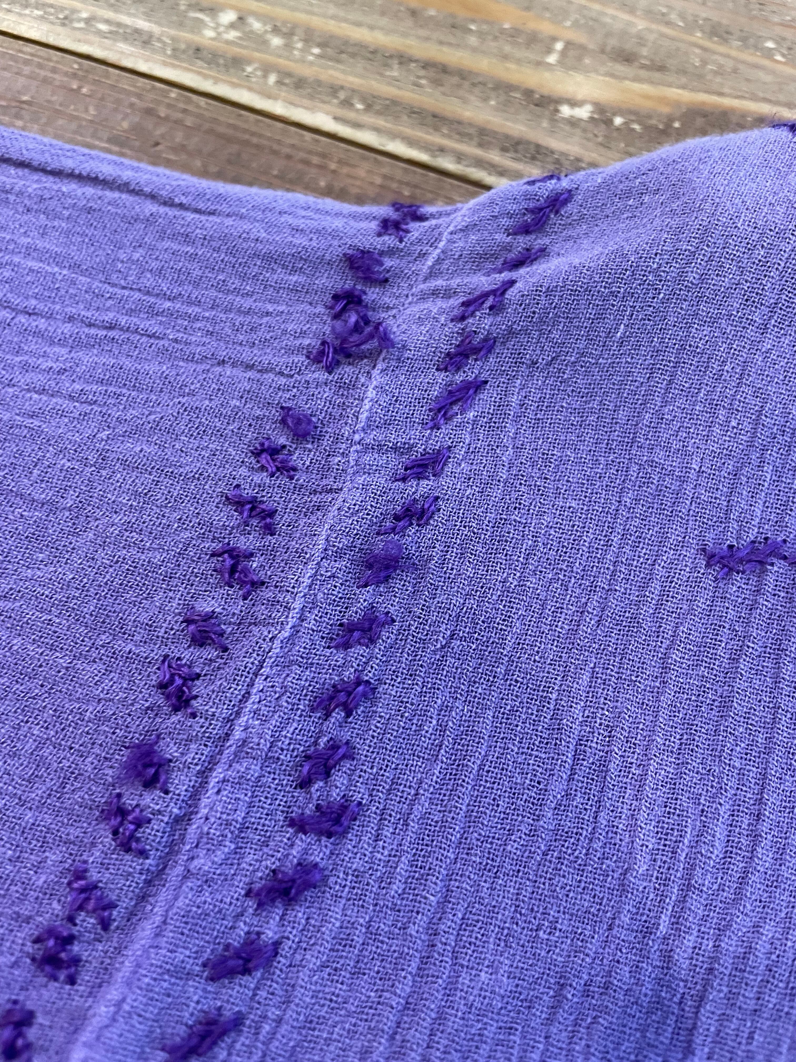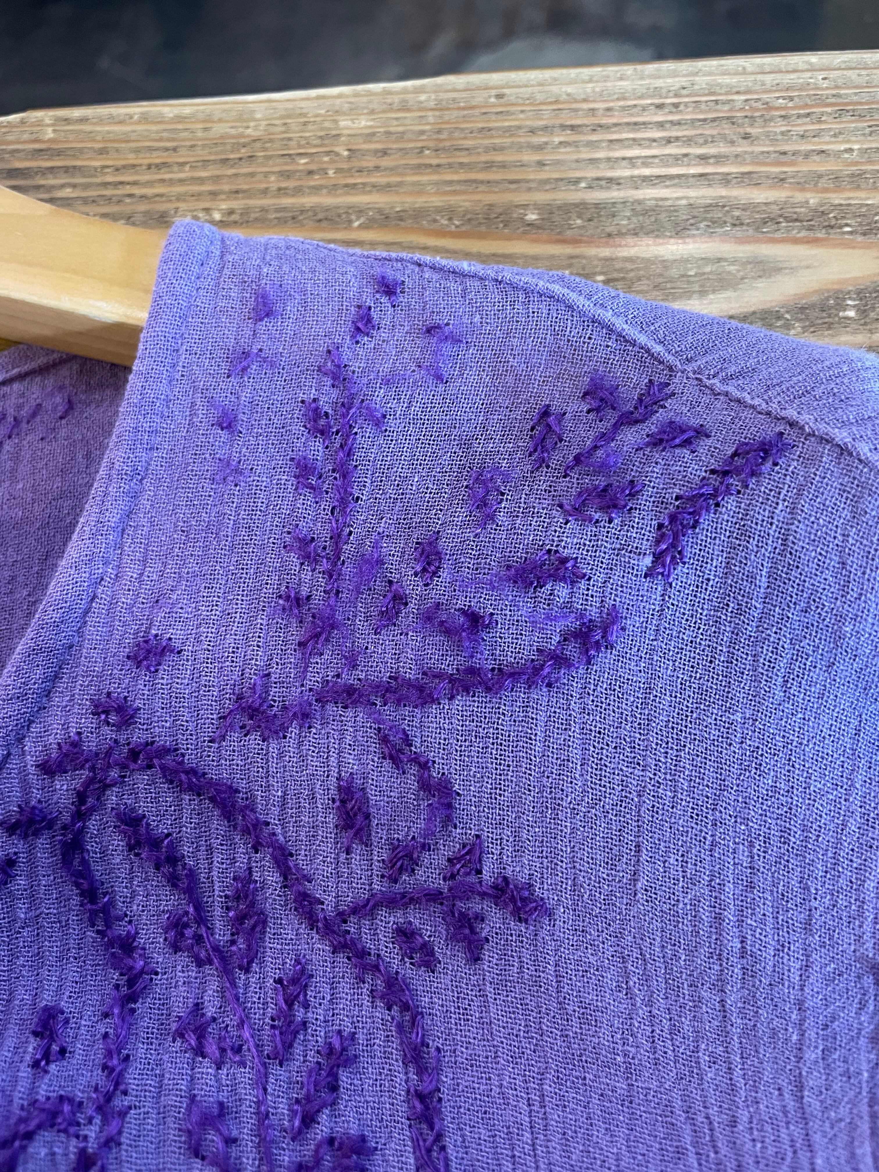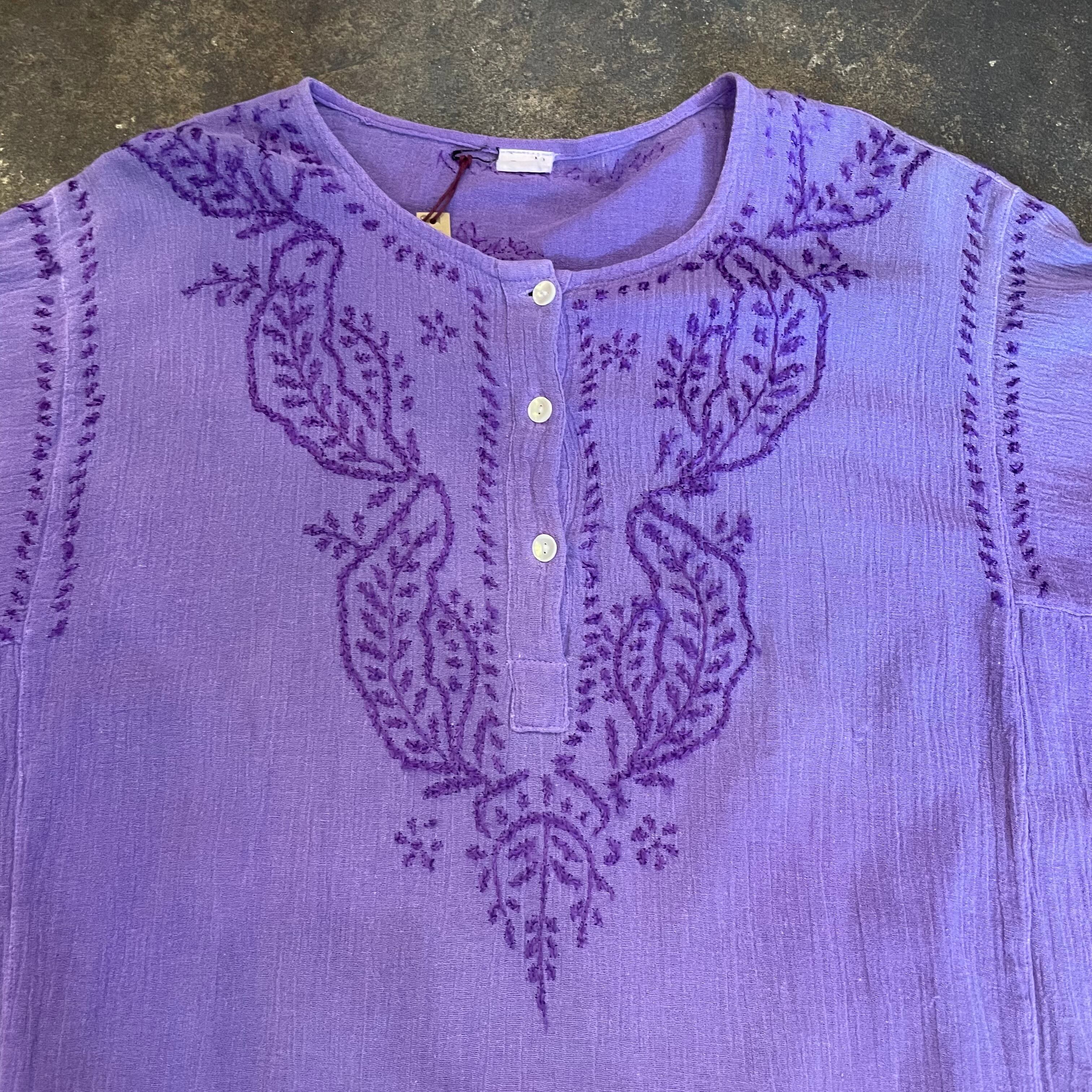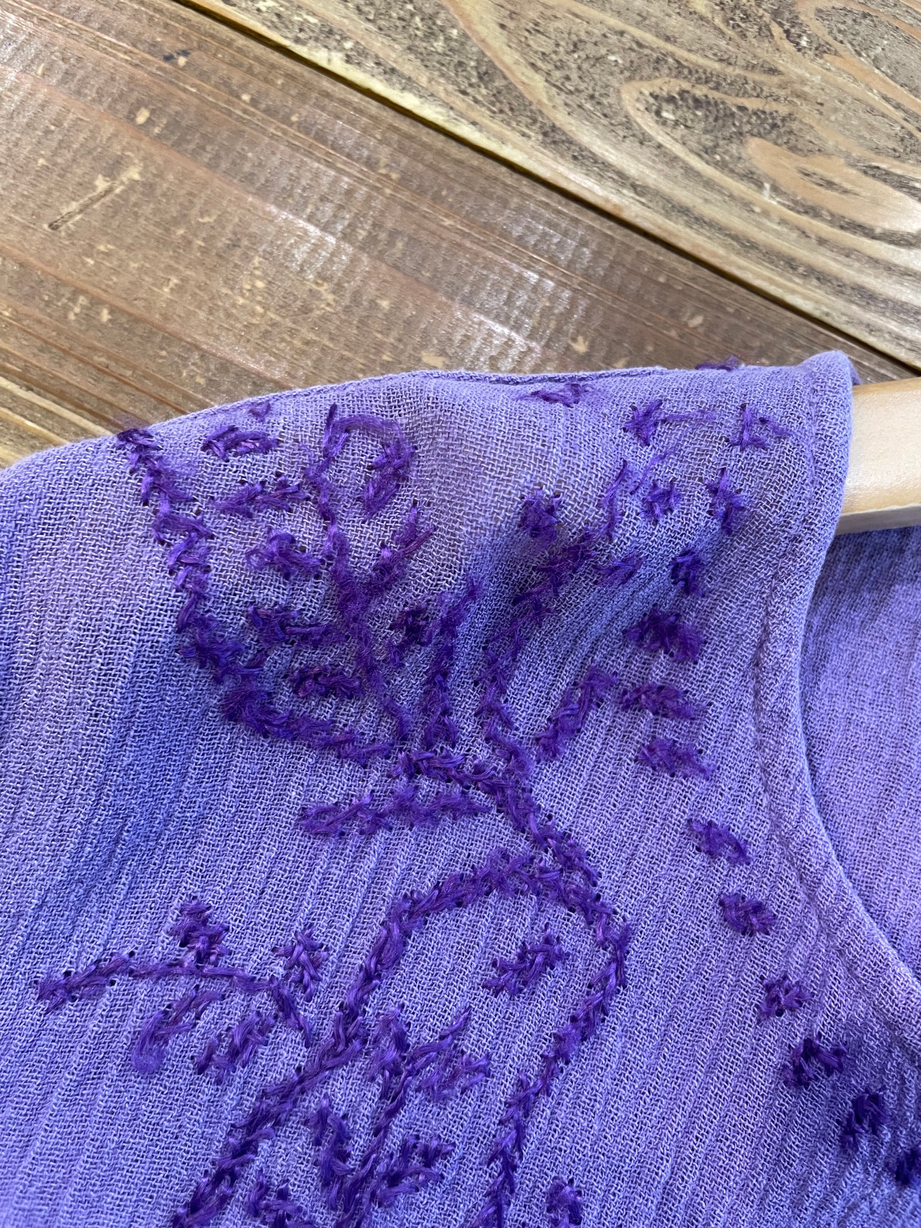 コットンガーゼのパサっと乾いた肌触りが気持ち良く、ラベンダーカラーに紫の手刺繍がかわいいチュニックです。