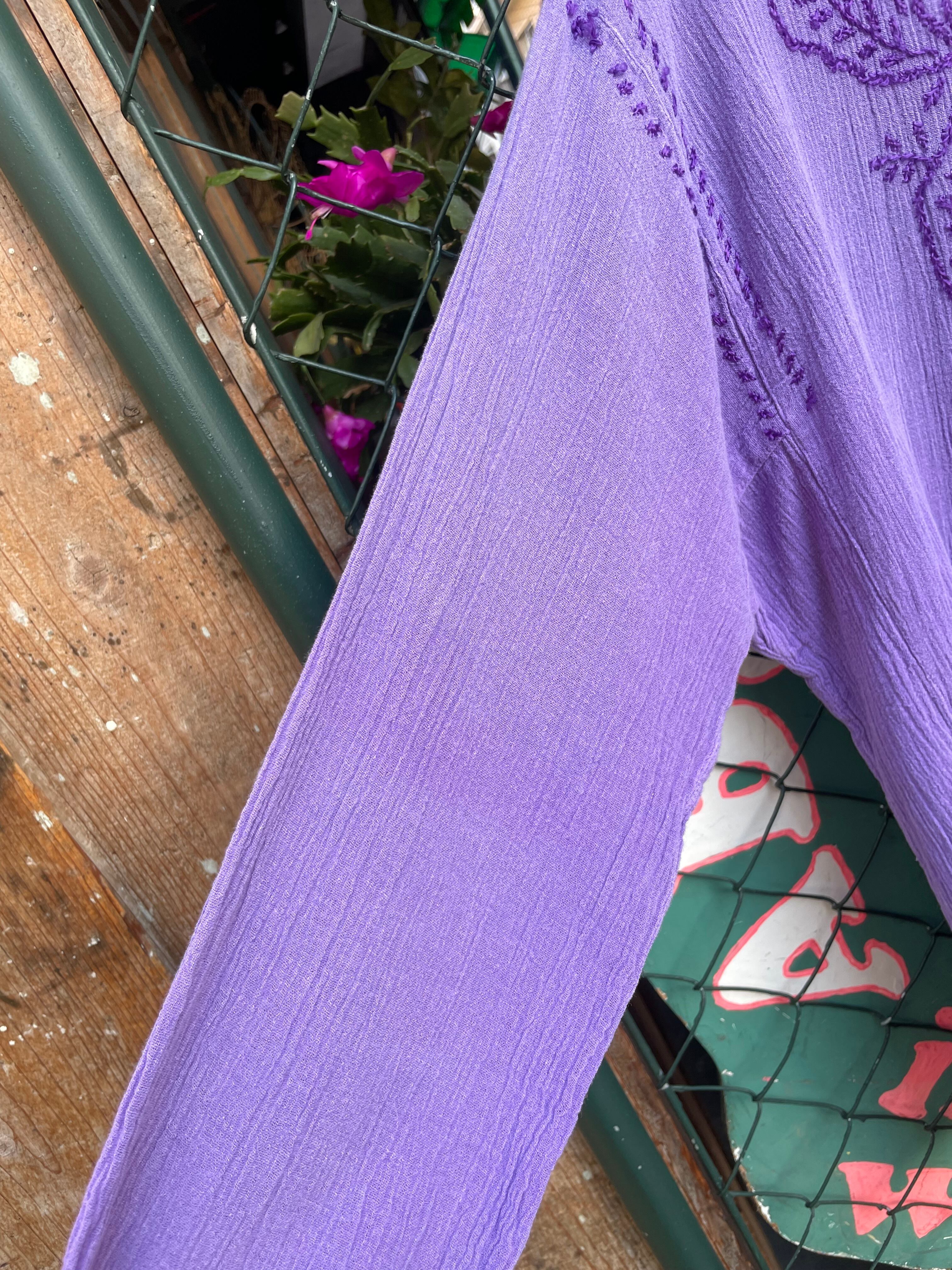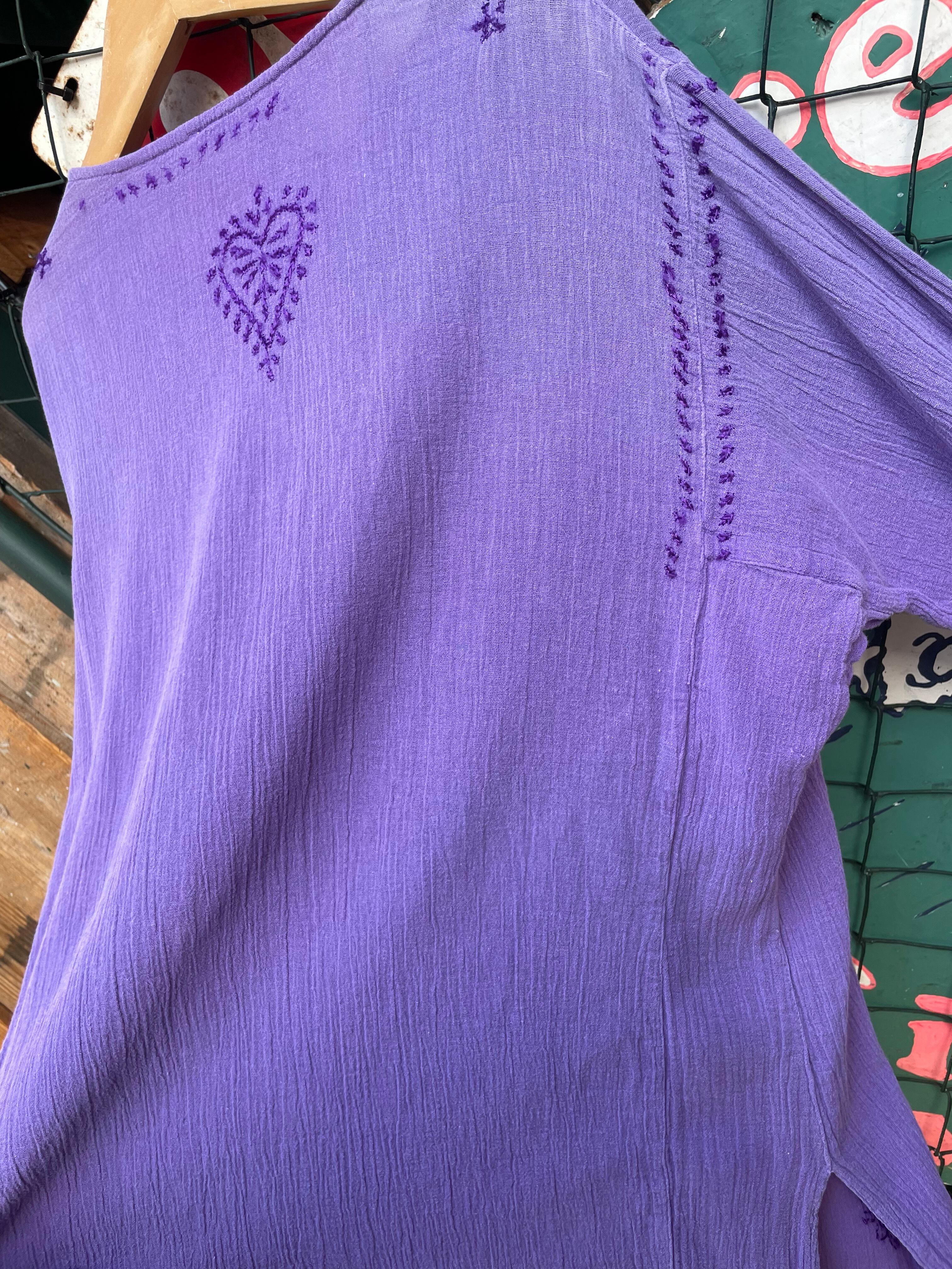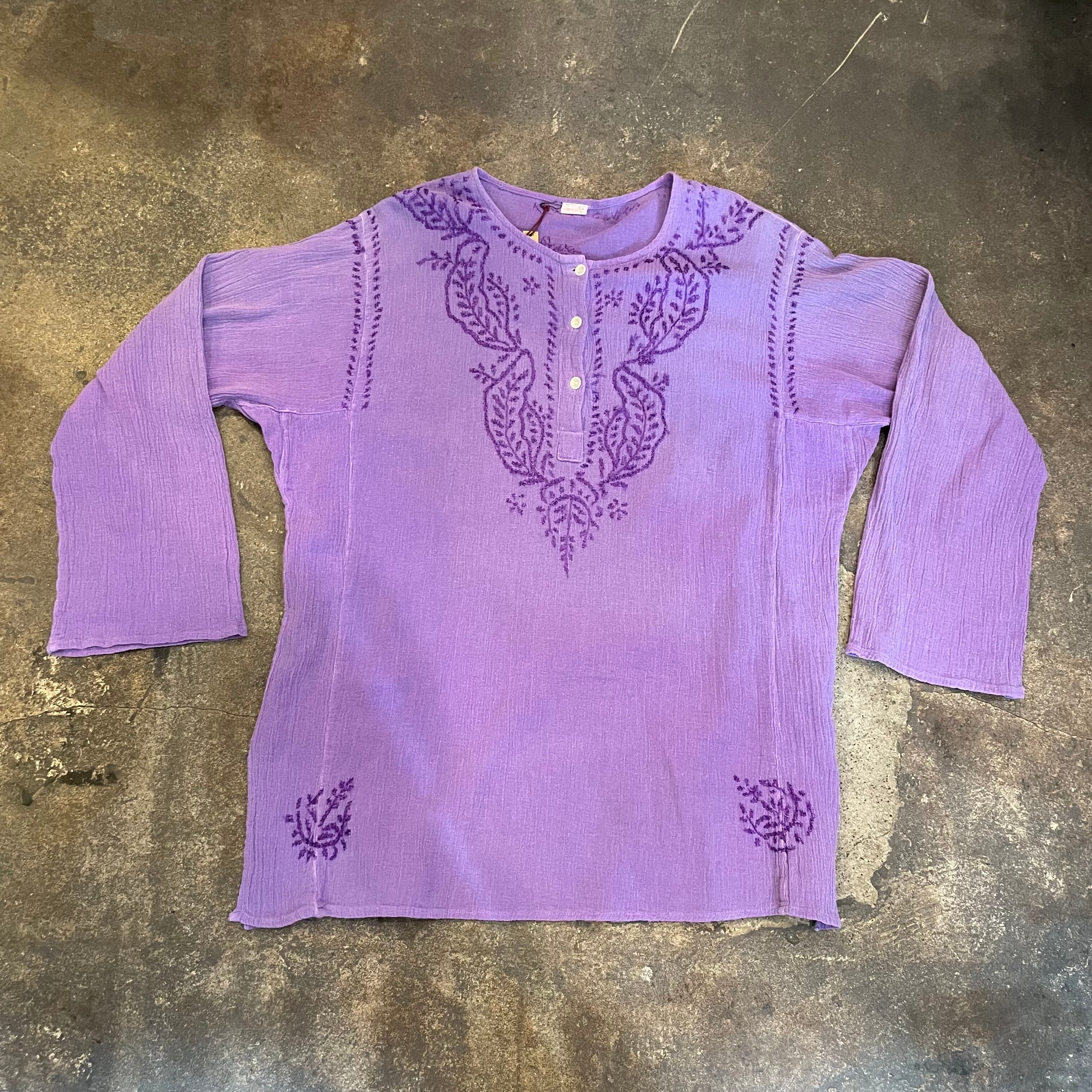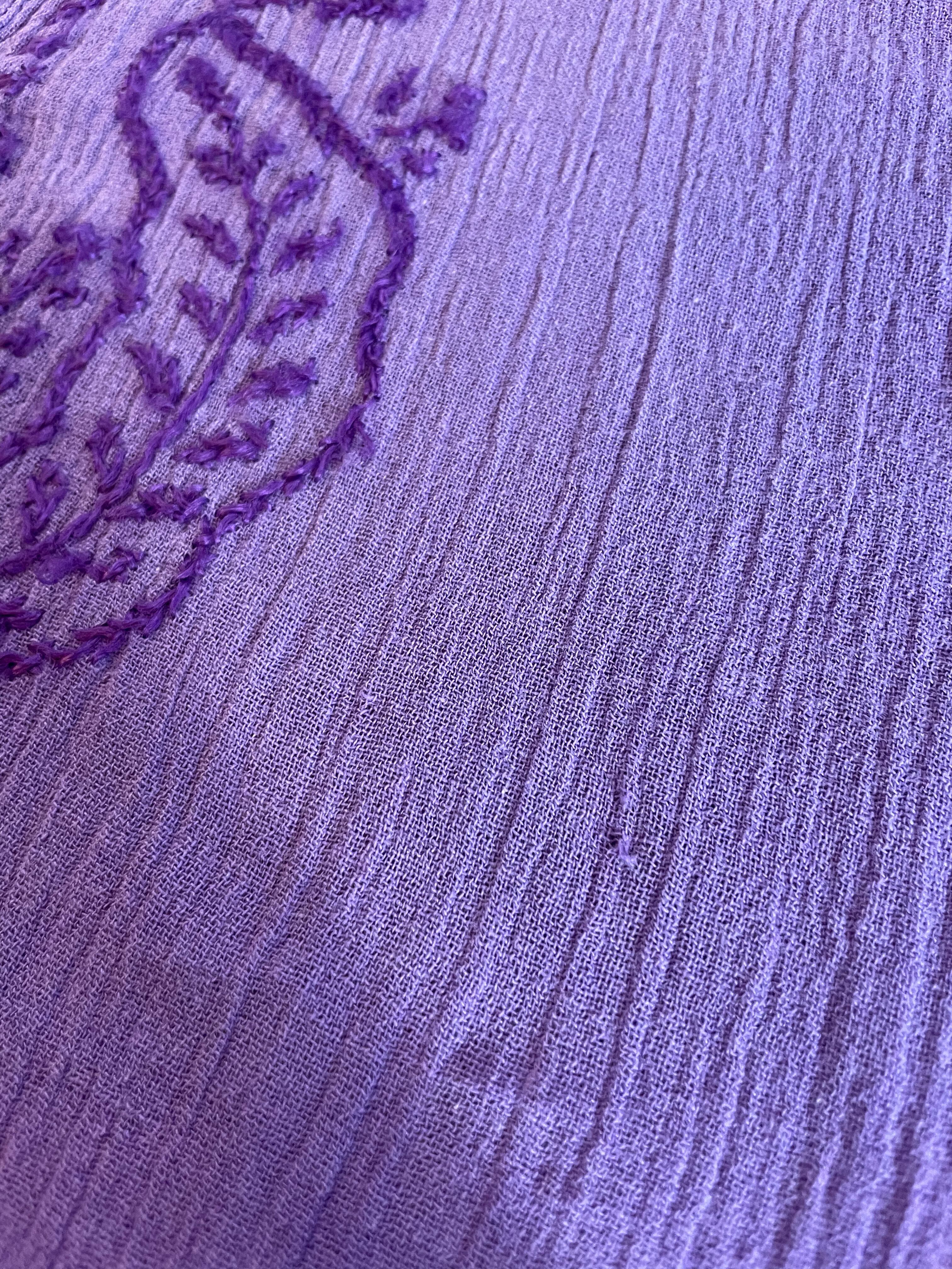 コットンガーゼのパサっと乾いた肌触りが気持ち良く、ラベンダーカラーに紫の手刺繍がかわいいチュニックです。