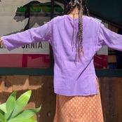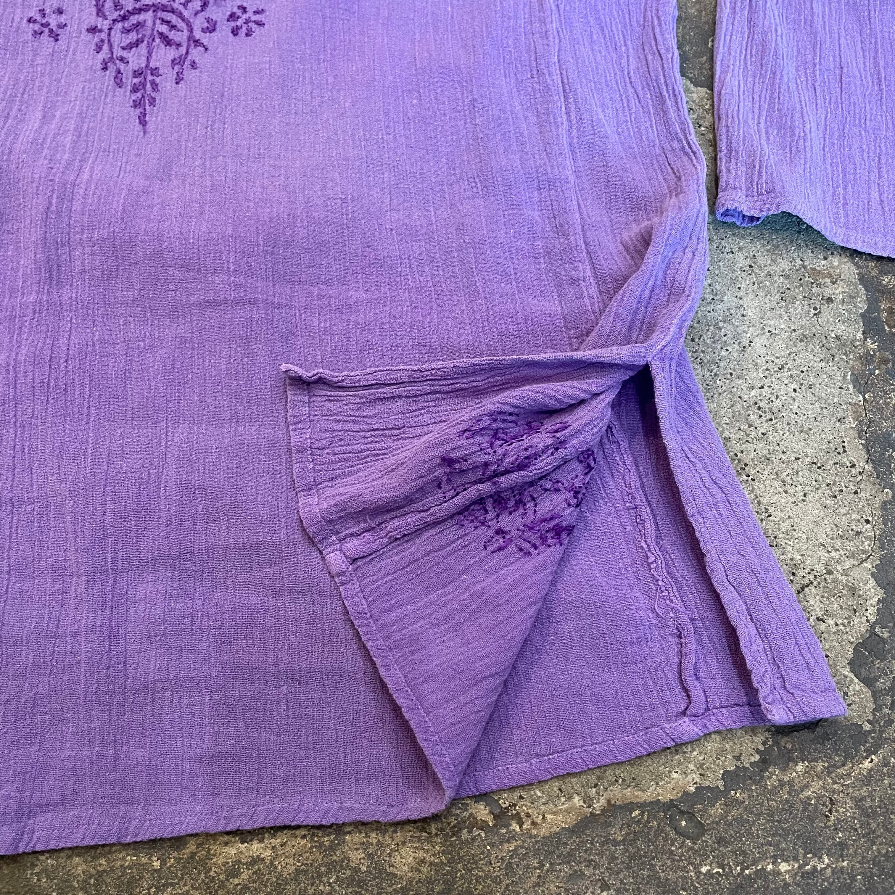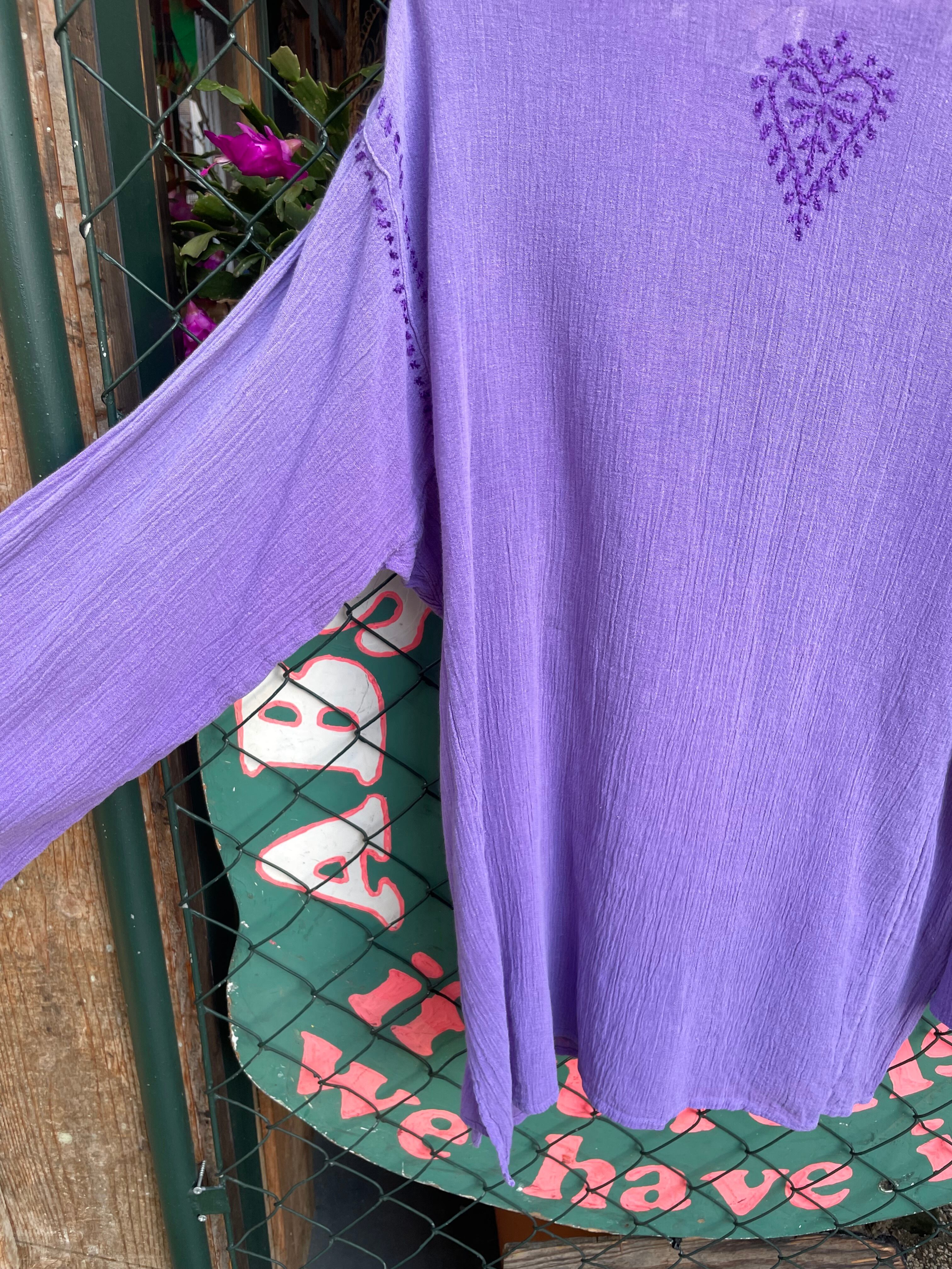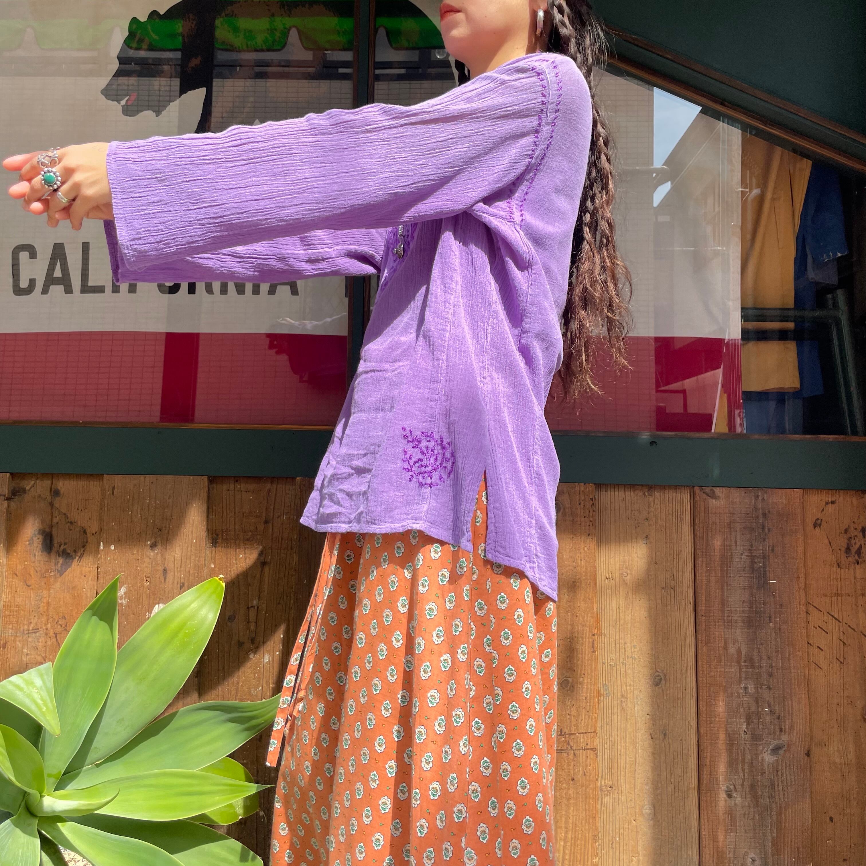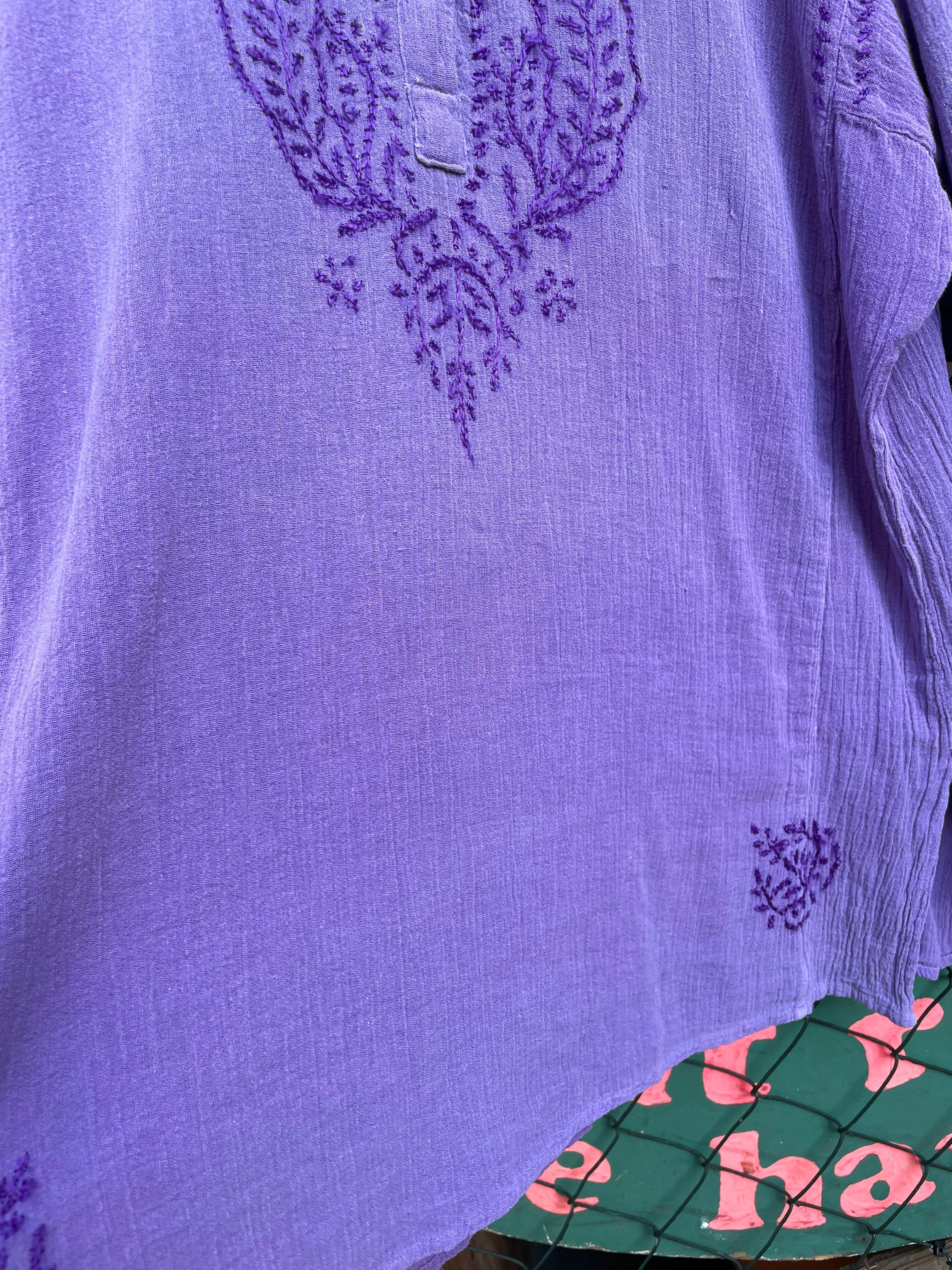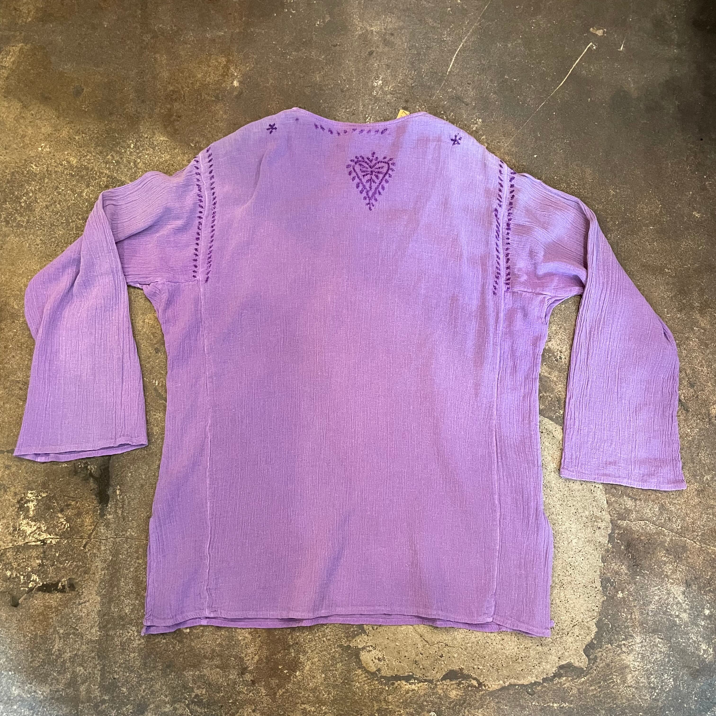 コットンガーゼのパサっと乾いた肌触りが気持ち良く、ラベンダーカラーに紫の手刺繍がかわいいチュニックです。
