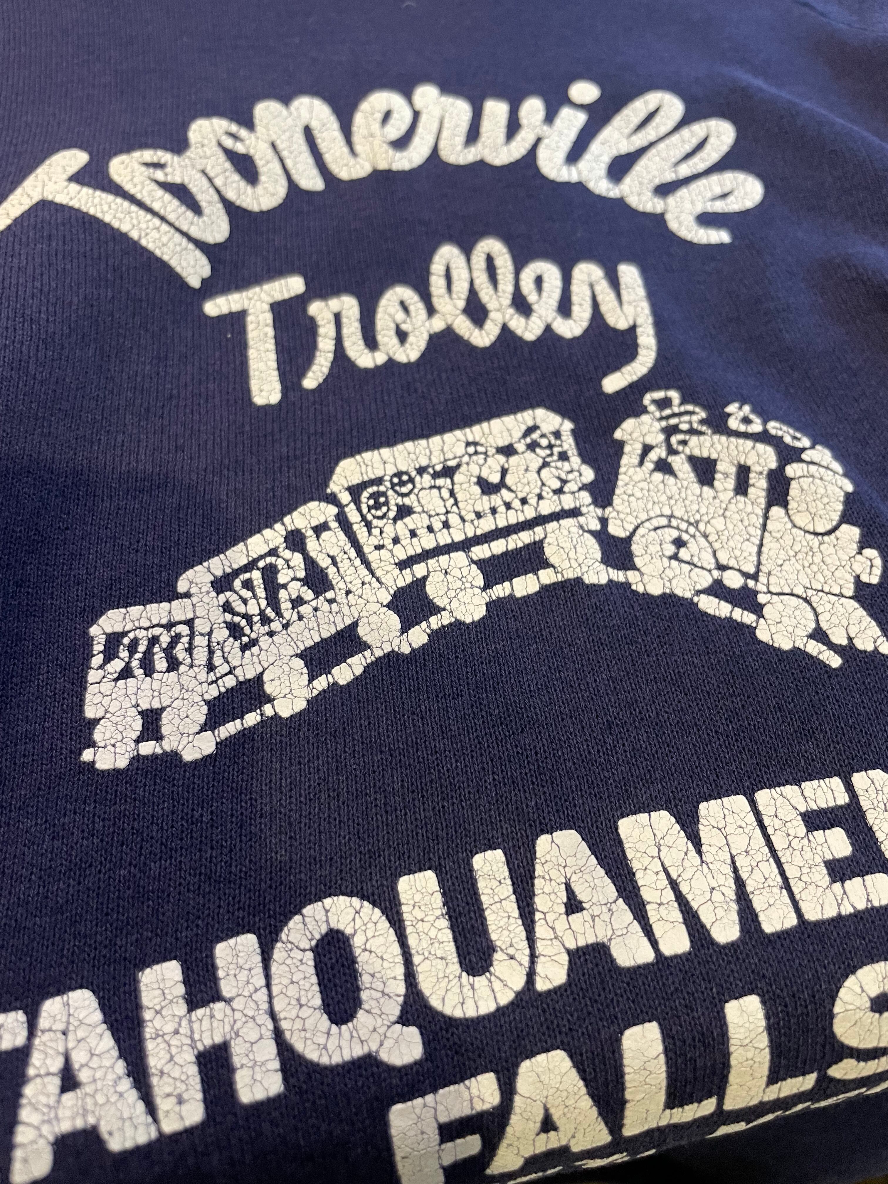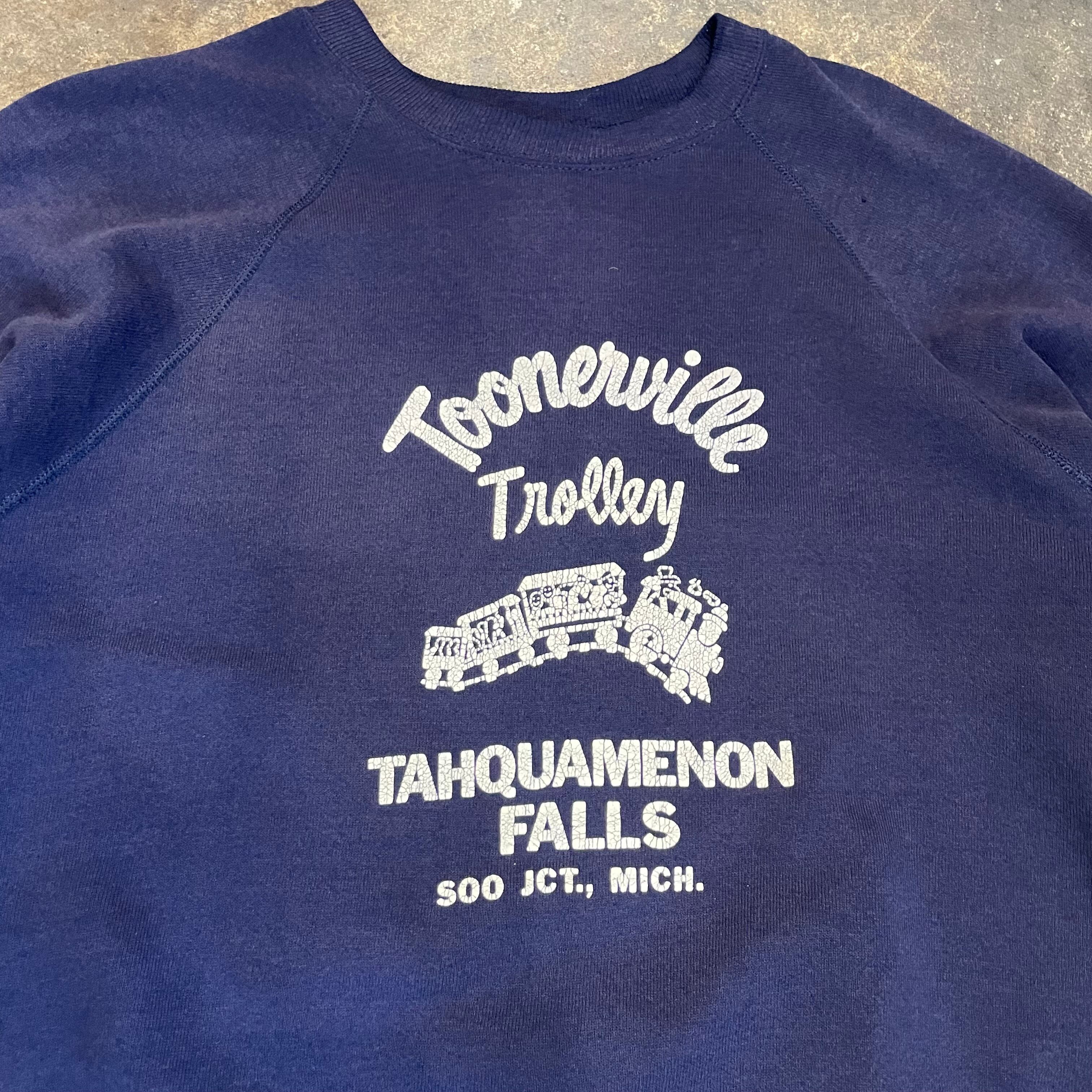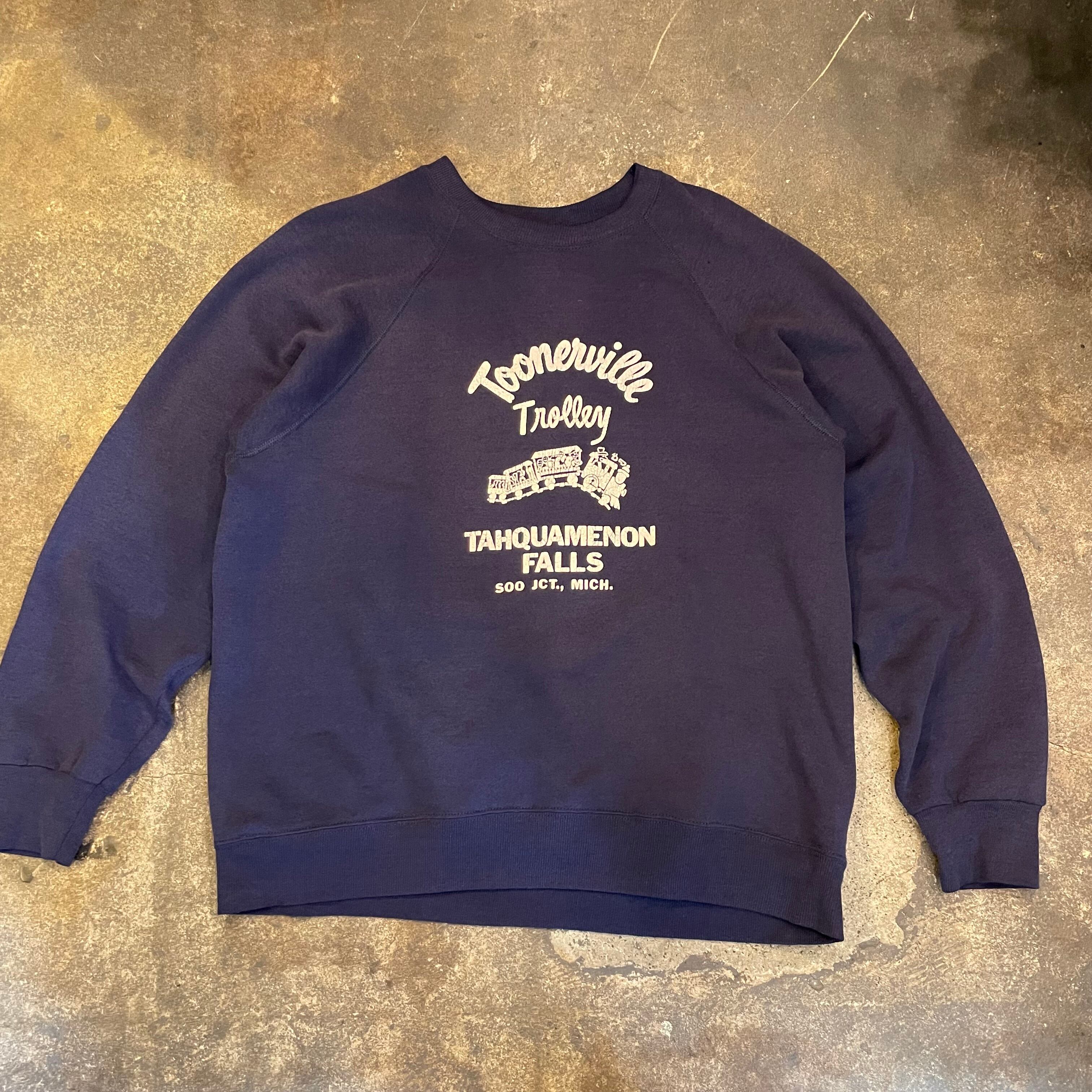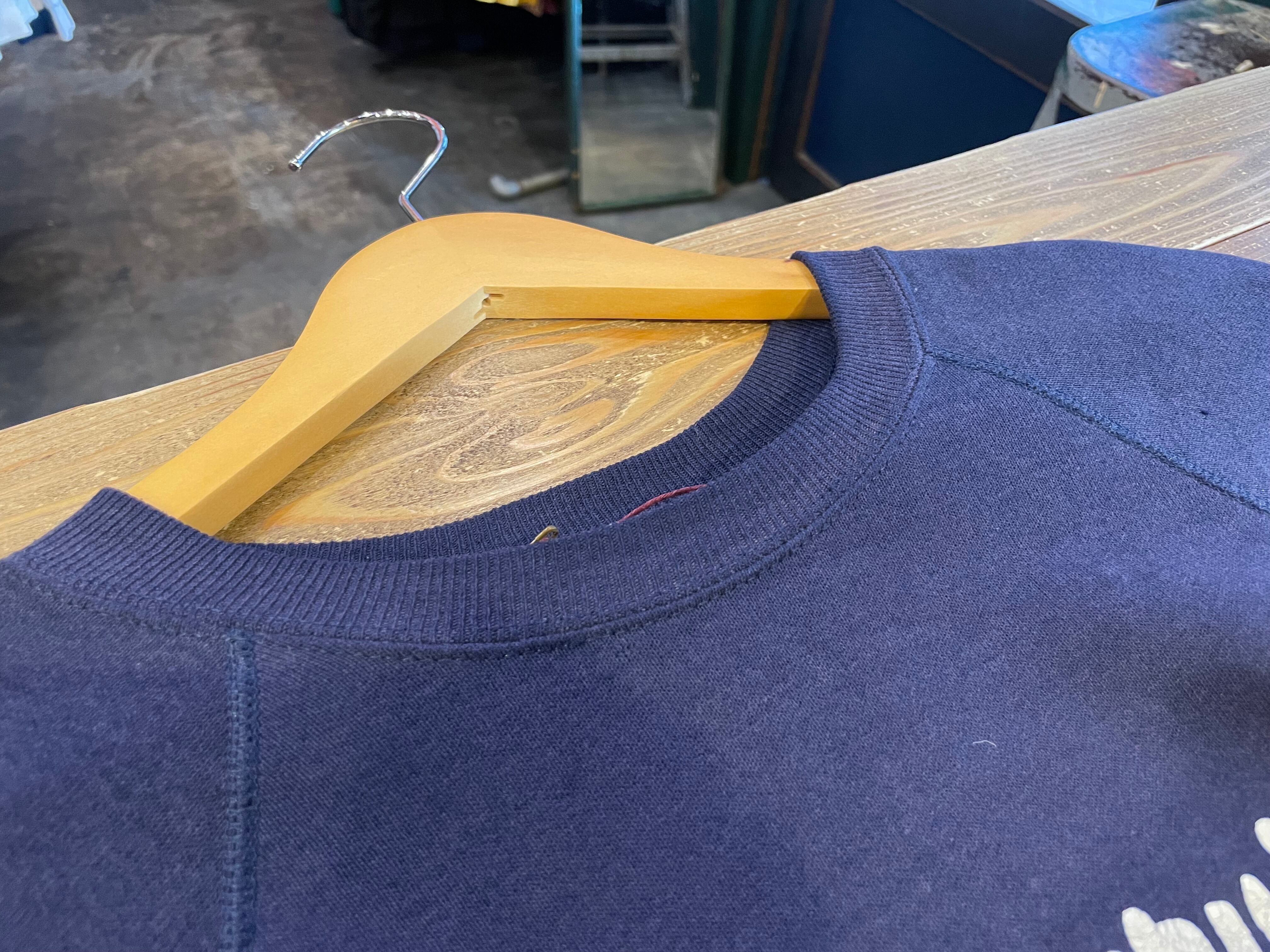 ネイビーに白のプリントがシンプルですが映えていてかわいい80年代頃USA製のスウェットです。
