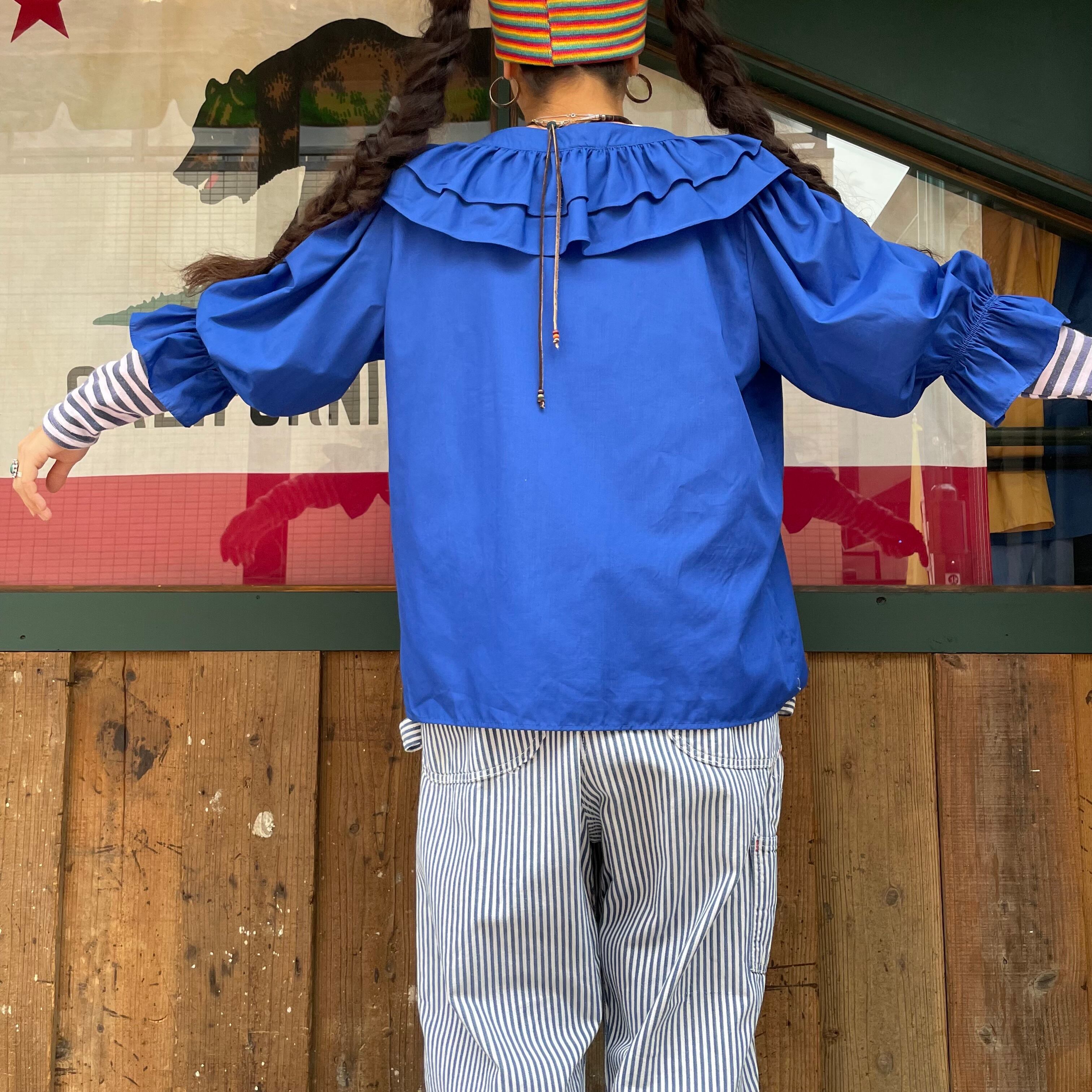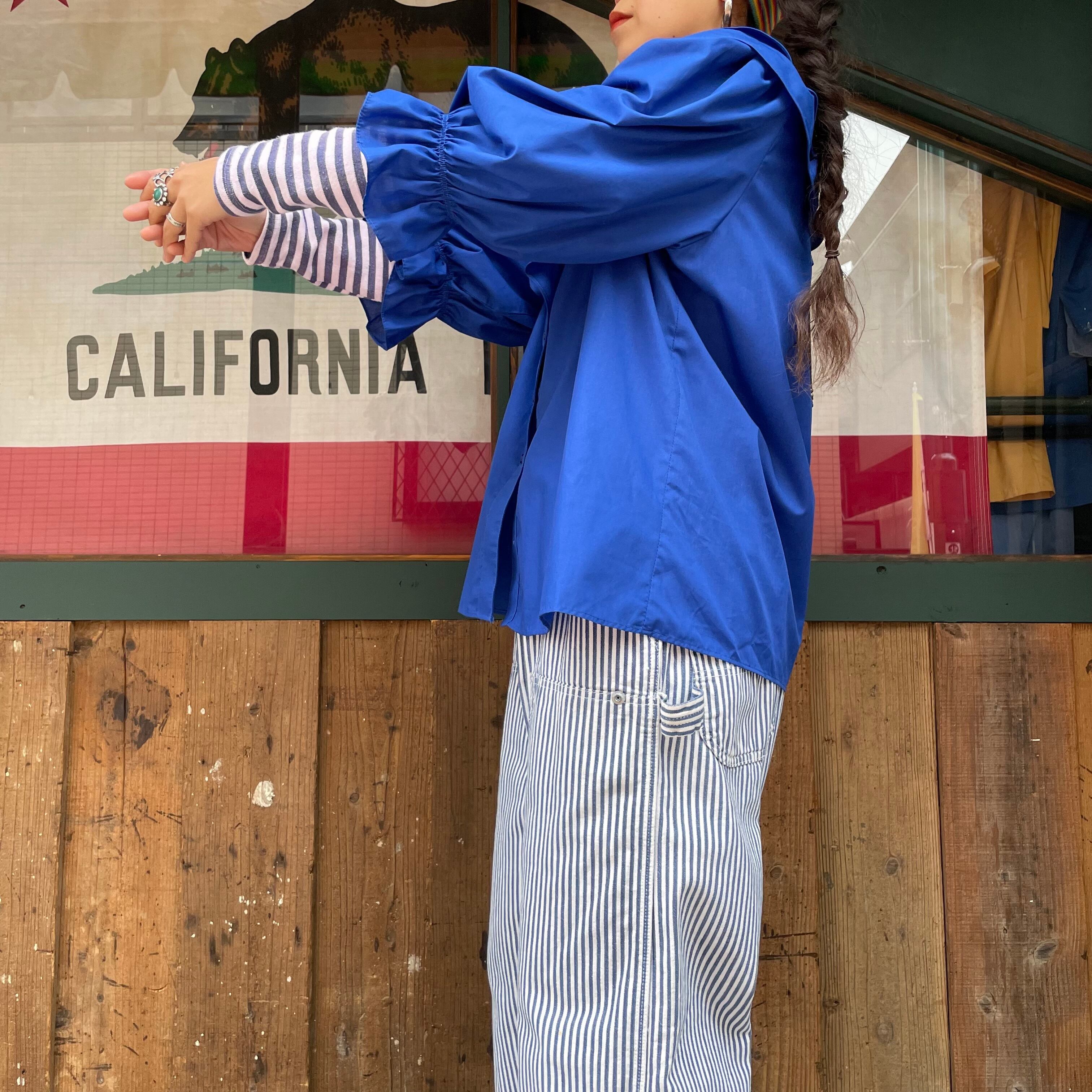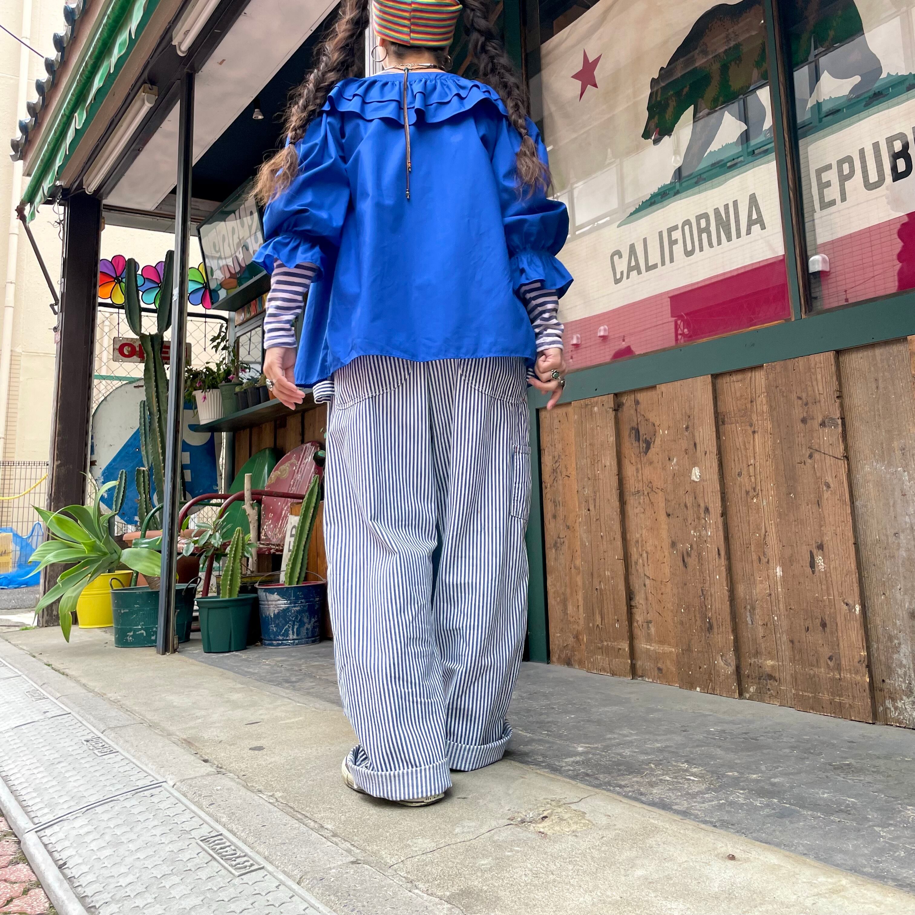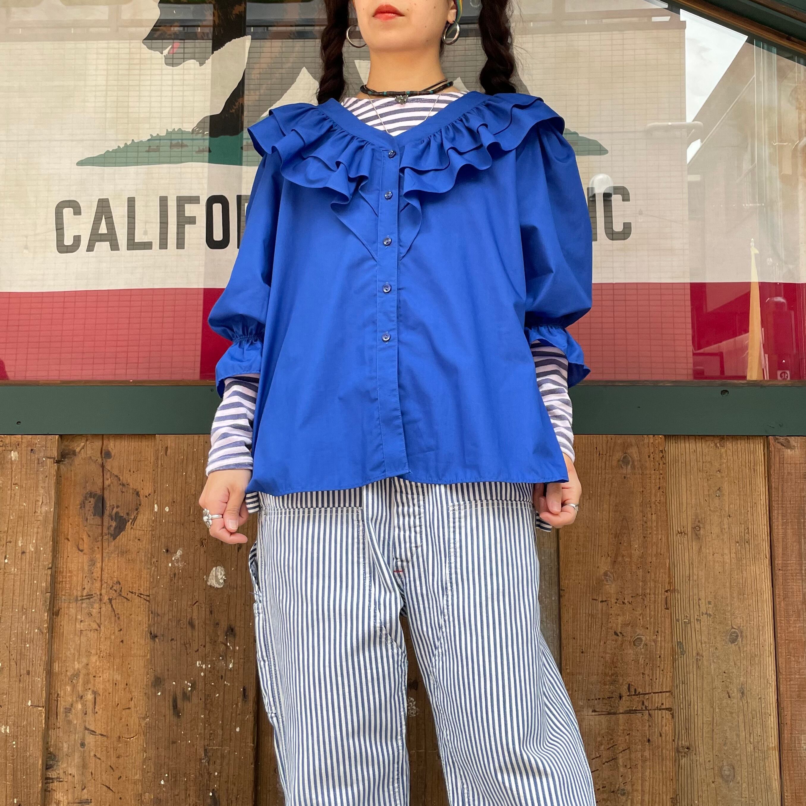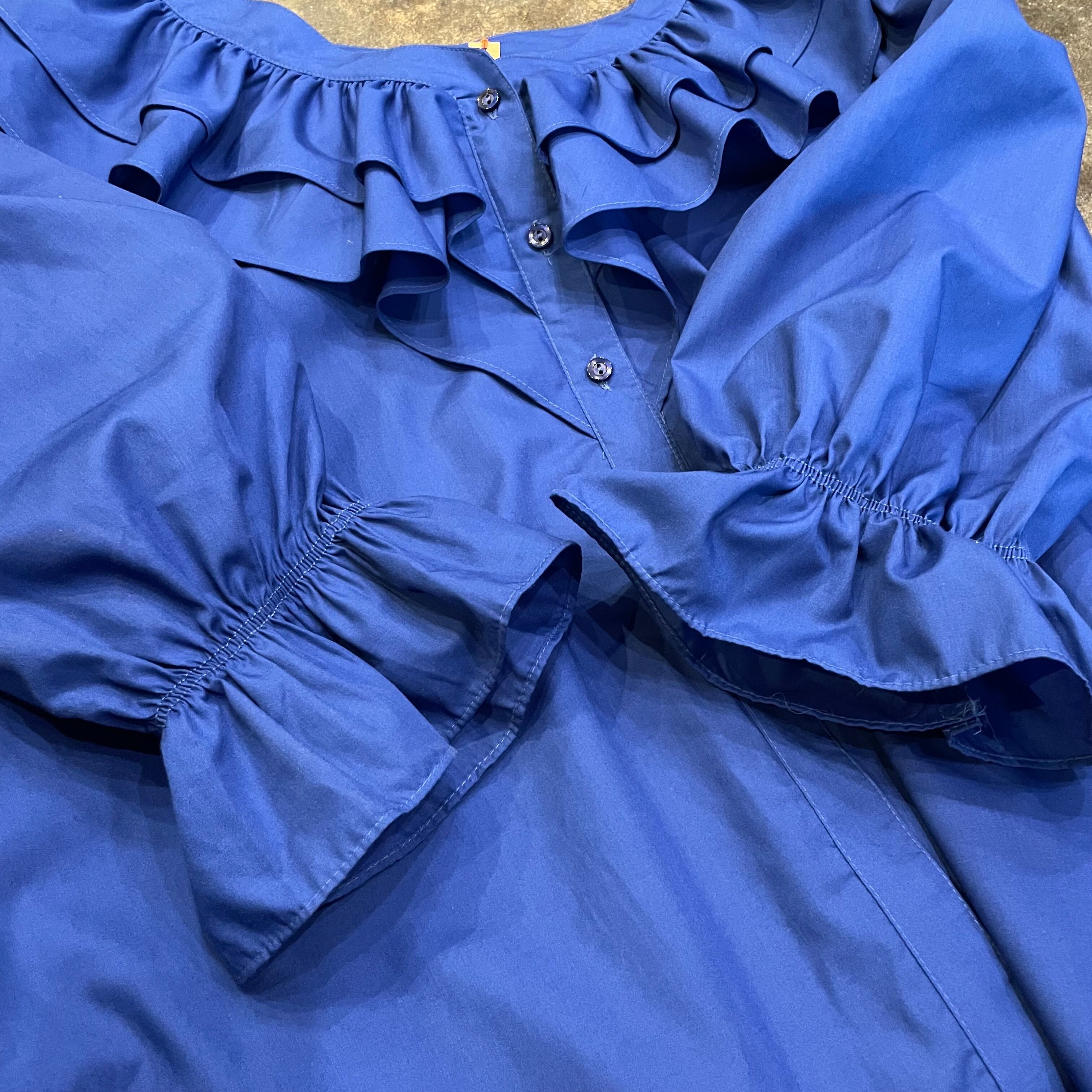 襟ぐりの2枚のフリル、長めのパフスリーブ、袖口のひらひらとかわいいディテールがたくさんあり全体的にガーリーな雰囲気ですね。