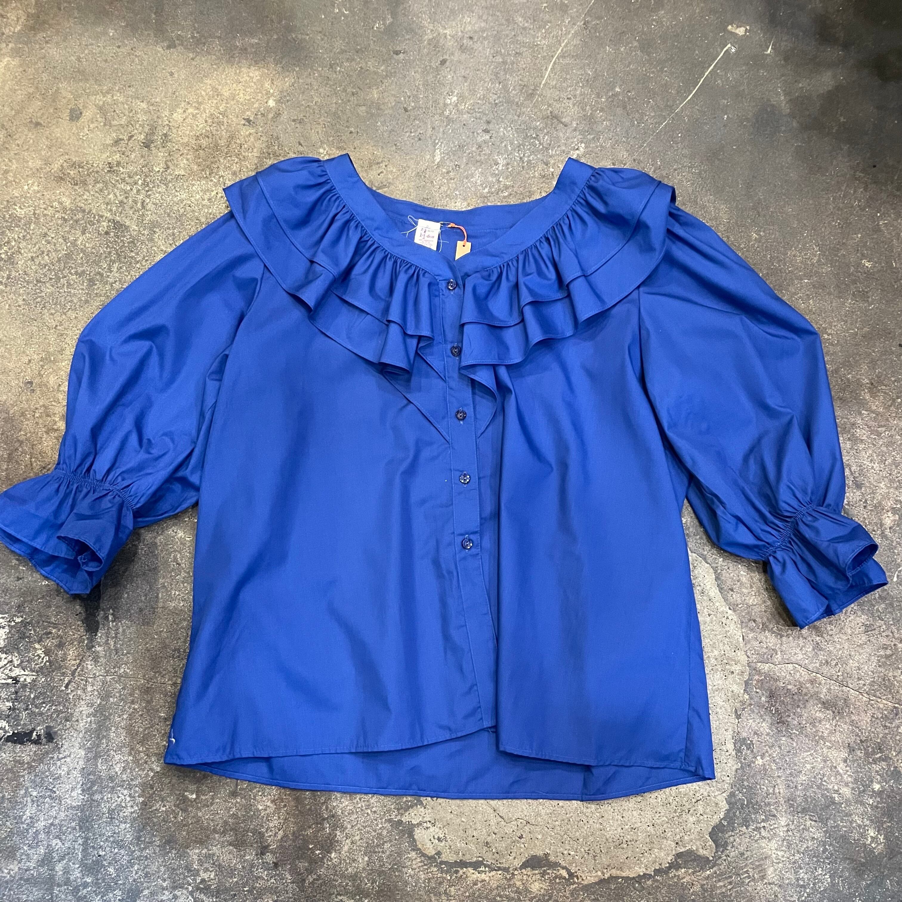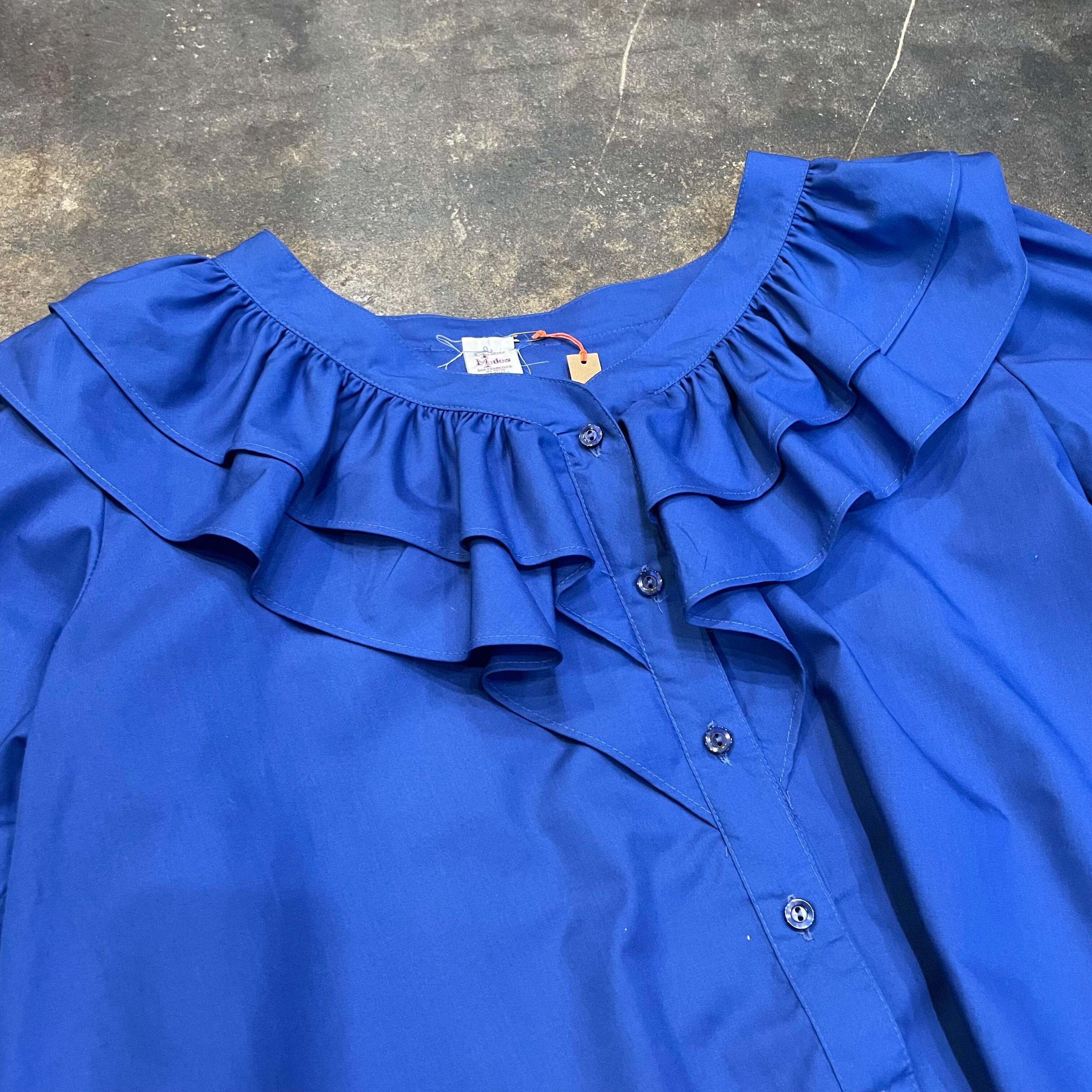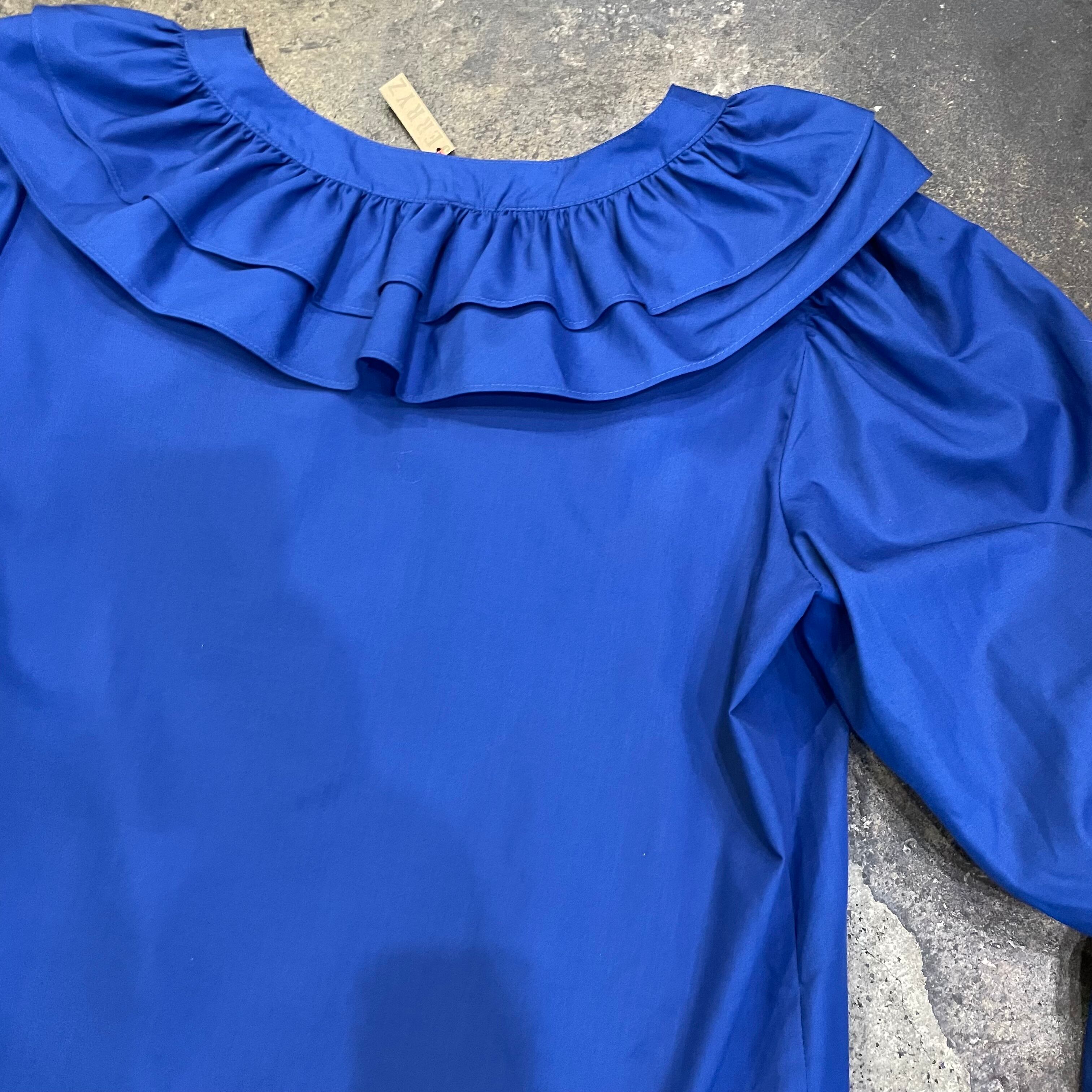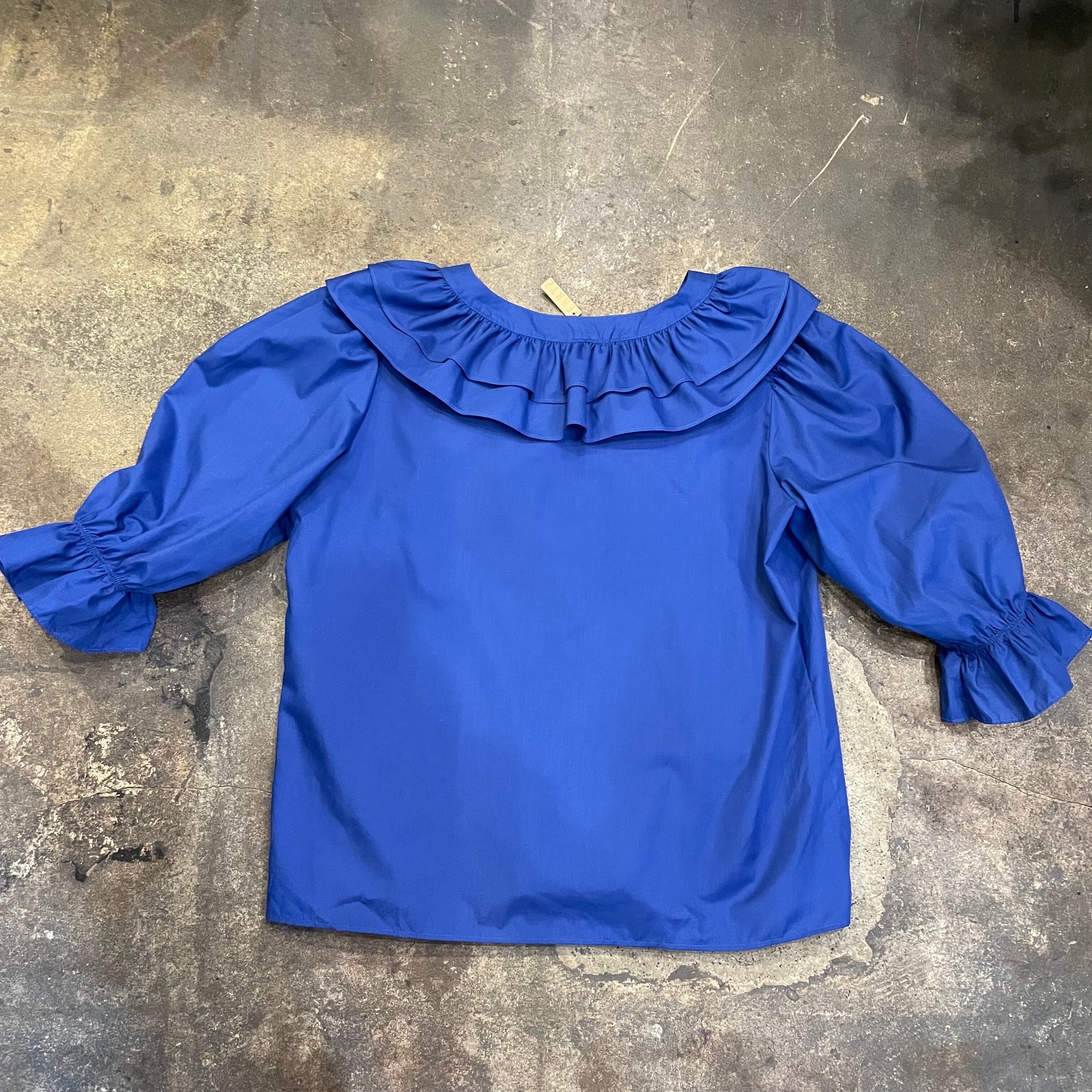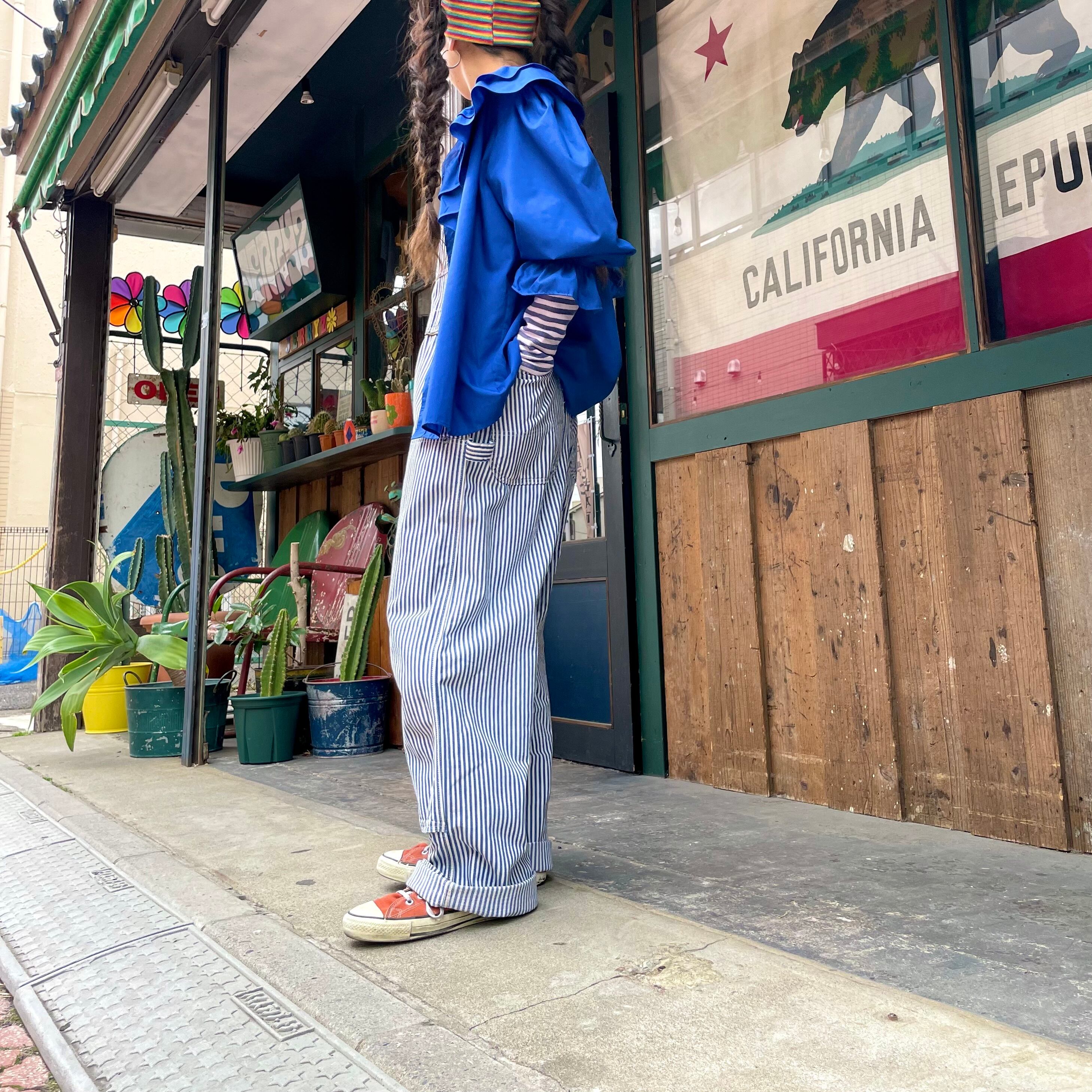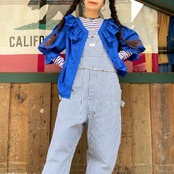 襟ぐりの2枚のフリル、長めのパフスリーブ、袖口のひらひらとかわいいディテールがたくさんあり全体的にガーリーな雰囲気ですね。