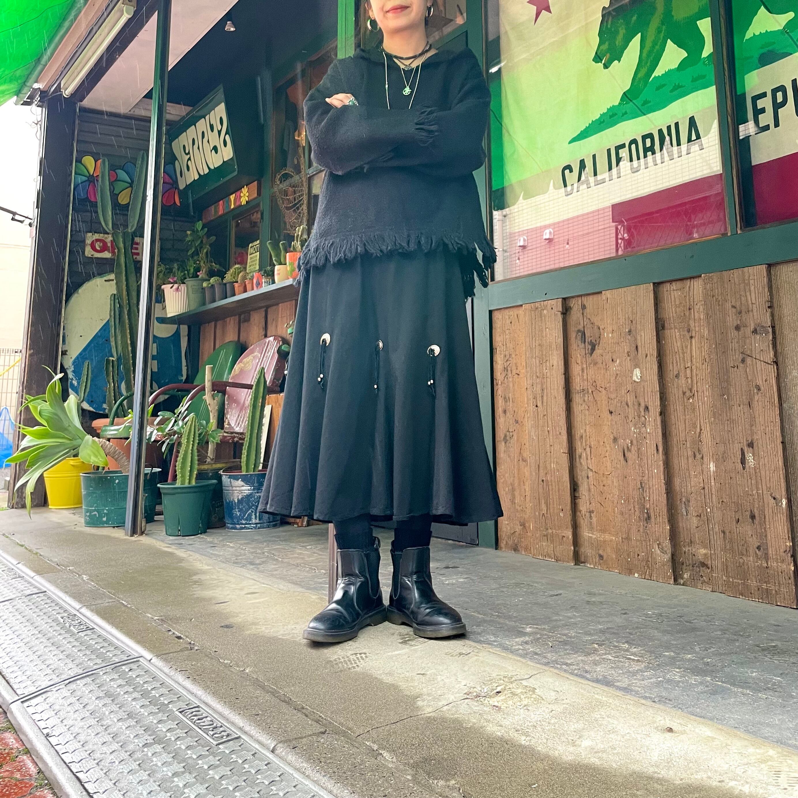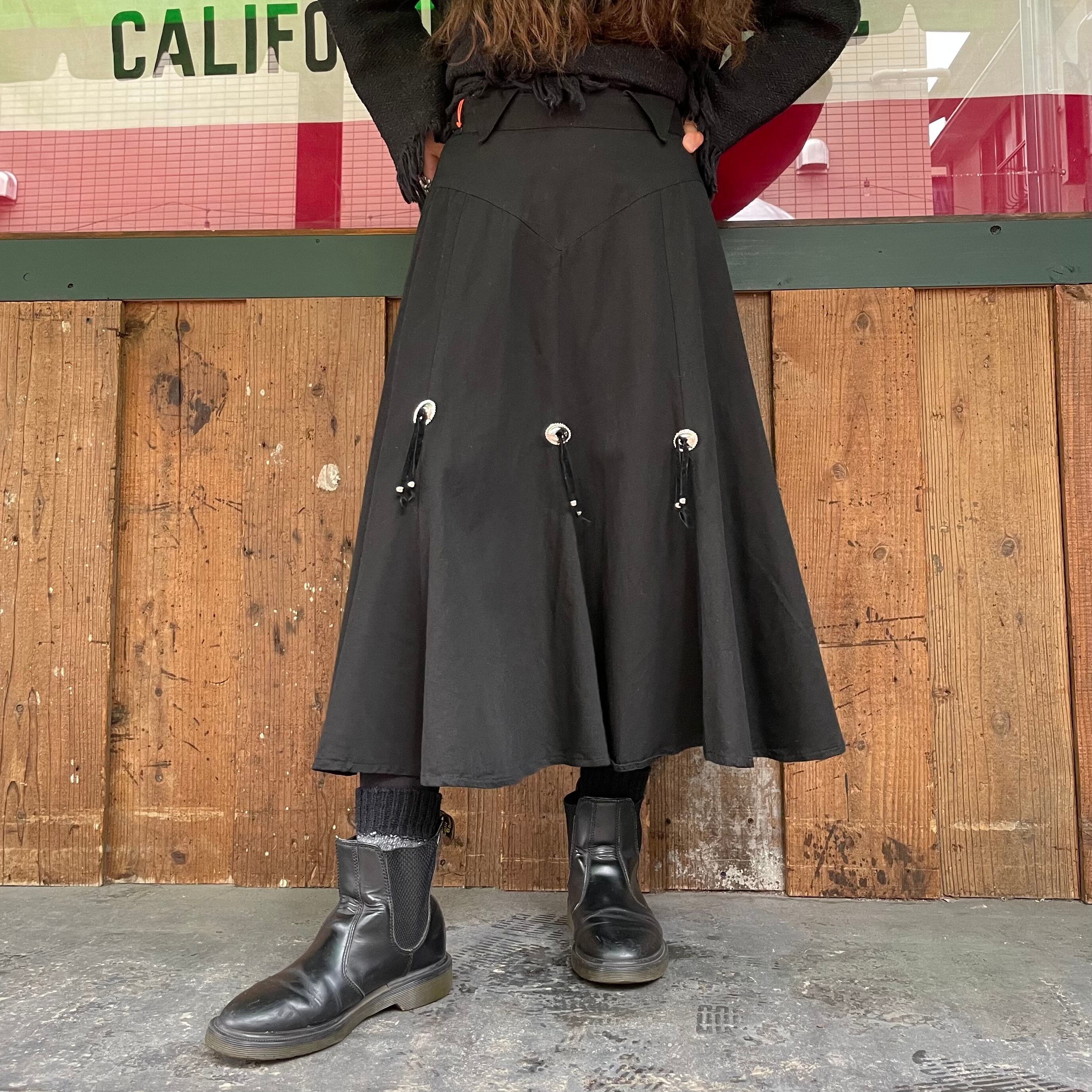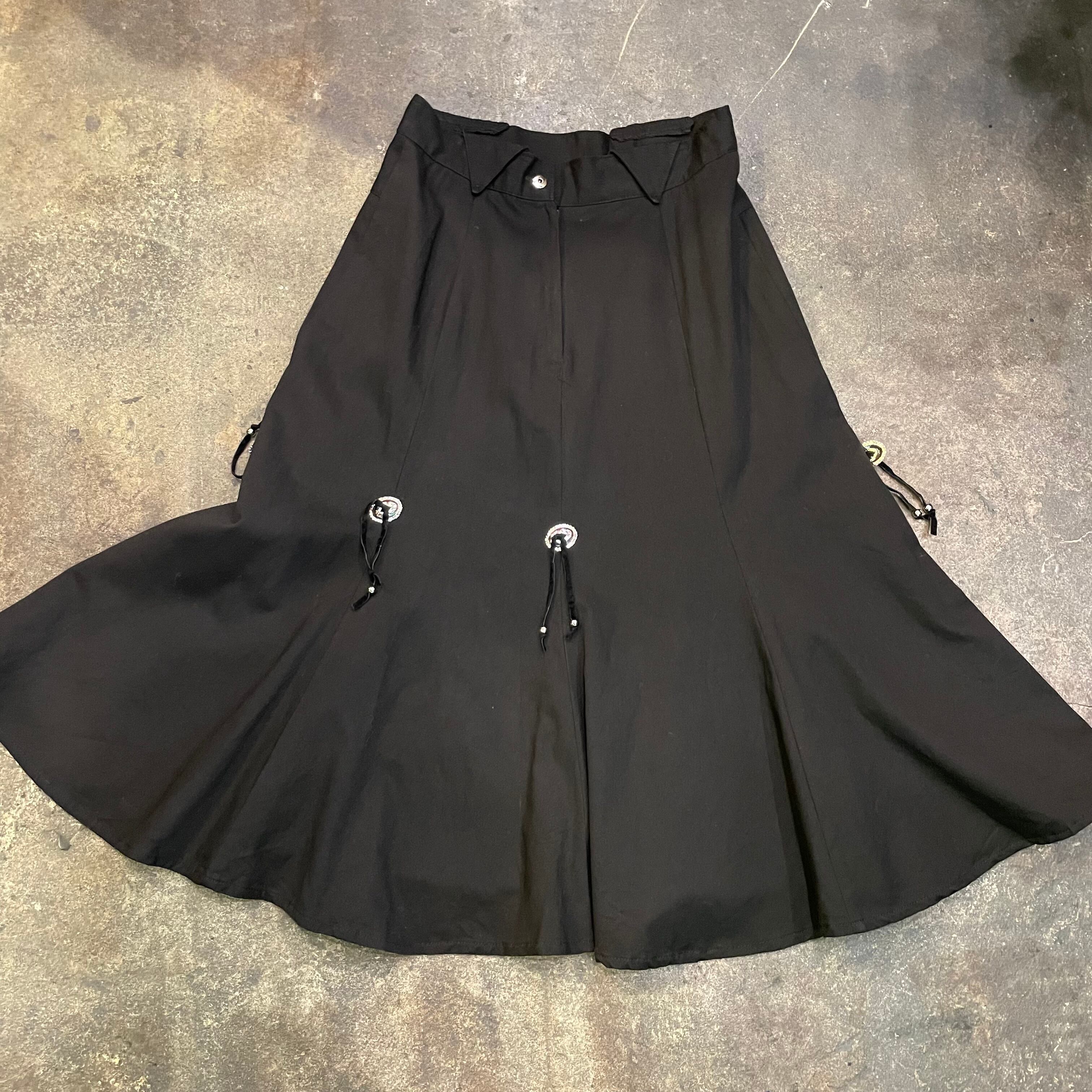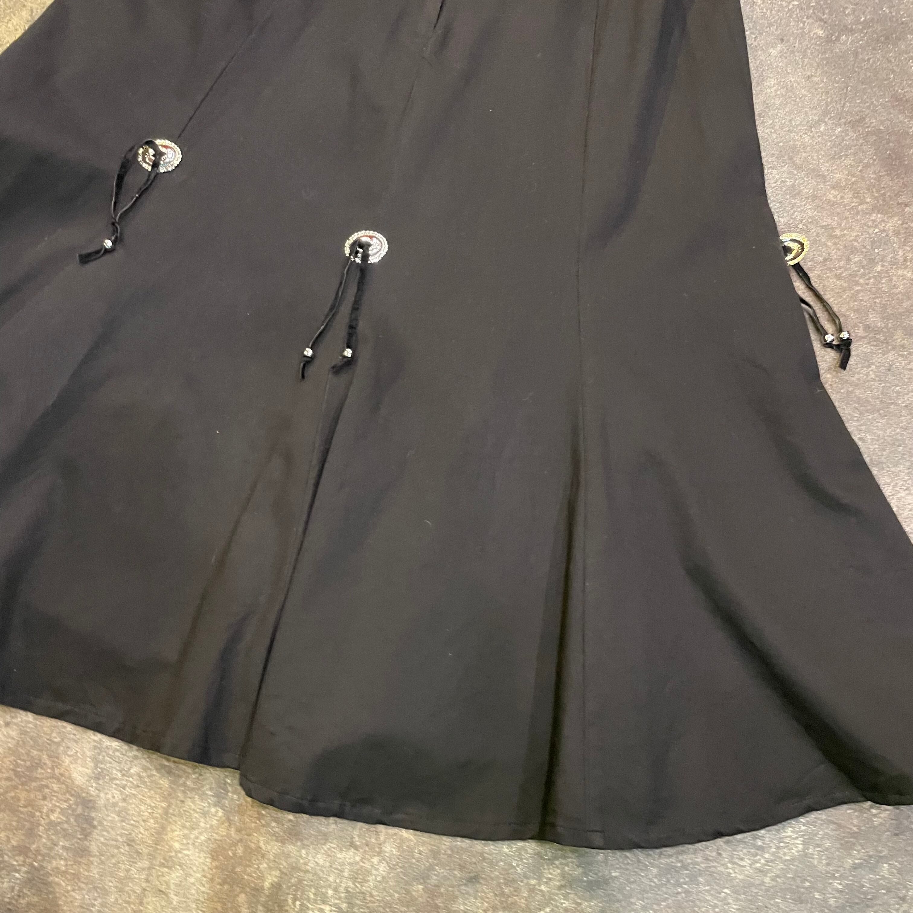 真っ黒のフレアスカートにコンチョとベロアリボンがかわいいスカートです。