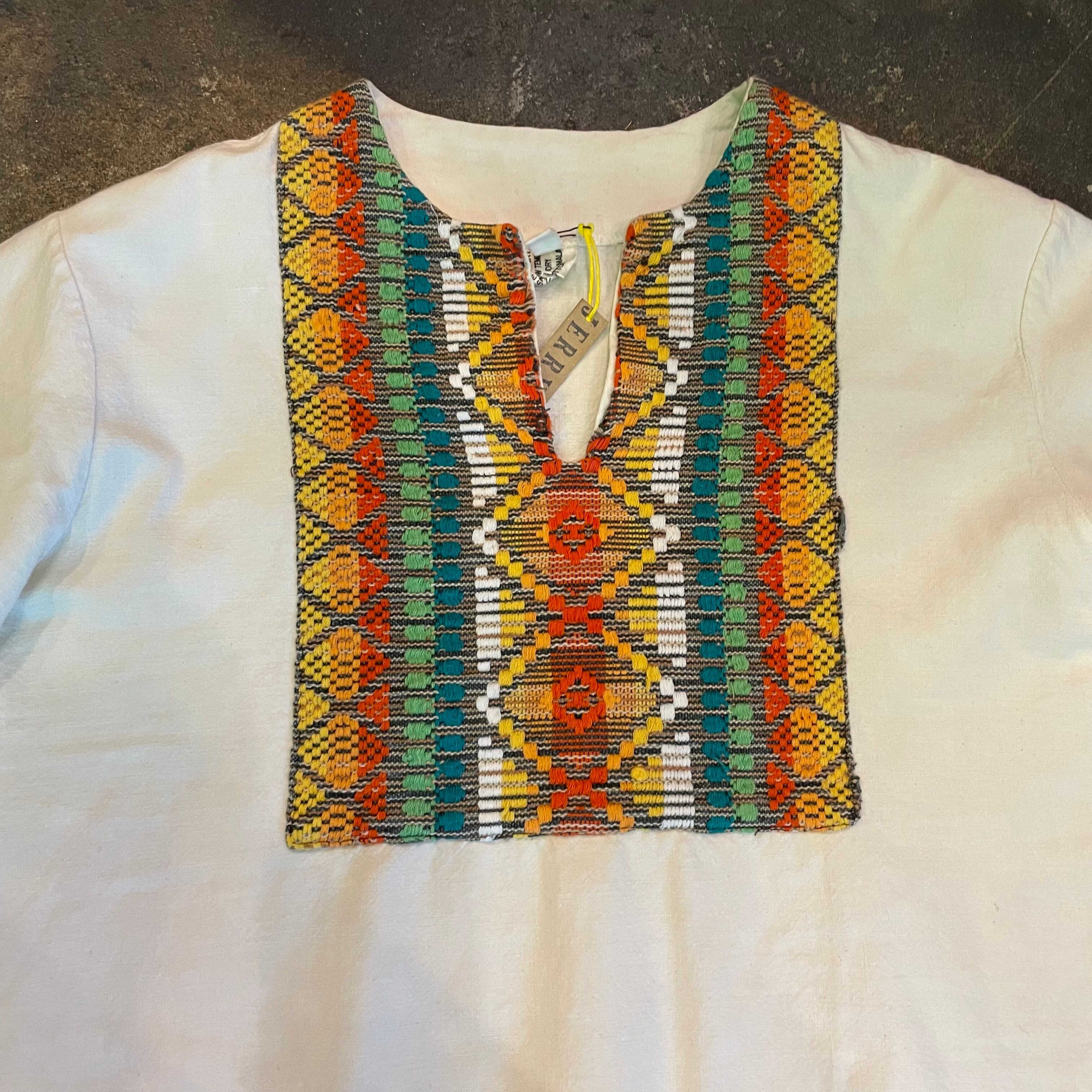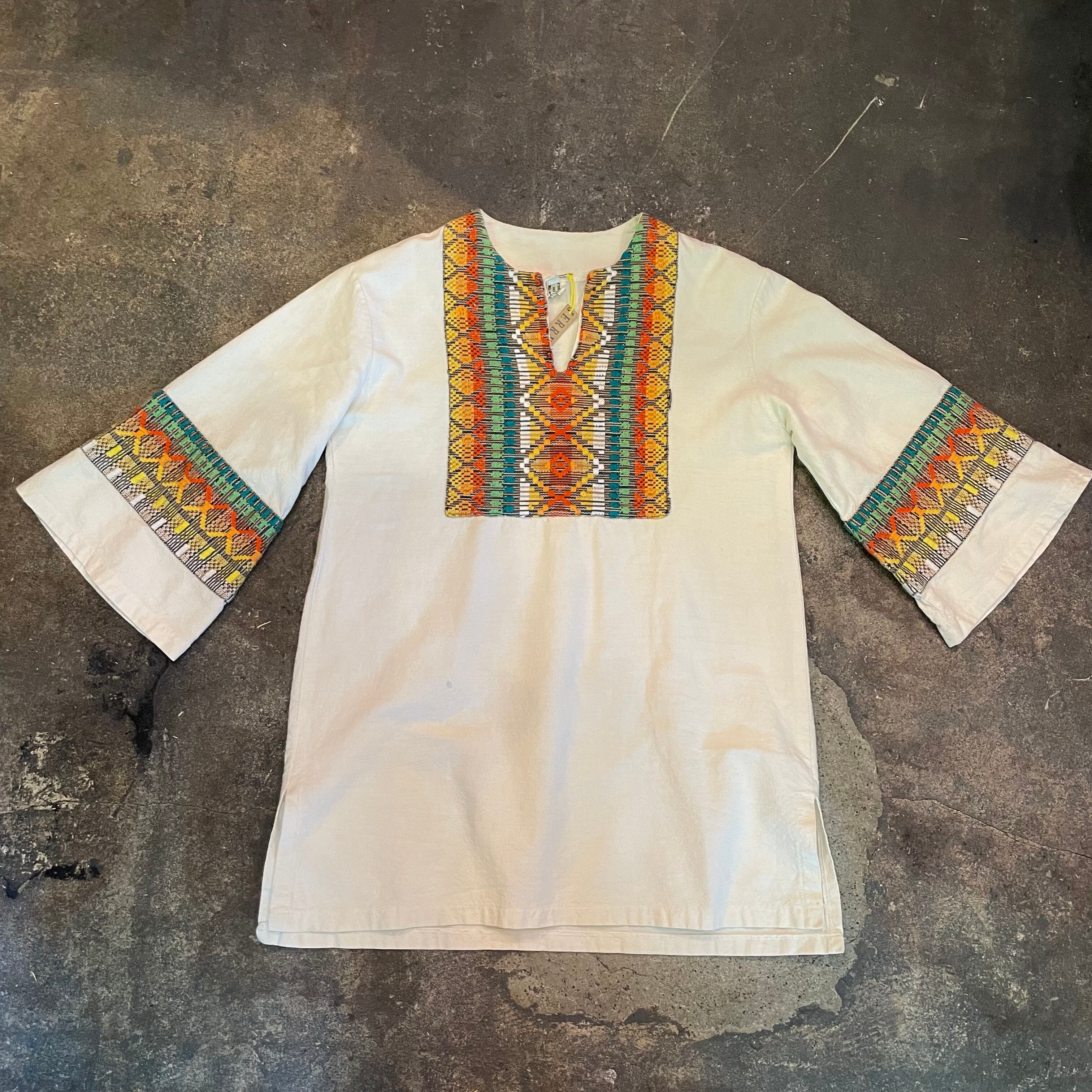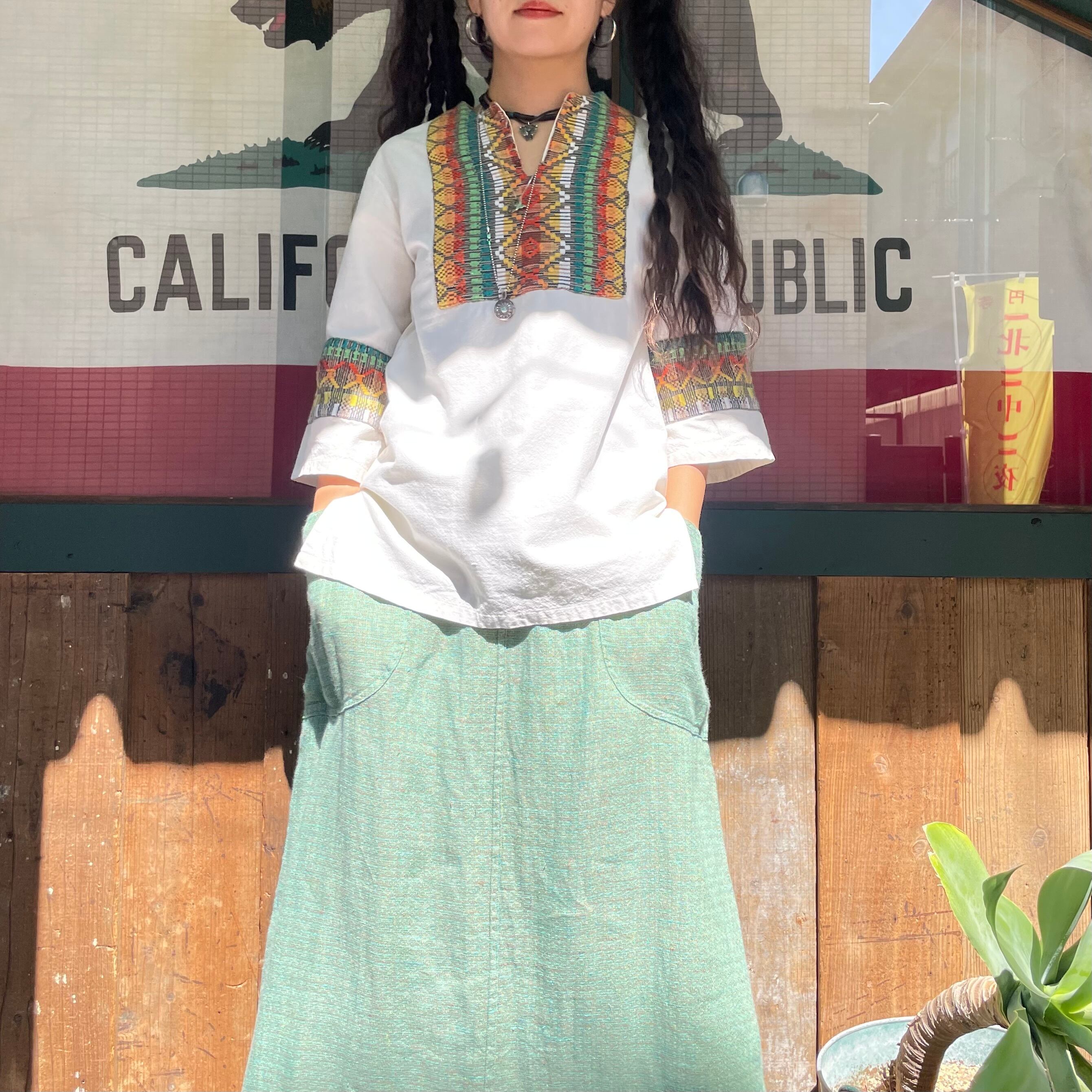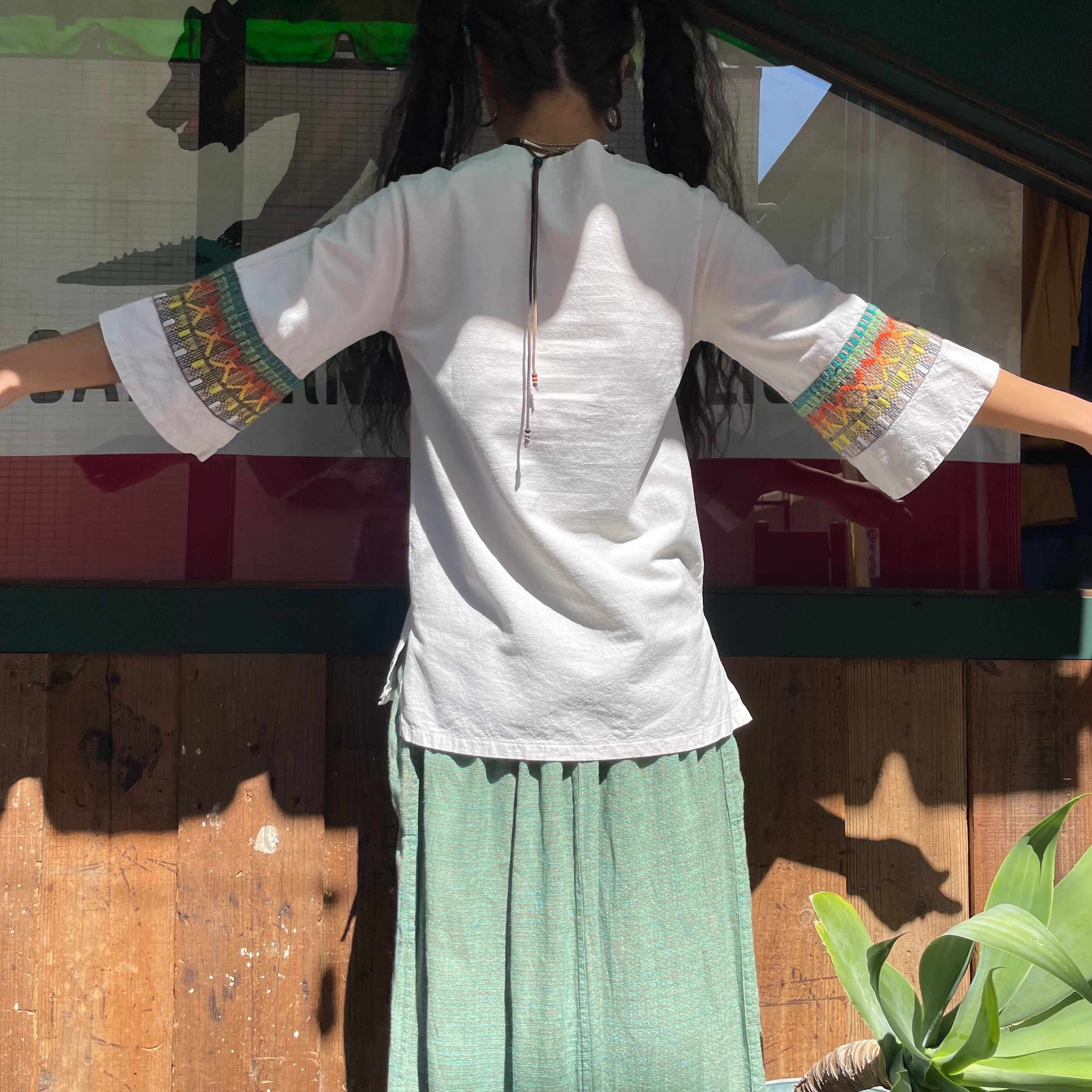 手織りの模様と色味が素敵なグアテマラのトップスです。7部袖でフレアスリーブなところもかわいいですね。コットン素材ですので真夏にも涼しく着られそうですし、中にラグランTシャツを重ねてチラ見せさせてもかわいいと思います。