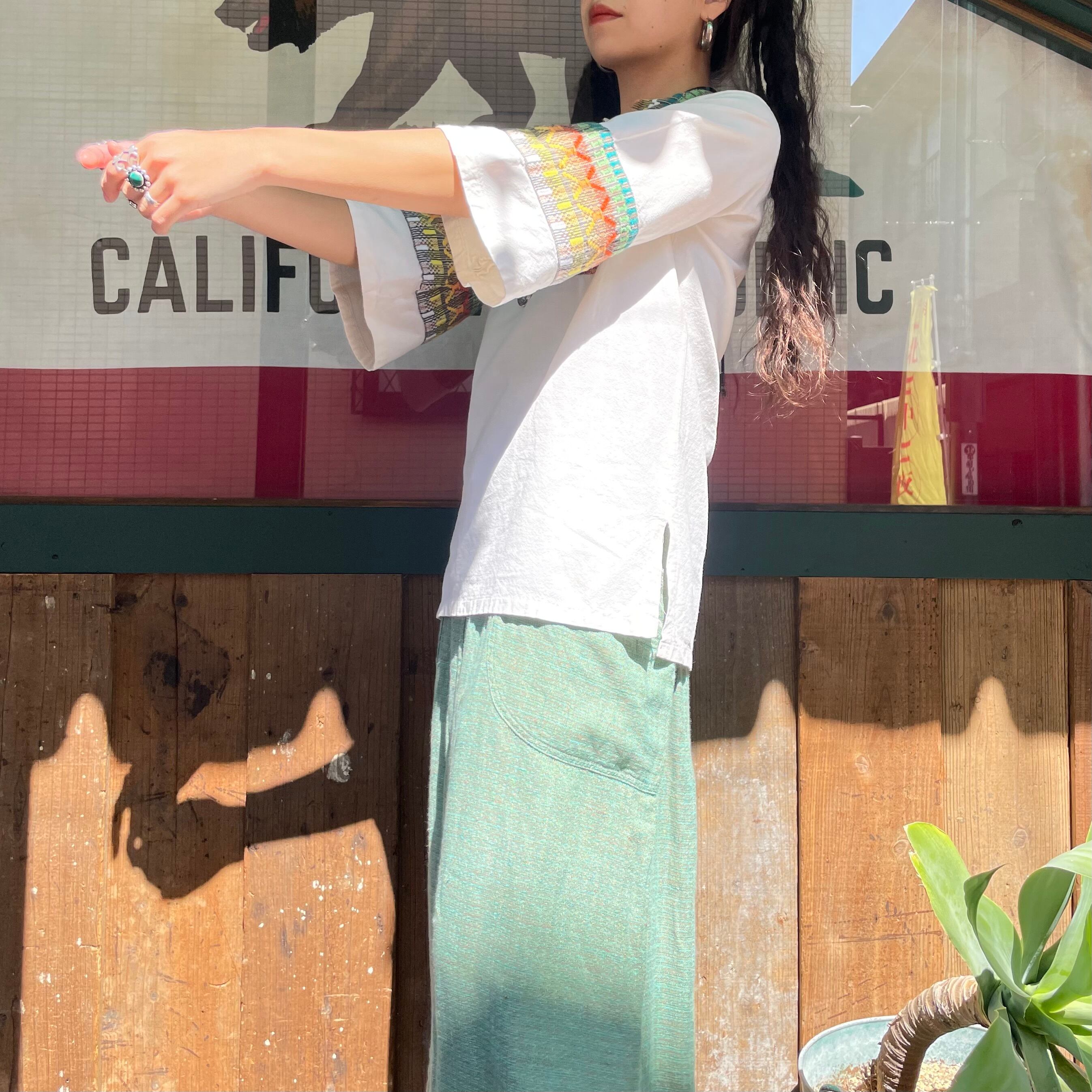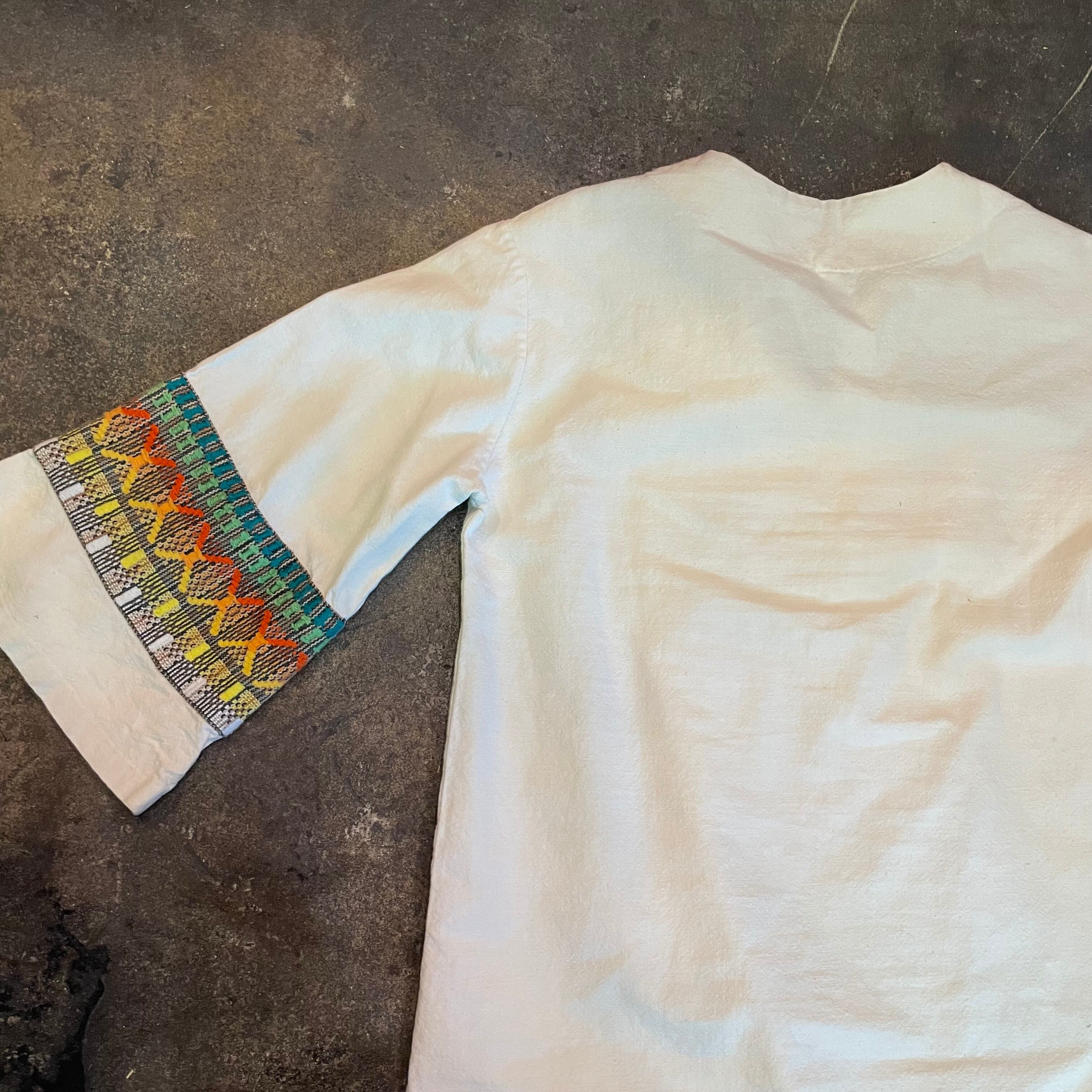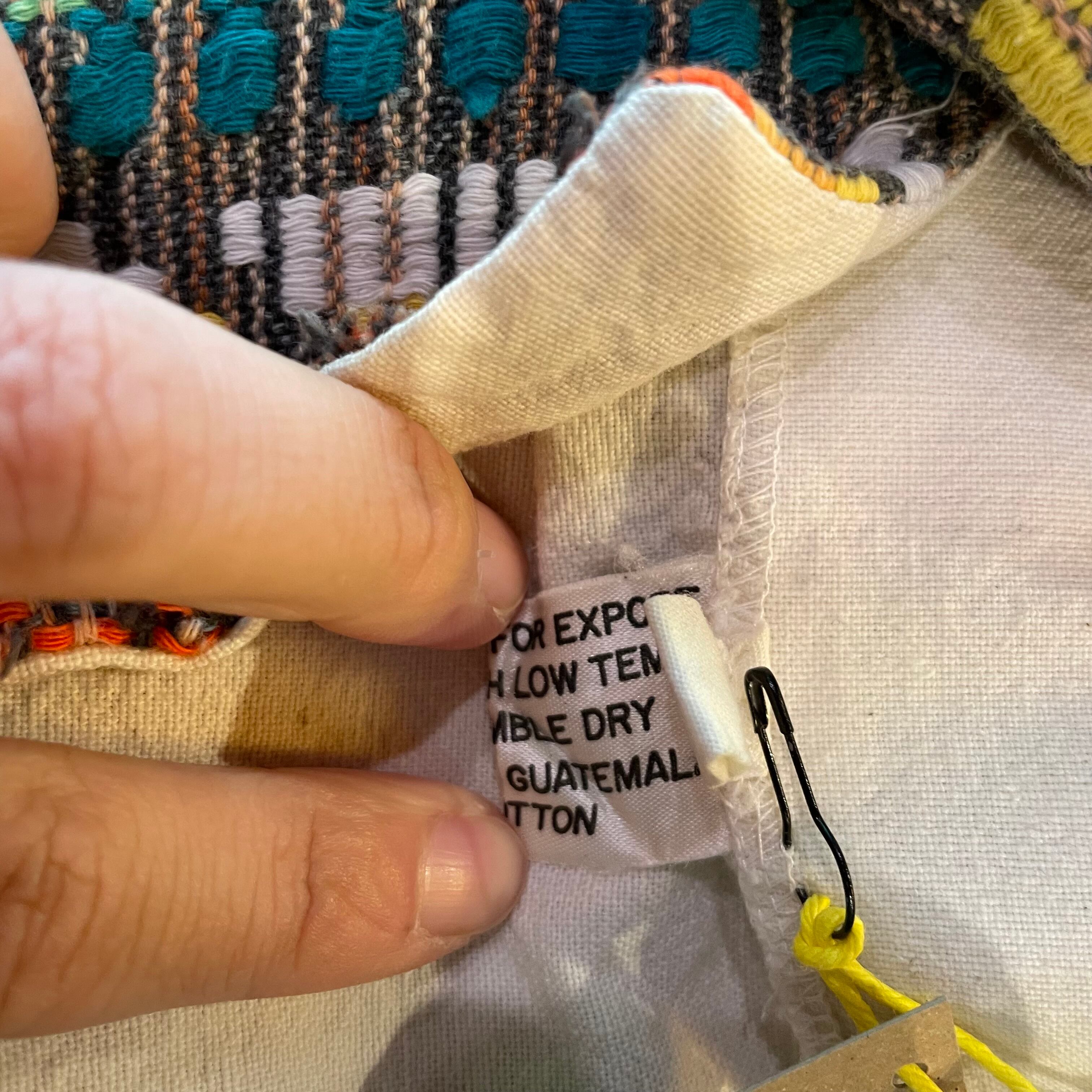 手織りの模様と色味が素敵なグアテマラのトップスです。7部袖でフレアスリーブなところもかわいいですね。コットン素材ですので真夏にも涼しく着られそうですし、中にラグランTシャツを重ねてチラ見せさせてもかわいいと思います。