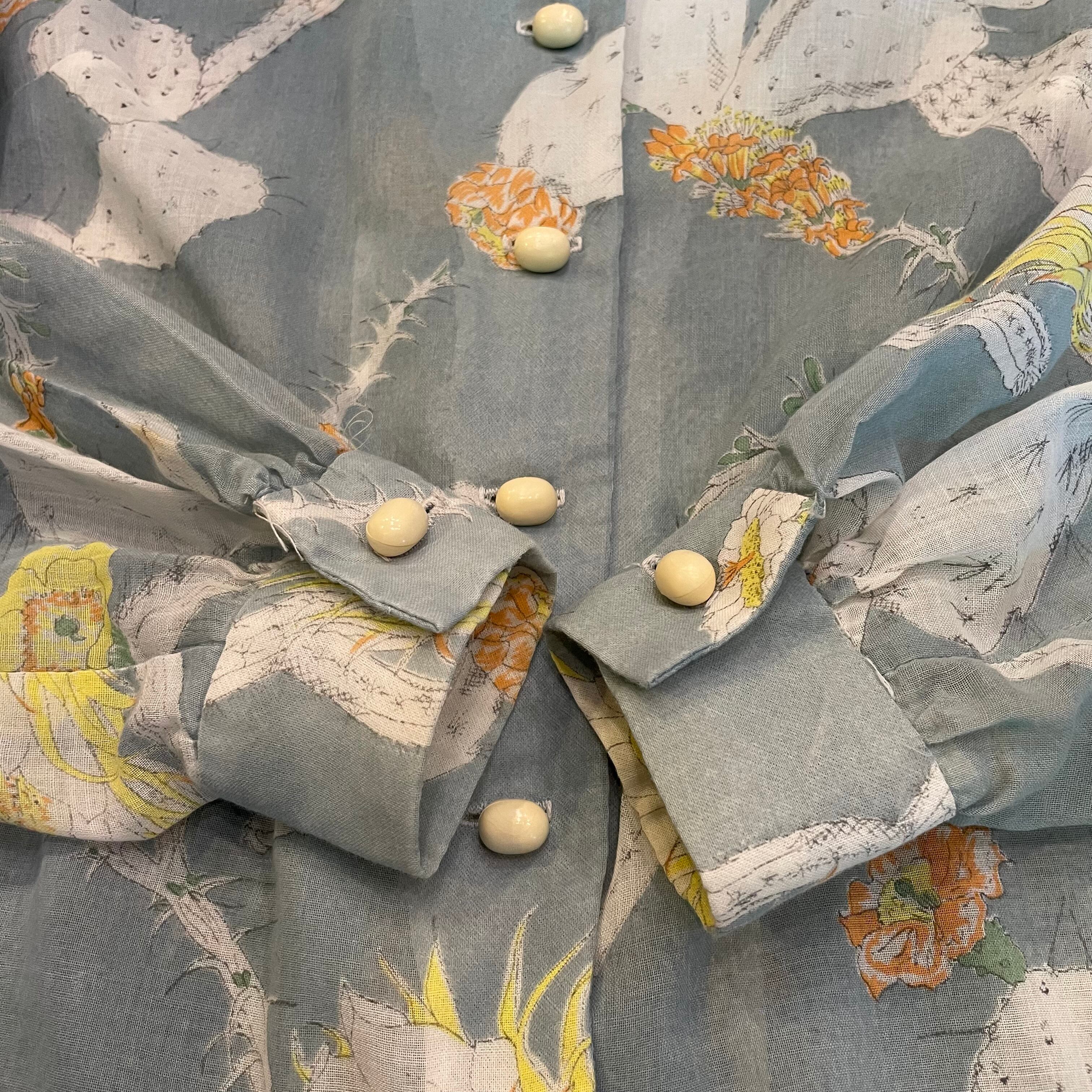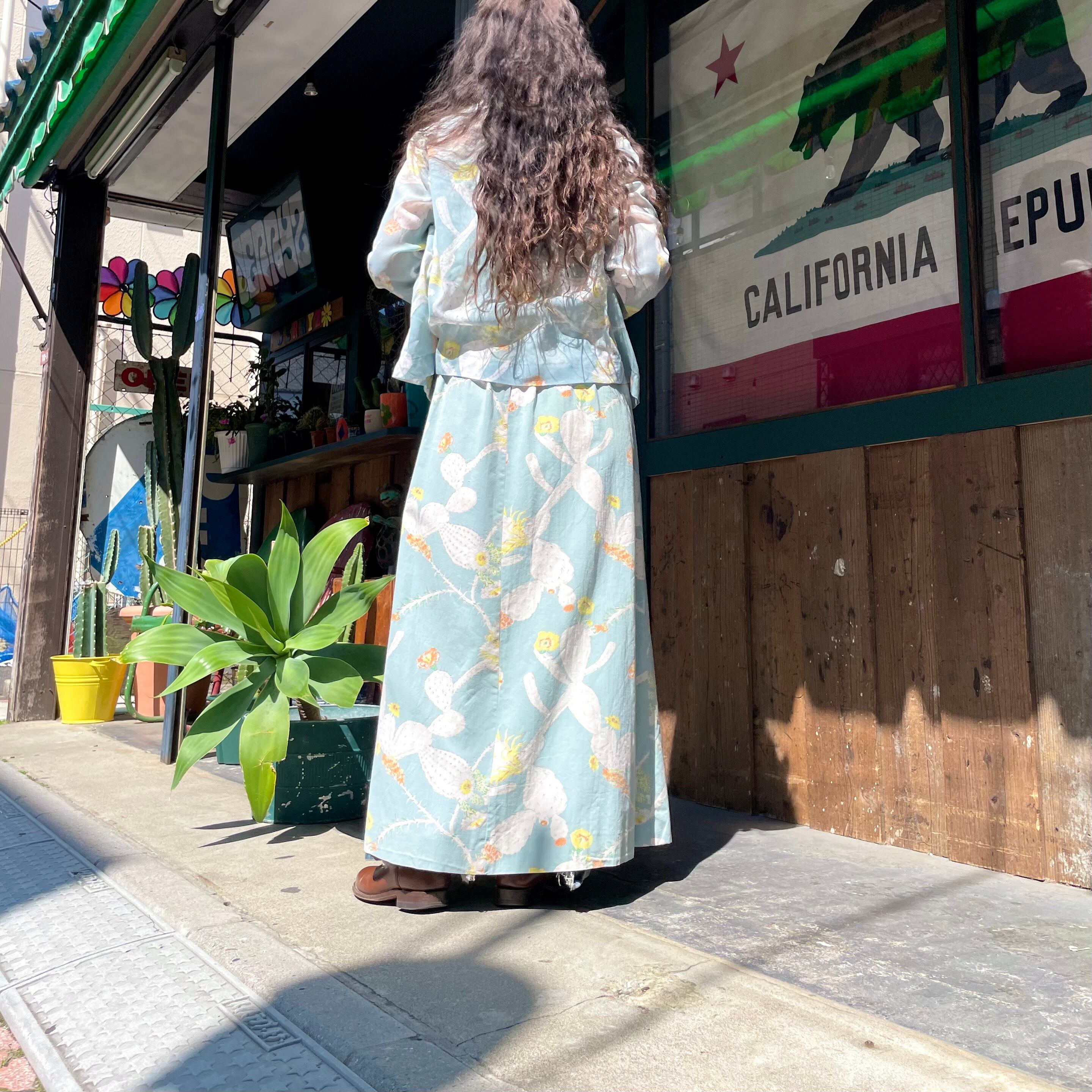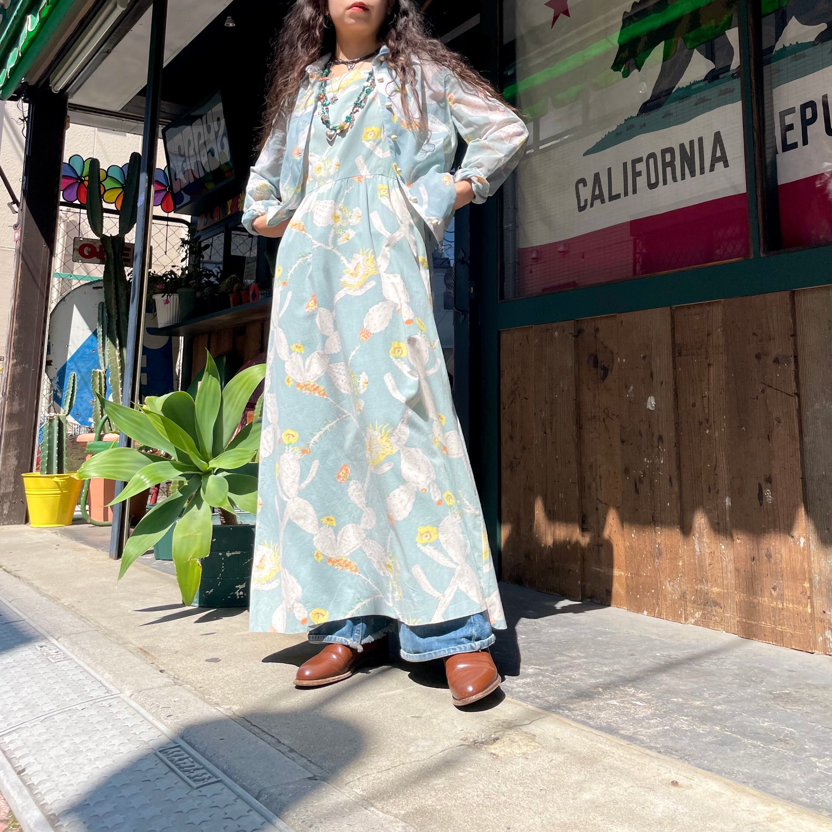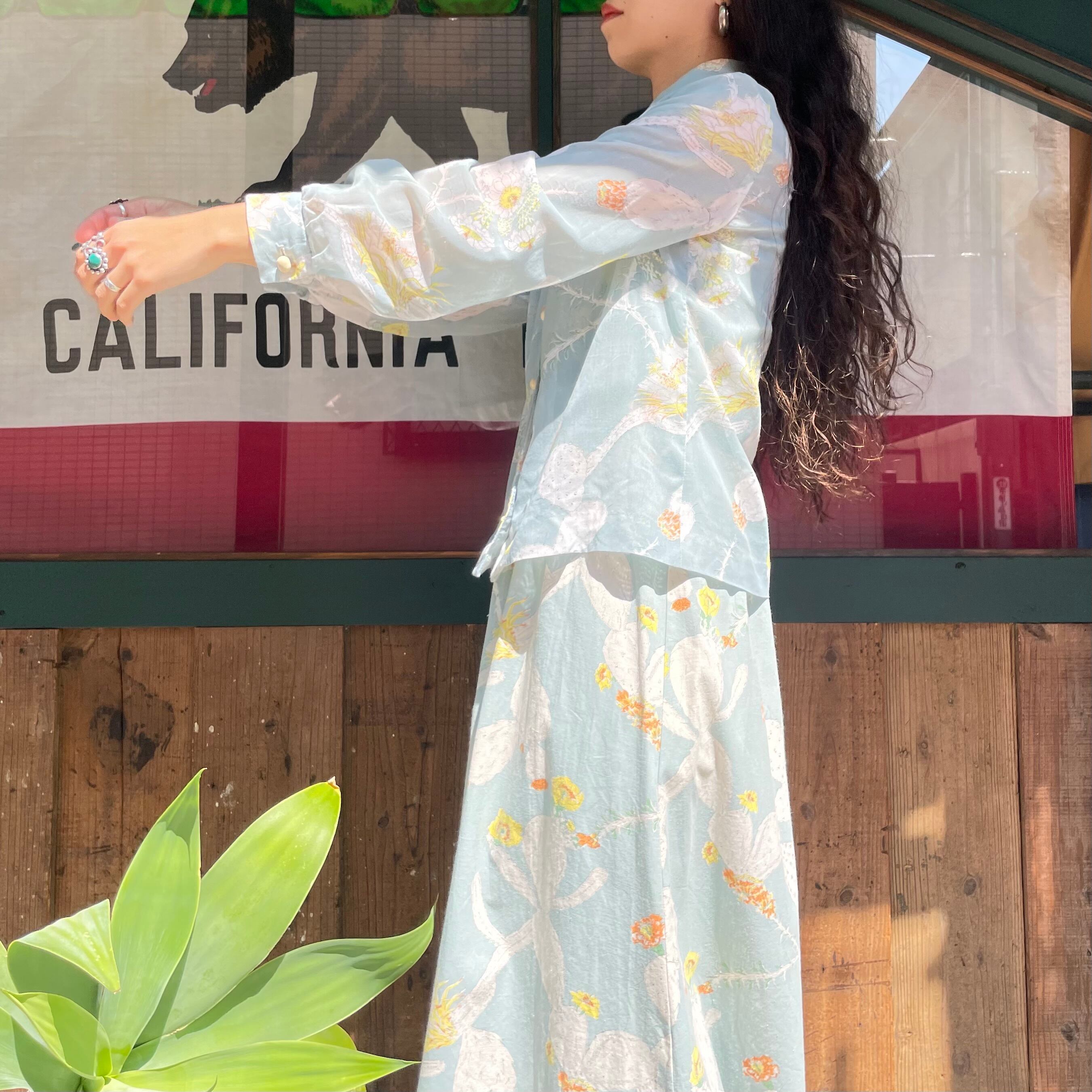 淡い霞んだ水色ベースにお花の咲いているサボテンの柄がとても素敵な70年代ごろのセットアップです。