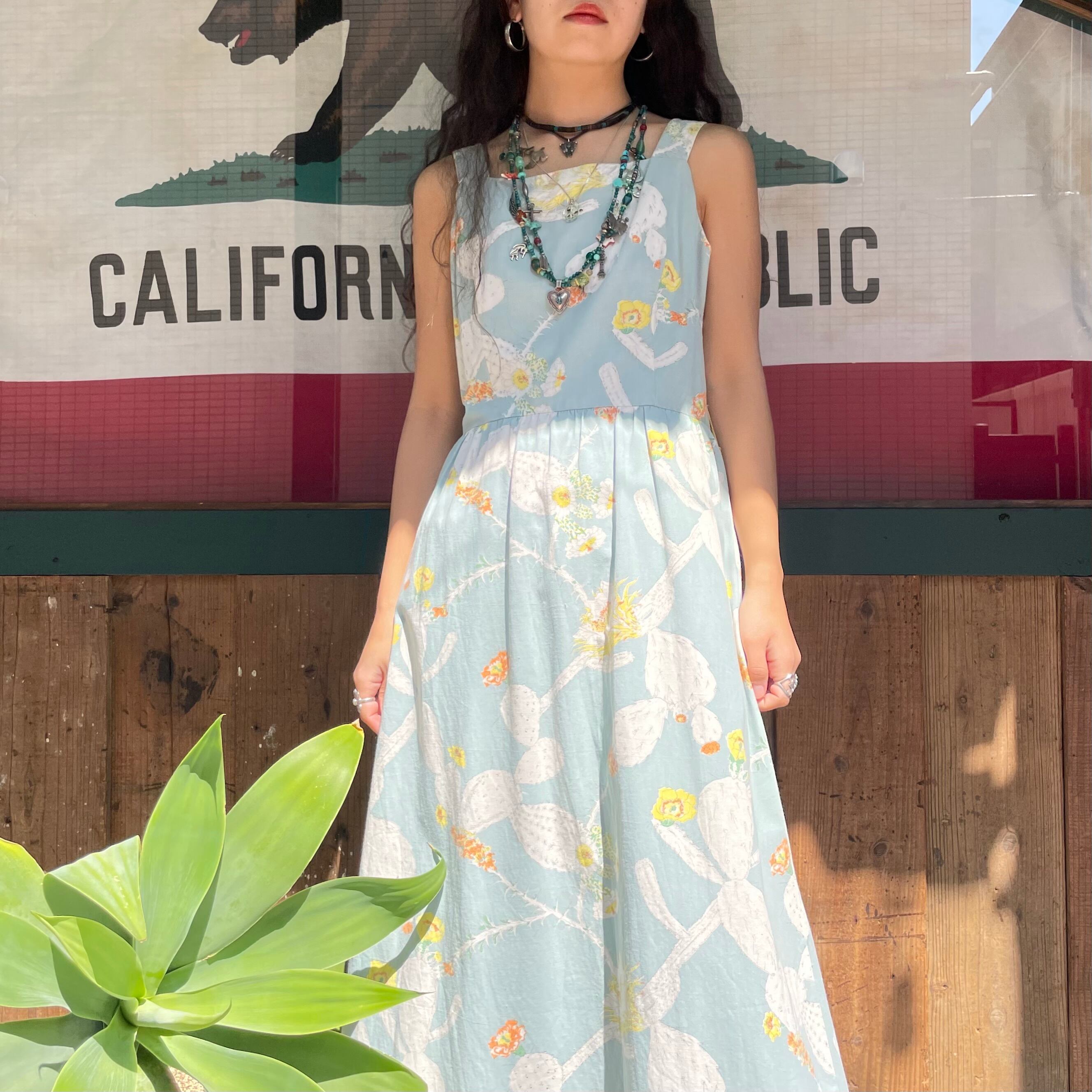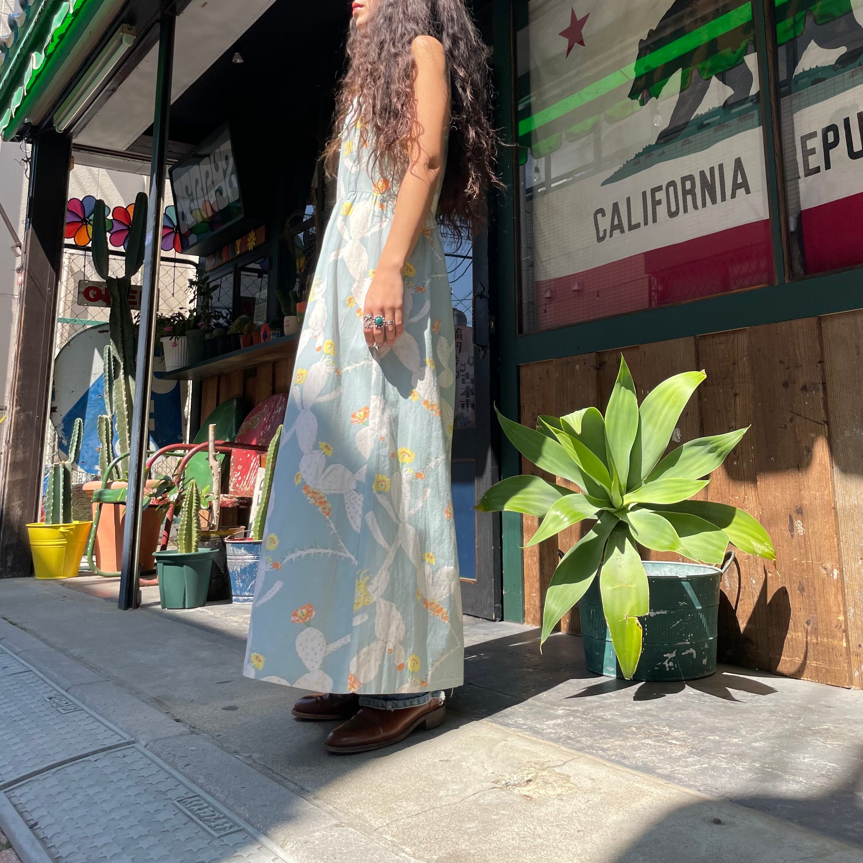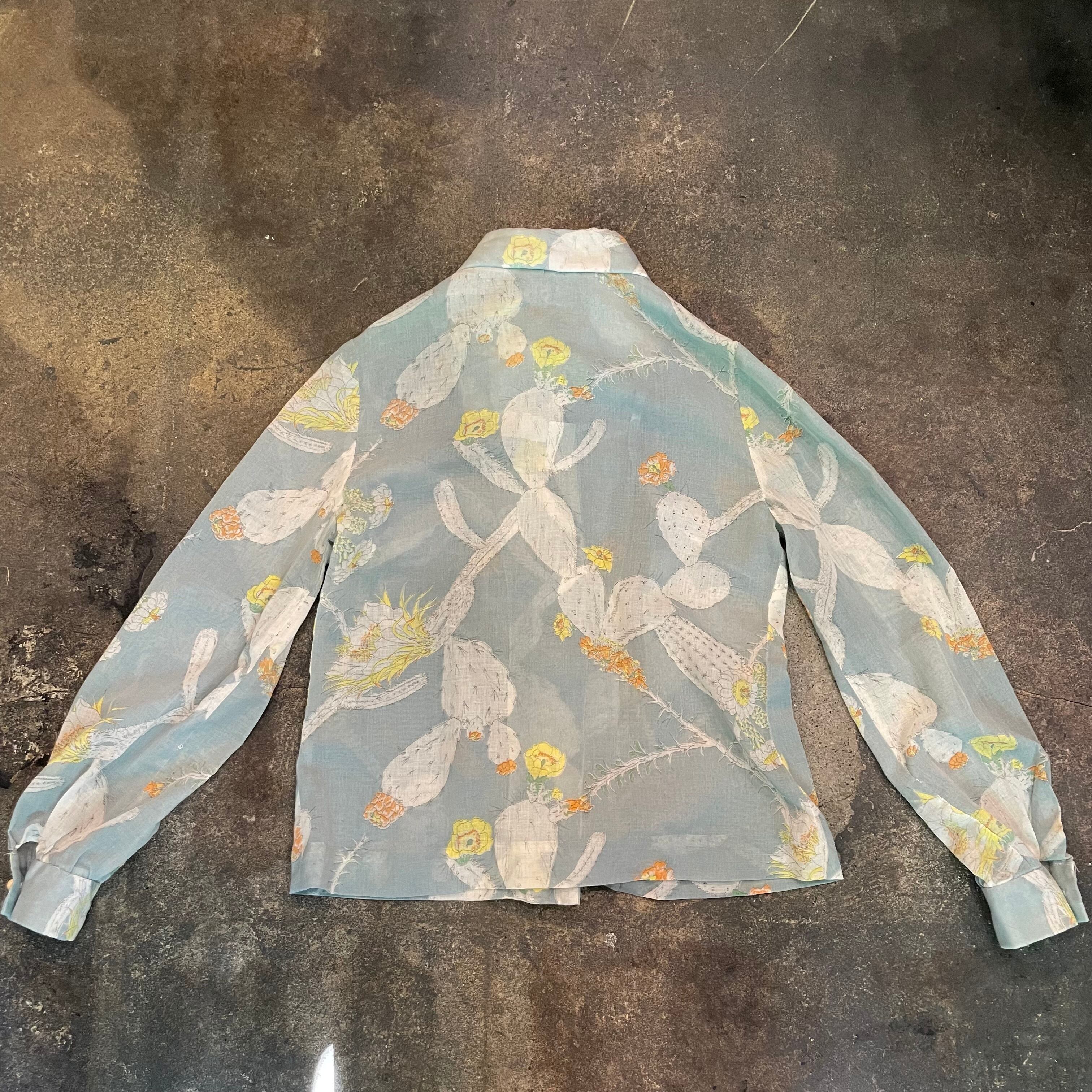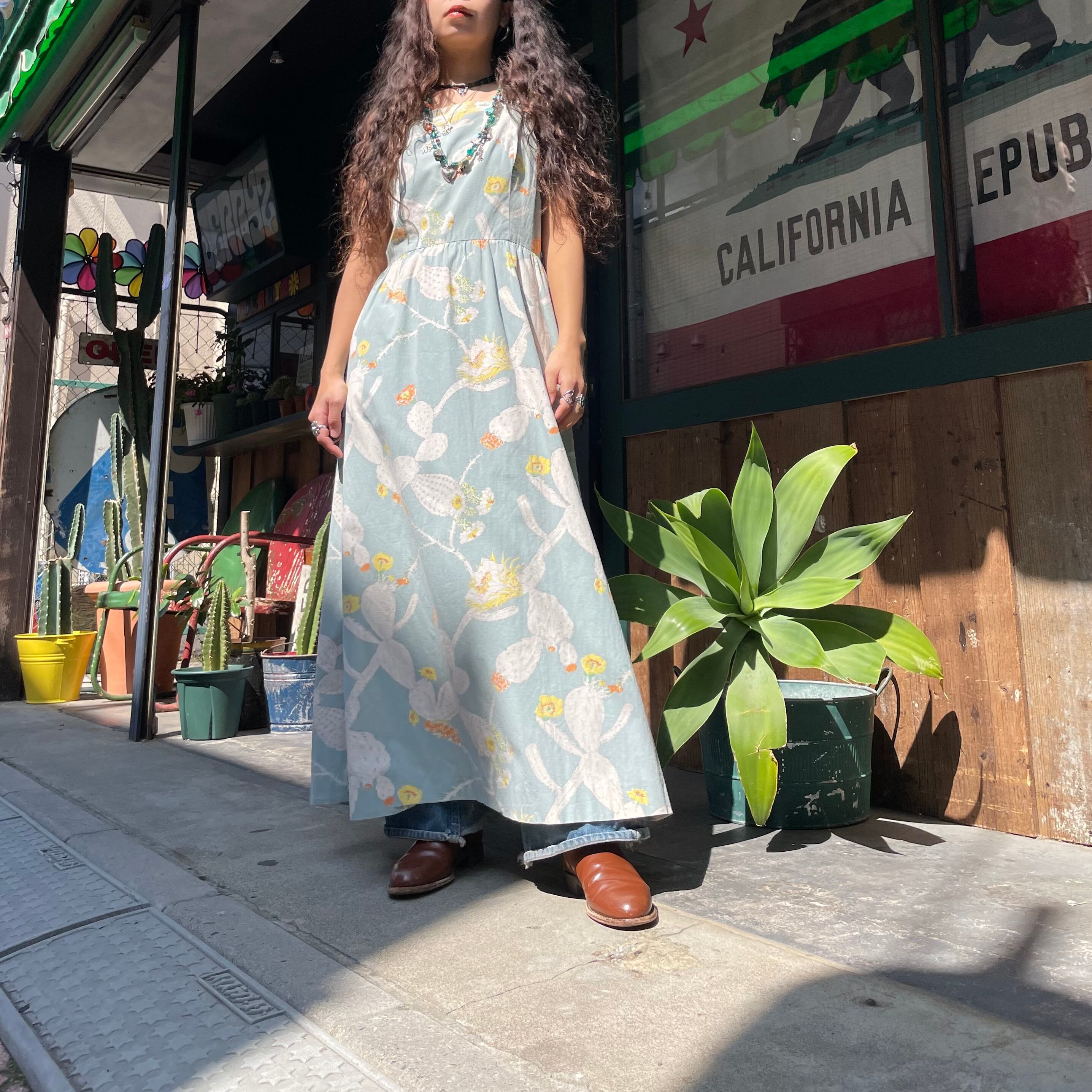 淡い霞んだ水色ベースにお花の咲いているサボテンの柄がとても素敵な70年代ごろのセットアップです。
