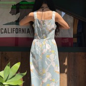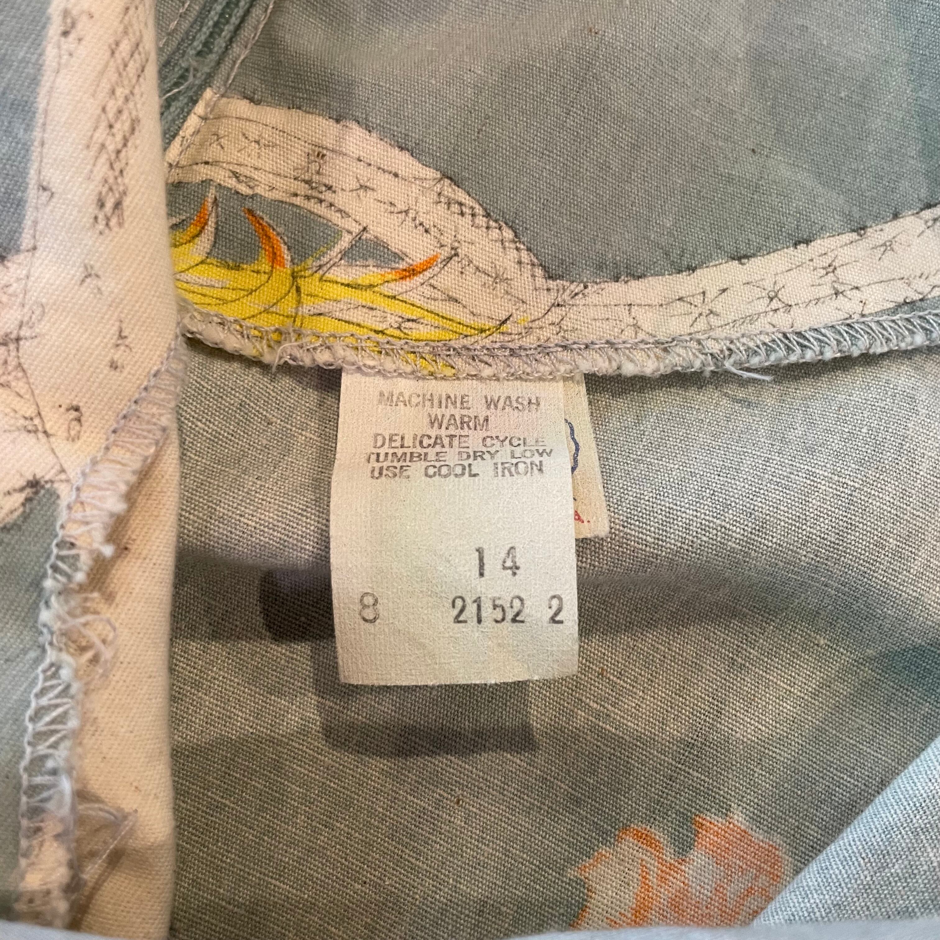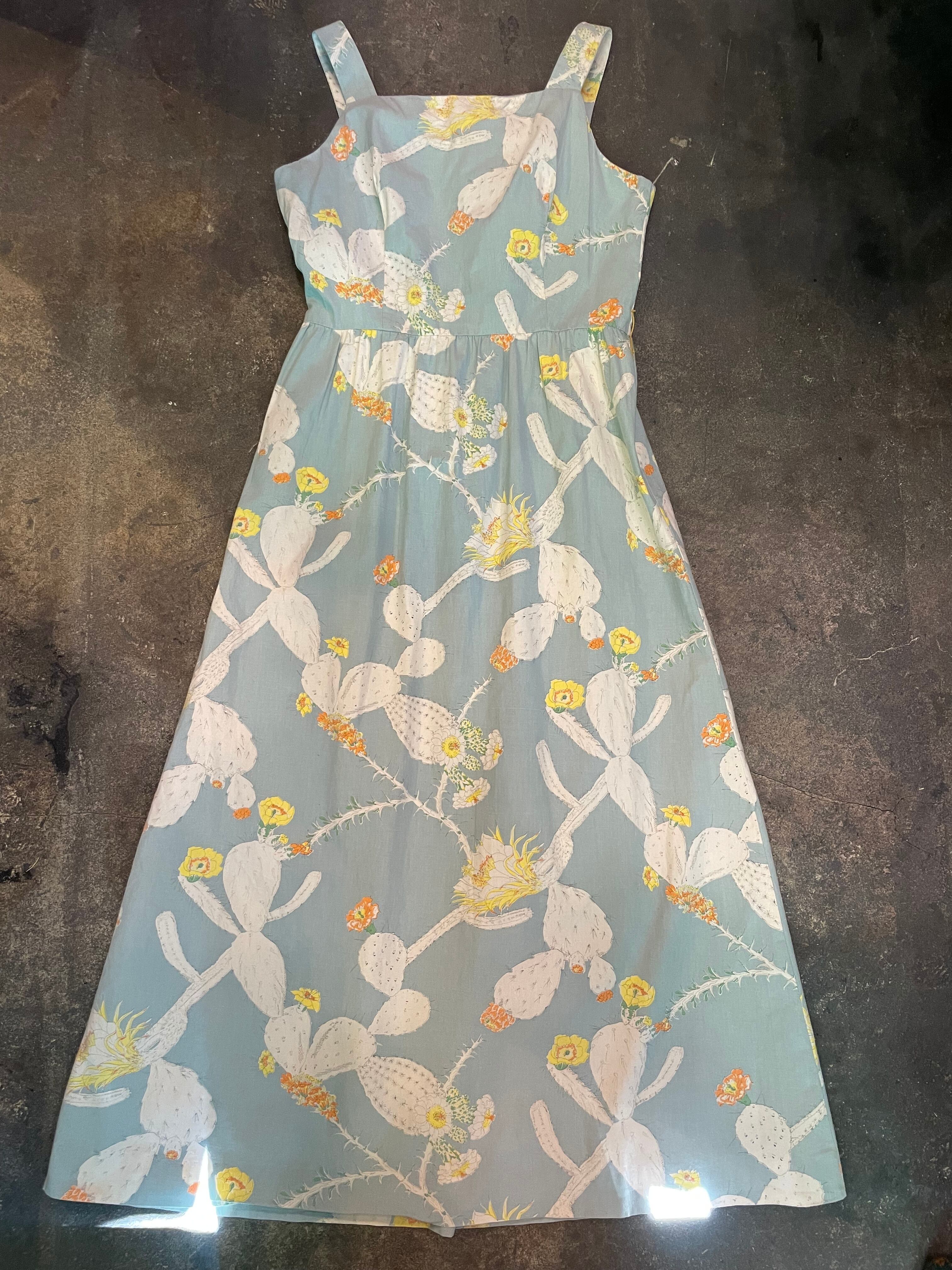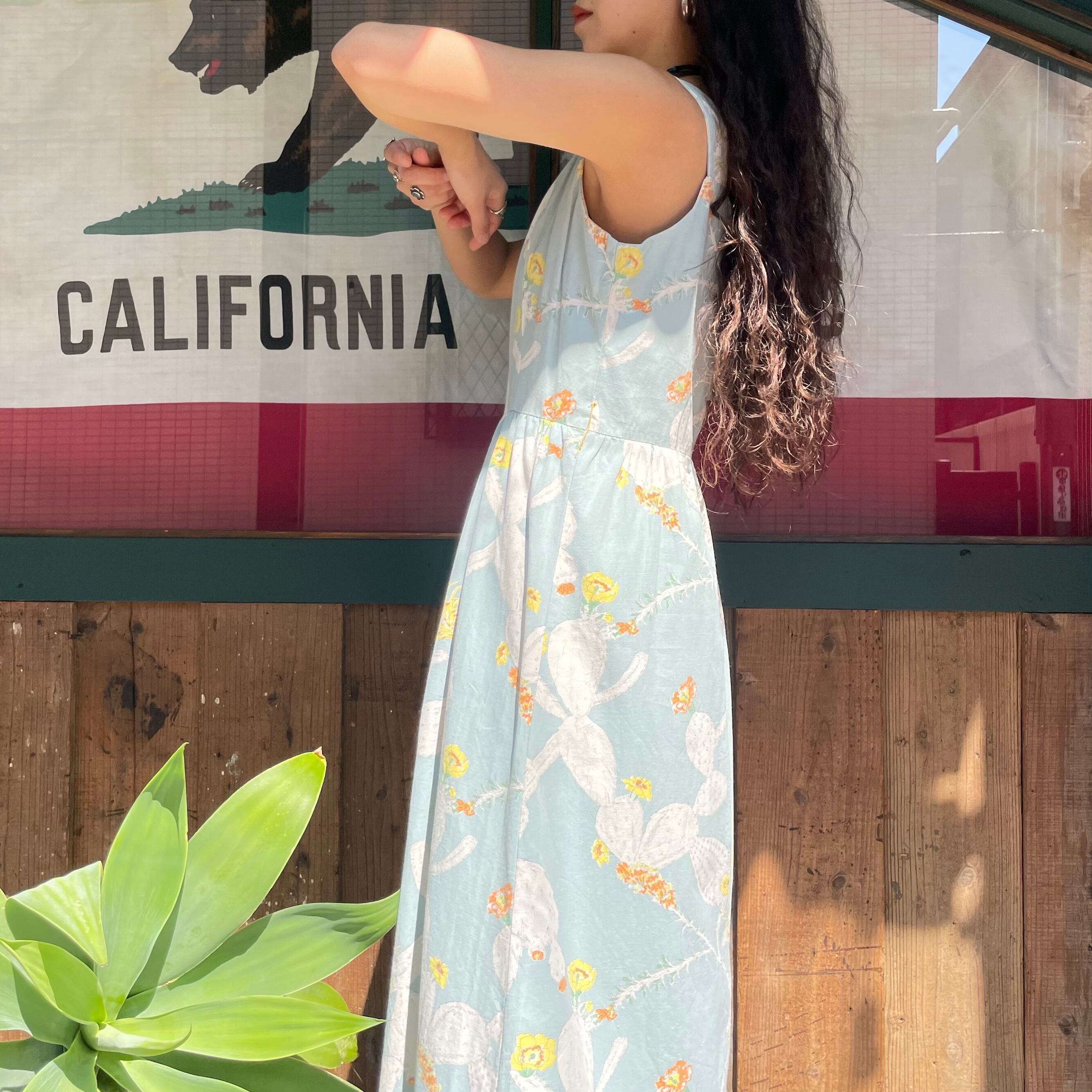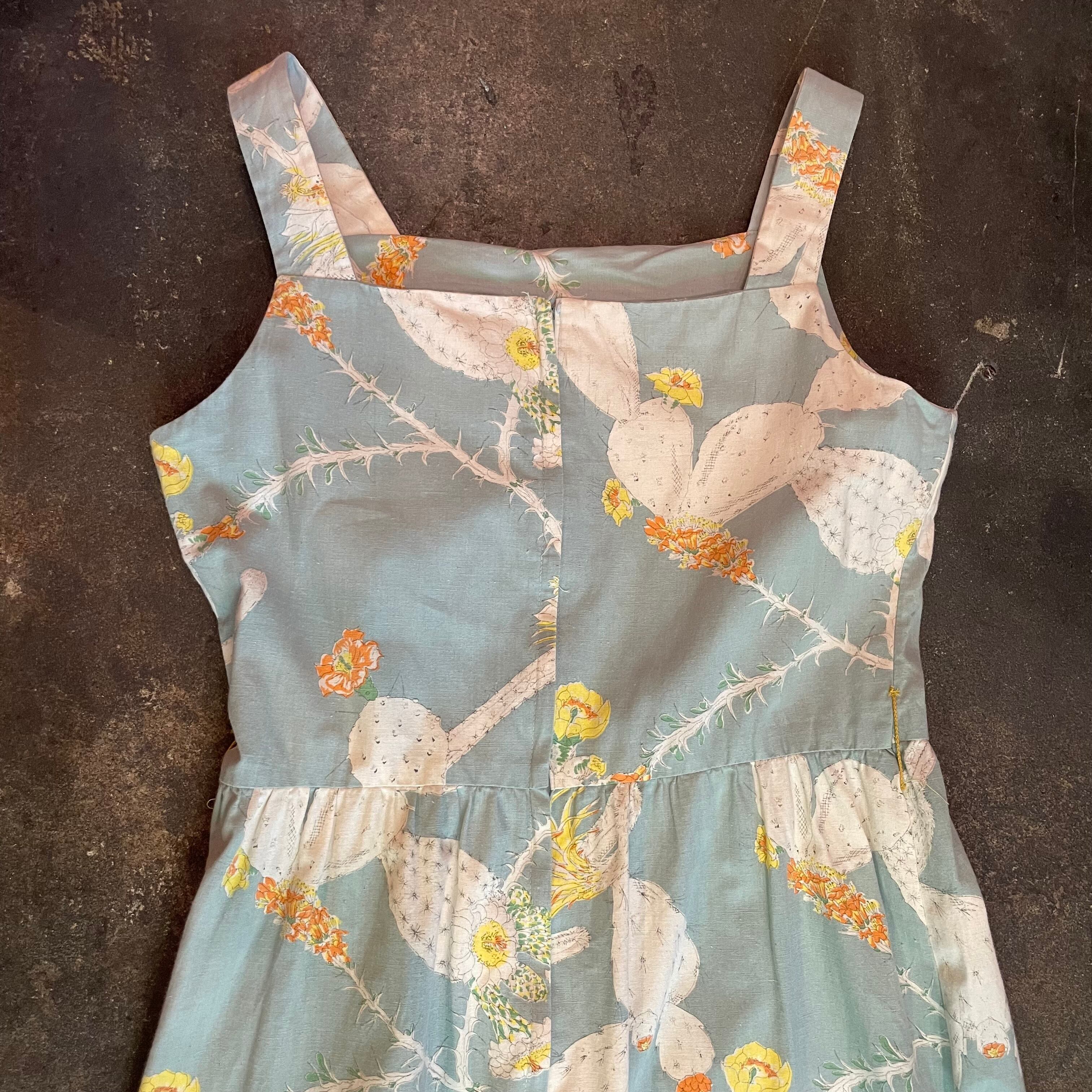 淡い霞んだ水色ベースにお花の咲いているサボテンの柄がとても素敵な70年代ごろのセットアップです。