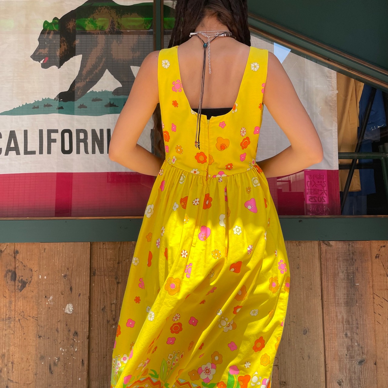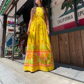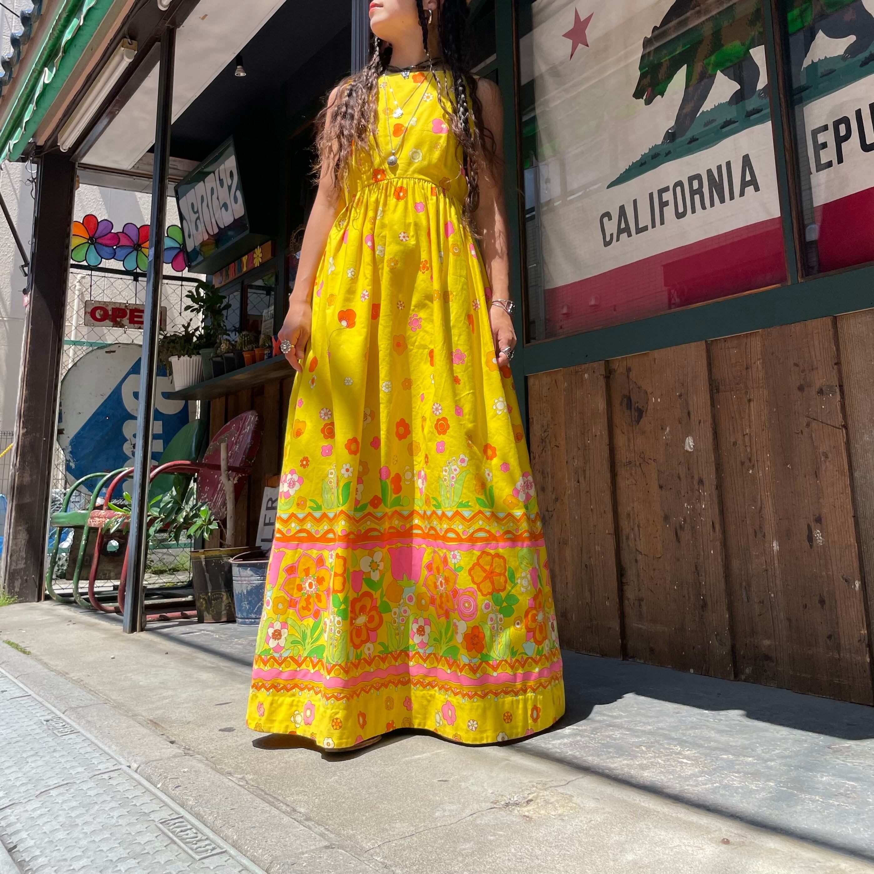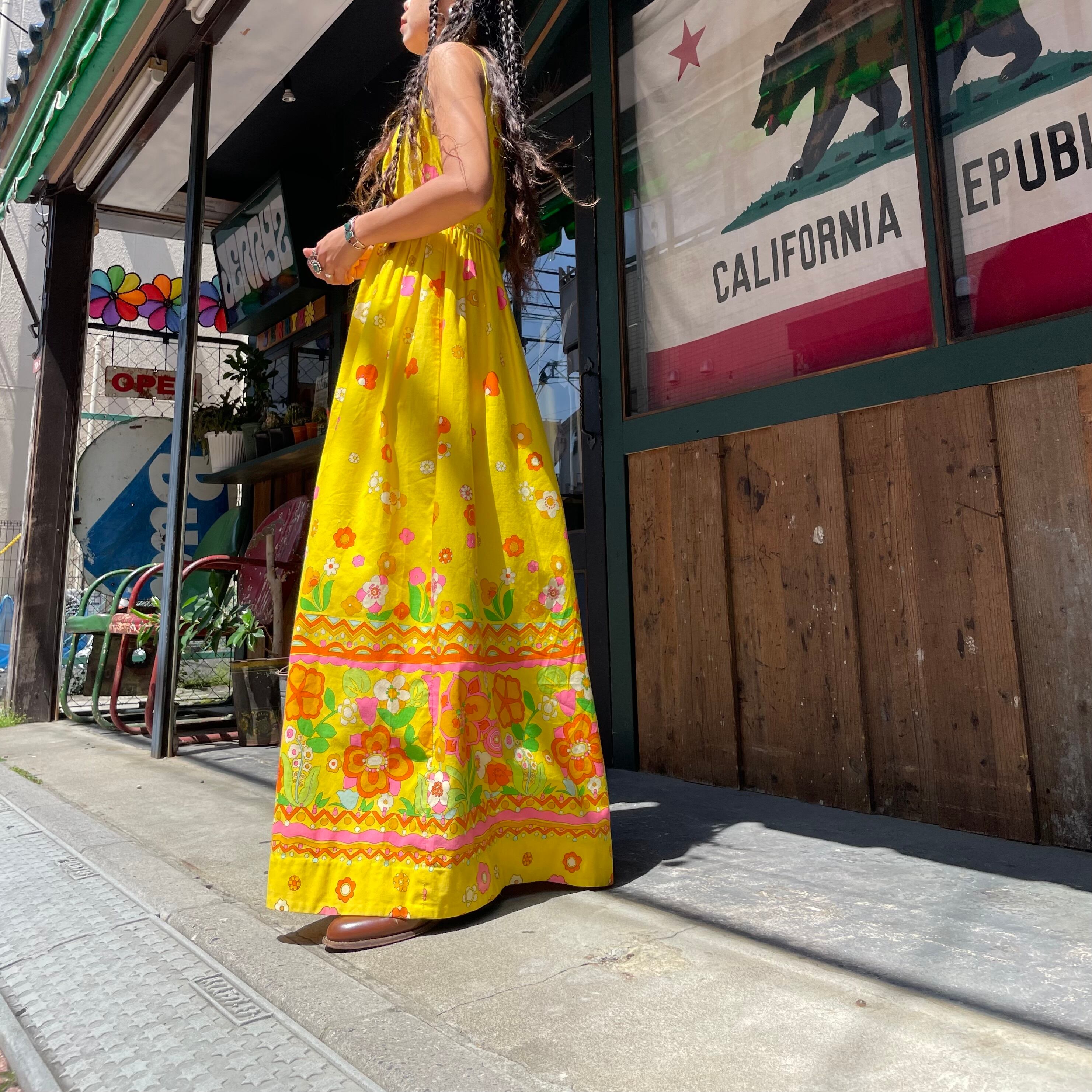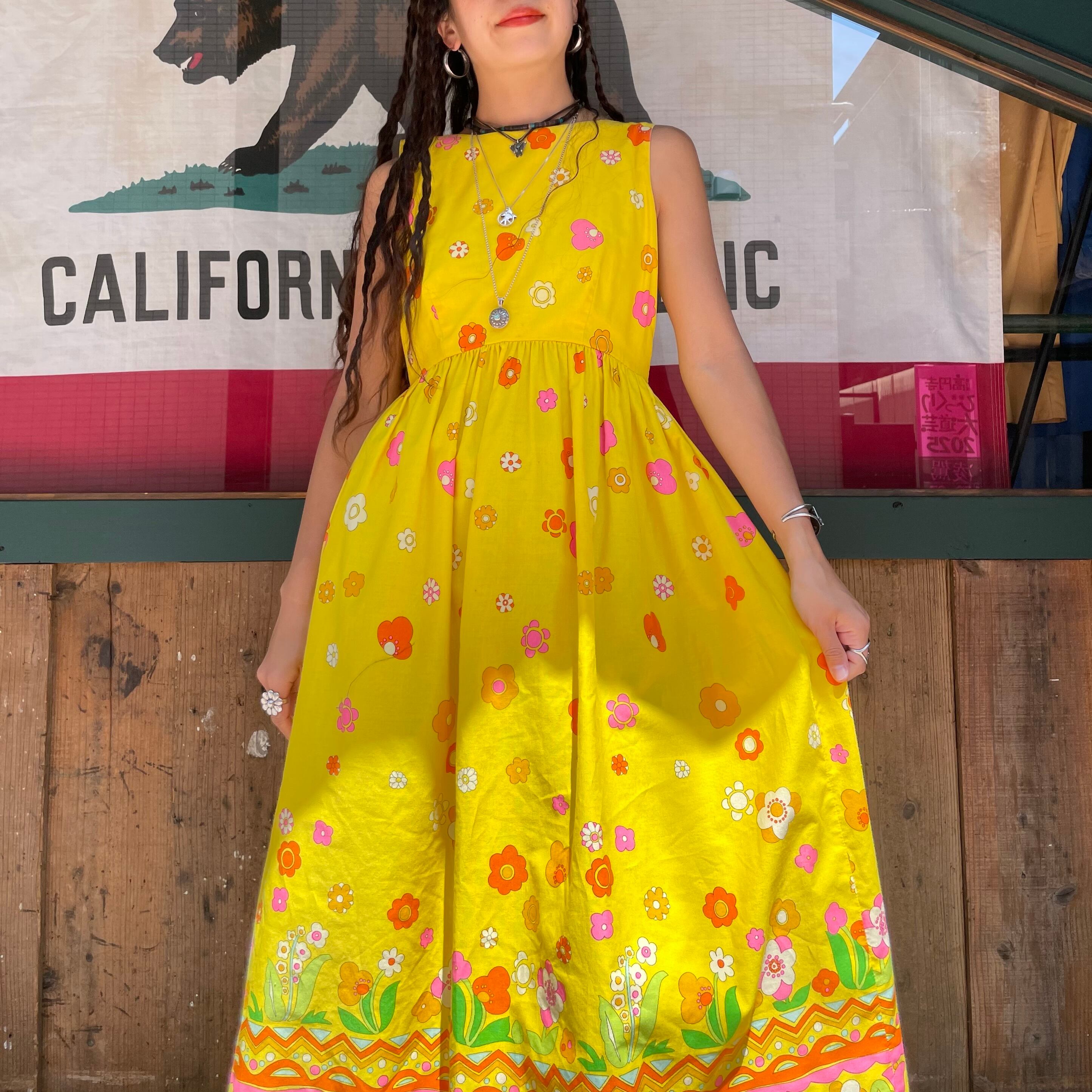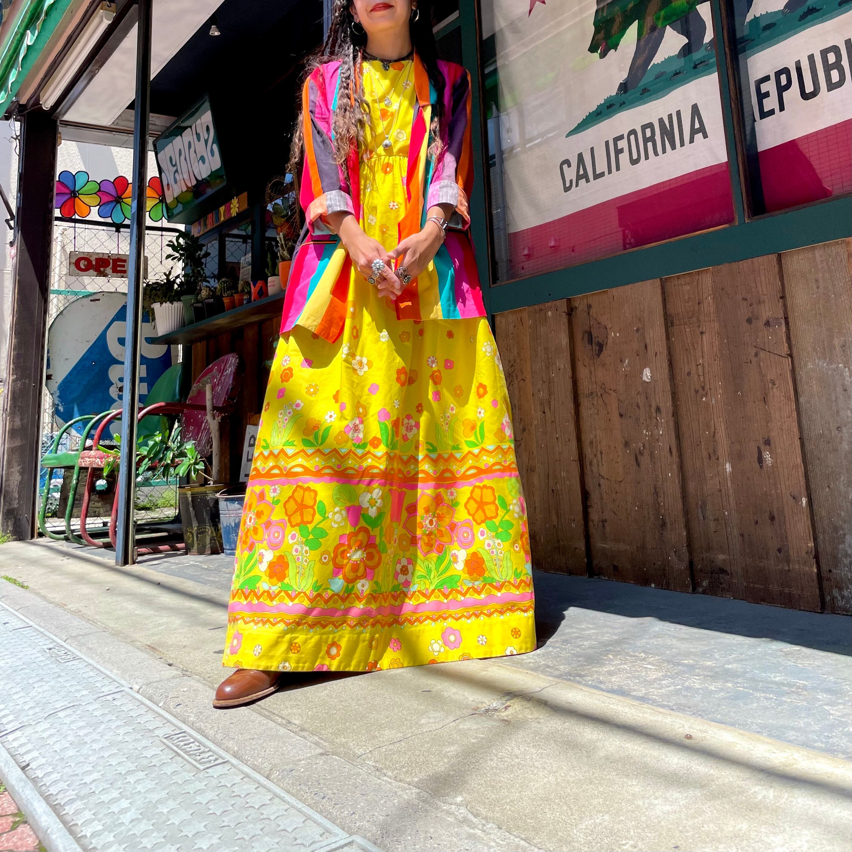 ハッピーなイエローベースにピーターマックスのような雰囲気のサイケデリックな花柄がとてもかわいい70年代頃のワンピースです。