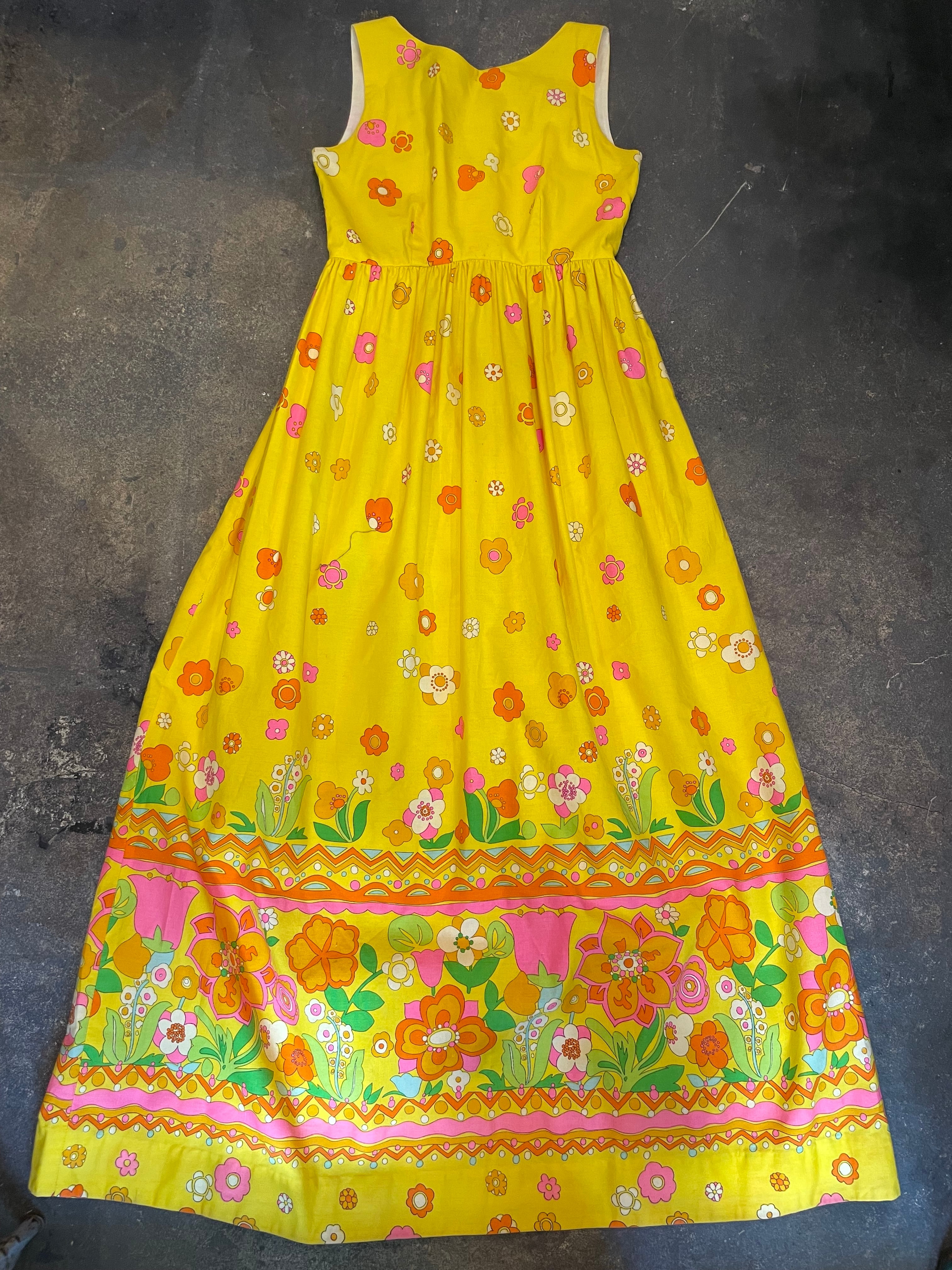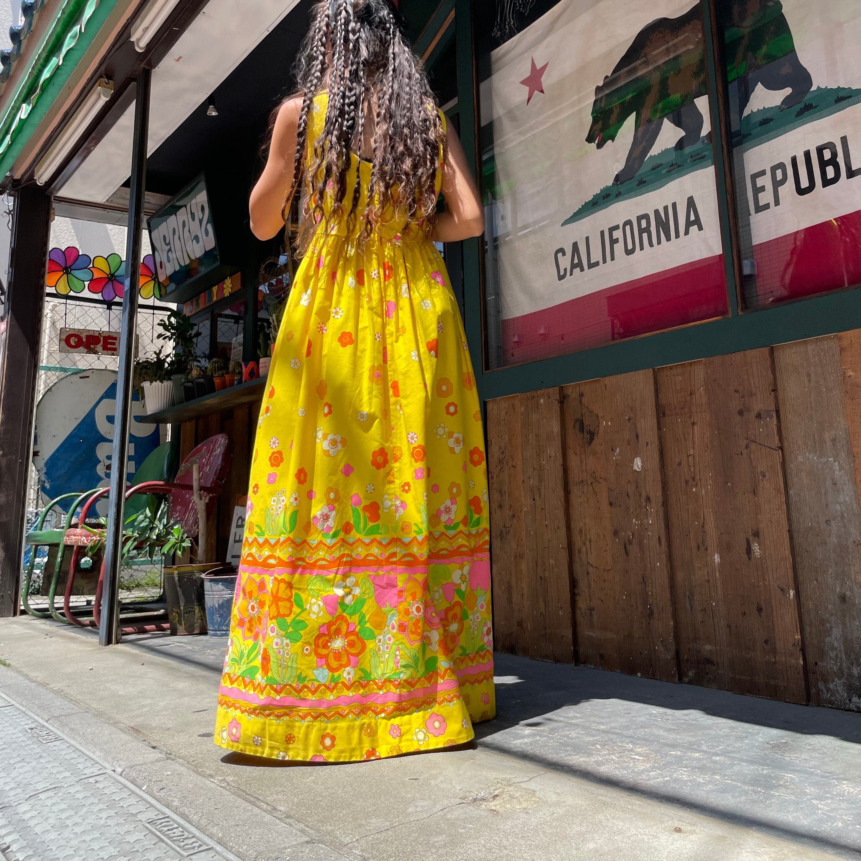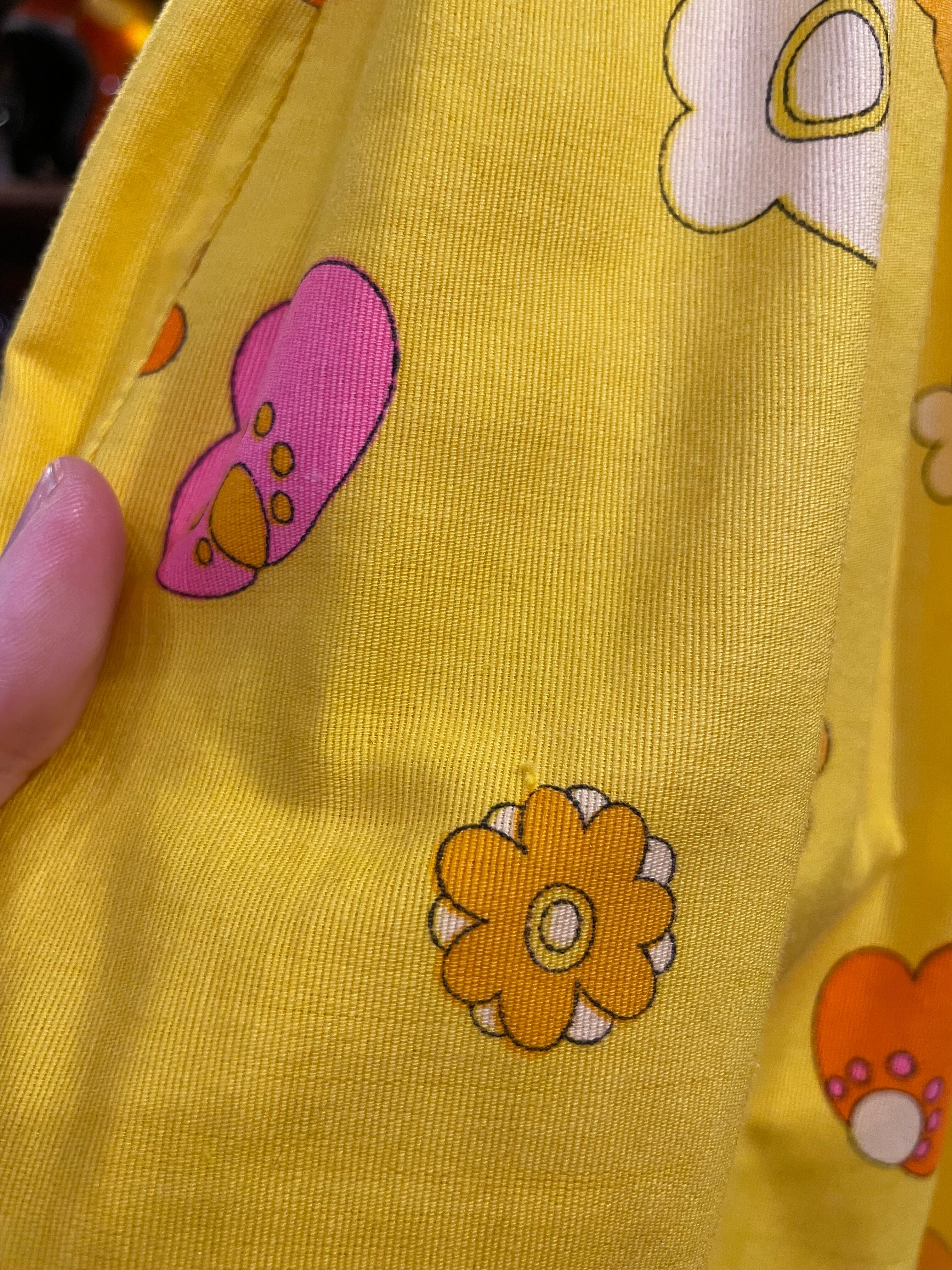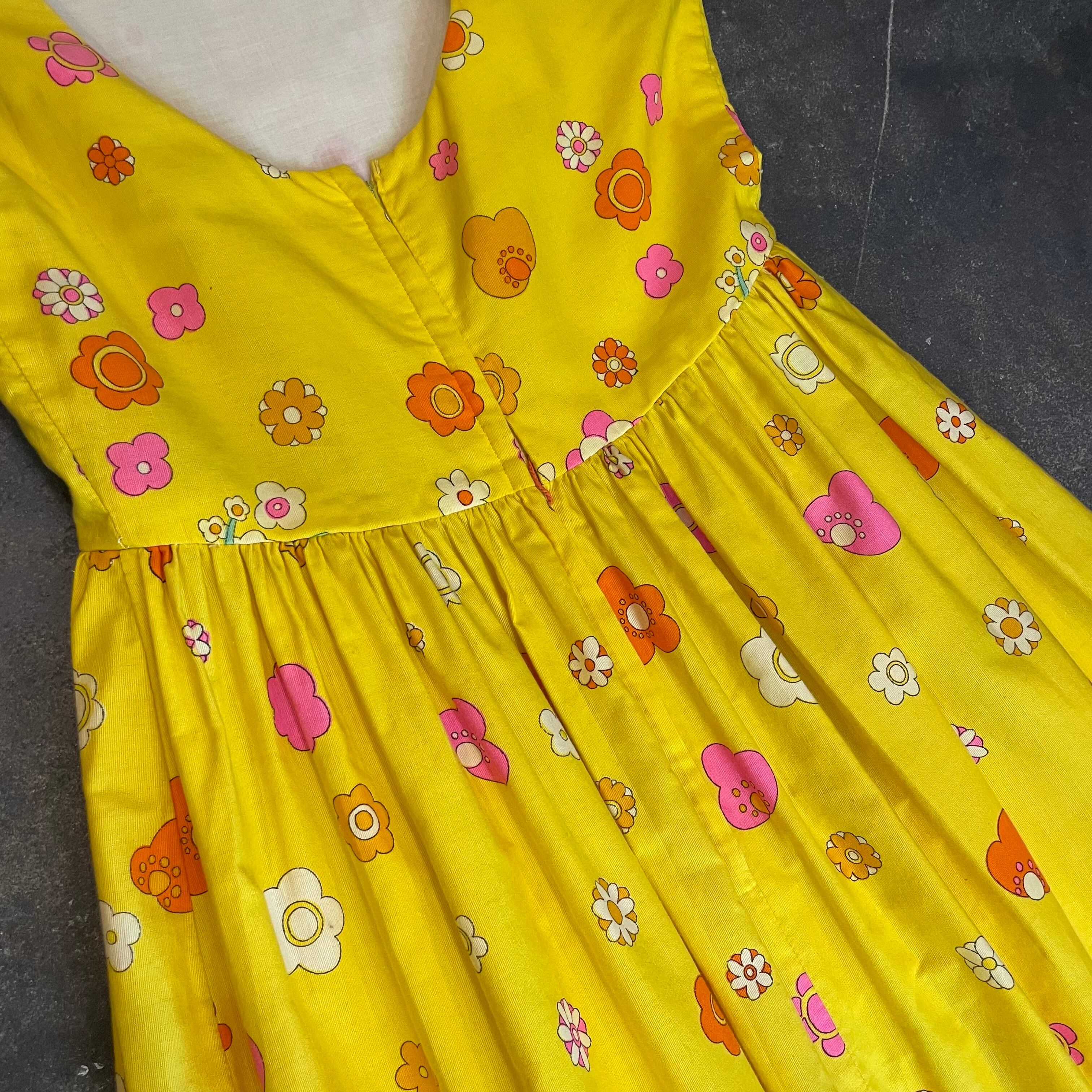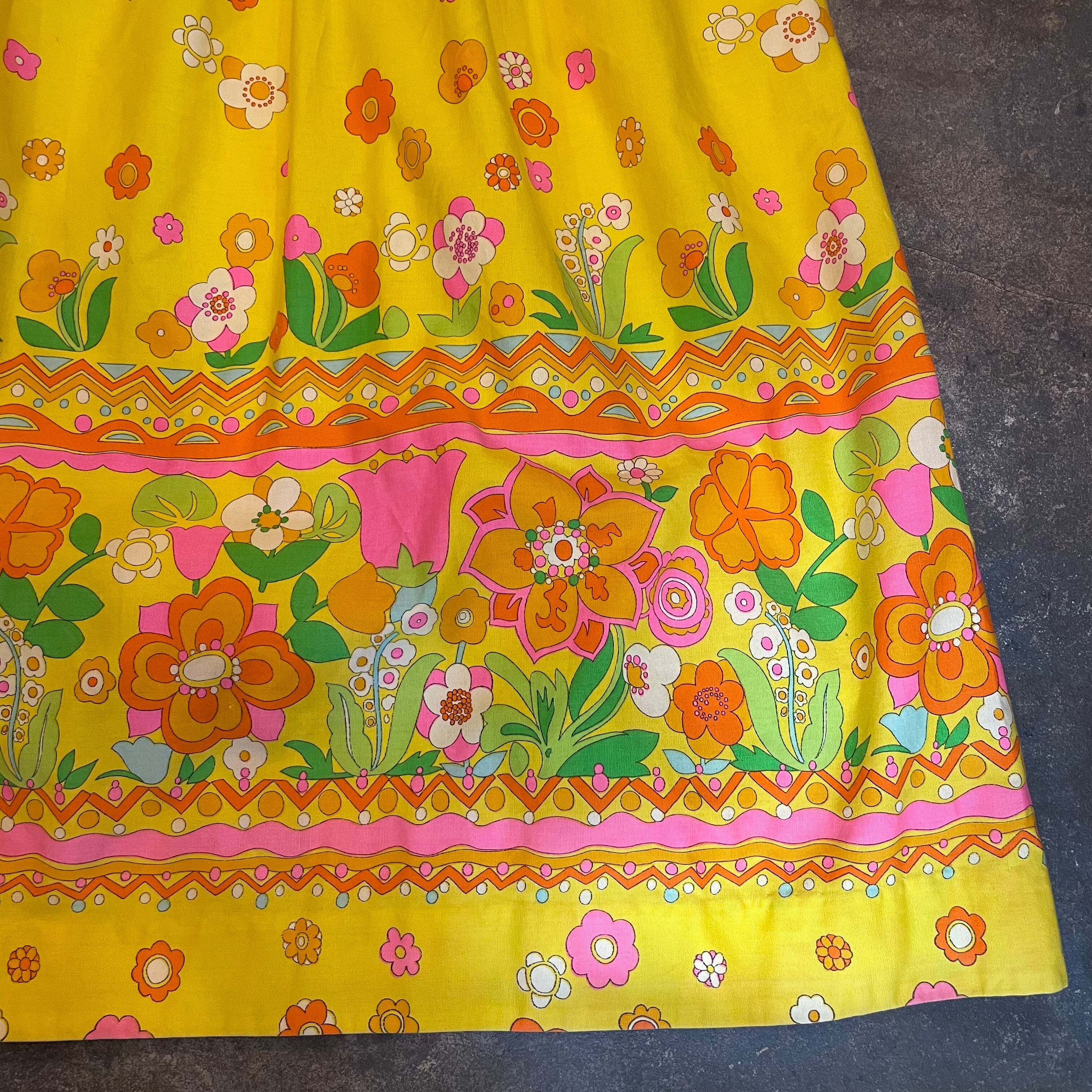 ハッピーなイエローベースにピーターマックスのような雰囲気のサイケデリックな花柄がとてもかわいい70年代頃のワンピースです。
