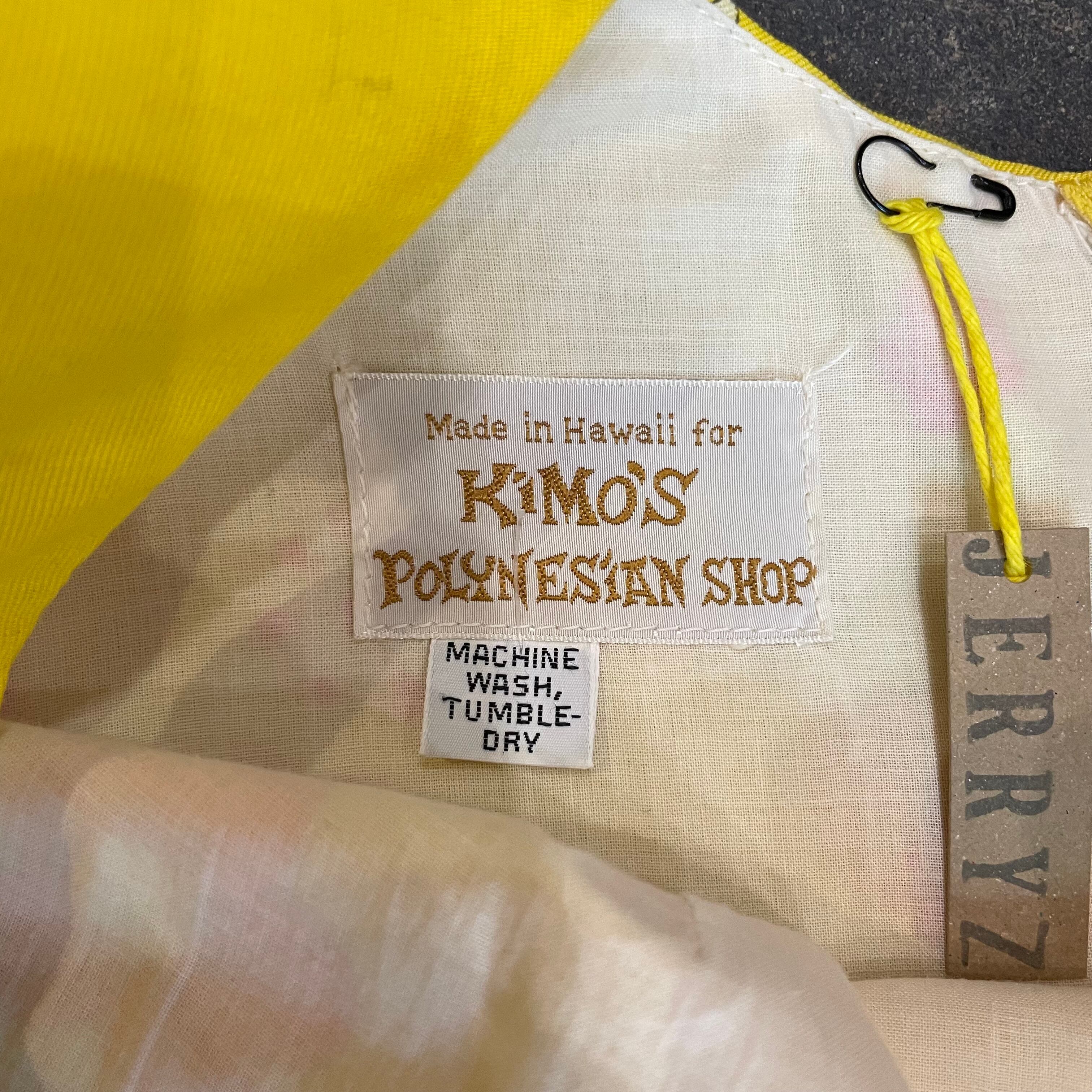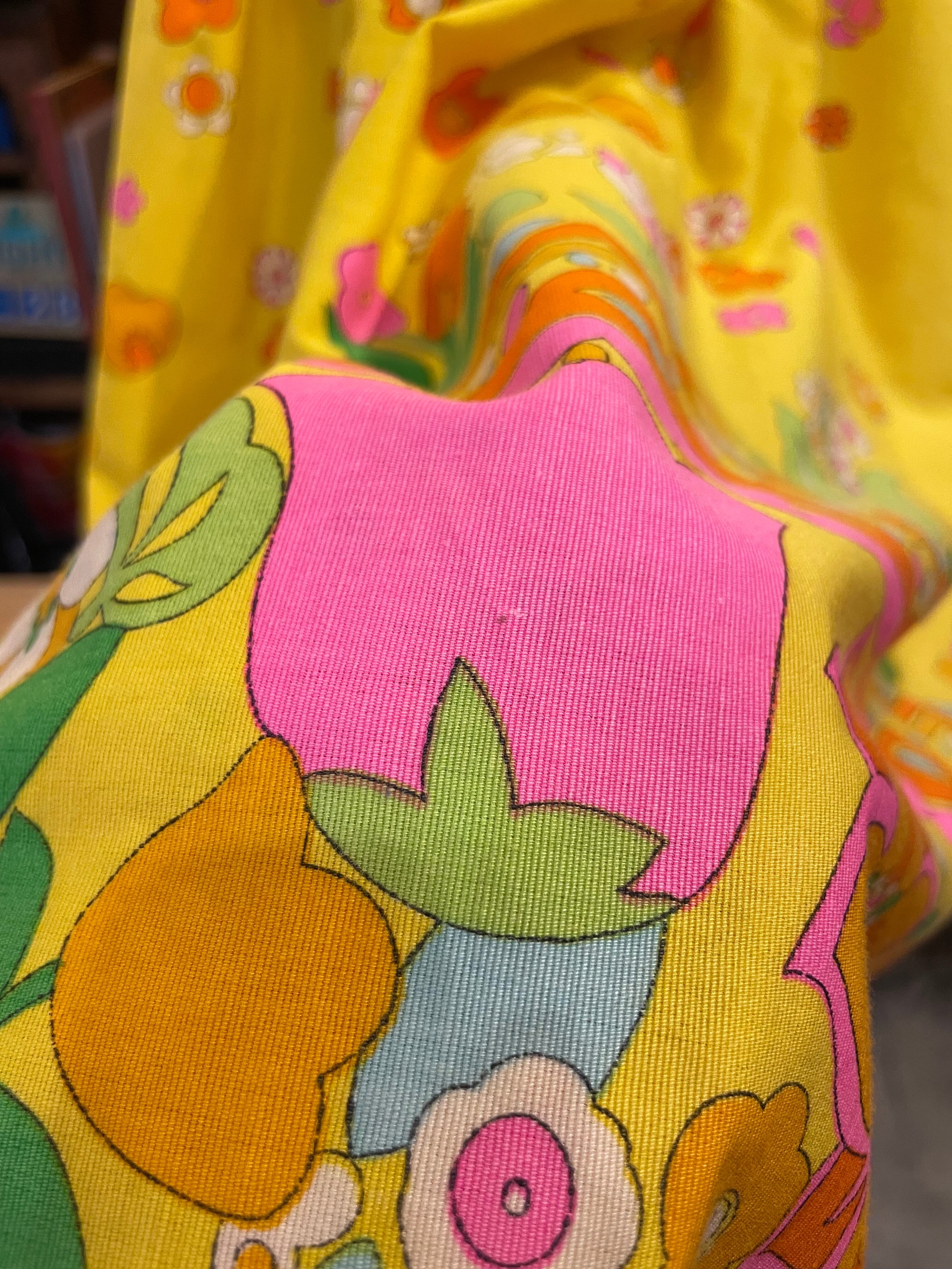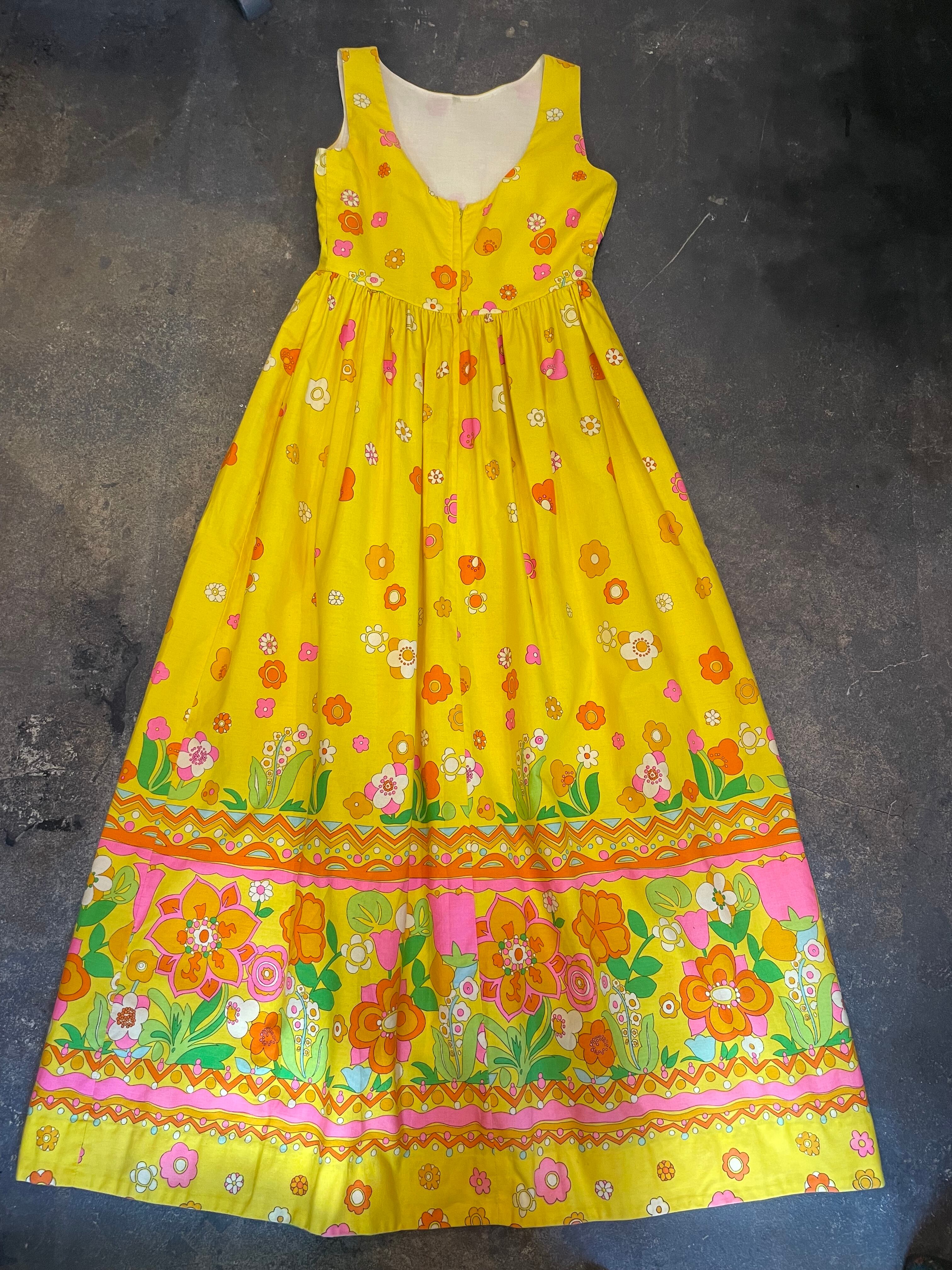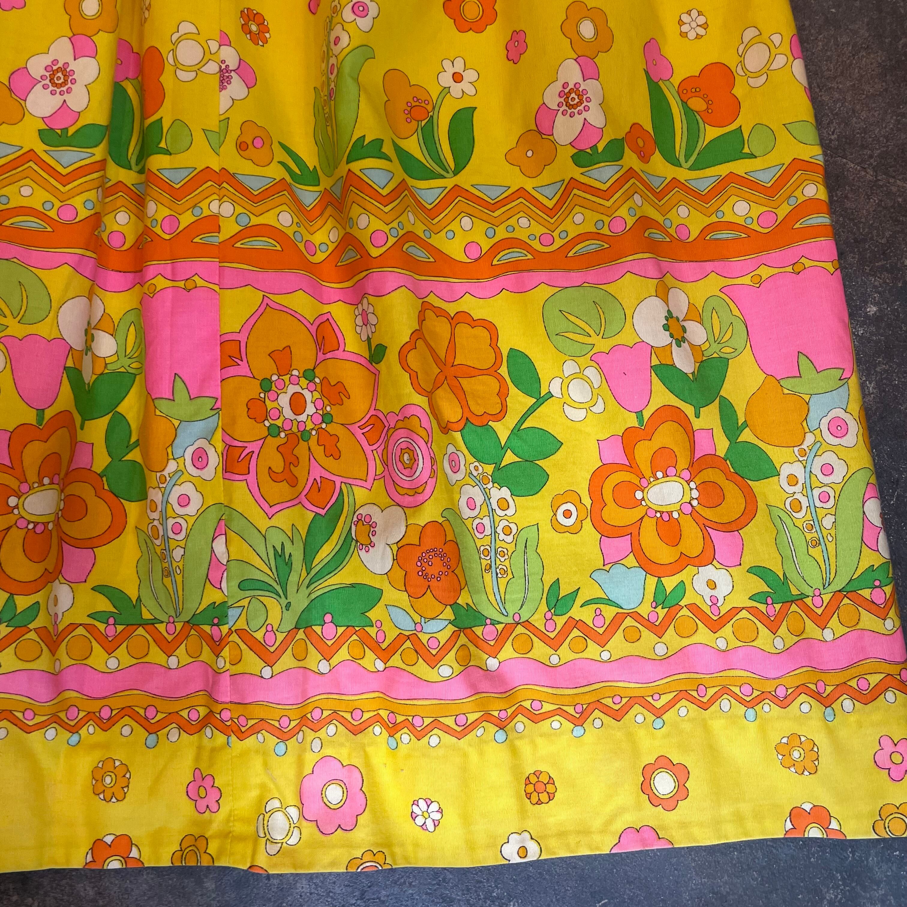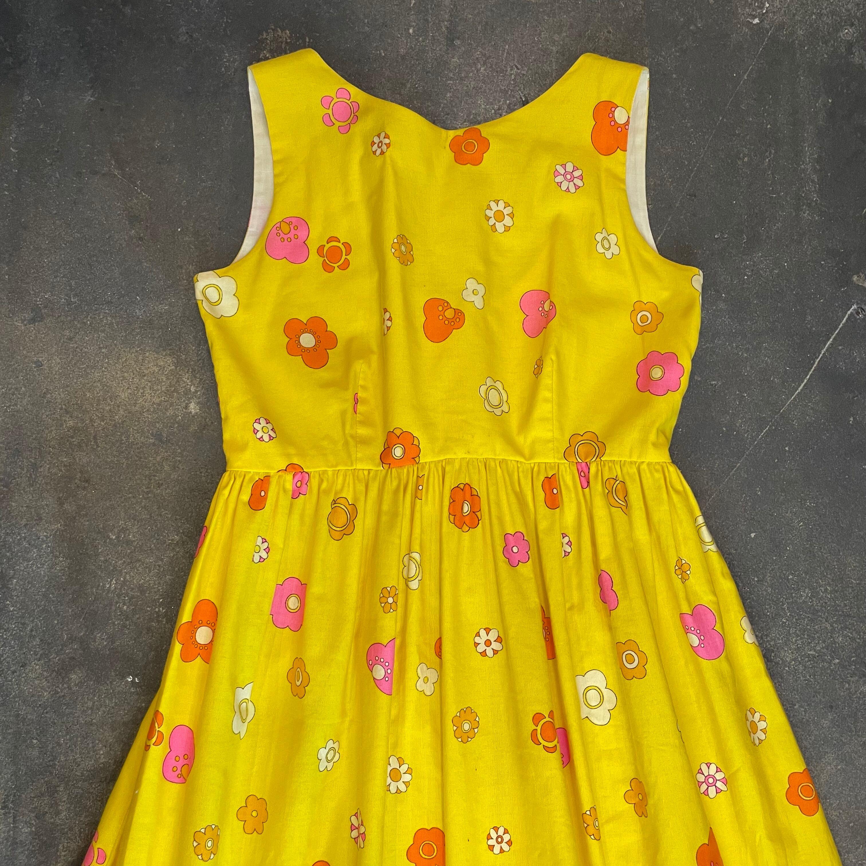 ハッピーなイエローベースにピーターマックスのような雰囲気のサイケデリックな花柄がとてもかわいい70年代頃のワンピースです。