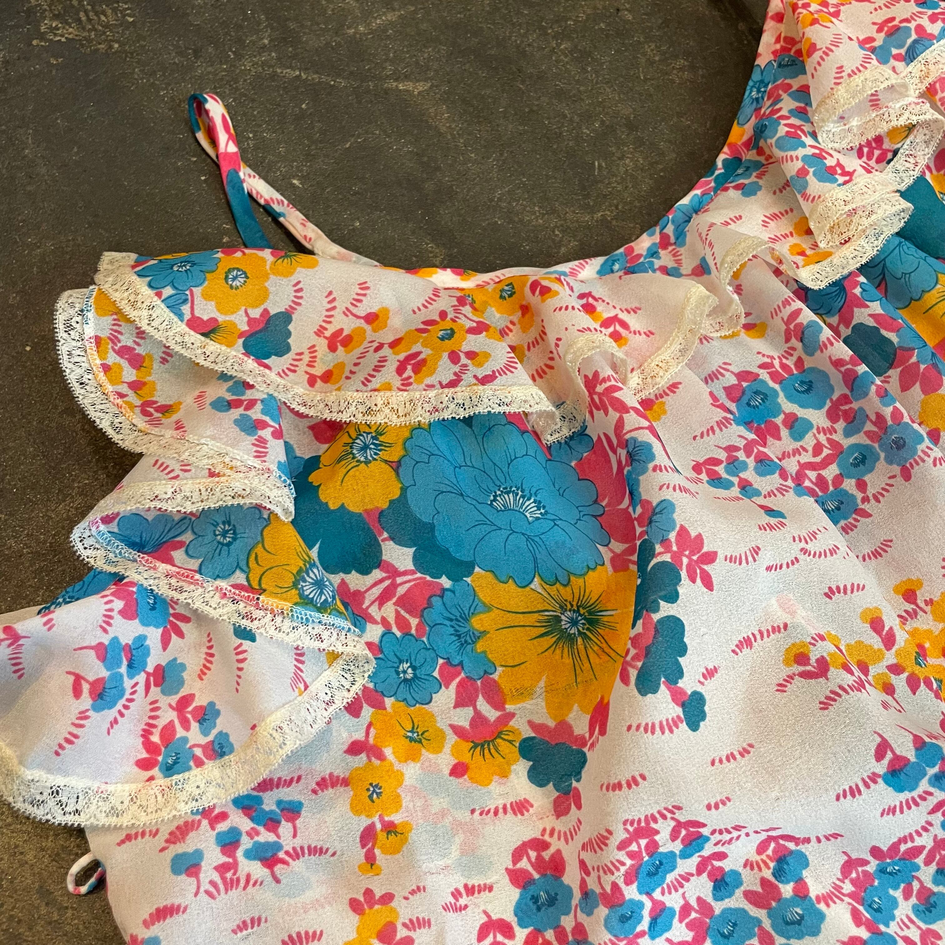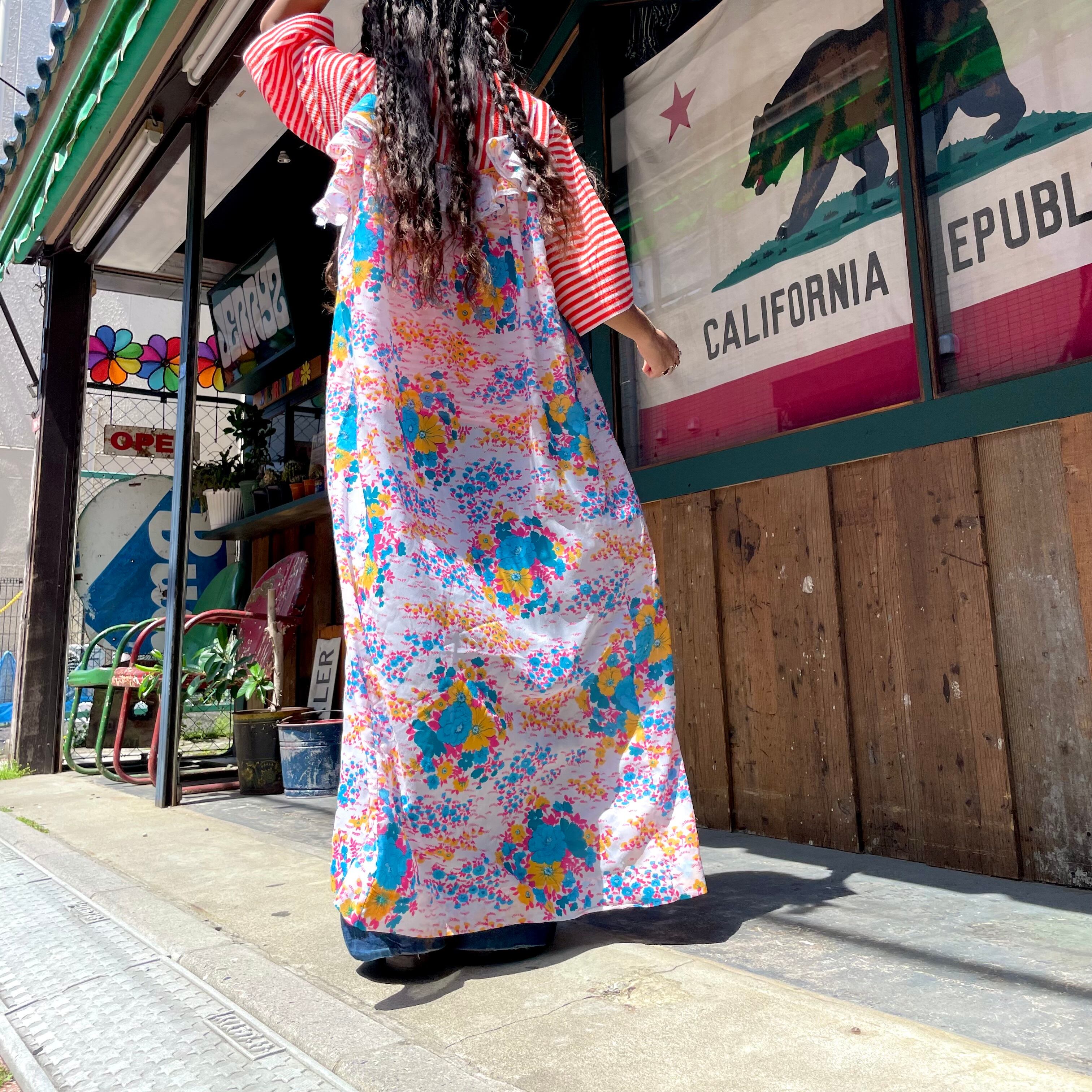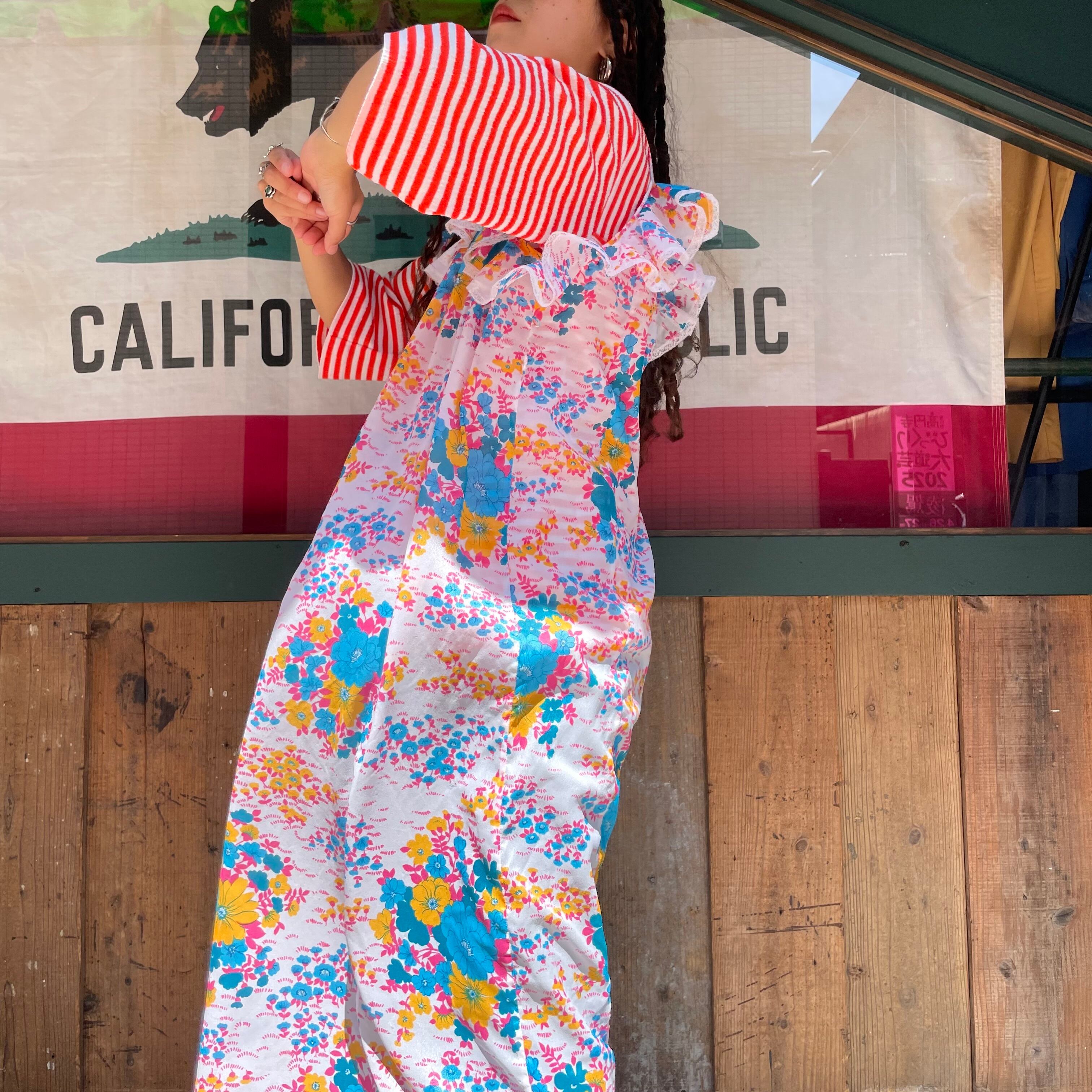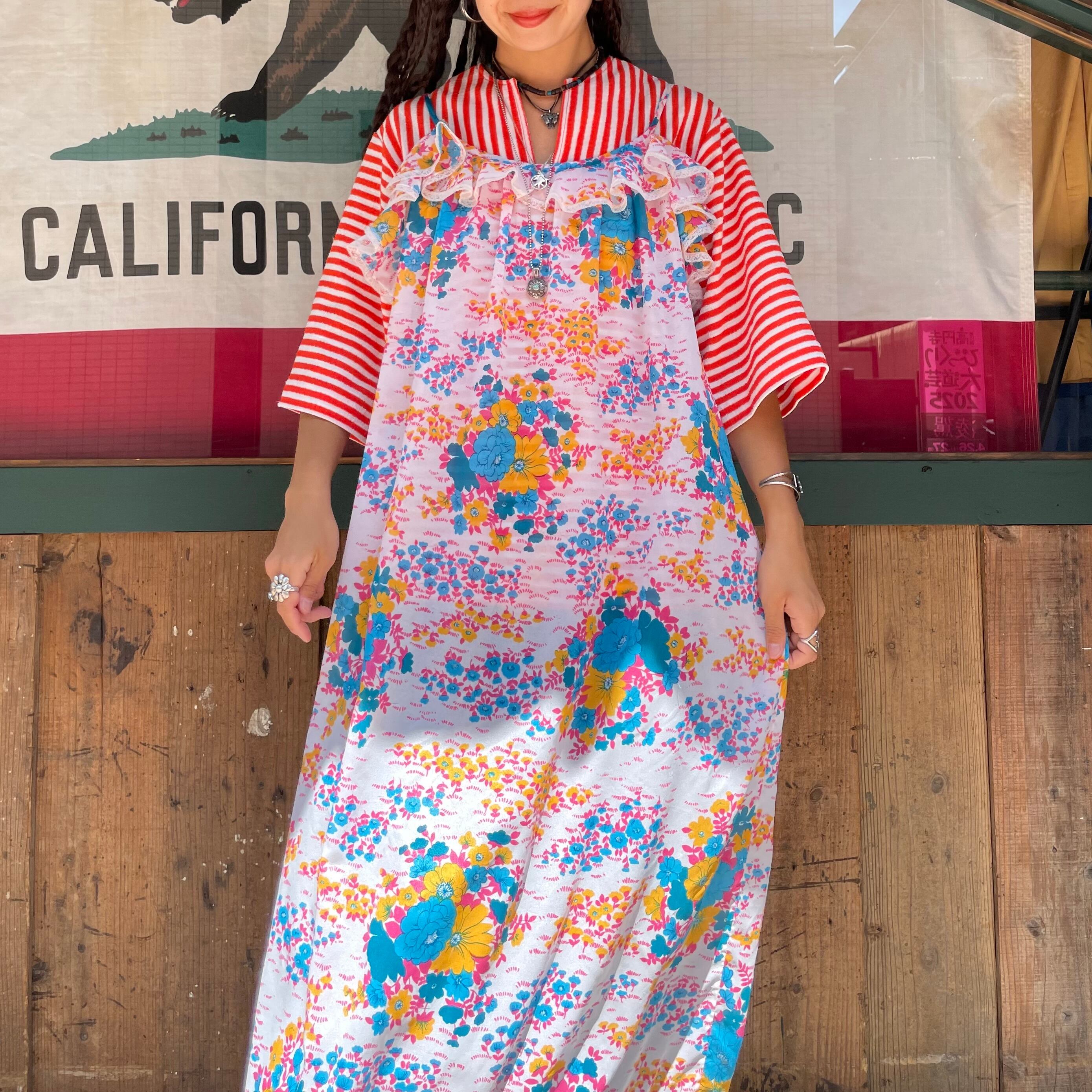 ぐるっと一周脇の下までのフリルがとてもかわいい70年代頃のランジェリーワンピースです。フリルの先にはレースまで付いていたり、派手すぎないけどハッピーな花柄も素敵ですね。