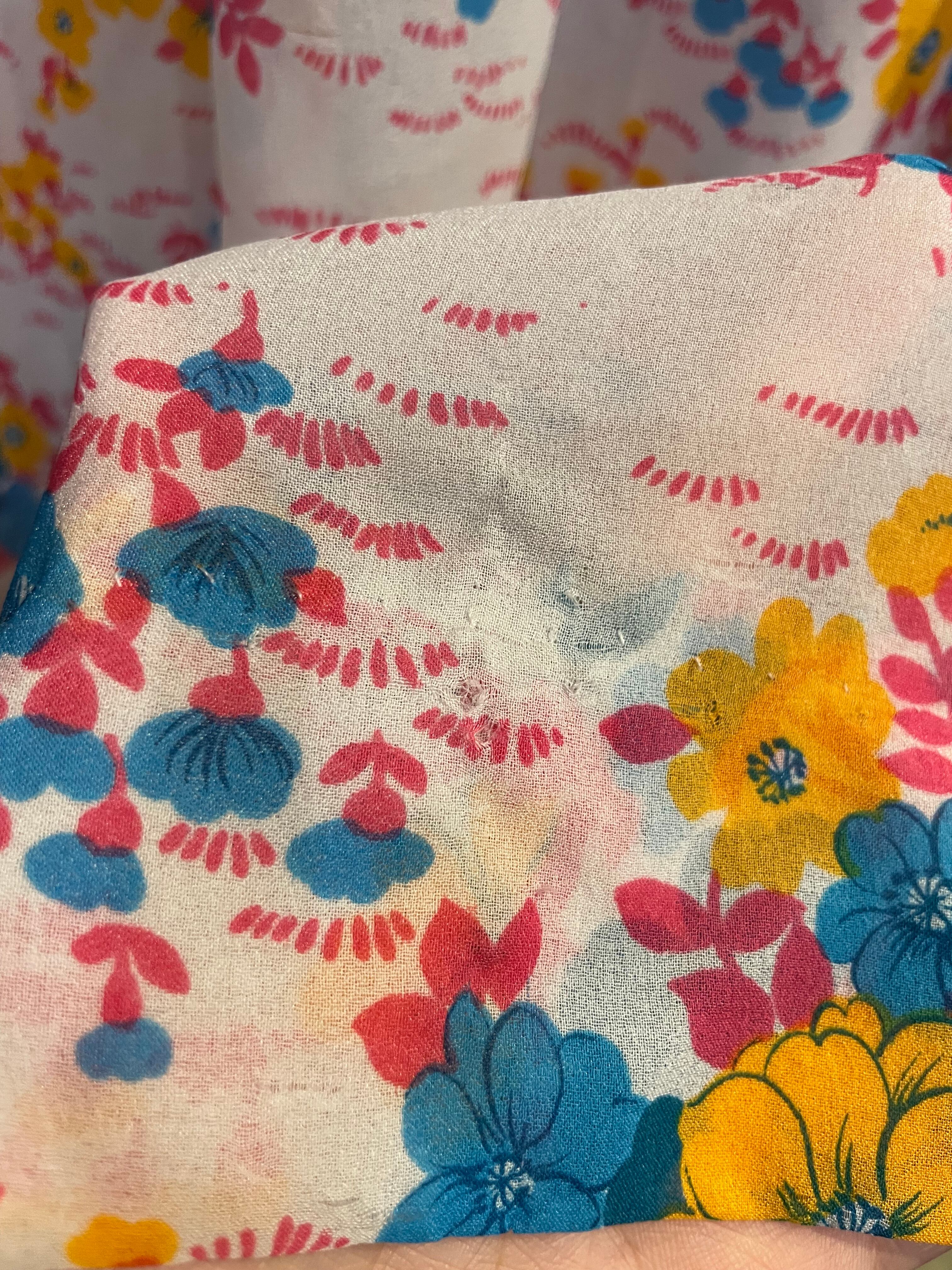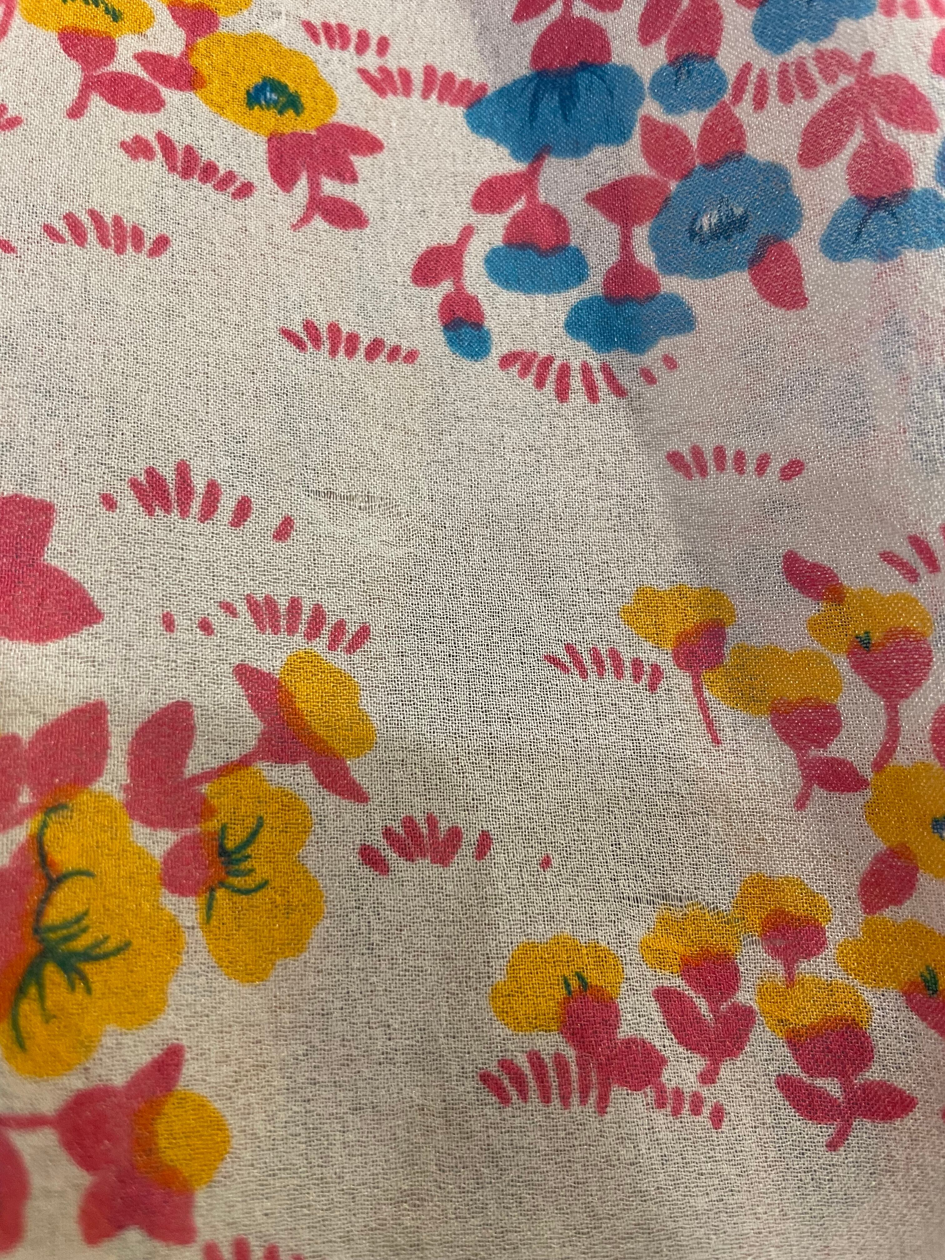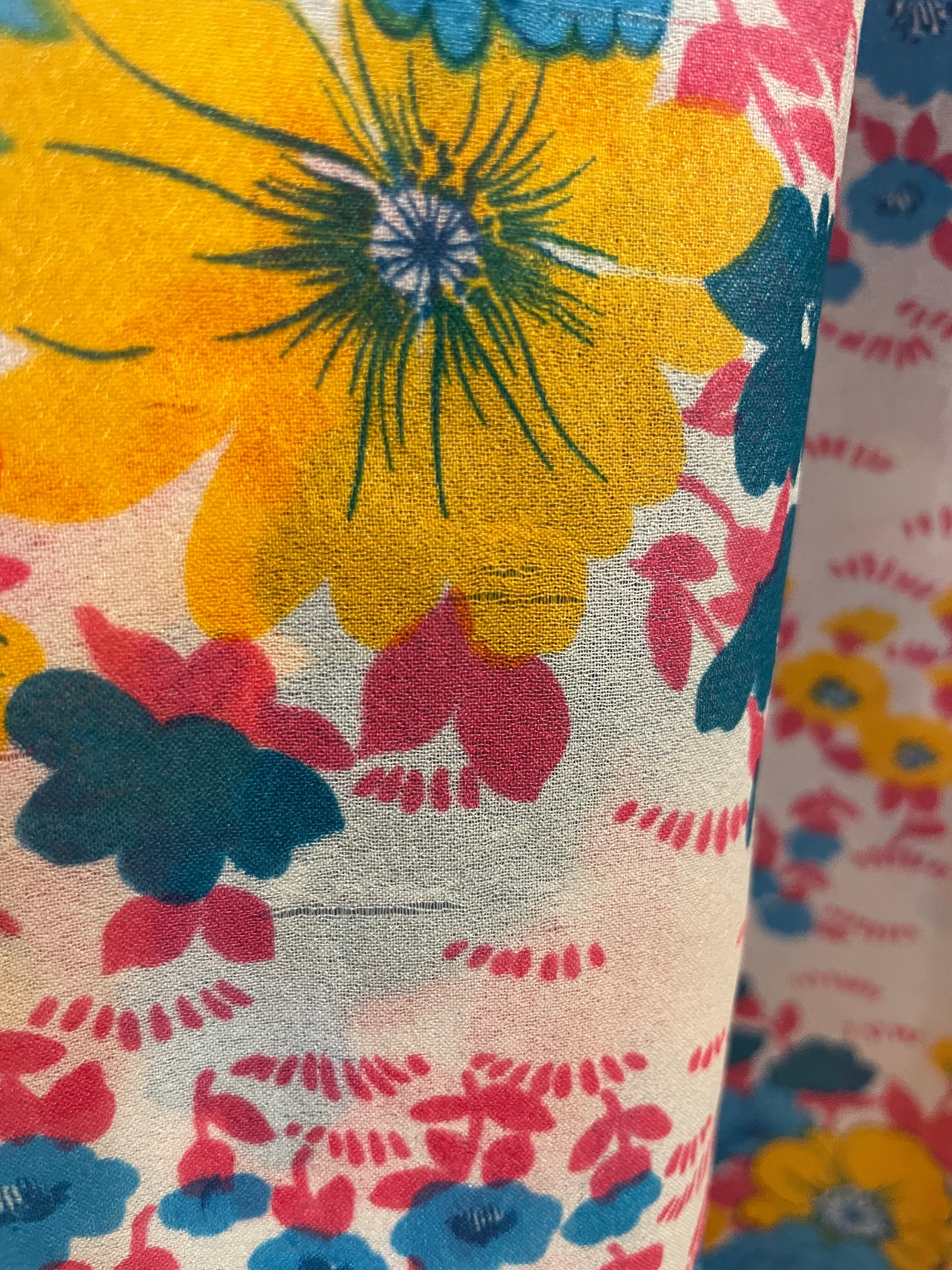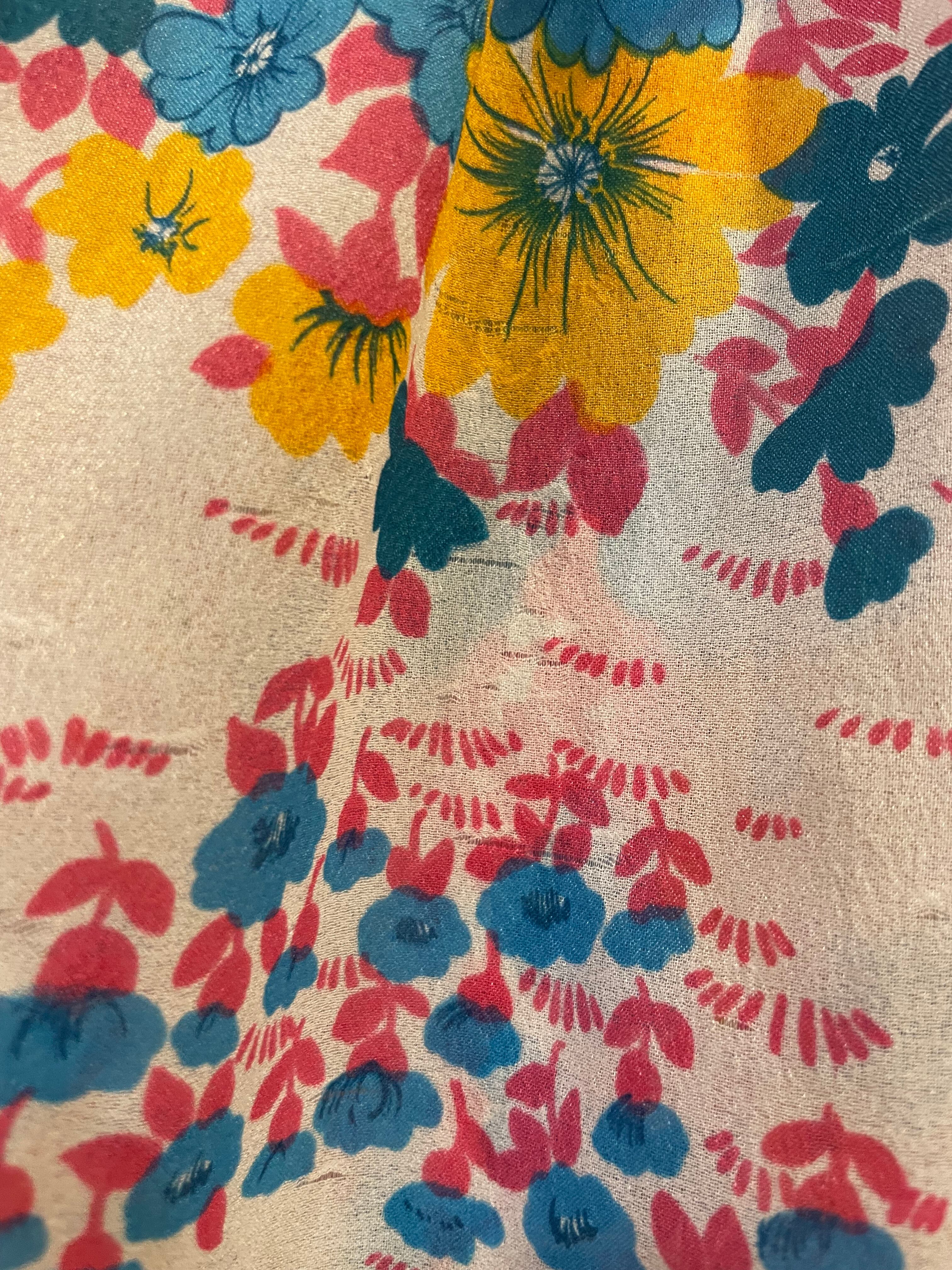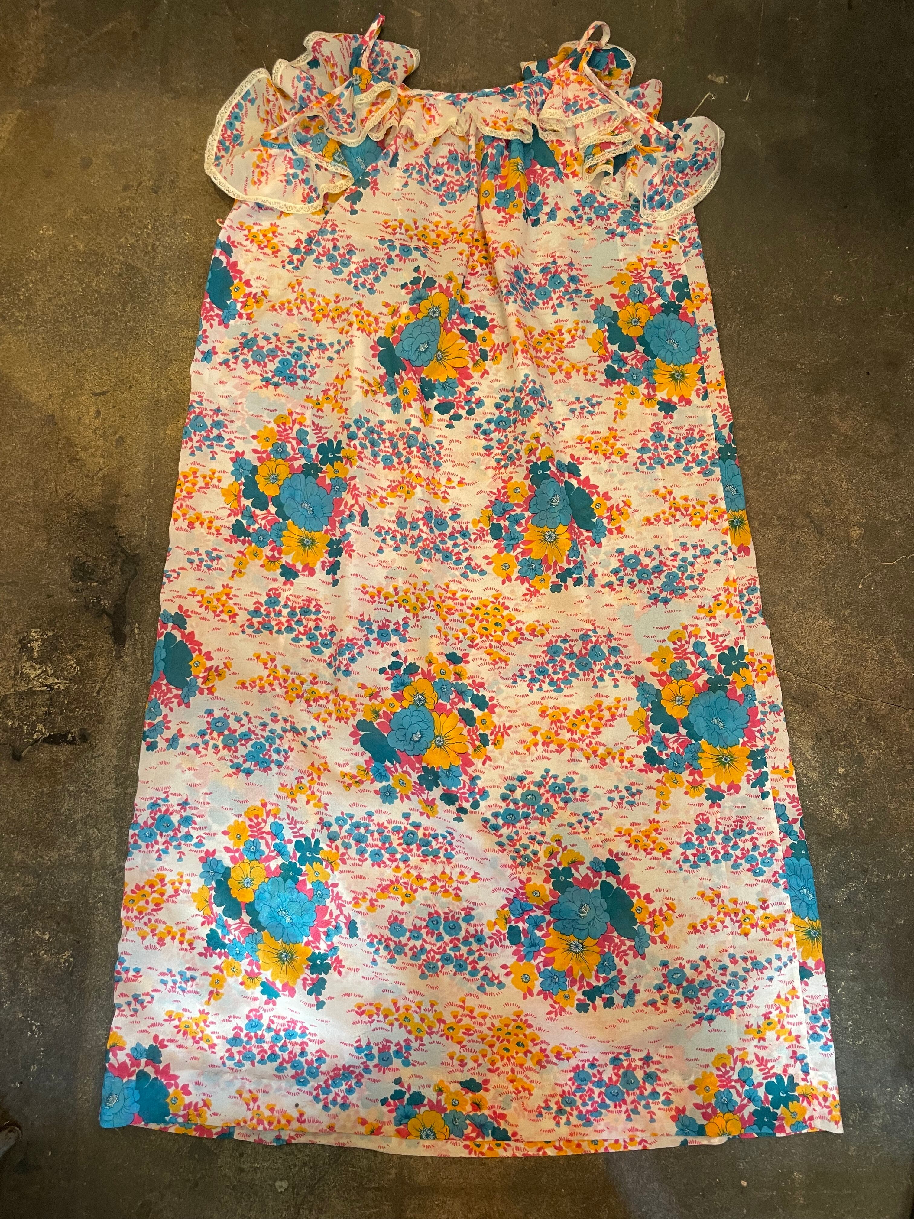 ぐるっと一周脇の下までのフリルがとてもかわいい70年代頃のランジェリーワンピースです。フリルの先にはレースまで付いていたり、派手すぎないけどハッピーな花柄も素敵ですね。