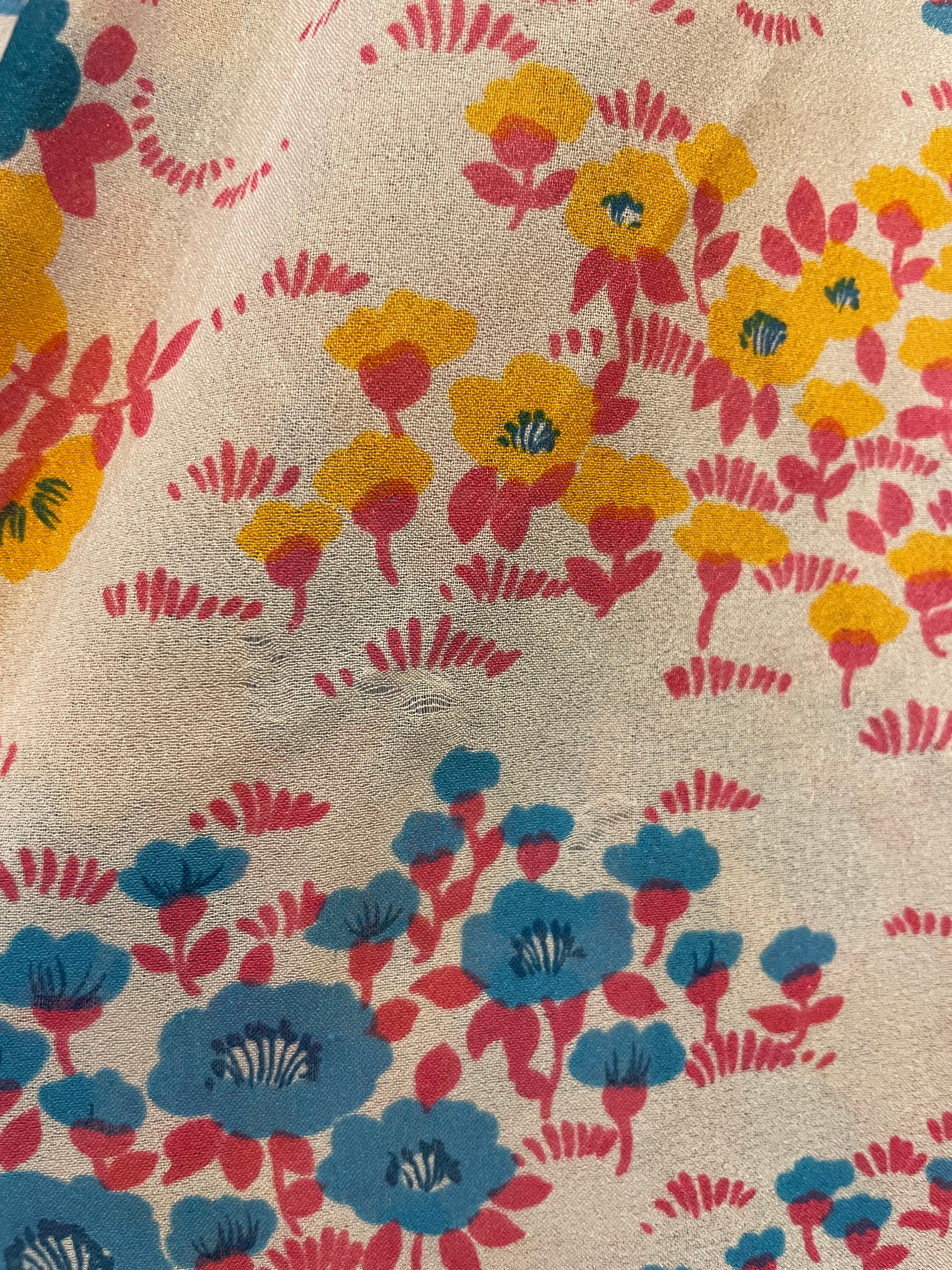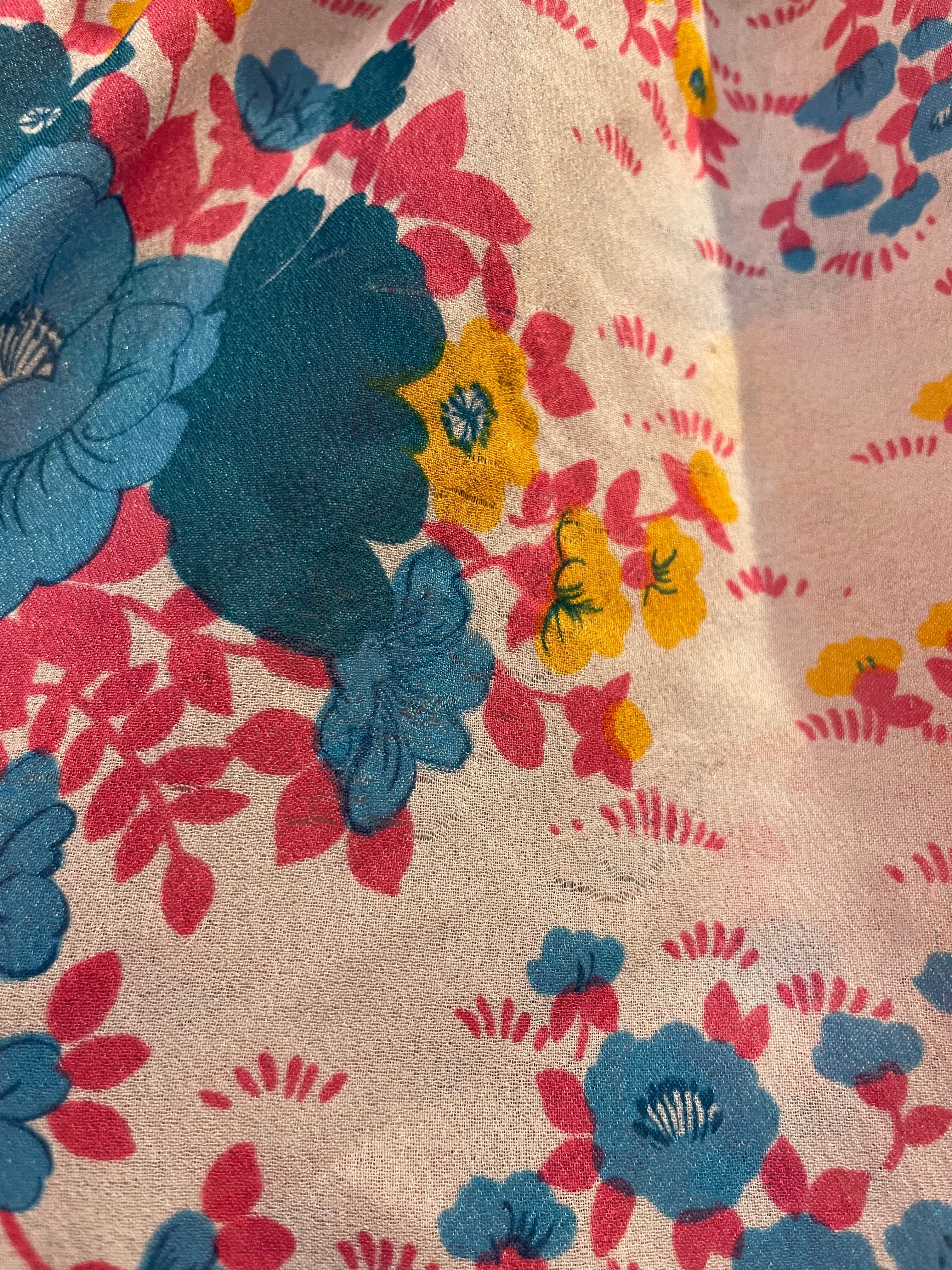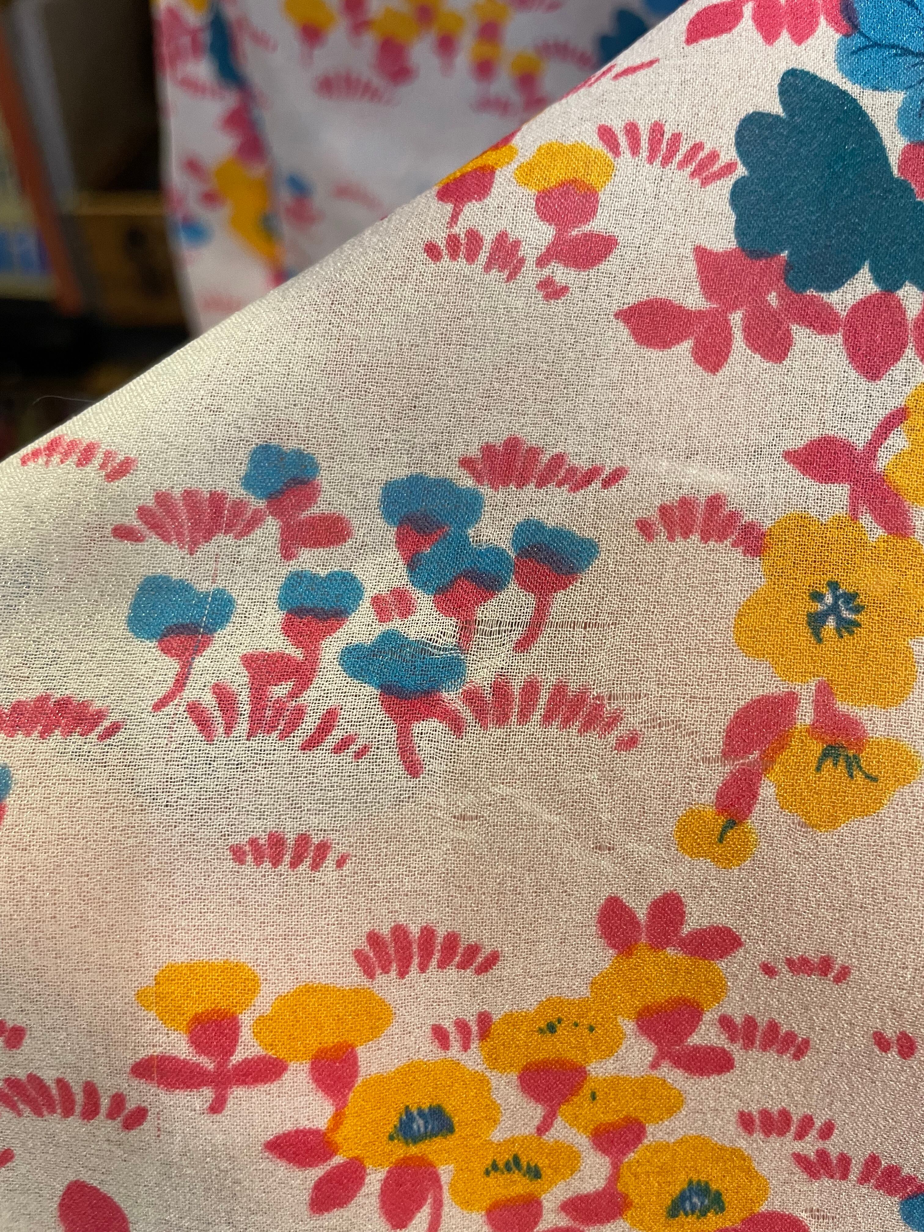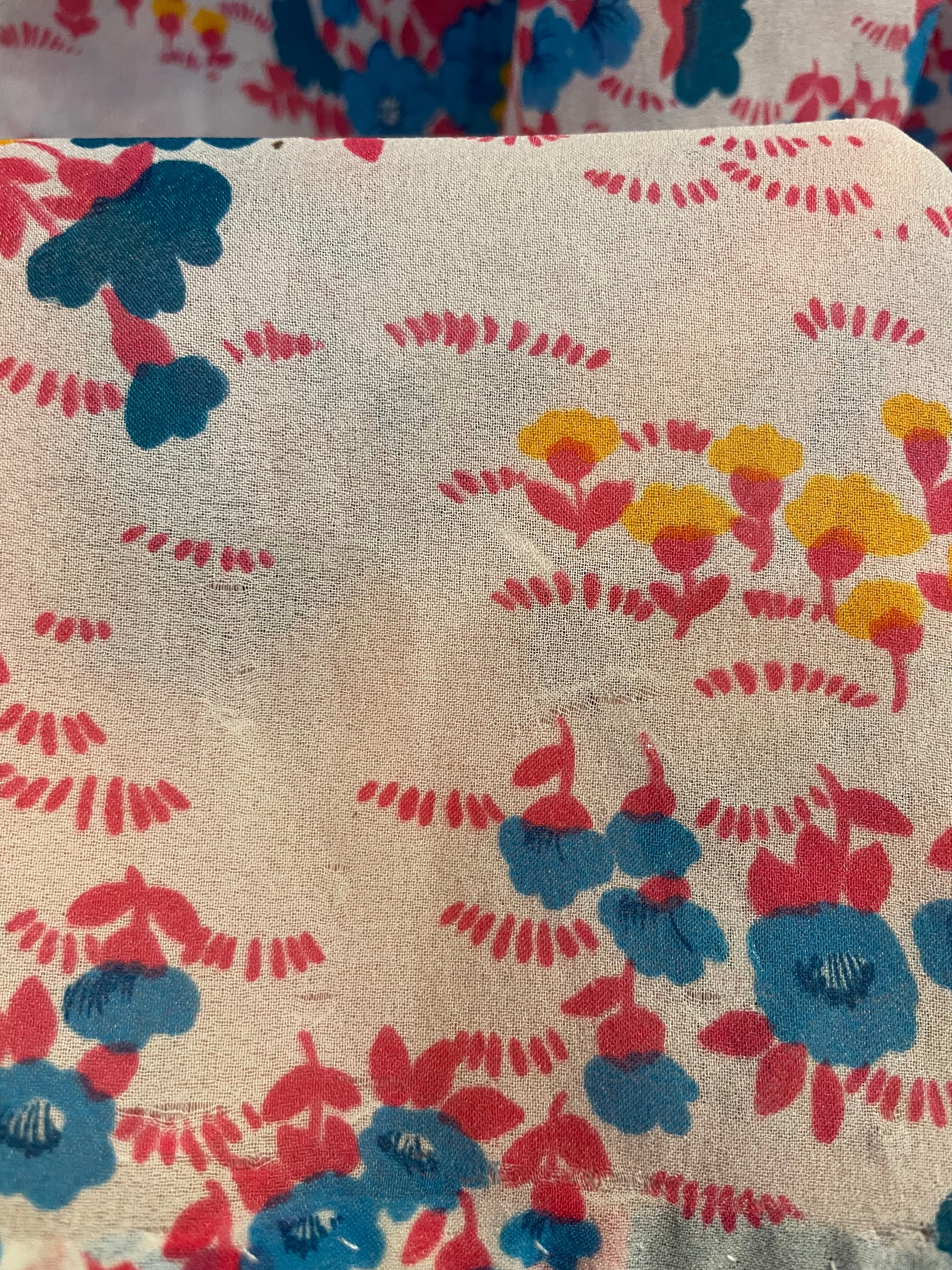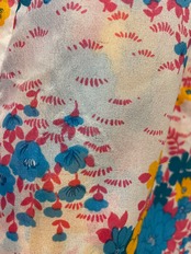 ぐるっと一周脇の下までのフリルがとてもかわいい70年代頃のランジェリーワンピースです。フリルの先にはレースまで付いていたり、派手すぎないけどハッピーな花柄も素敵ですね。