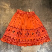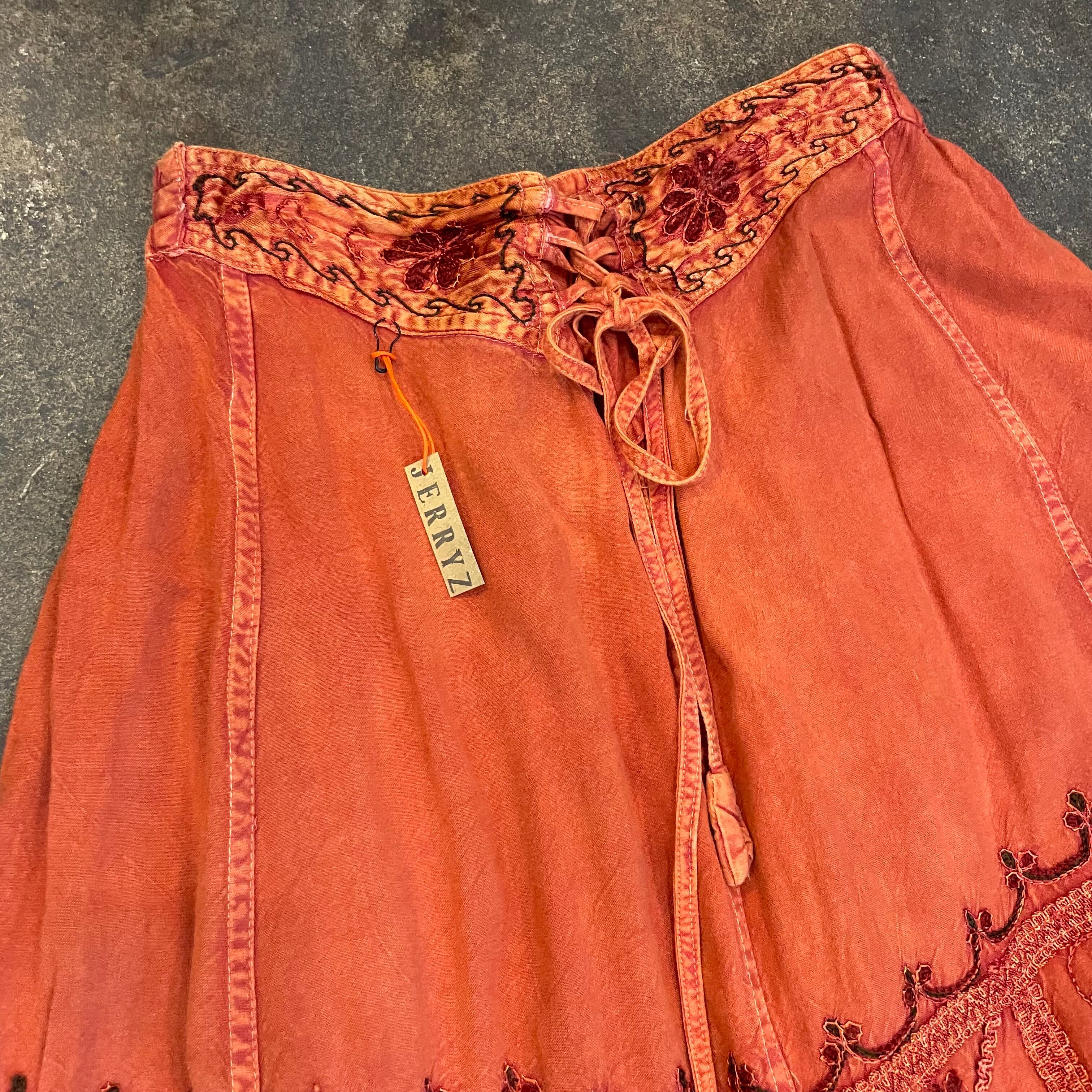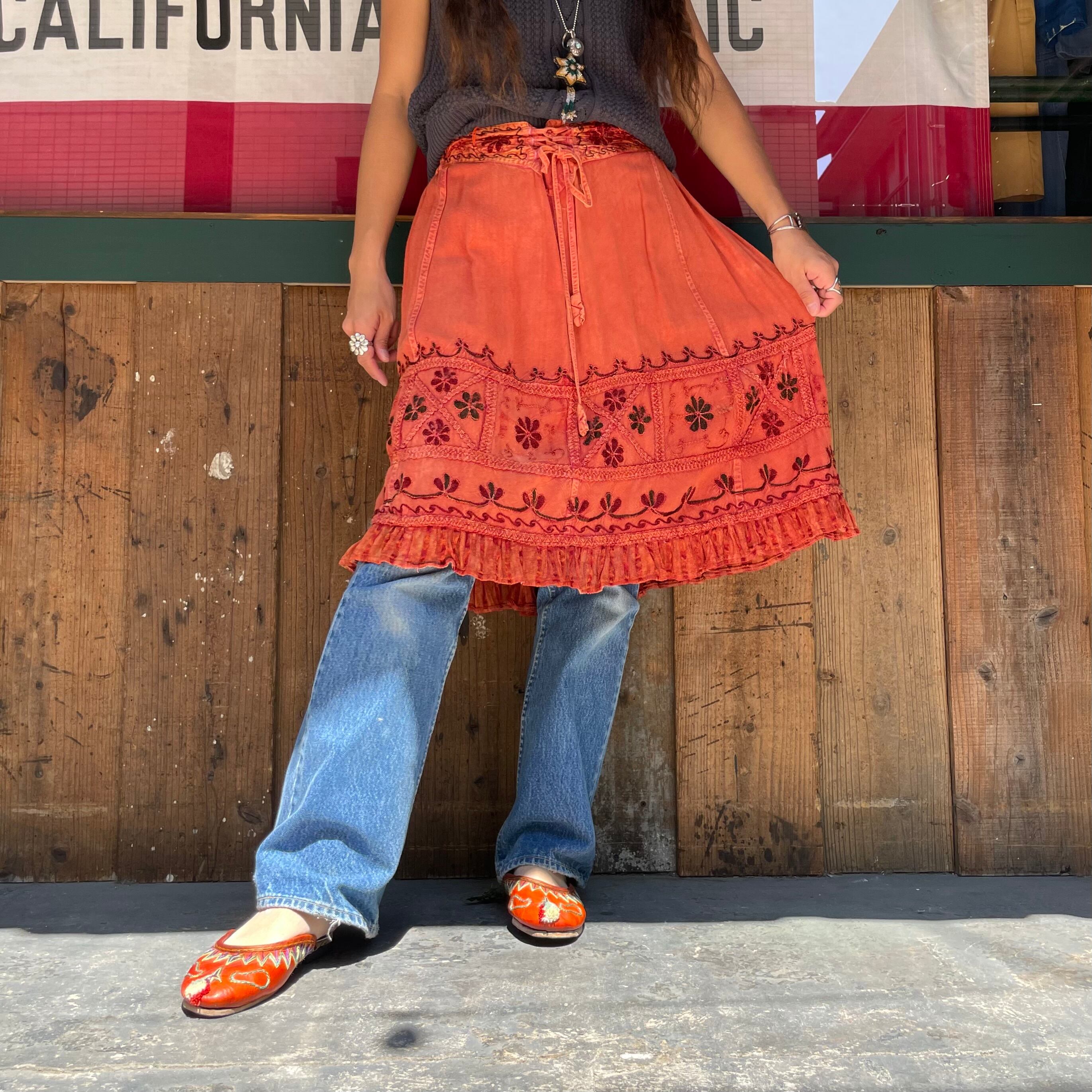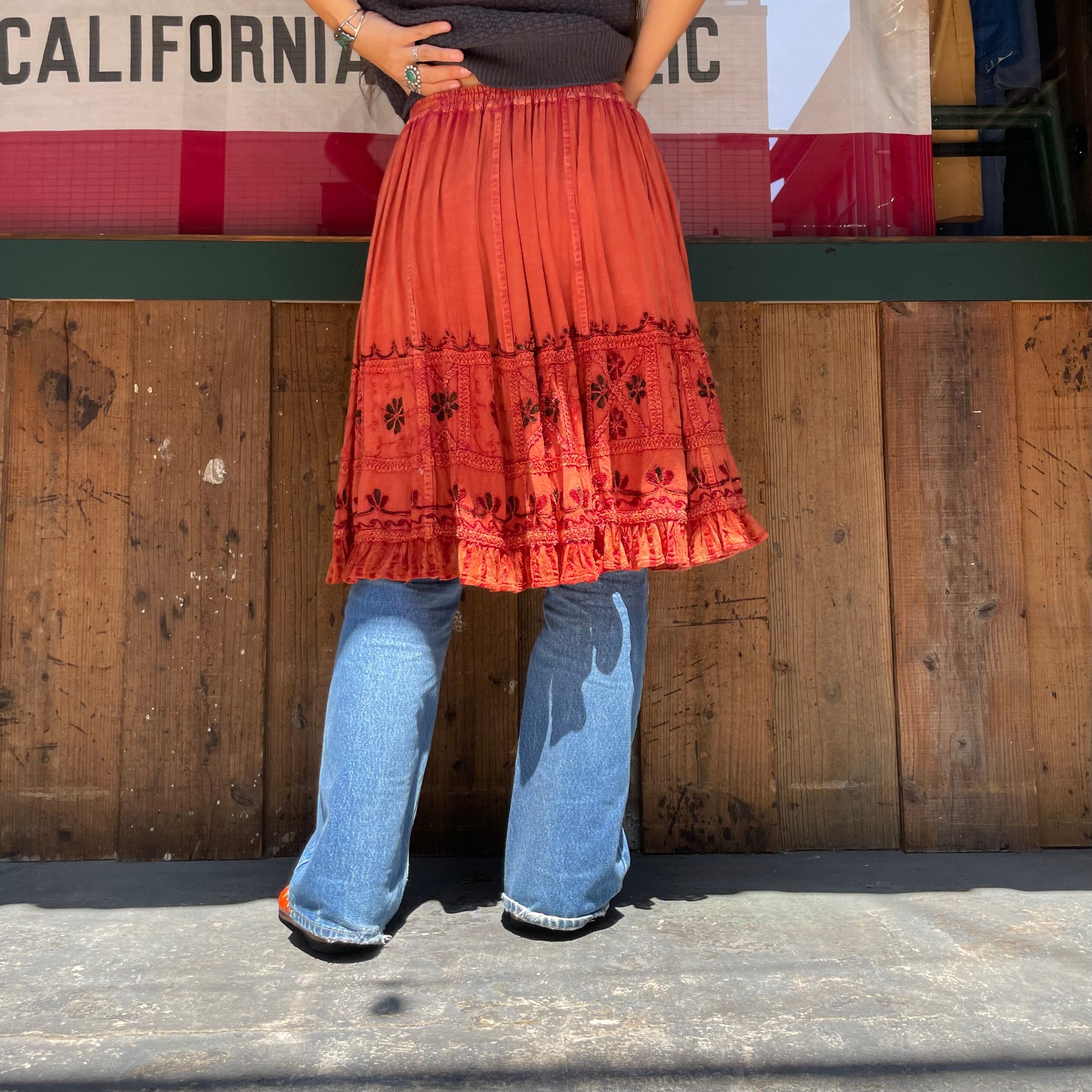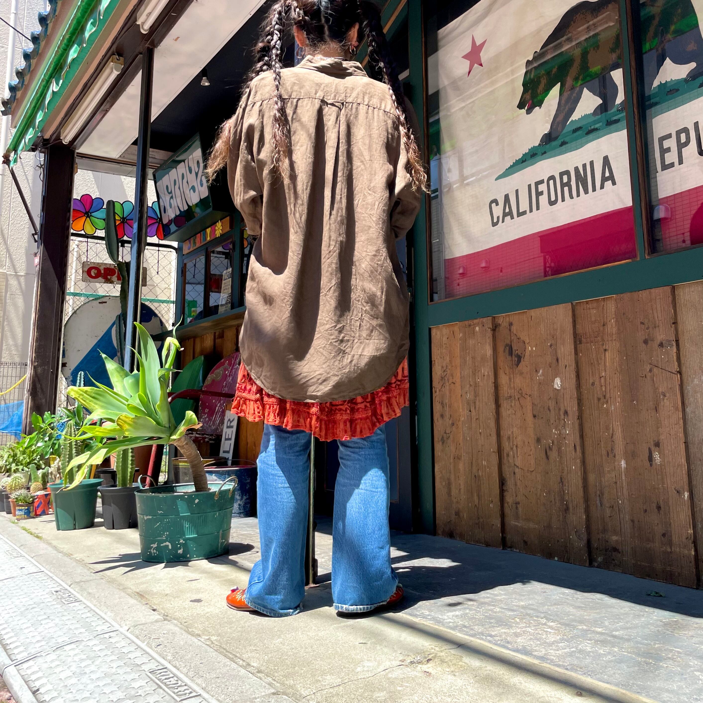 テロンとした生地感が気持ち良いですし、ウエストも半分ゴムなので楽ちんな一枚です。テラコッタなカラーも合わせやすいのでデニムと重ねたり、夏はTシャツにサンダルでも、スエードベストにブーツでもかわいいと思います。