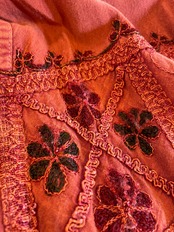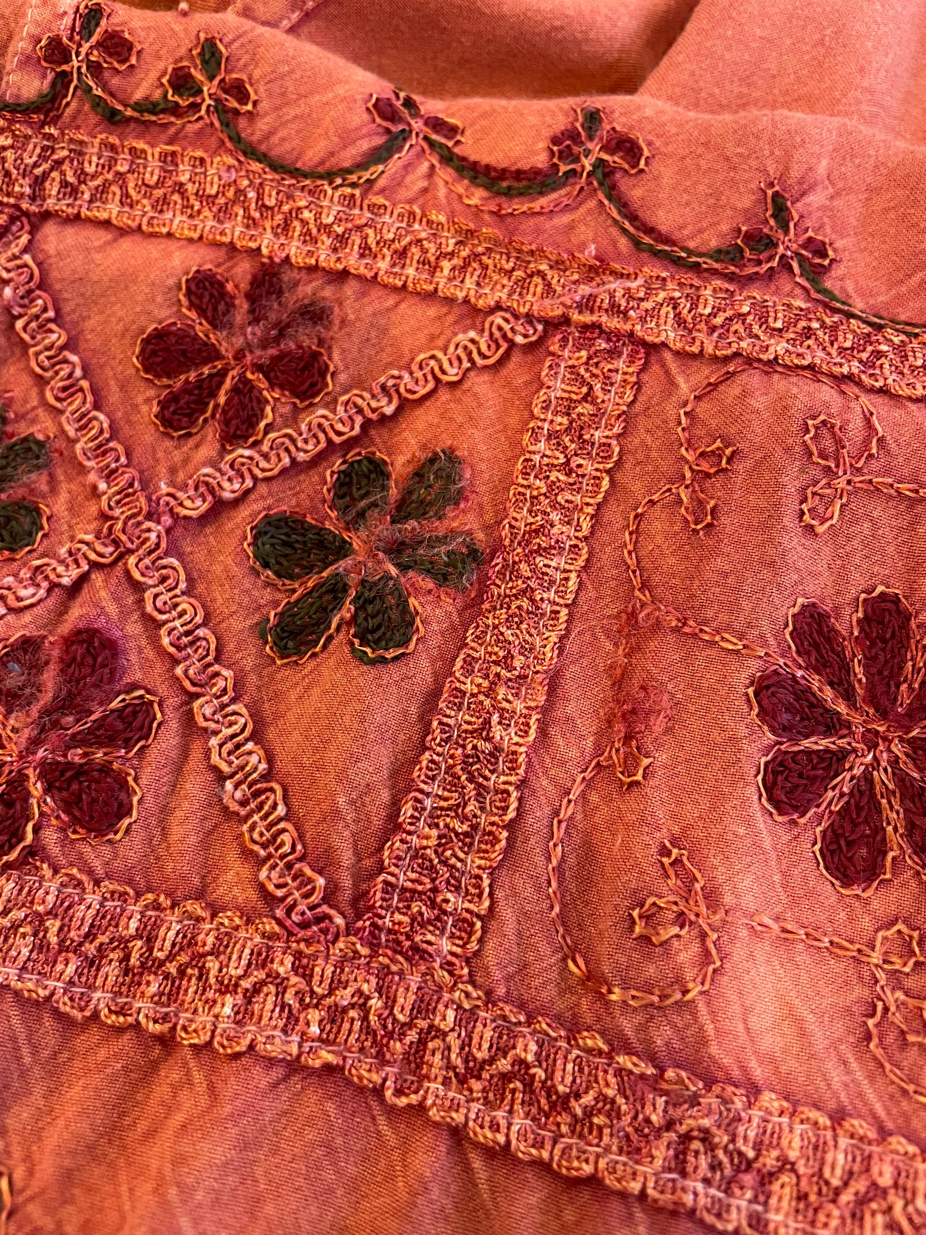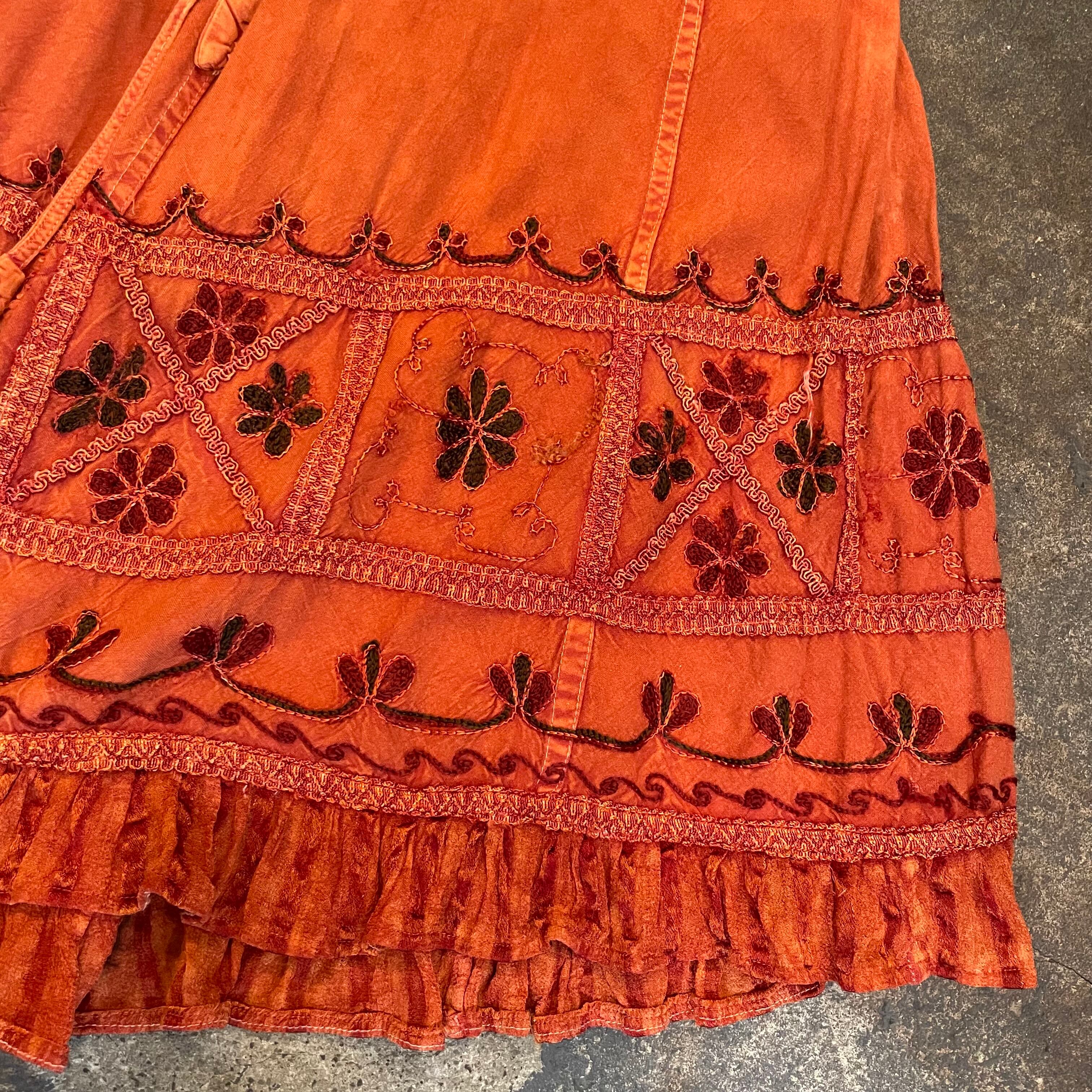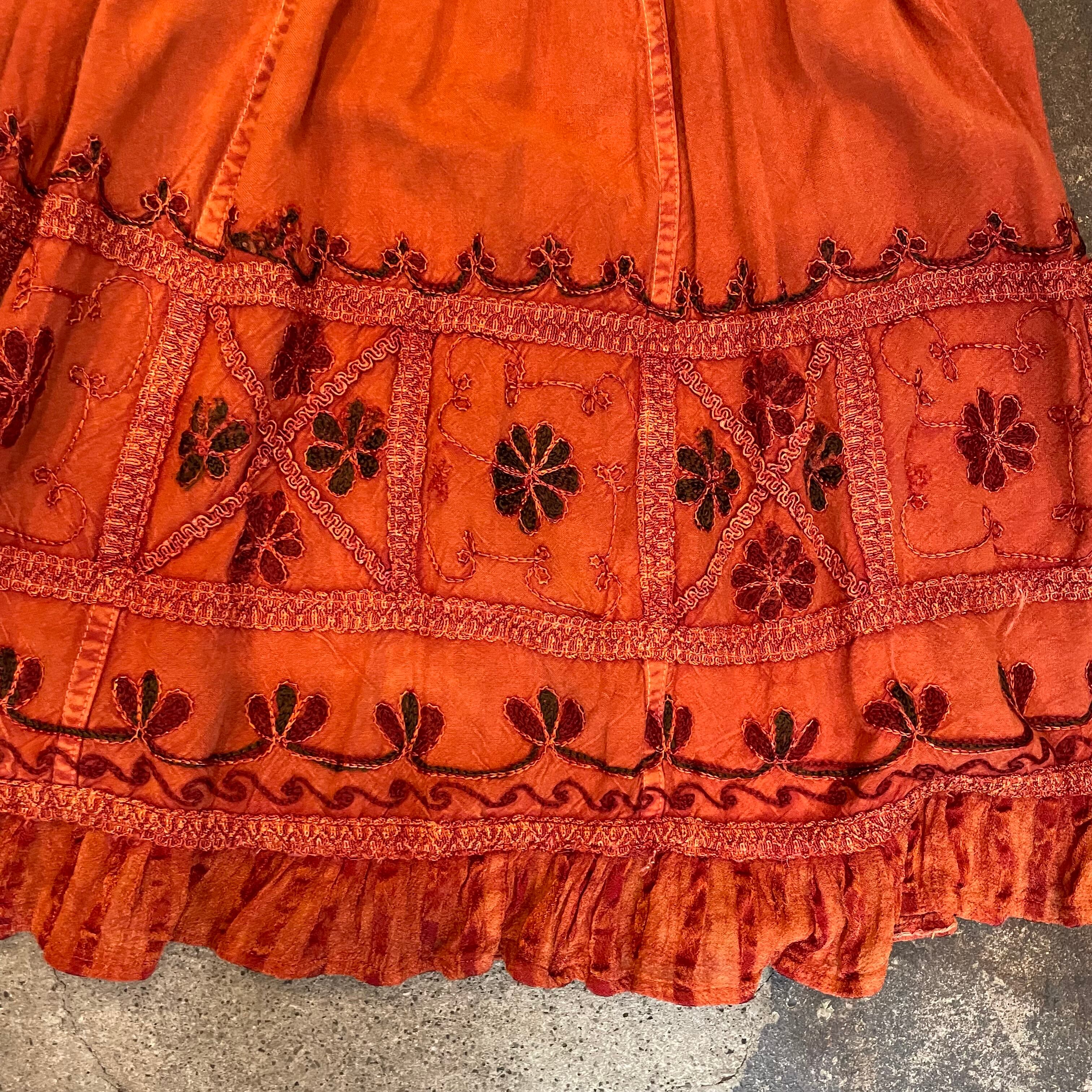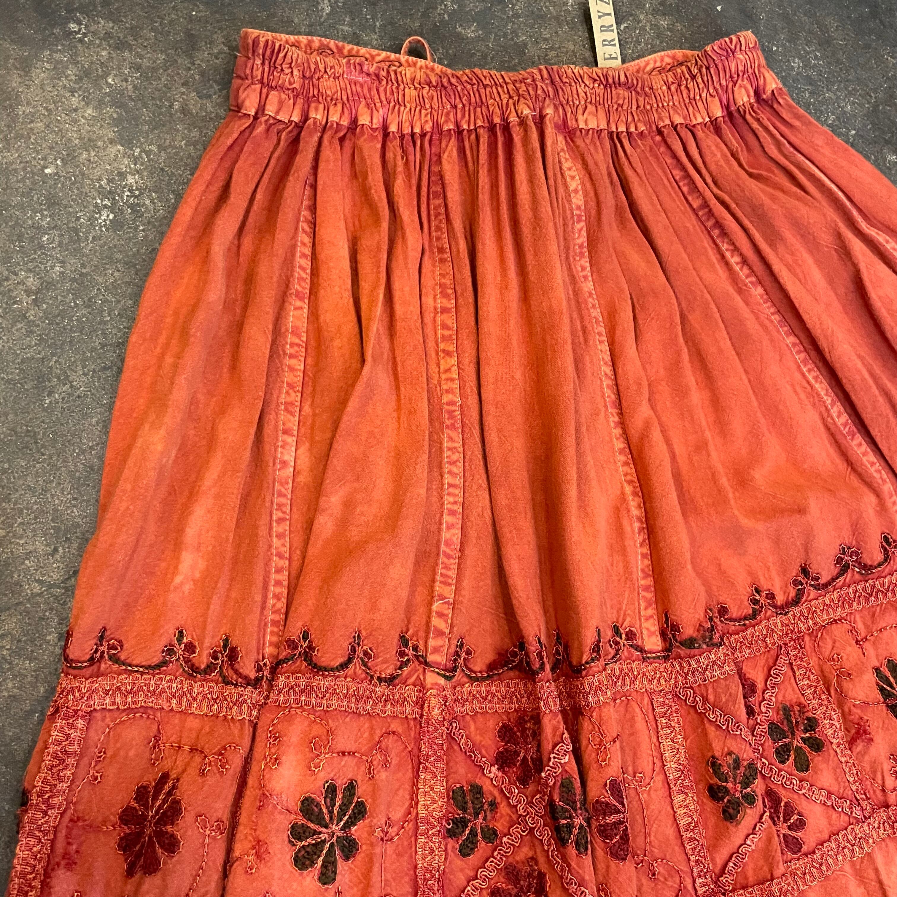 テロンとした生地感が気持ち良いですし、ウエストも半分ゴムなので楽ちんな一枚です。テラコッタなカラーも合わせやすいのでデニムと重ねたり、夏はTシャツにサンダルでも、スエードベストにブーツでもかわいいと思います。