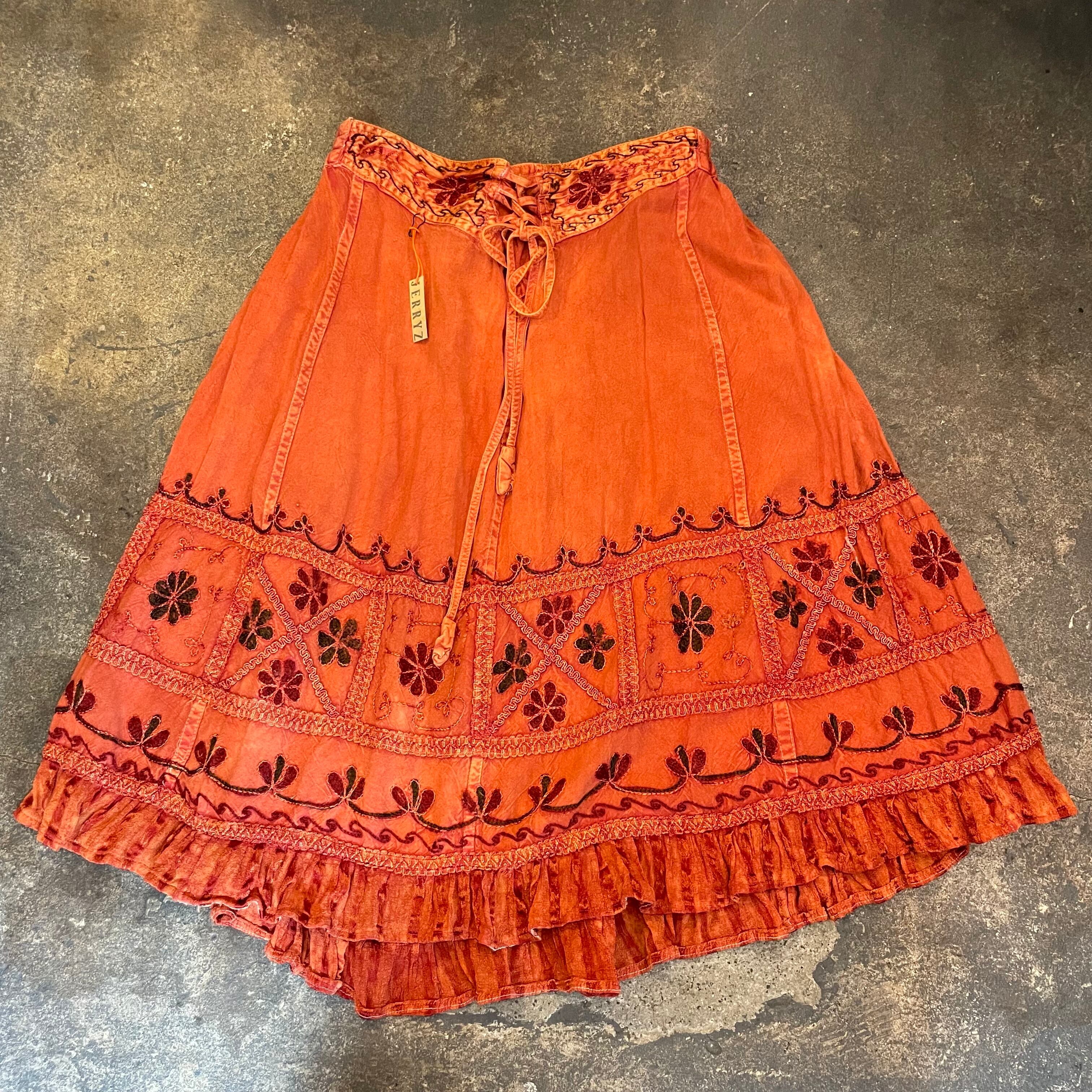 お花の刺繍や裾のフリル、ウエストのレースアップ仕様のバランスがかわいいですね。