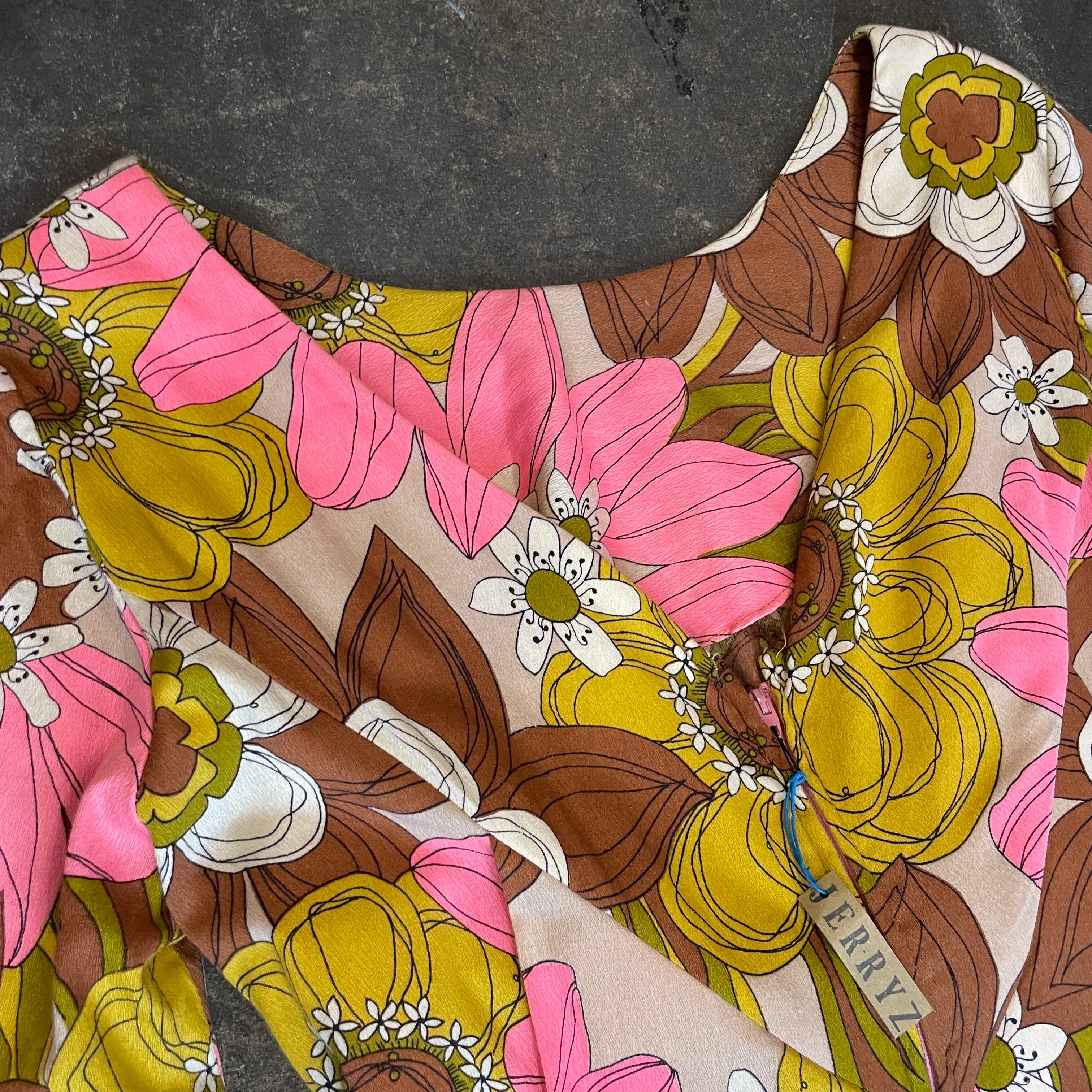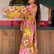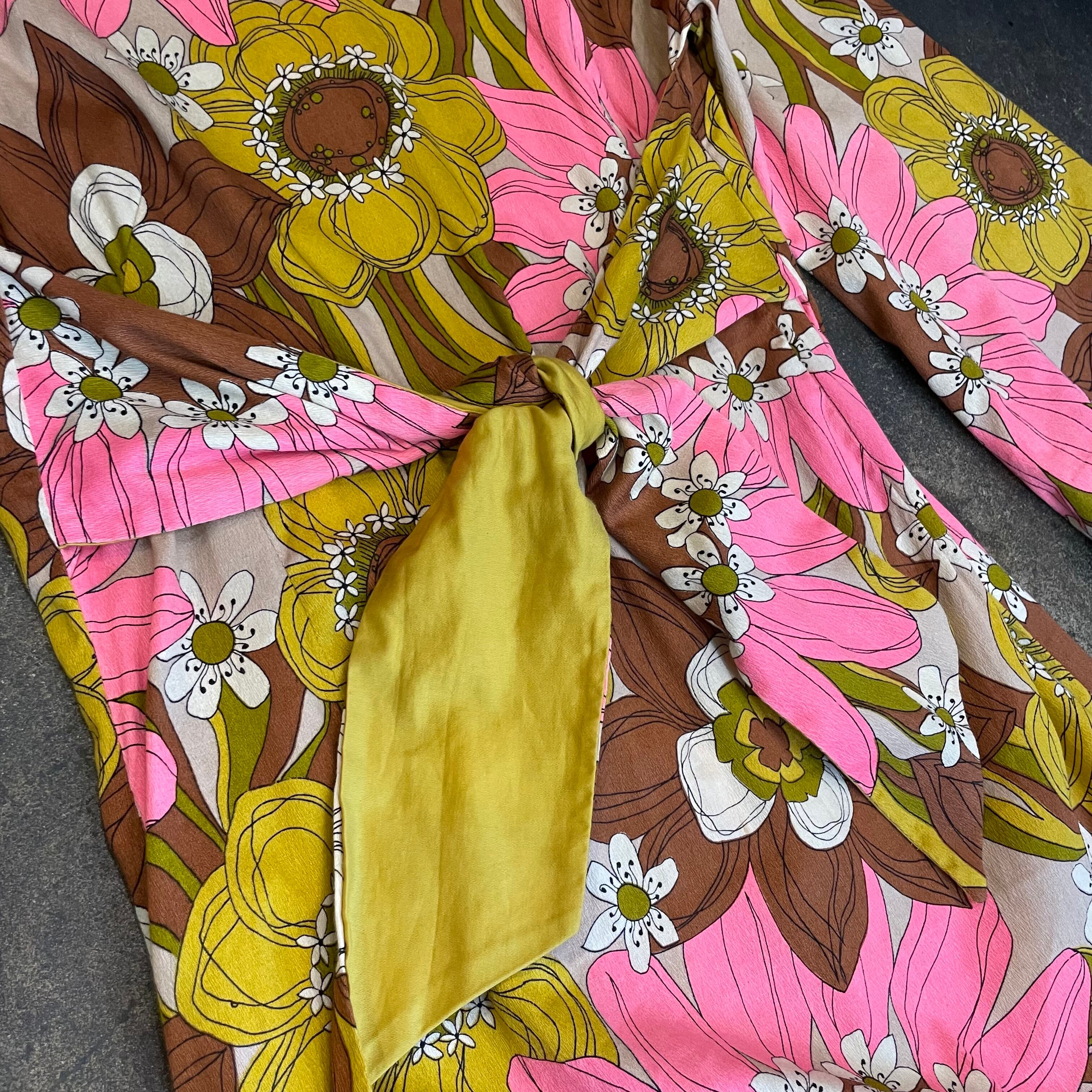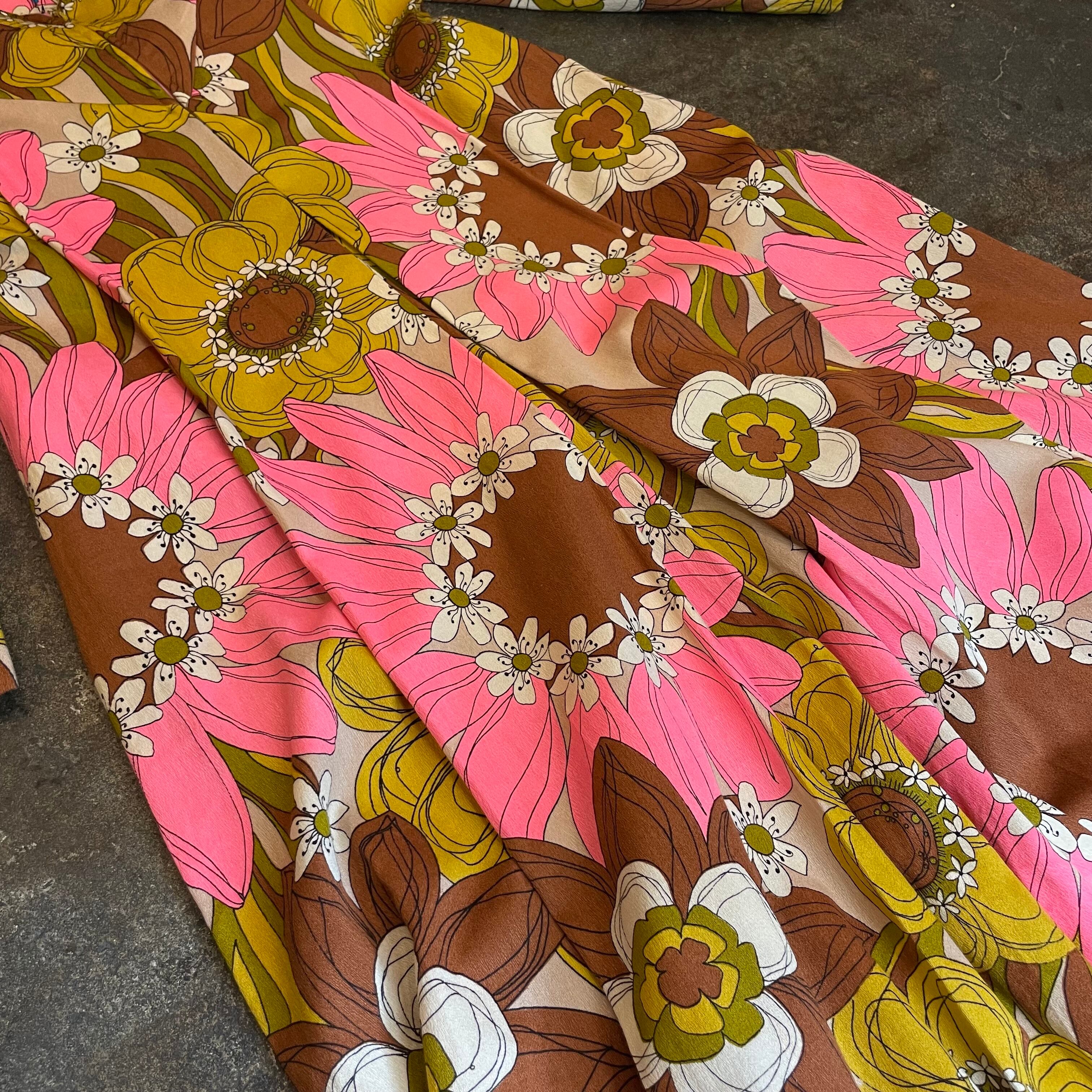 ピンクと茶色、ベージュの大きな花柄がかわいいだけでなく大人っぽい雰囲気の70年代頃のワンピースです。