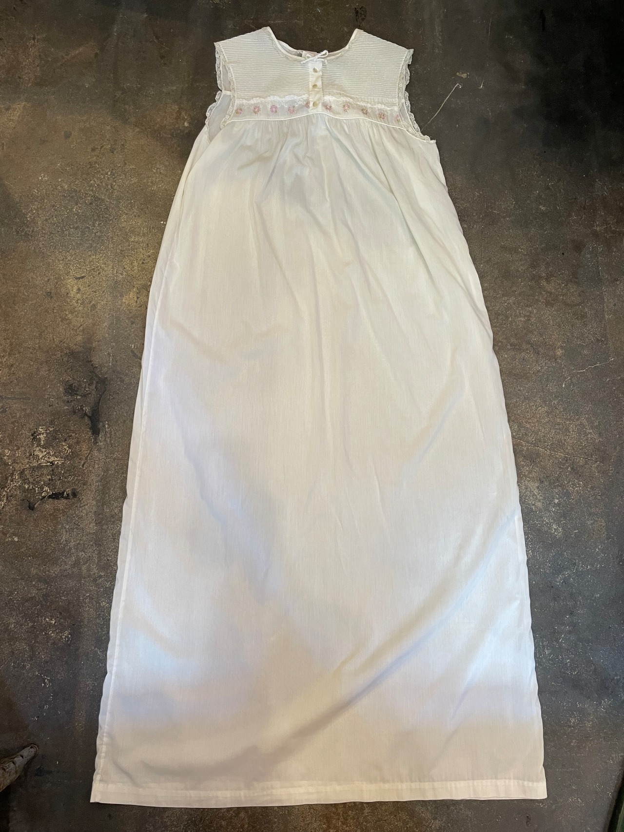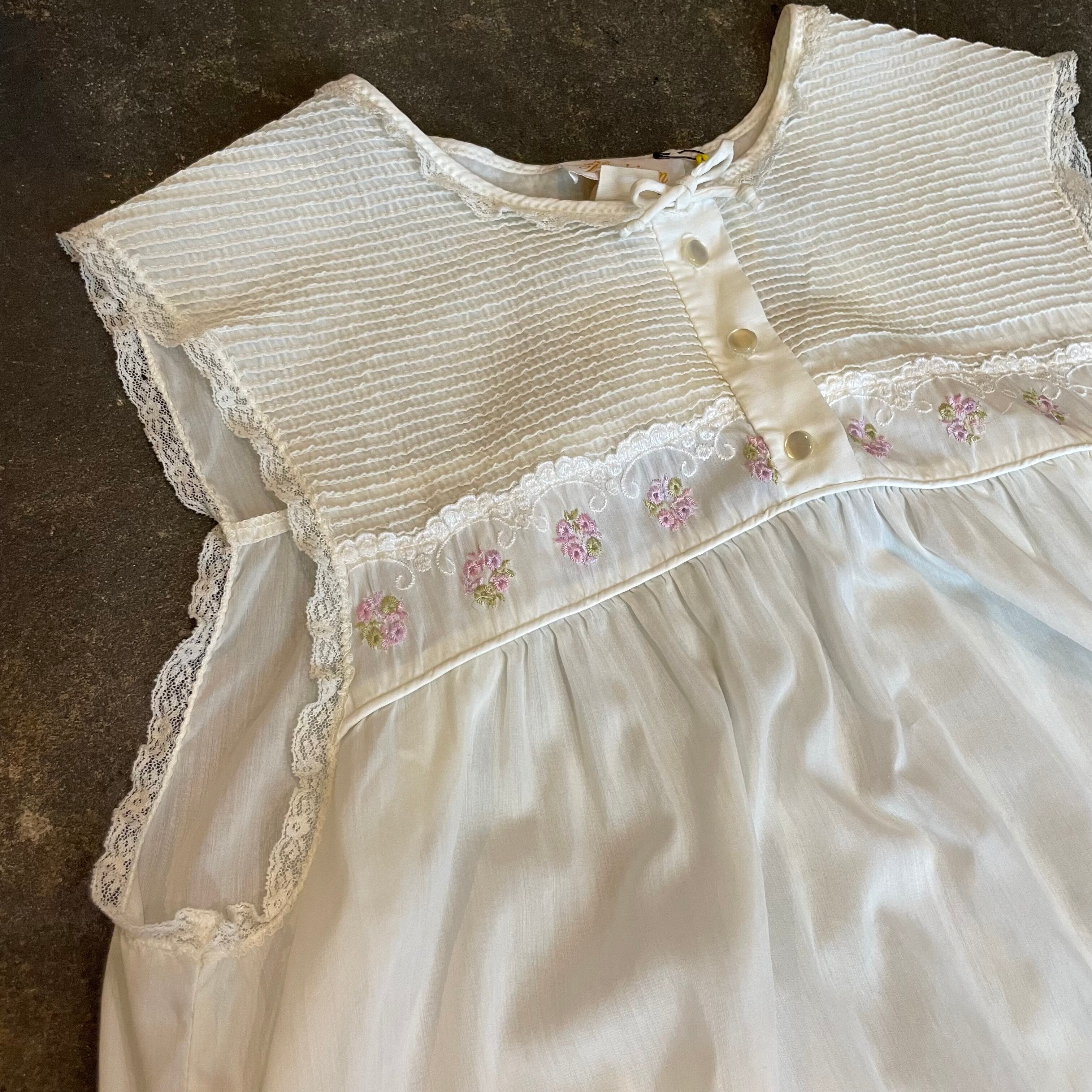 胸元は細かいピンタックになっていて立体感があったり、紫のお花の刺繍もさりげなくてかわいいですね。襟ぐりや袖ぐりのレースもあまり主張のない感じですので着やすいと思います。