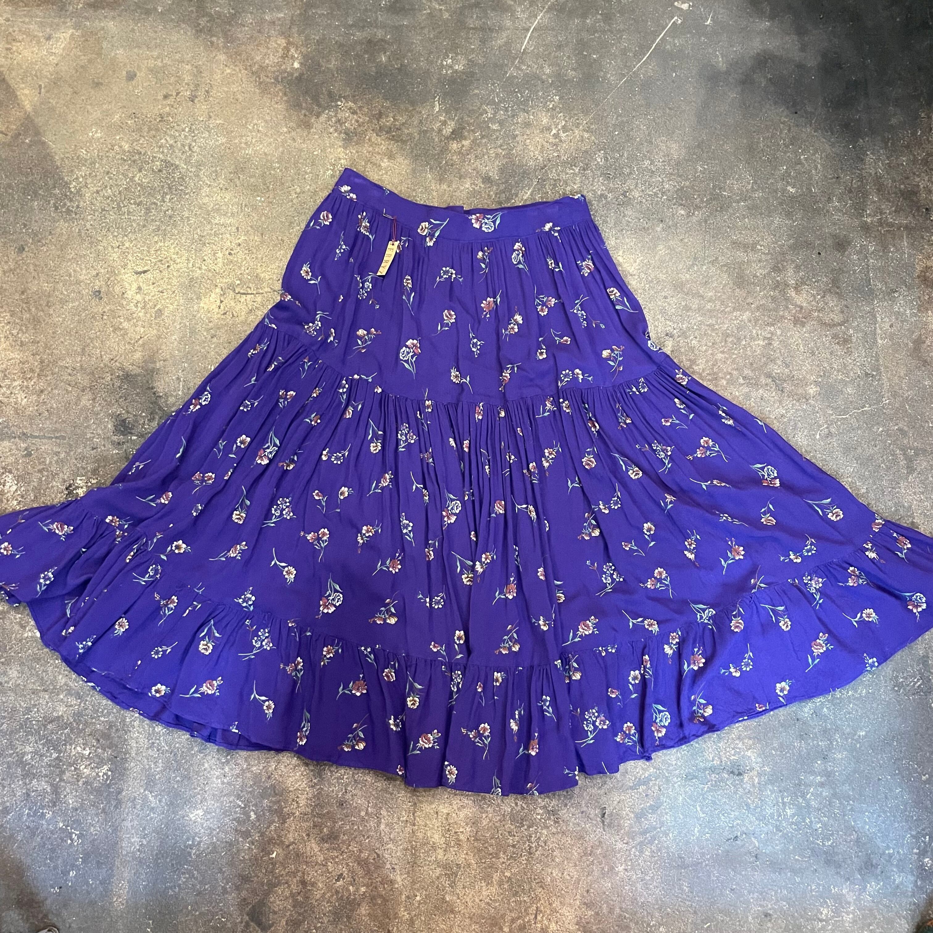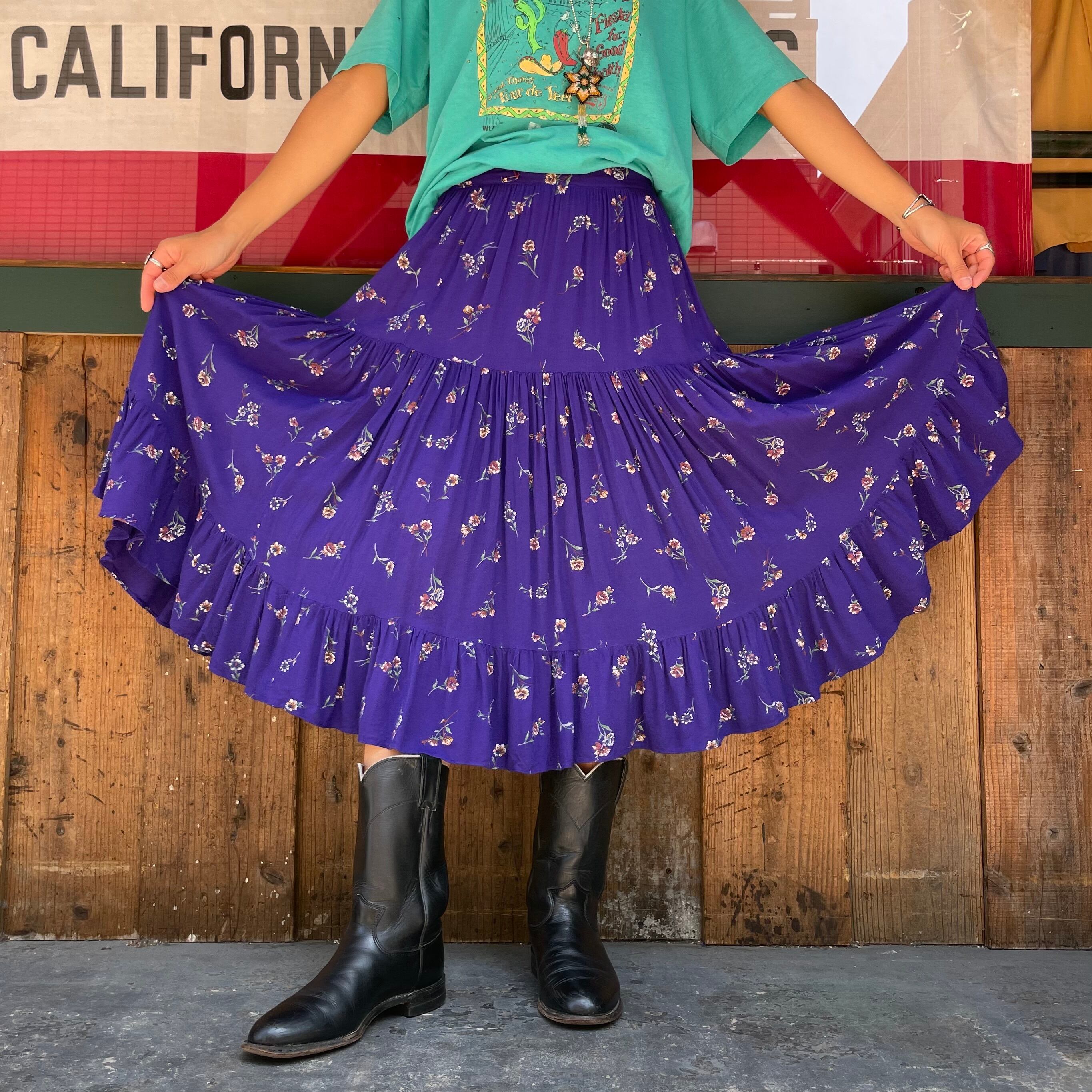 青みの強いパープルに小花柄がかわいいティアードスカートです。