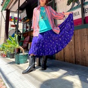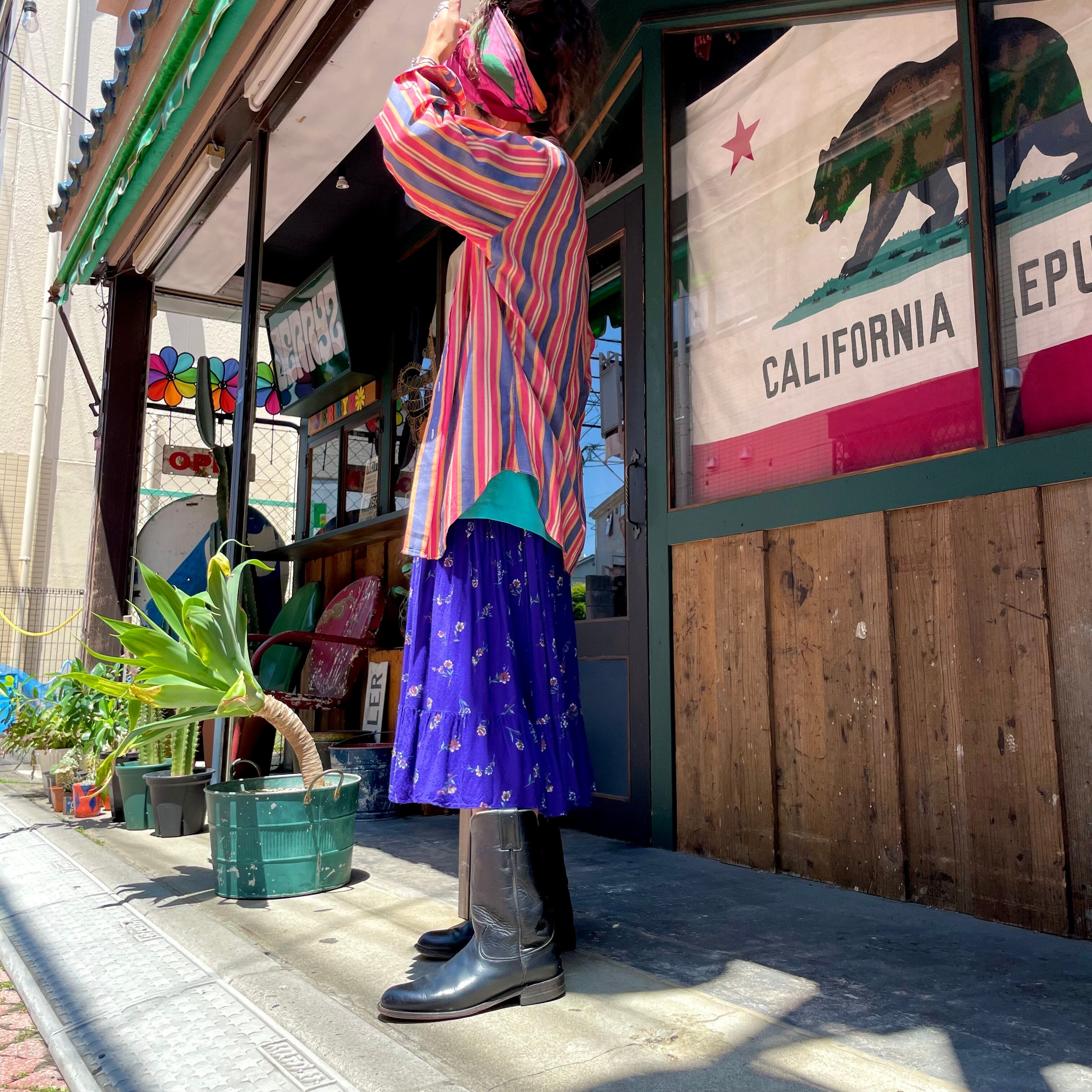 レーヨンのような雰囲気のとろみと落ち感のある素材が動くたびに揺れてムードのある一着です。ウエスタンブーツと合わせるとボヘミアンな感じでかわいいですし、丈感がバッチリで心踊ります。