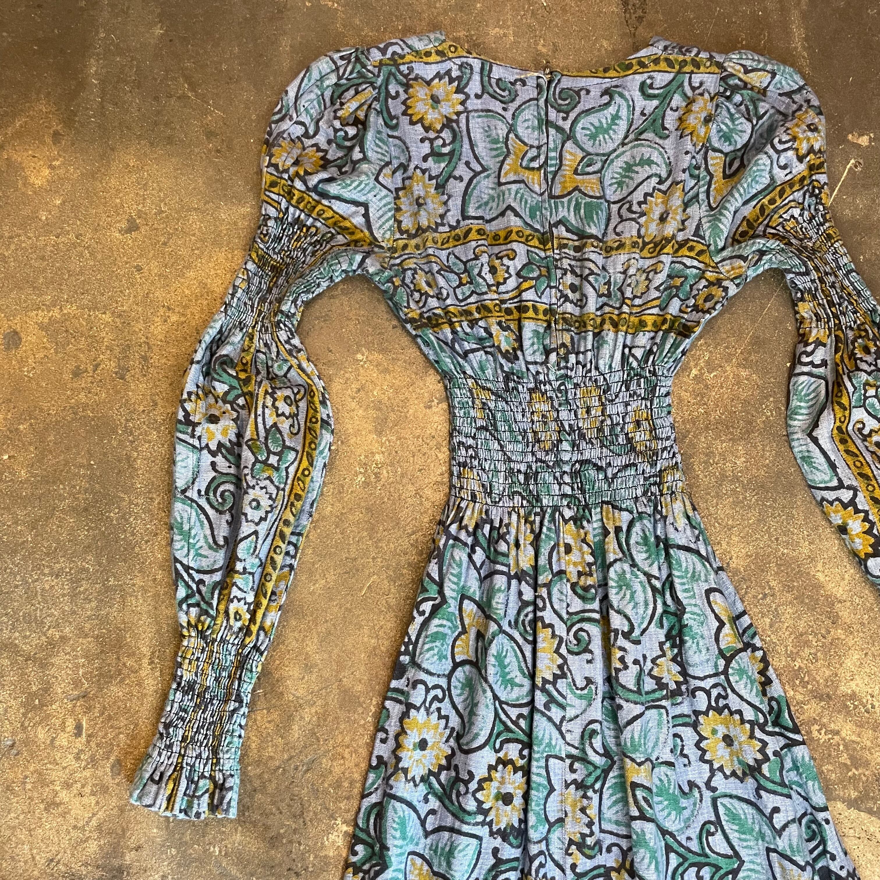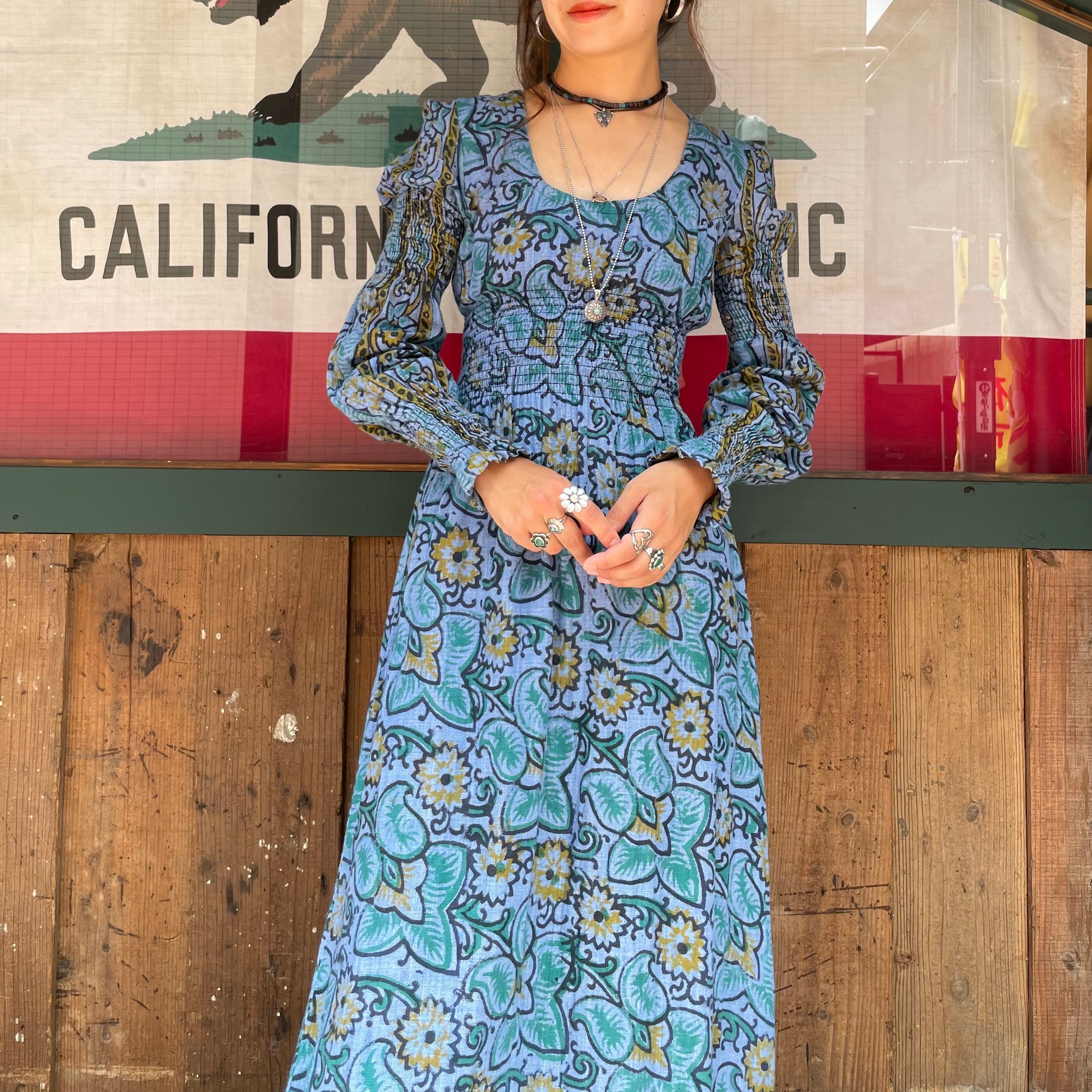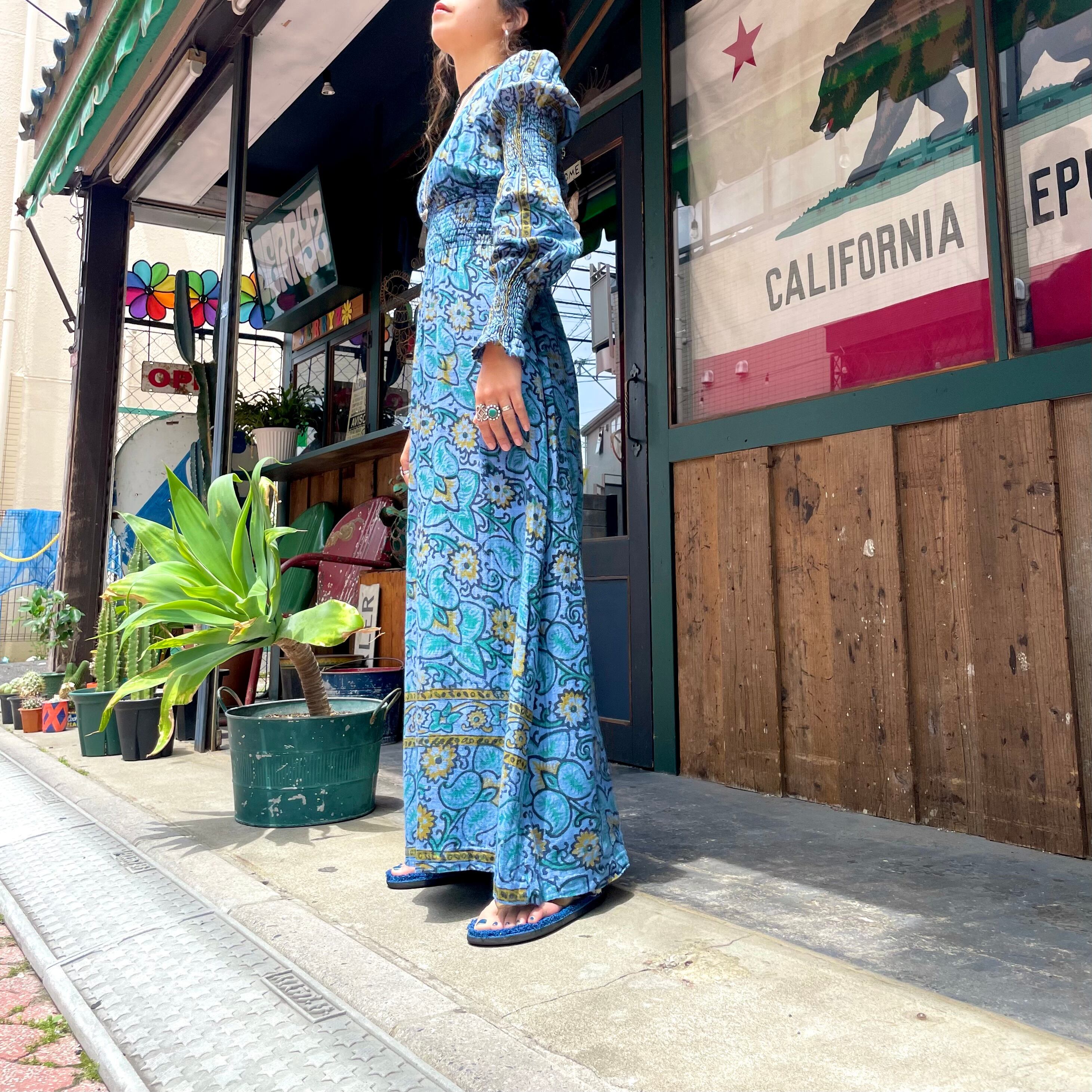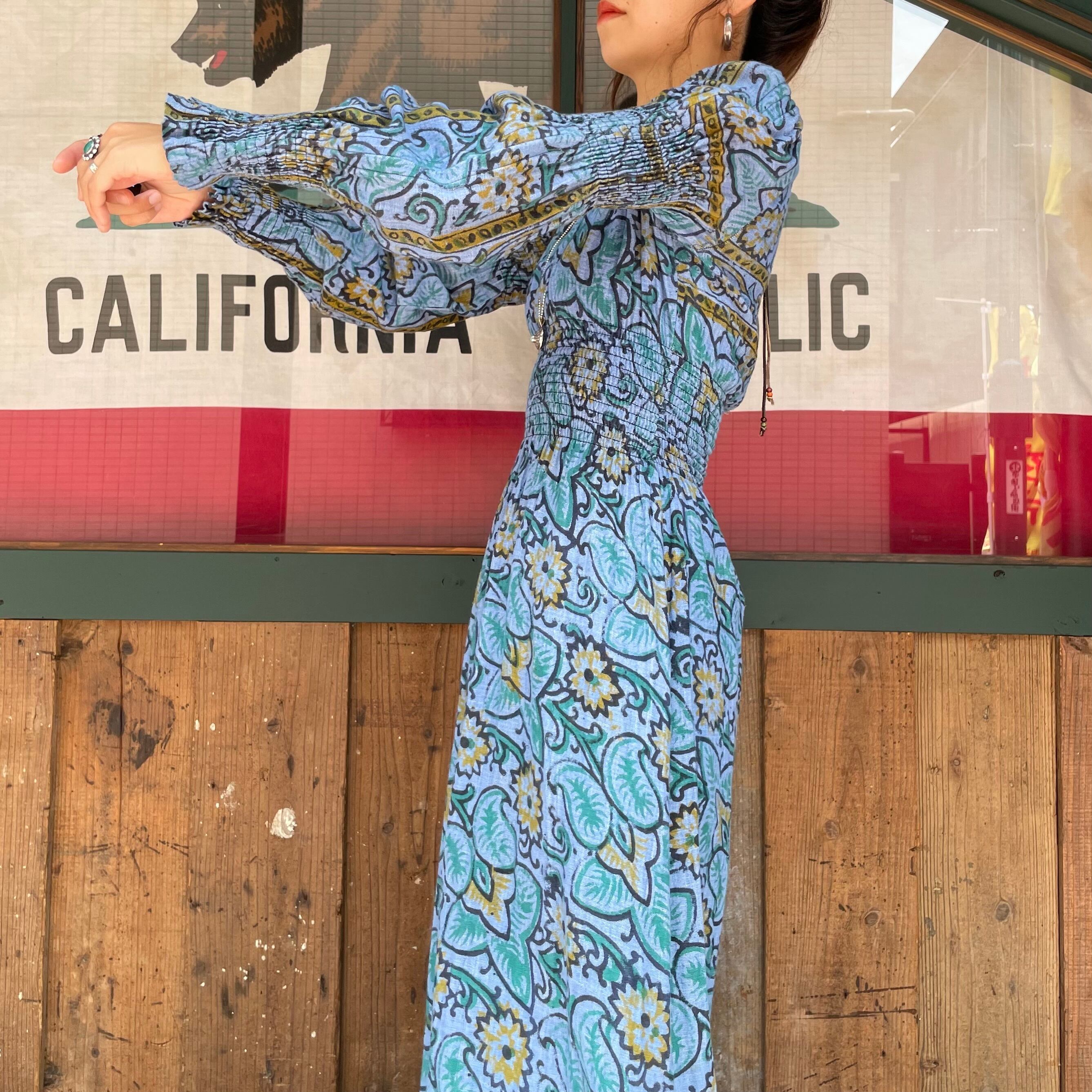 おそらくインド製のハンドブロックプリントのパサっとしたコットン素材がヴィンテージのムード漂う60〜70年代頃のワンピースです。