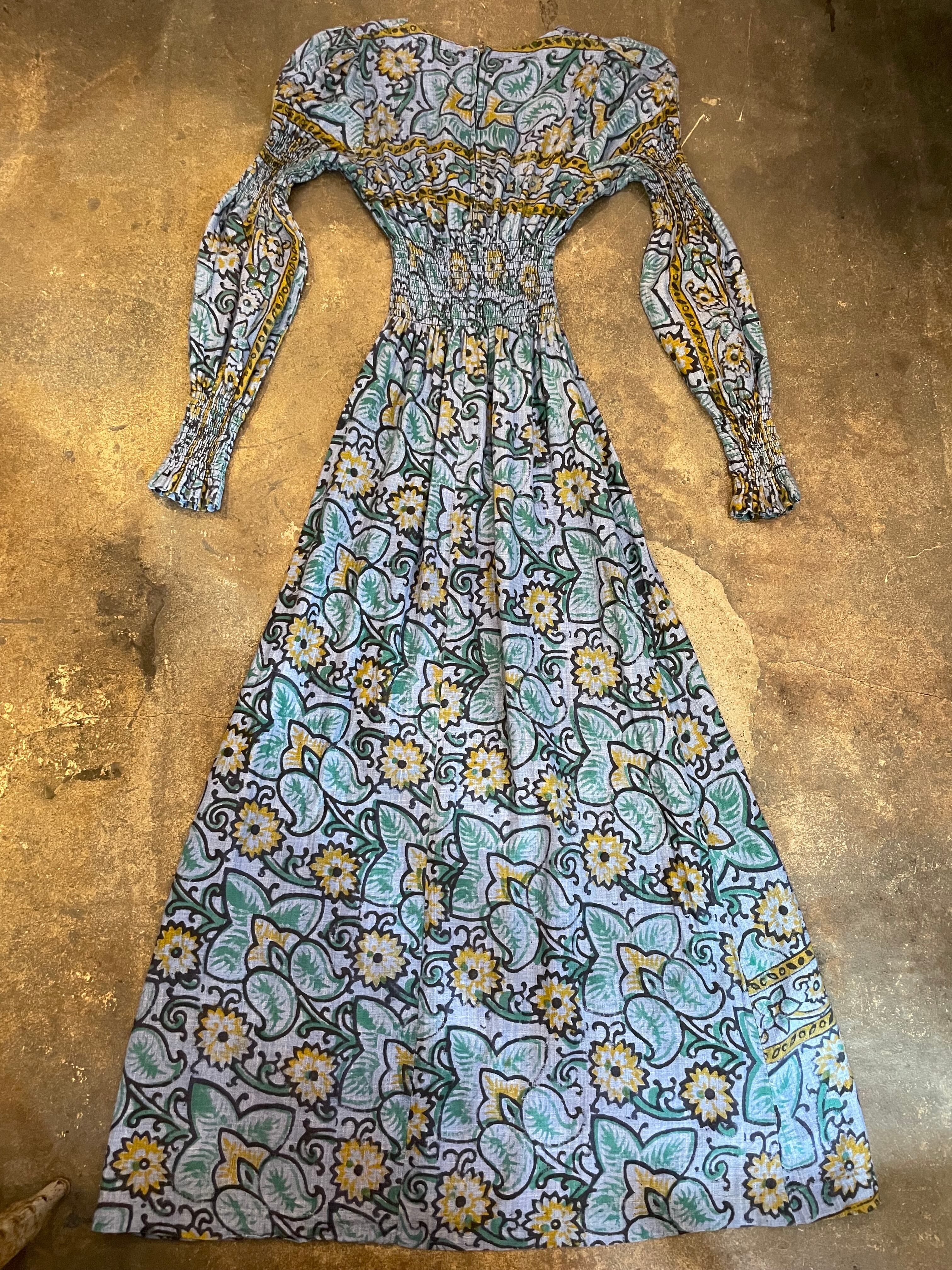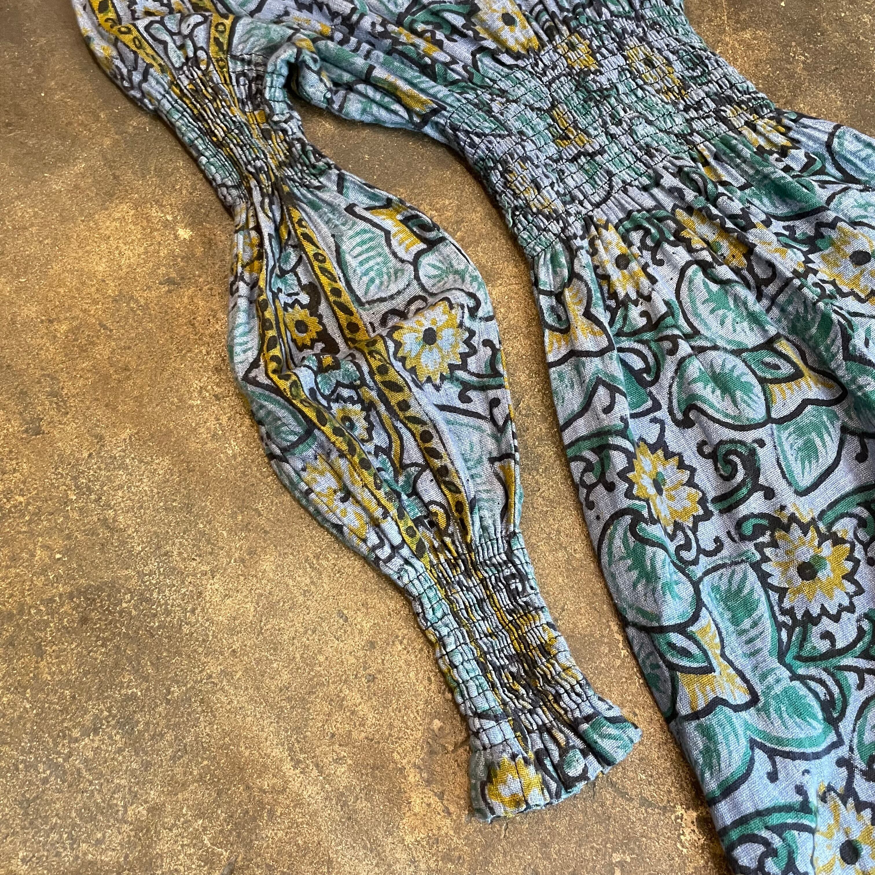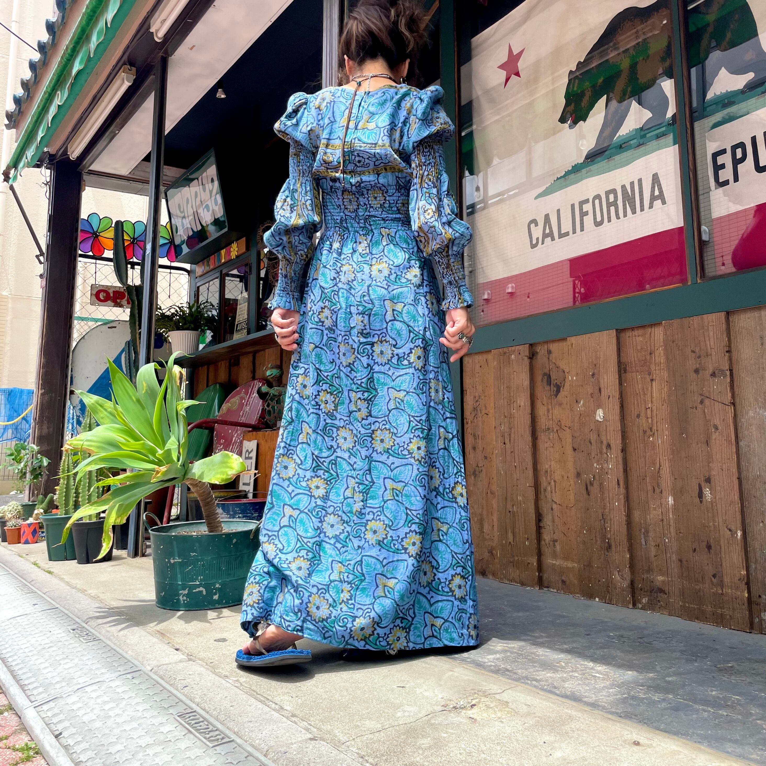 おそらくインド製のハンドブロックプリントのパサっとしたコットン素材がヴィンテージのムード漂う60〜70年代頃のワンピースです。