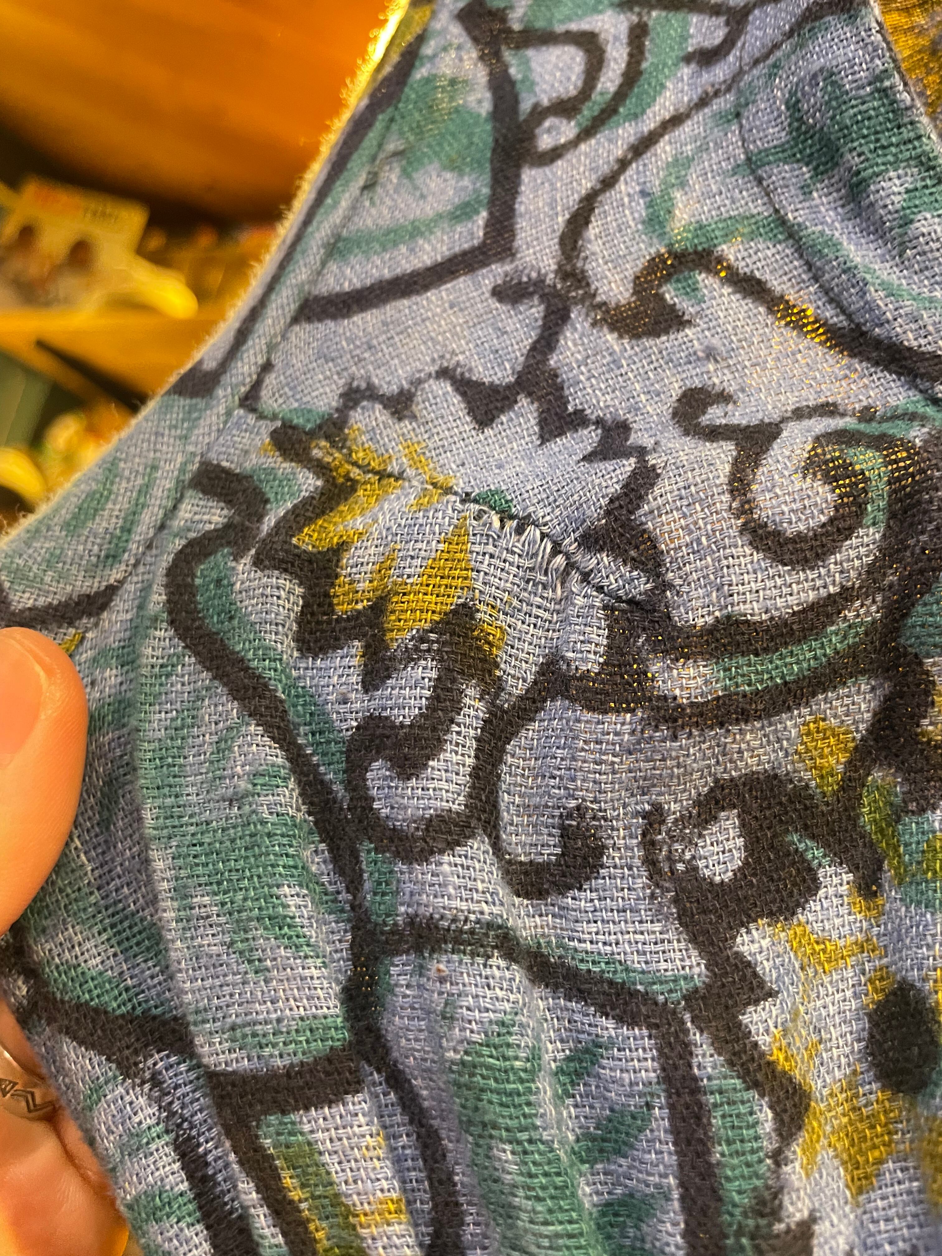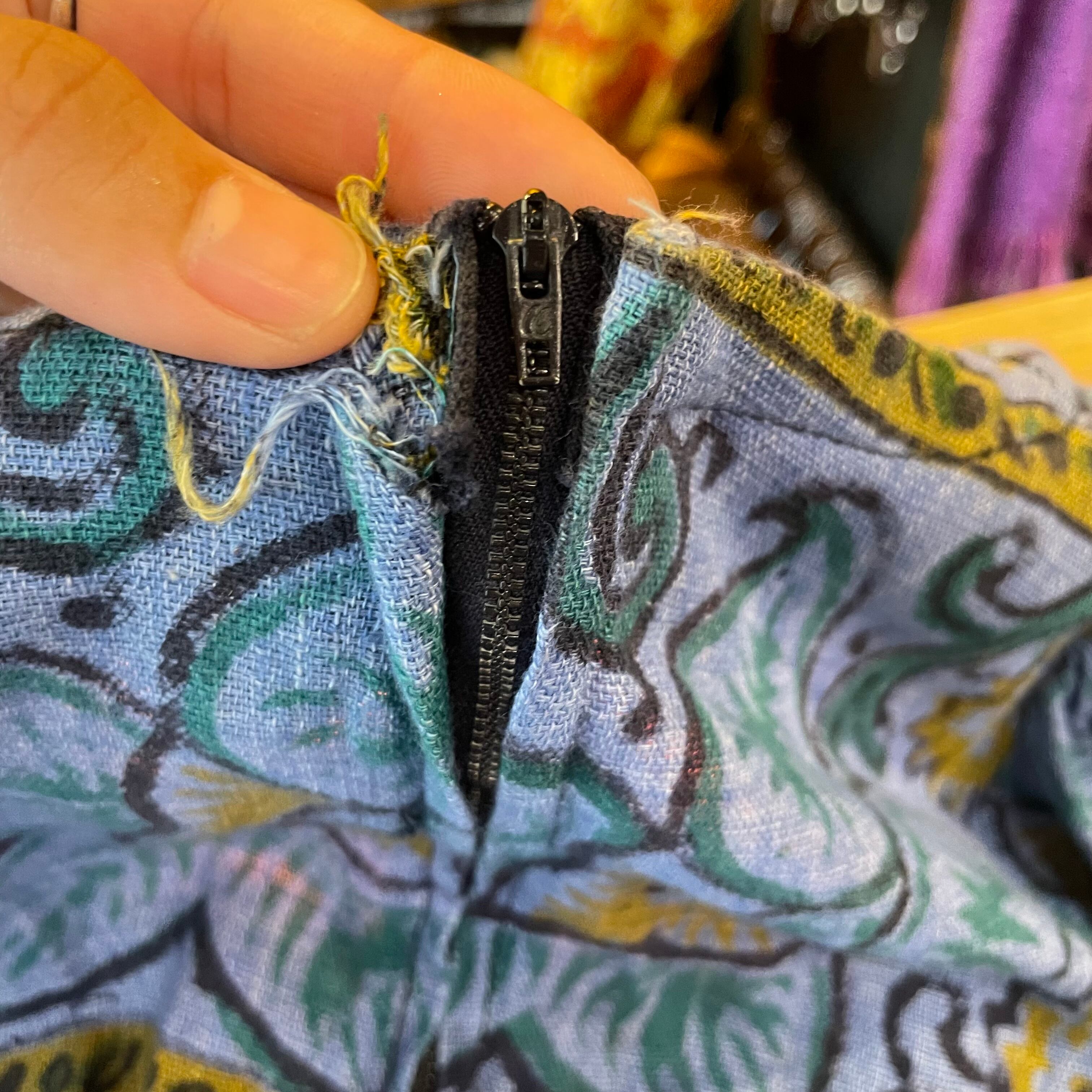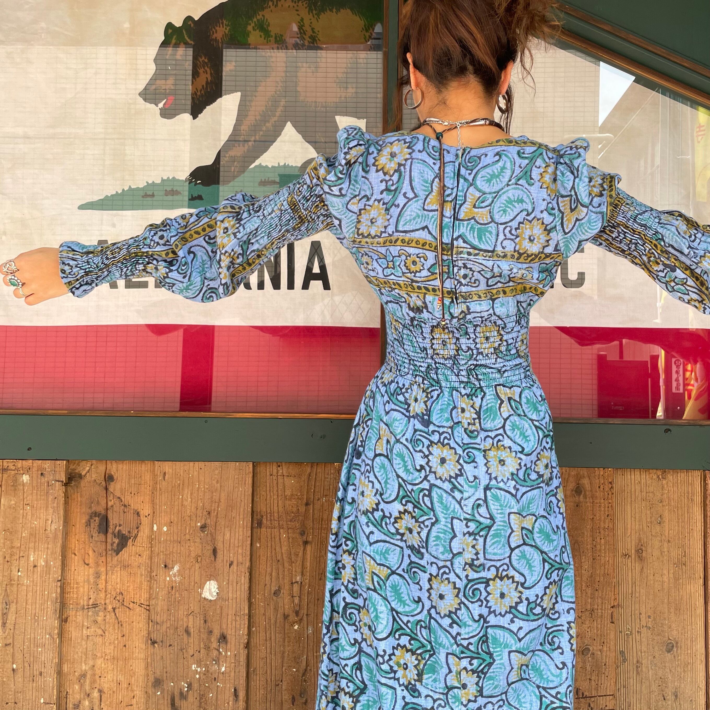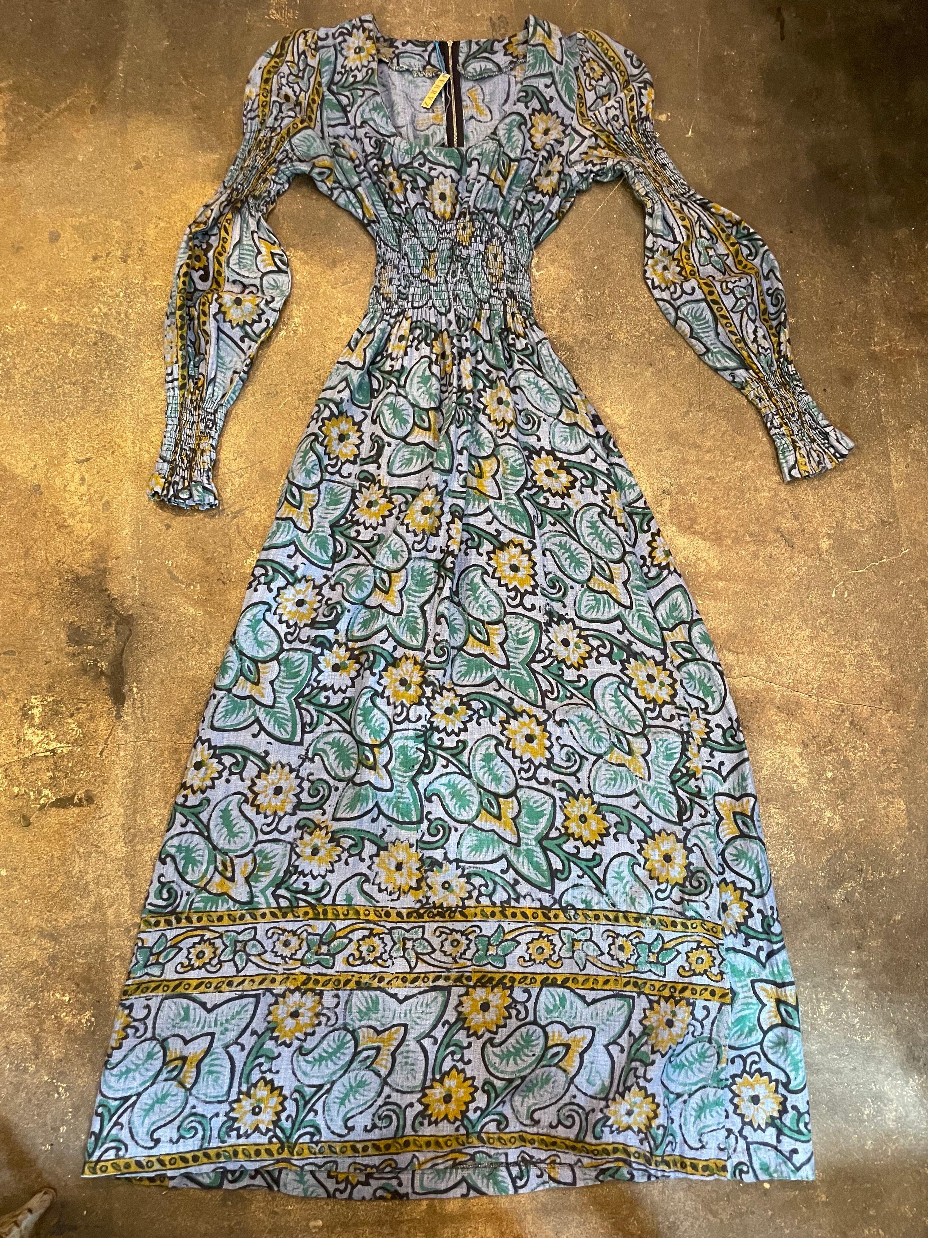 おそらくインド製のハンドブロックプリントのパサっとしたコットン素材がヴィンテージのムード漂う60〜70年代頃のワンピースです。