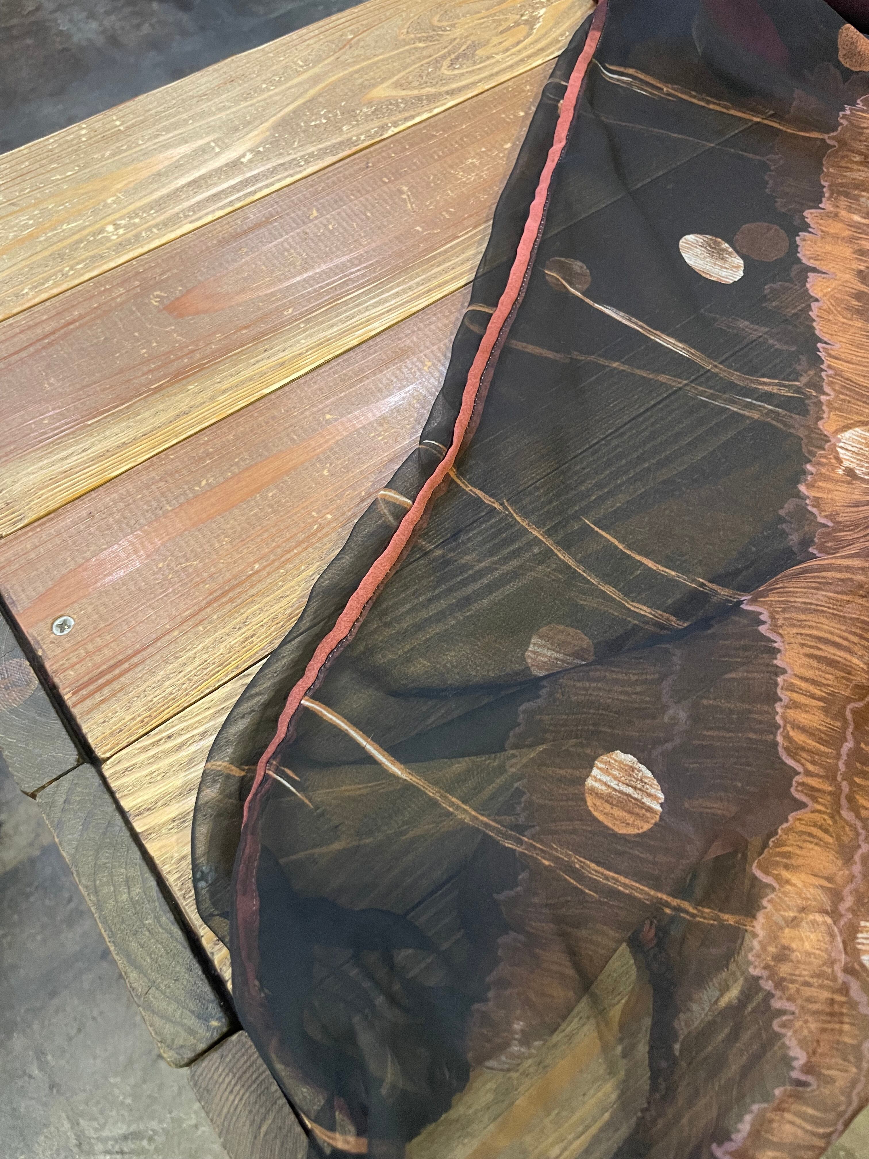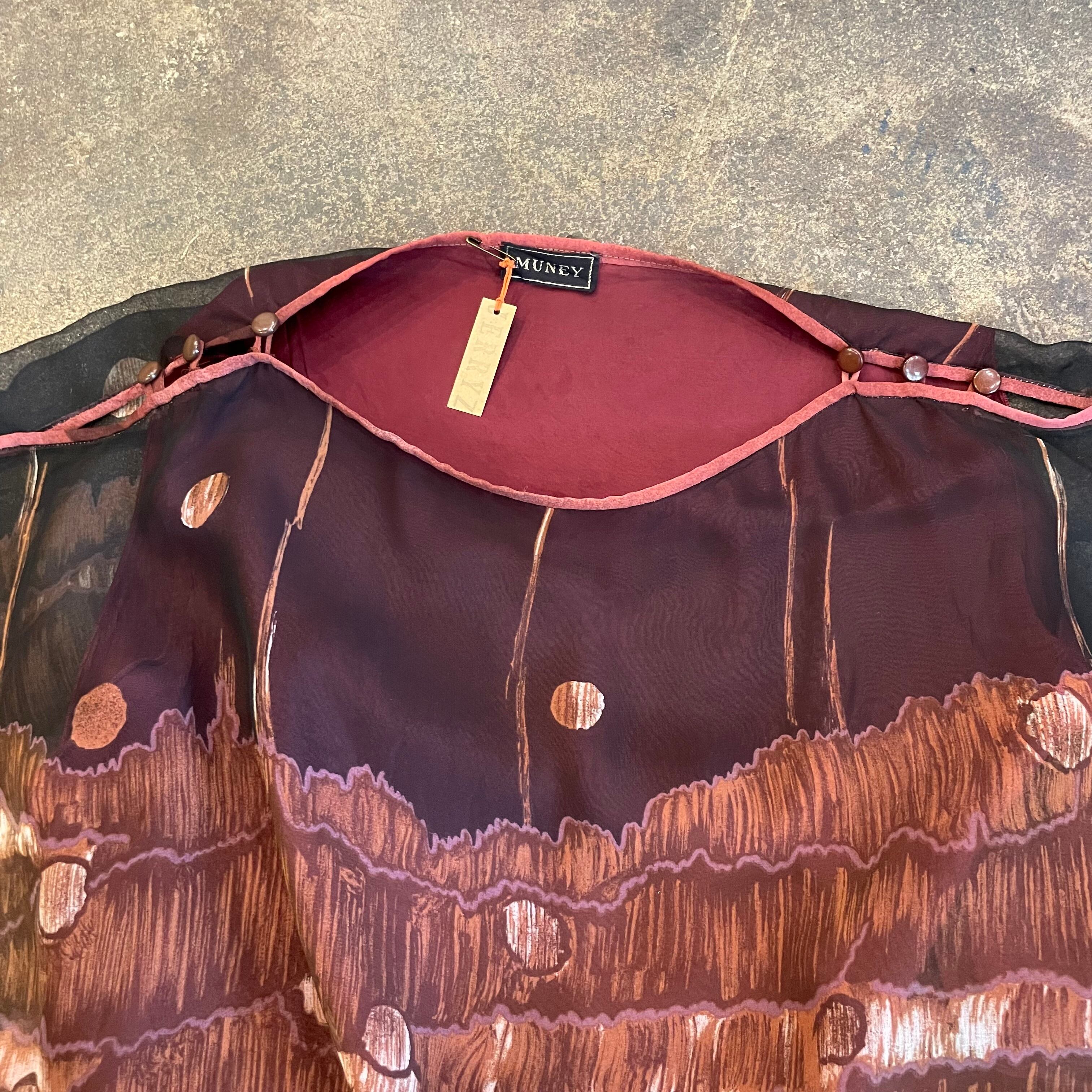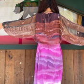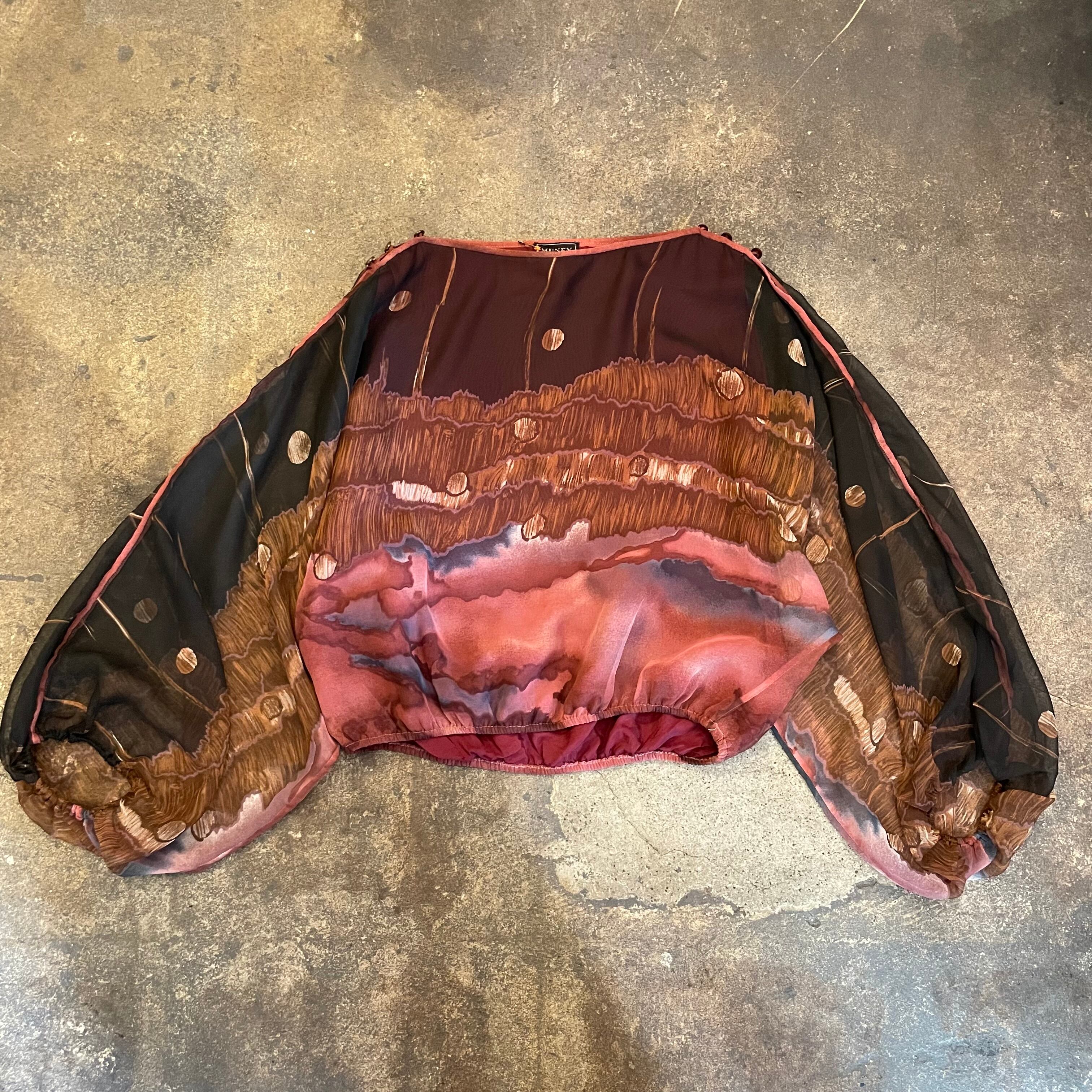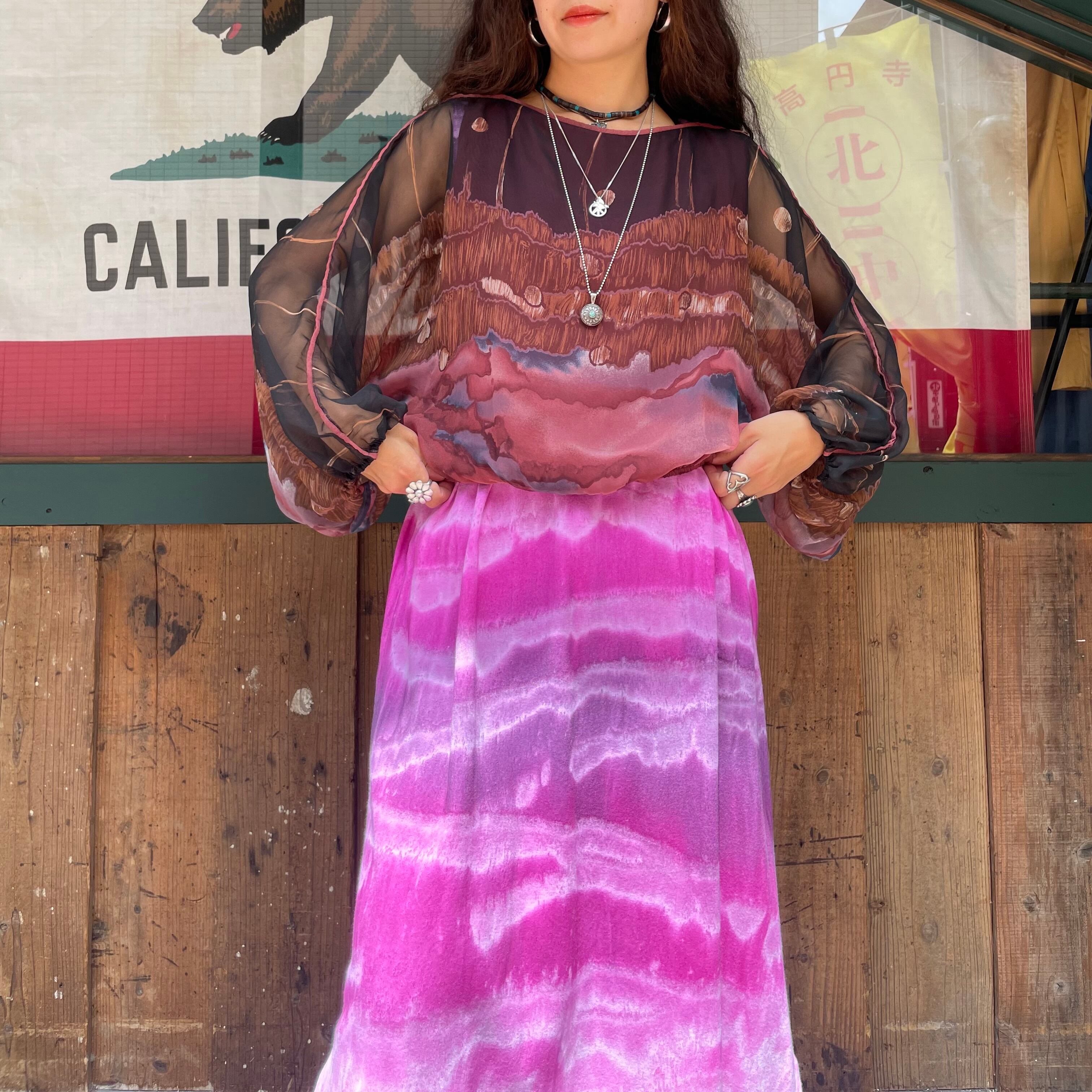 土星っぽい雰囲気の模様や色味が独特なムードのある素敵なブラウスです。シースルーの生地感がスペイシーさを演出していますね。