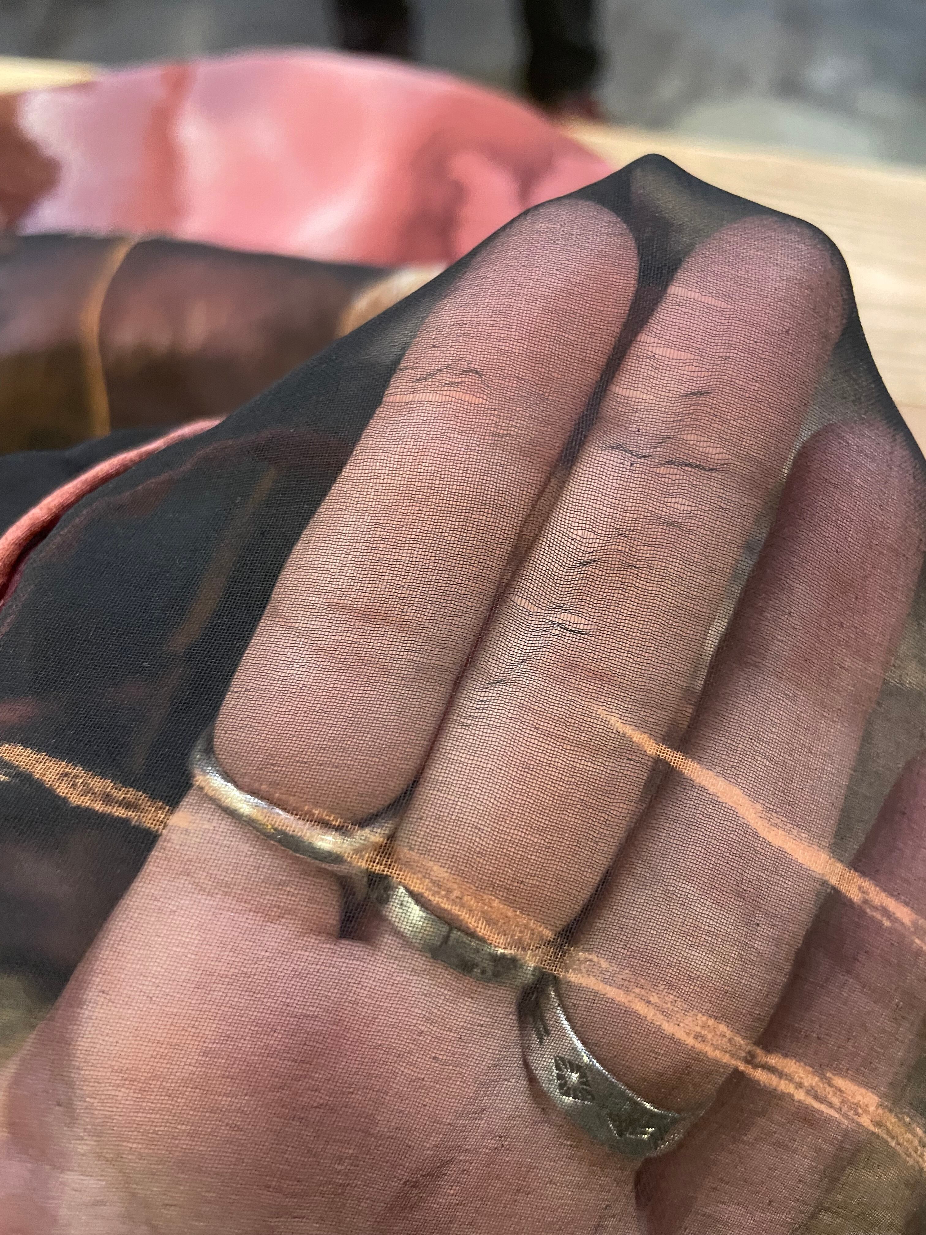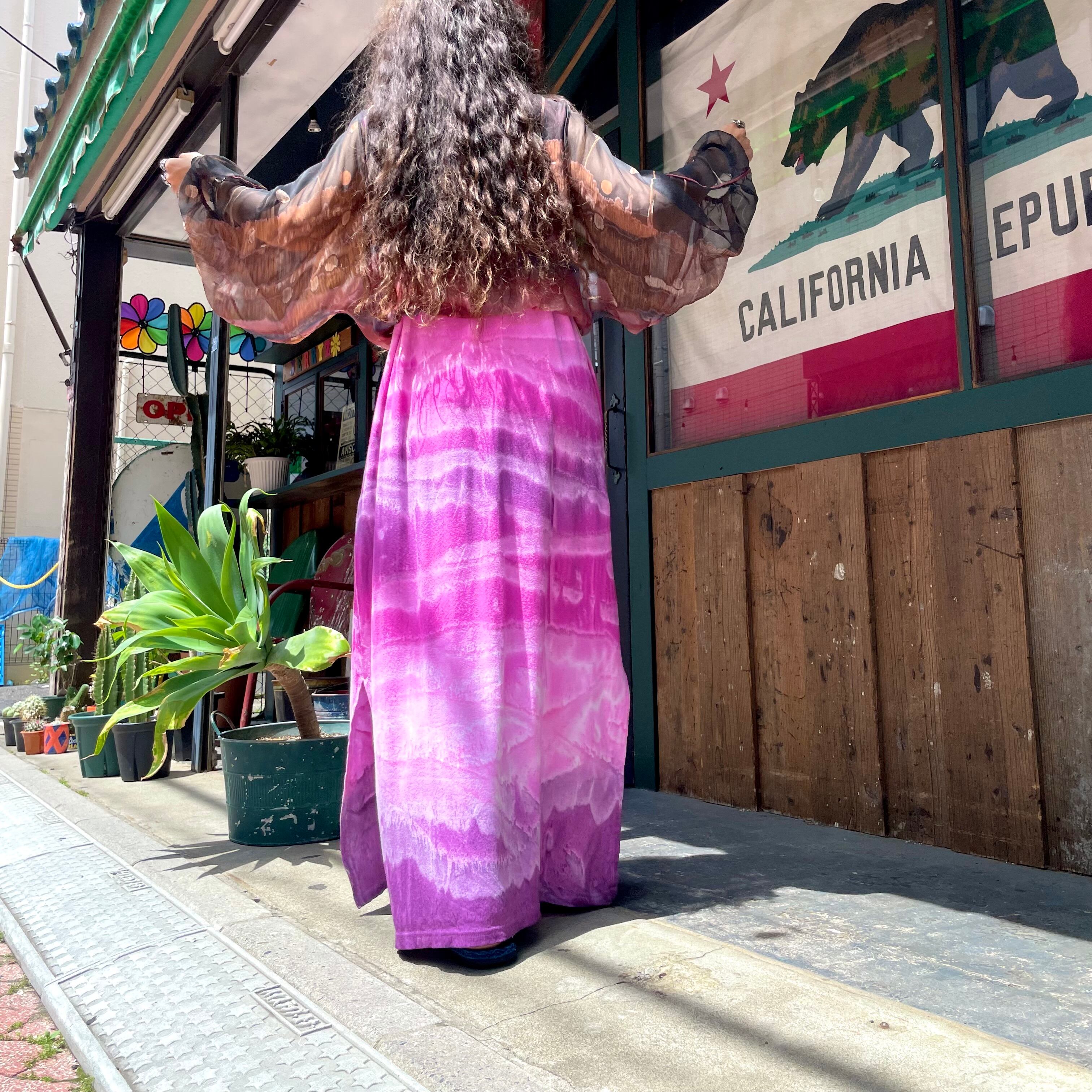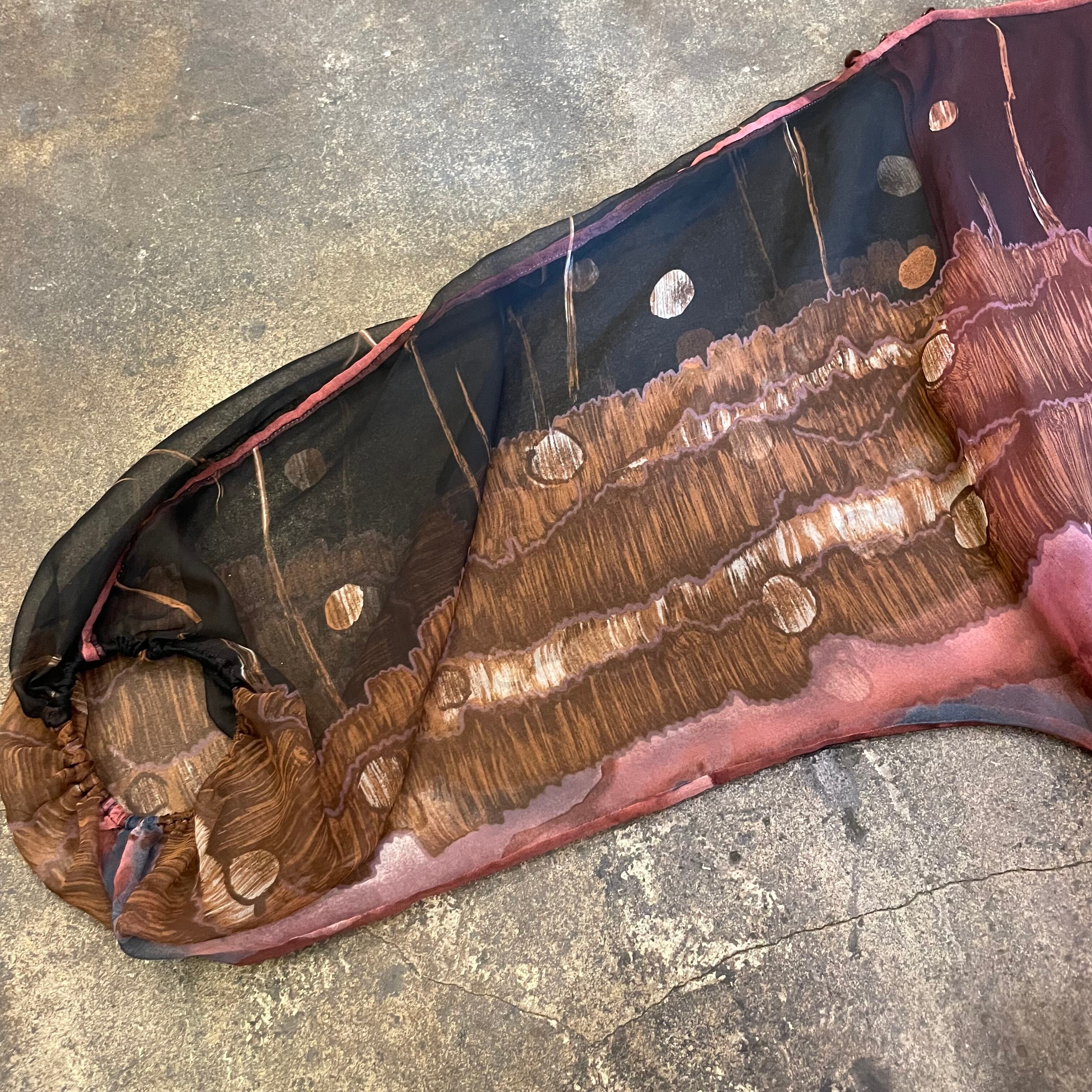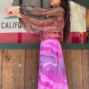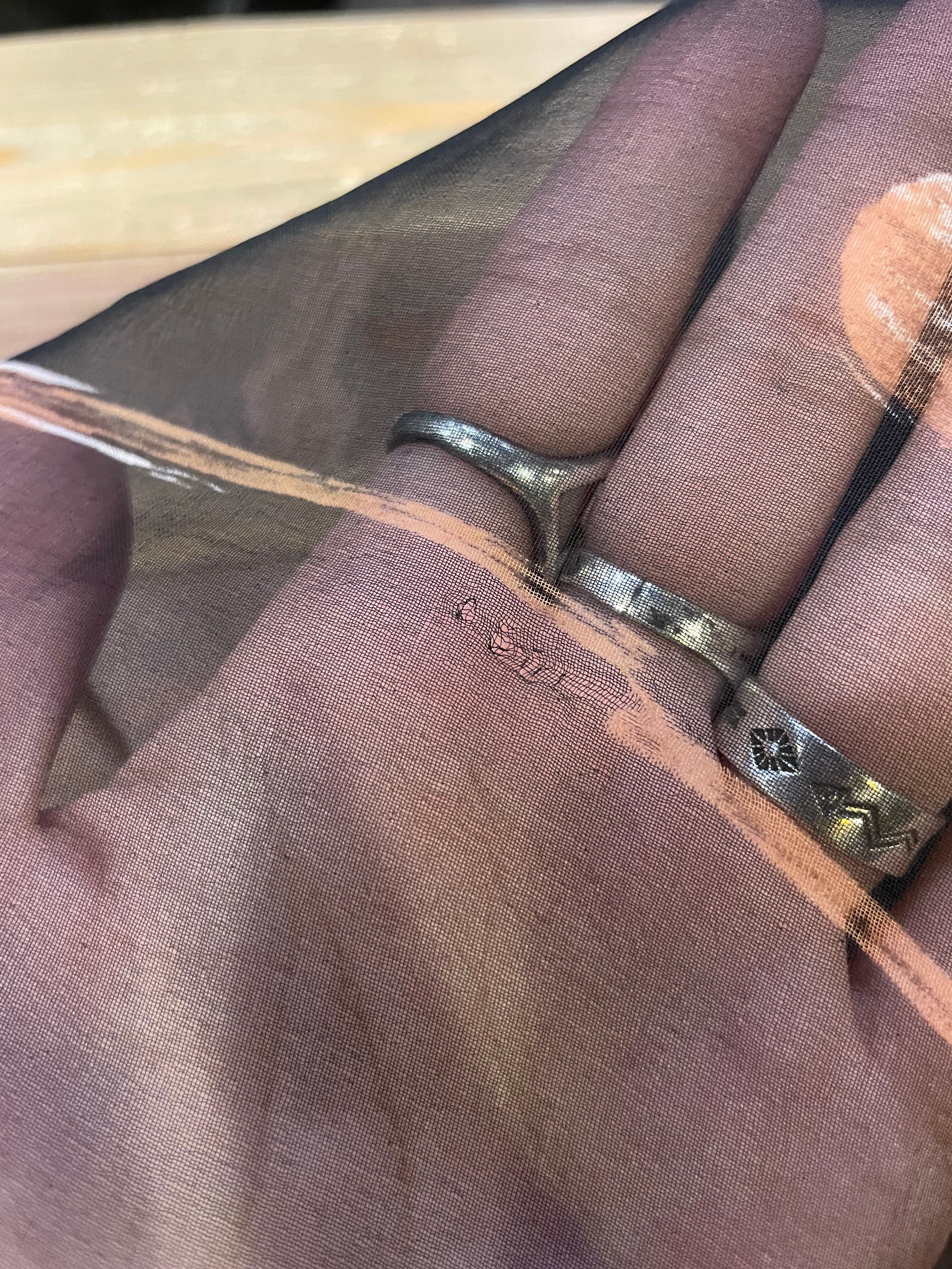 土星っぽい雰囲気の模様や色味が独特なムードのある素敵なブラウスです。シースルーの生地感がスペイシーさを演出していますね。