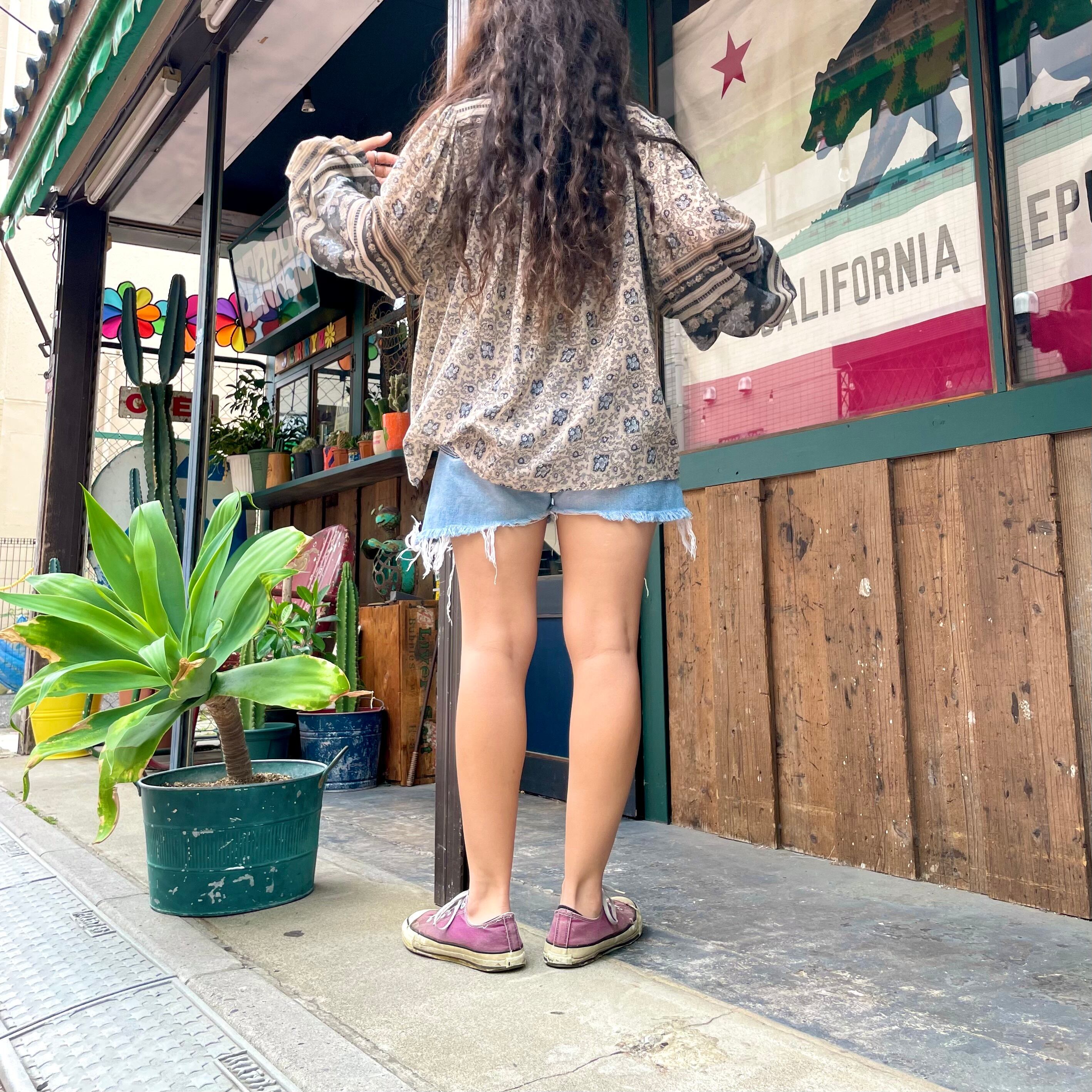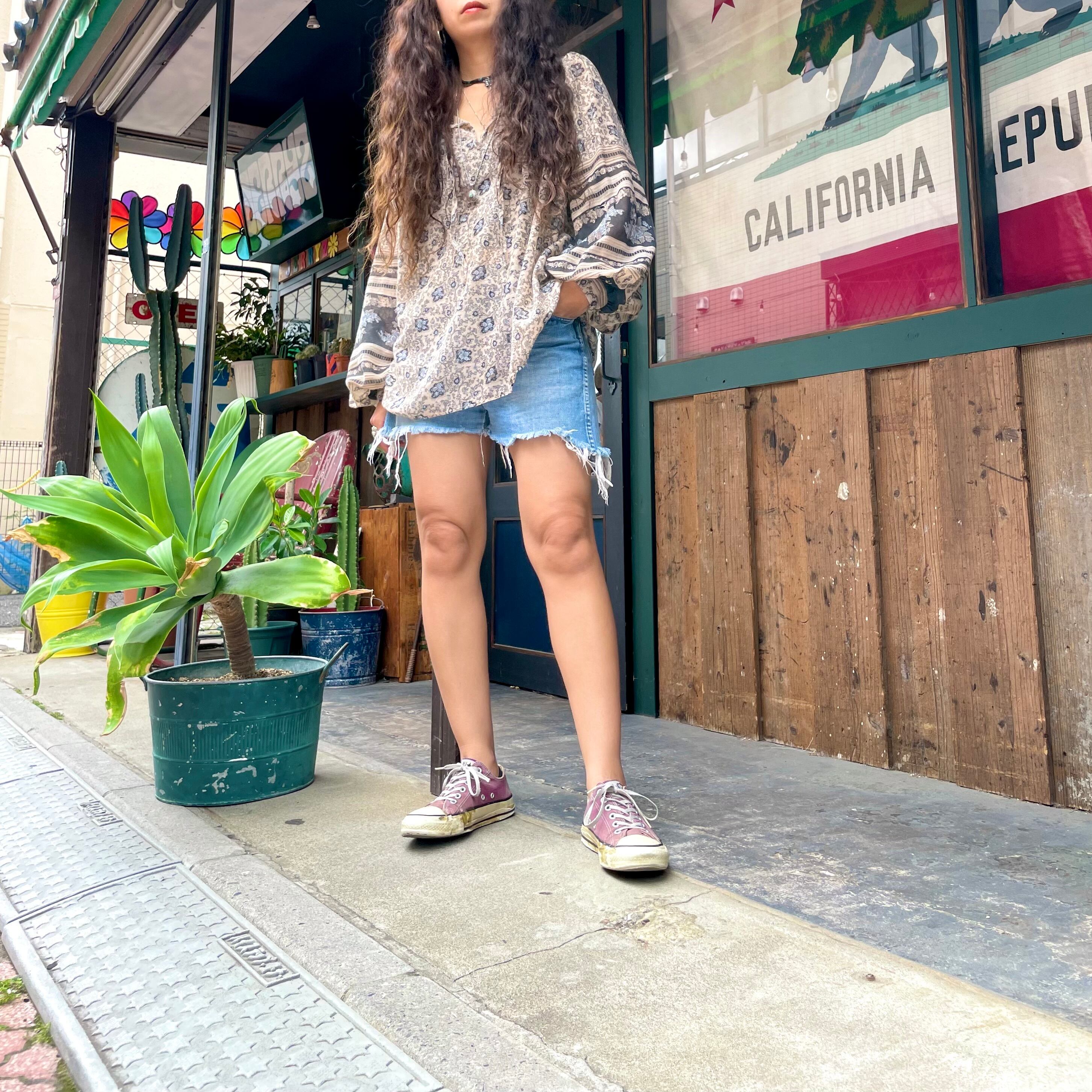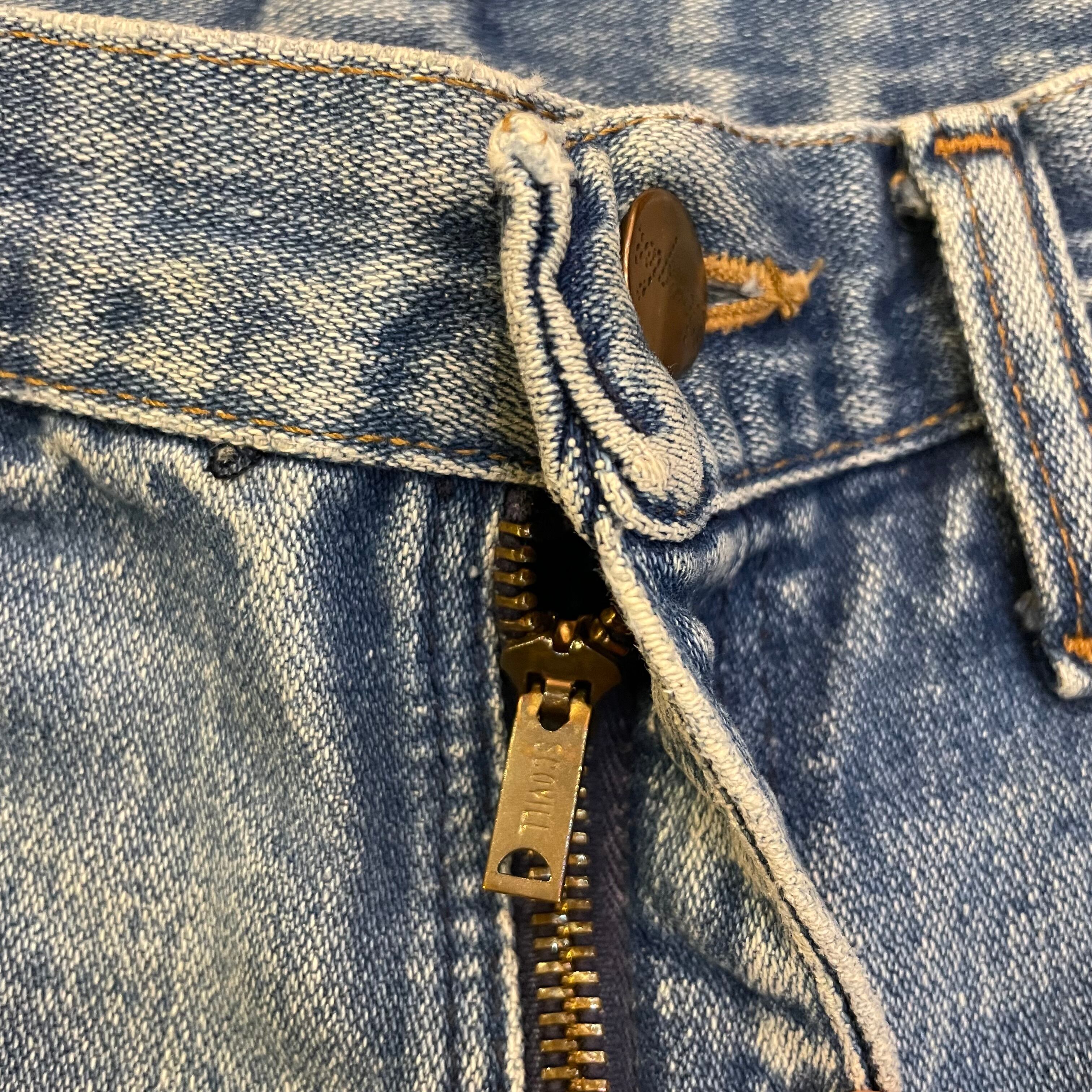 雑な切り口の裾、色褪せ、擦れや糸抜け等全体的に使用感のある商品です。古着にご理解のある方のご購入をお願い致します。